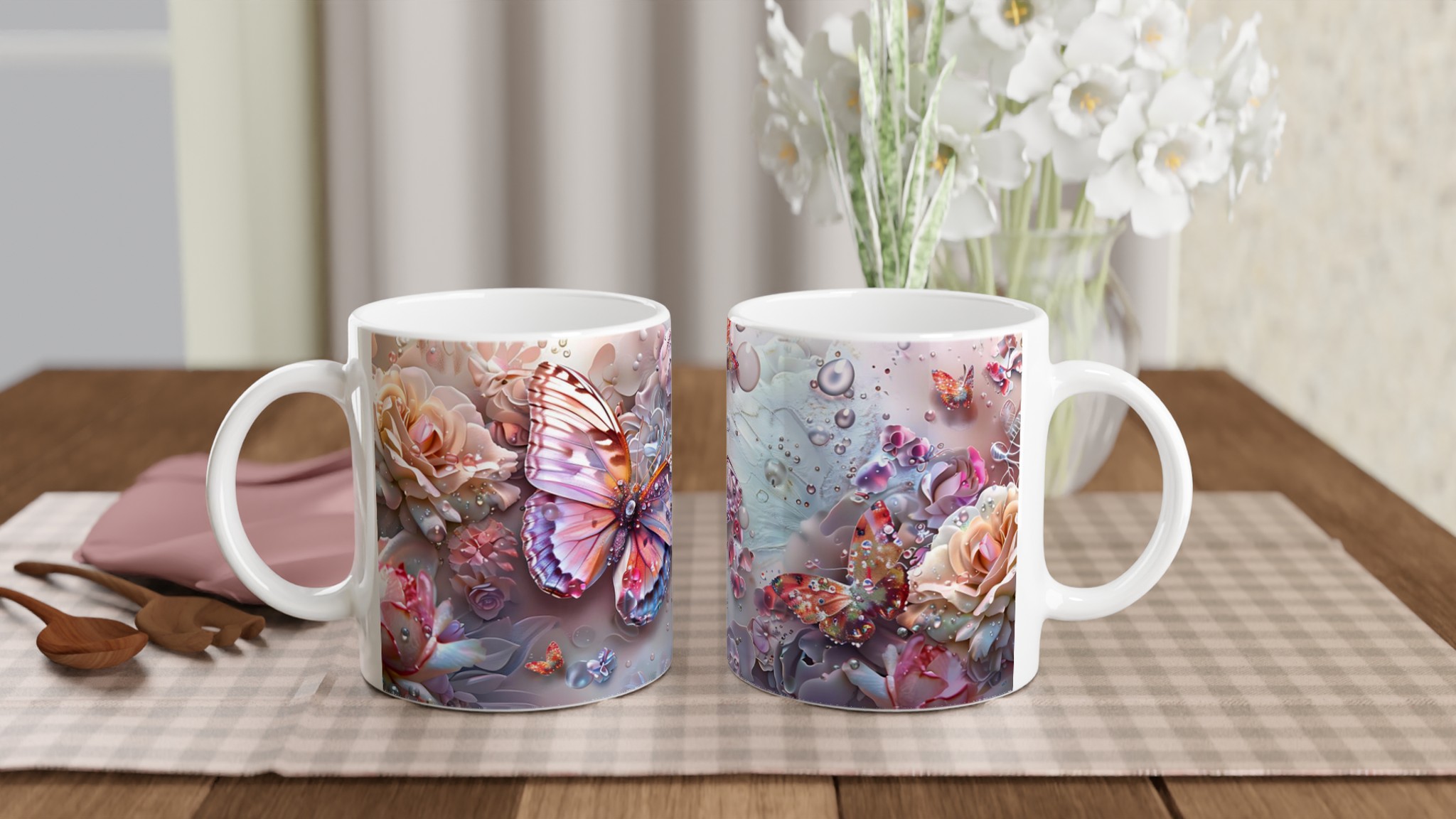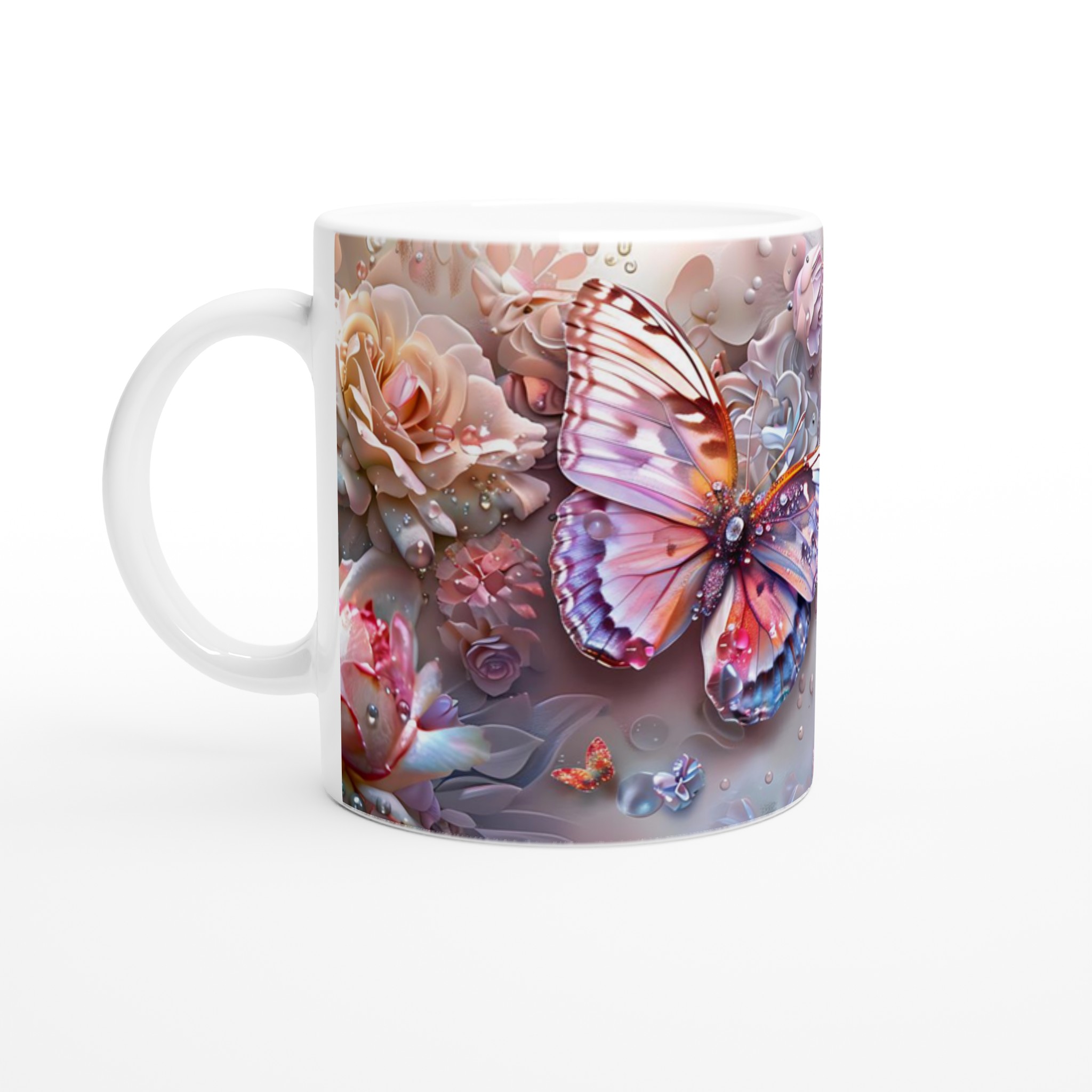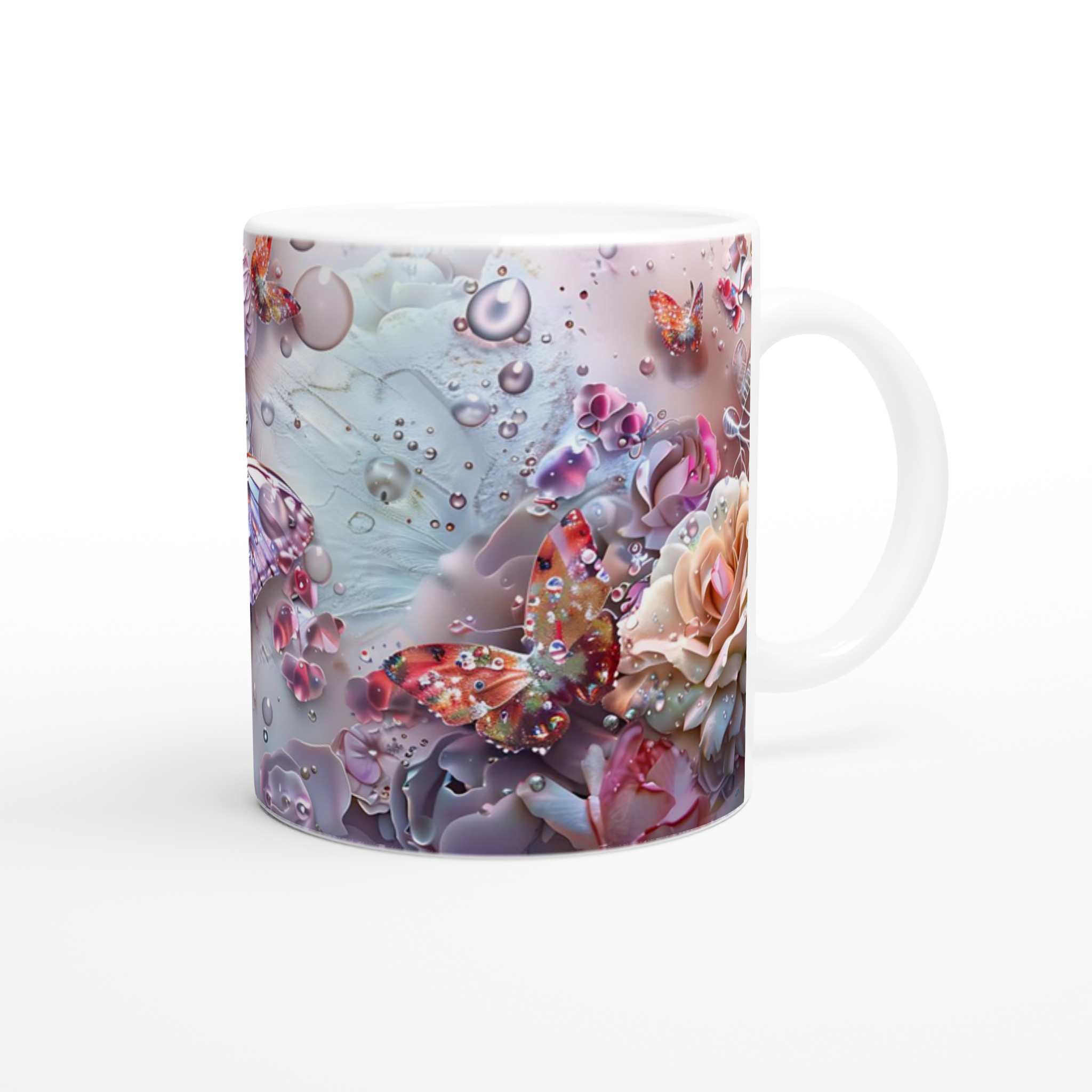 Låt varje klunk bli en stund av ren förtrollning med denna lyxiga keramiska mugg, inspirerad av en drömlik trädgård full av glittrande fjärilar och daggfriska rosor. Den här muggen är mer än bara en dryckesbehållare – den är en konstnärlig upplevelse som förvandlar ditt morgonkaffe eller kvällste till ett magiskt ögonblick. Den blanka ytan fångar ljuset vackert och låter de intrikata detaljerna framträda med en nästan eterisk lyster, vilket gör varje användning till en fröjd för ögat.