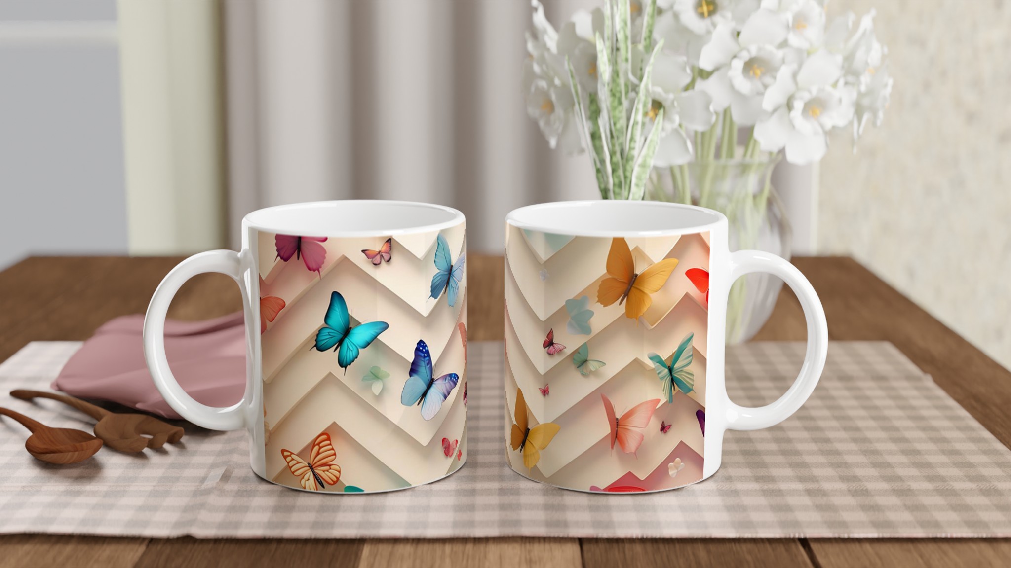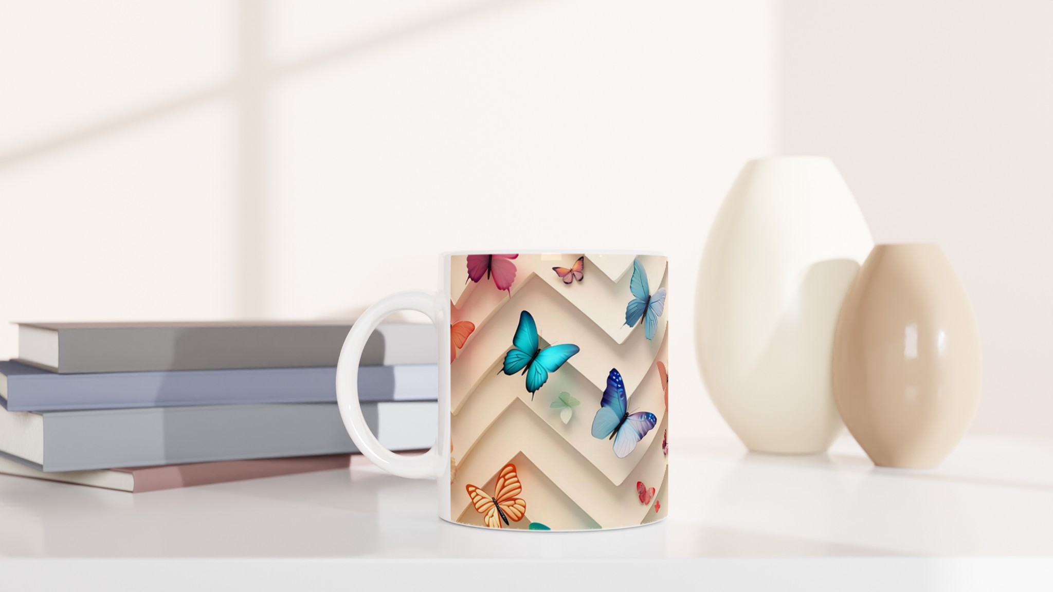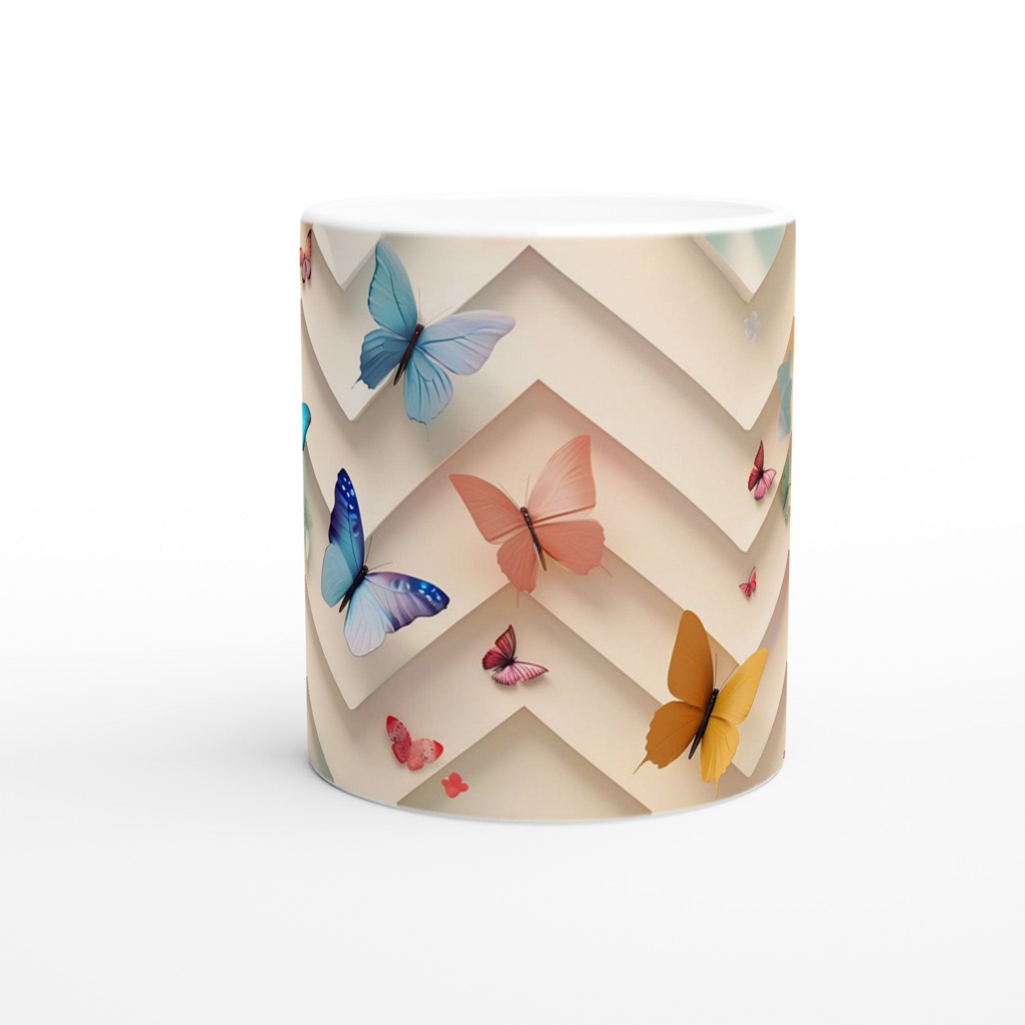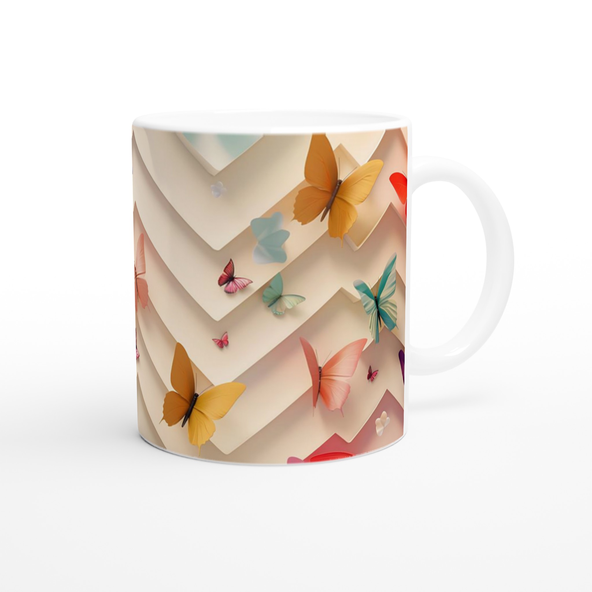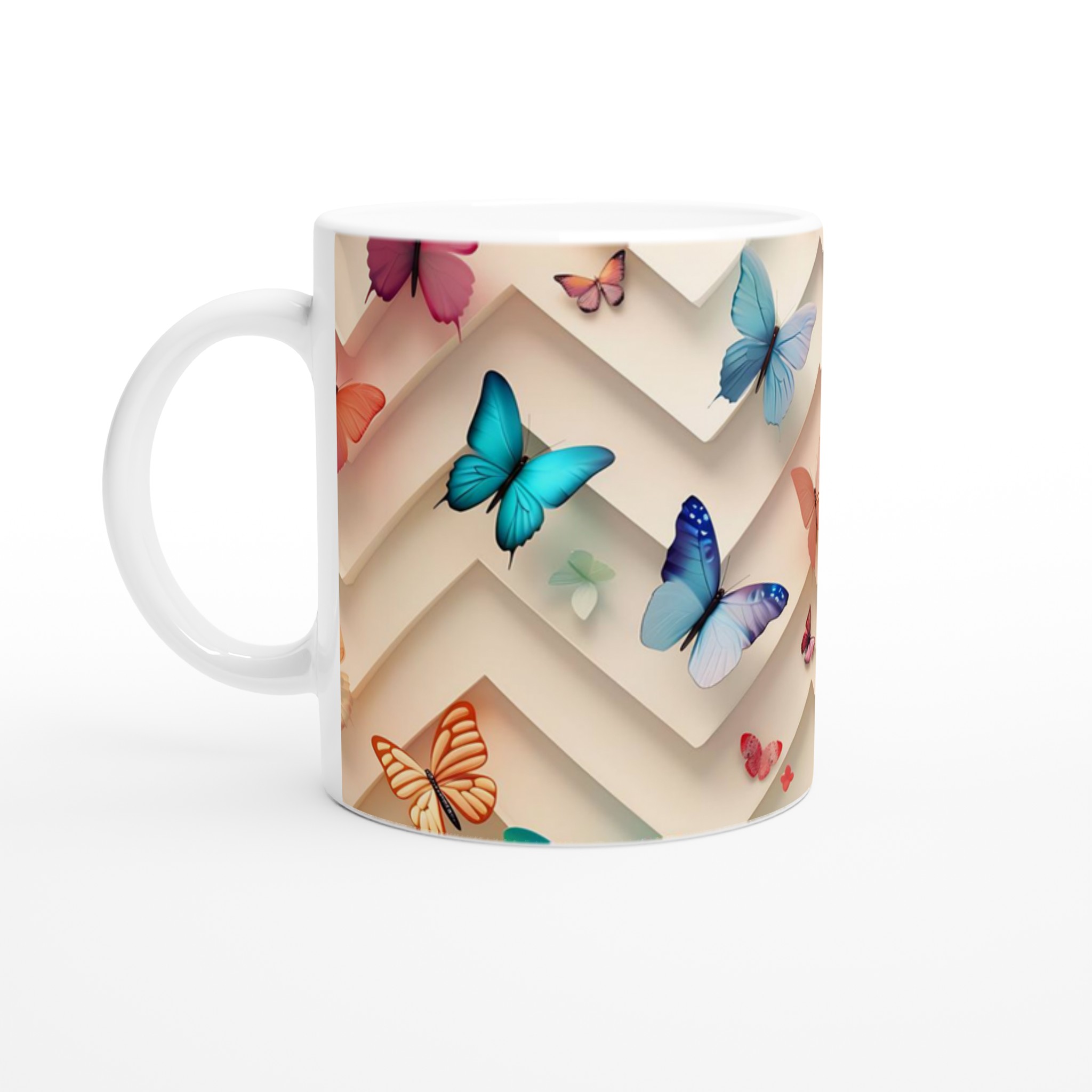 Den blanka vita ytan ser till att de vackra fjärilstrycken framträder klart och färgstarkt, vilket gör muggen till en riktig favorit i vardagen. Tack vare den höga kvaliteten behåller trycket sin lyster även efter många omgångar i både mikrovågsugn och diskmaskin. Muggen rymmer 11 oz (ca 3,25 dl), en lagom storlek för både jobb och hemmabruk. Den passar lika bra som en personlig vardagsmugg som en uppskattad present till familj, vänner eller kollegor.