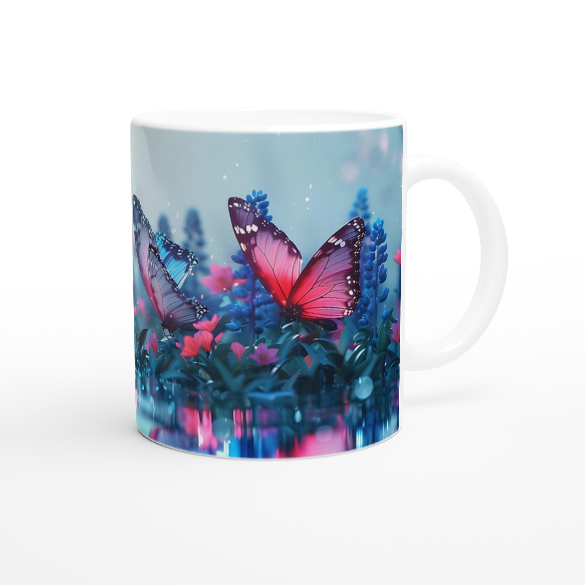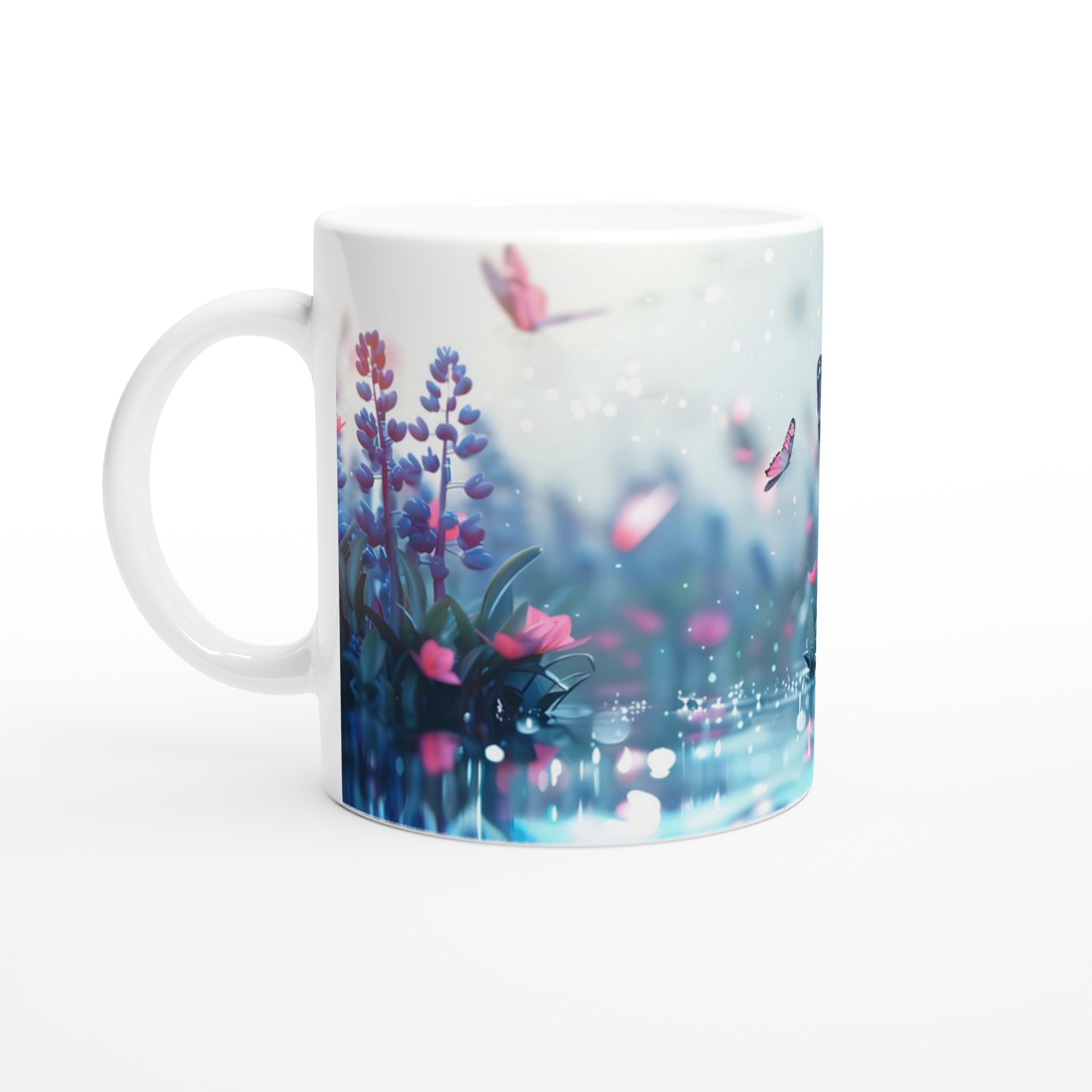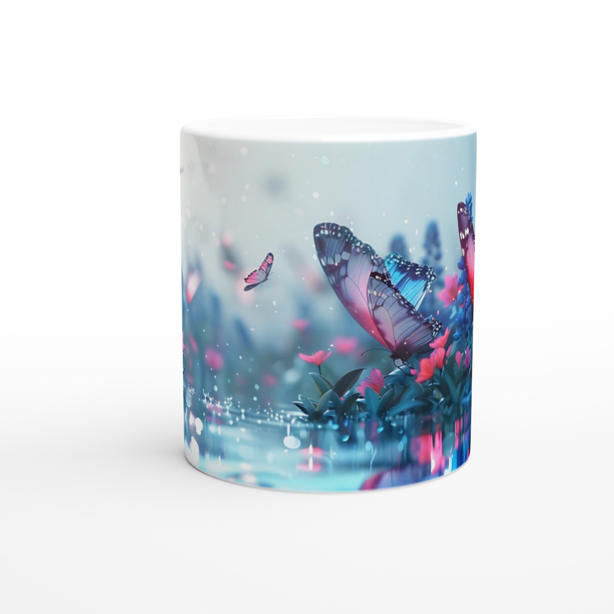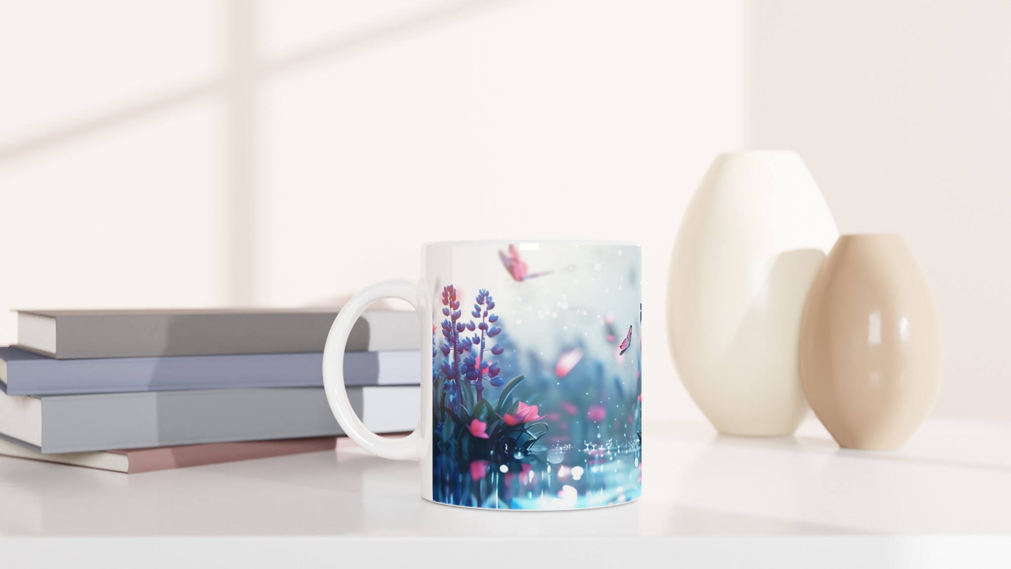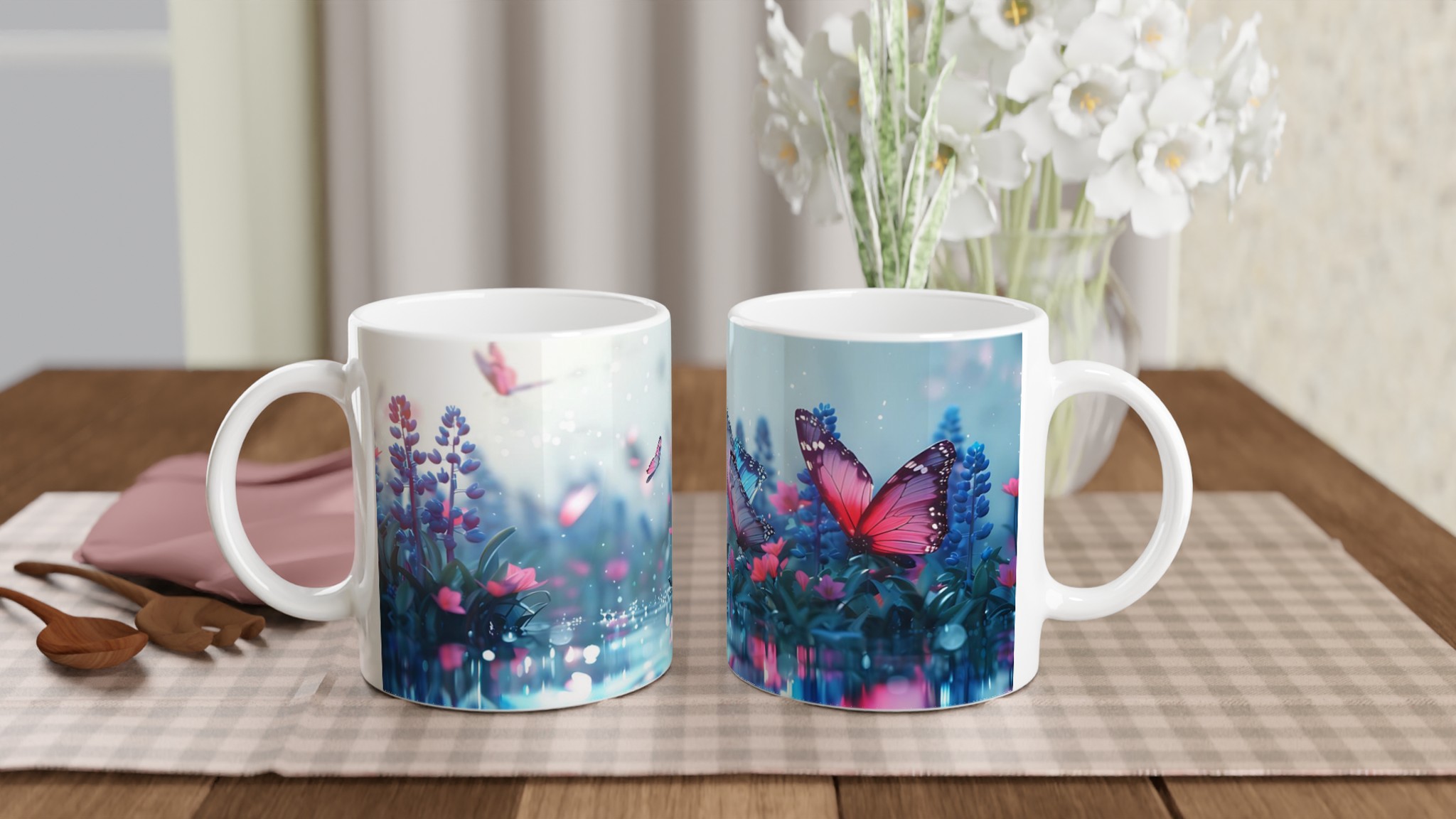 Vakna upp till en trädgård av drömmar med vår ”Fjärilsdrömmar” keramiska mugg. Låt de eteriska fjärilarna och de vibrerande blommorna på denna mugg föra dig till en fridfull oas varje morgon. Denna stilrena keramiska mugg blir snabbt en vardagsfavorit. Perfekt för morgonkaffet, kvällens varma choklad eller när du bara vill njuta av en kopp te. Den blanka vita ytan gör att trycken framhävs med klara och levande färger, som håller sig fina även efter många turer i mikron och diskmaskinen.
