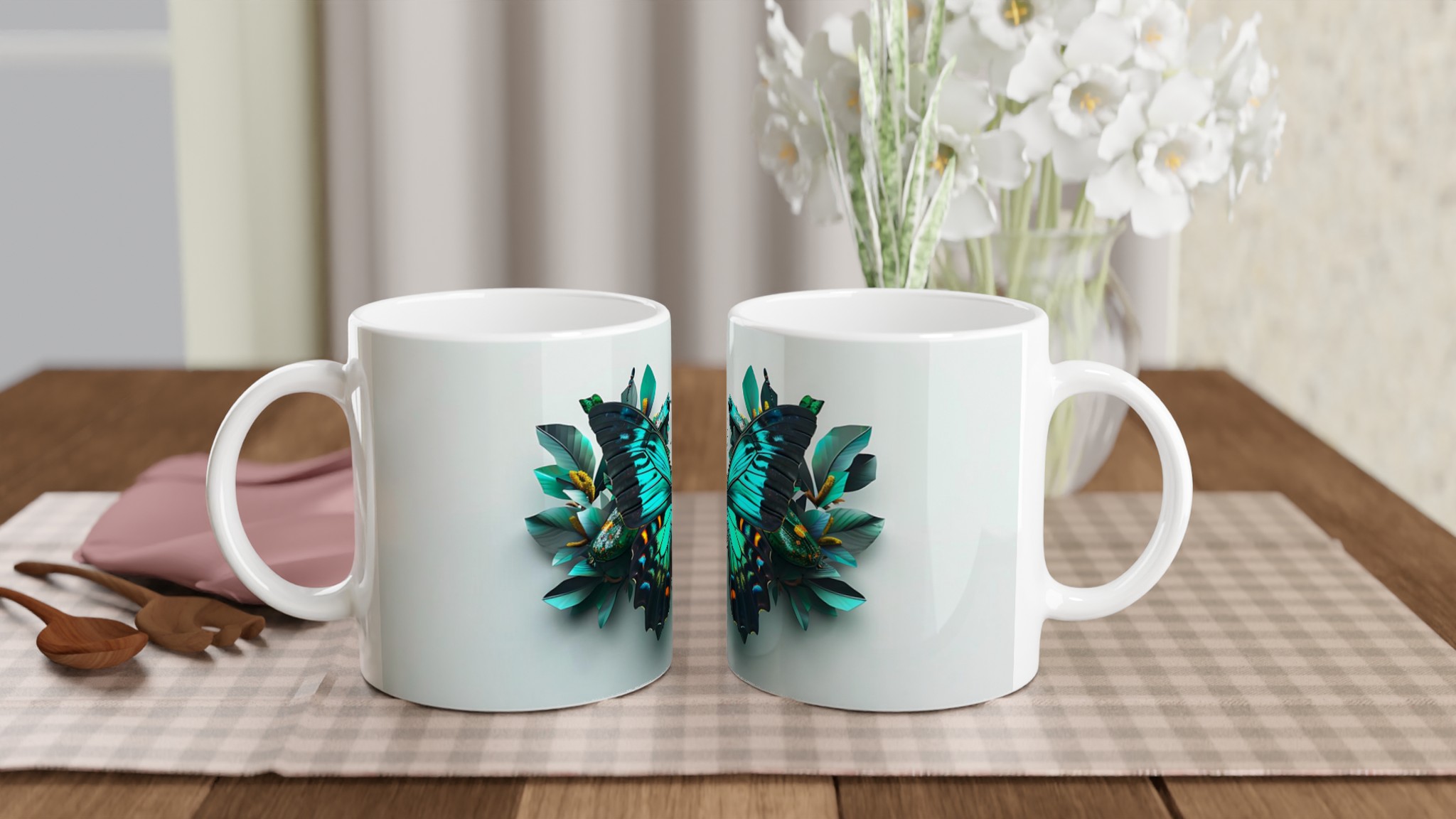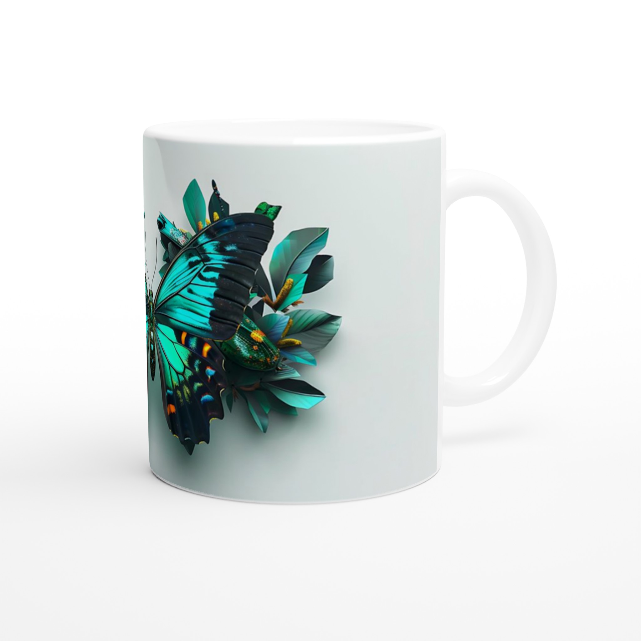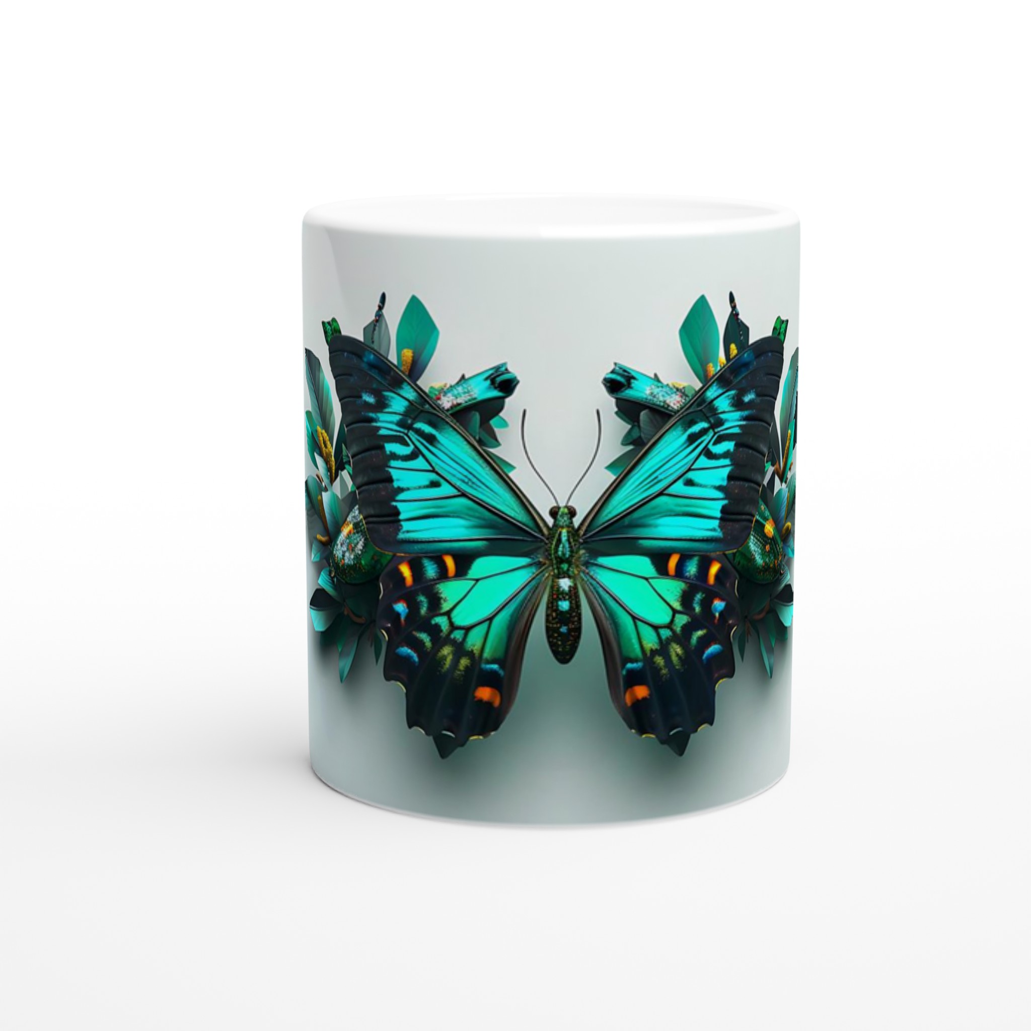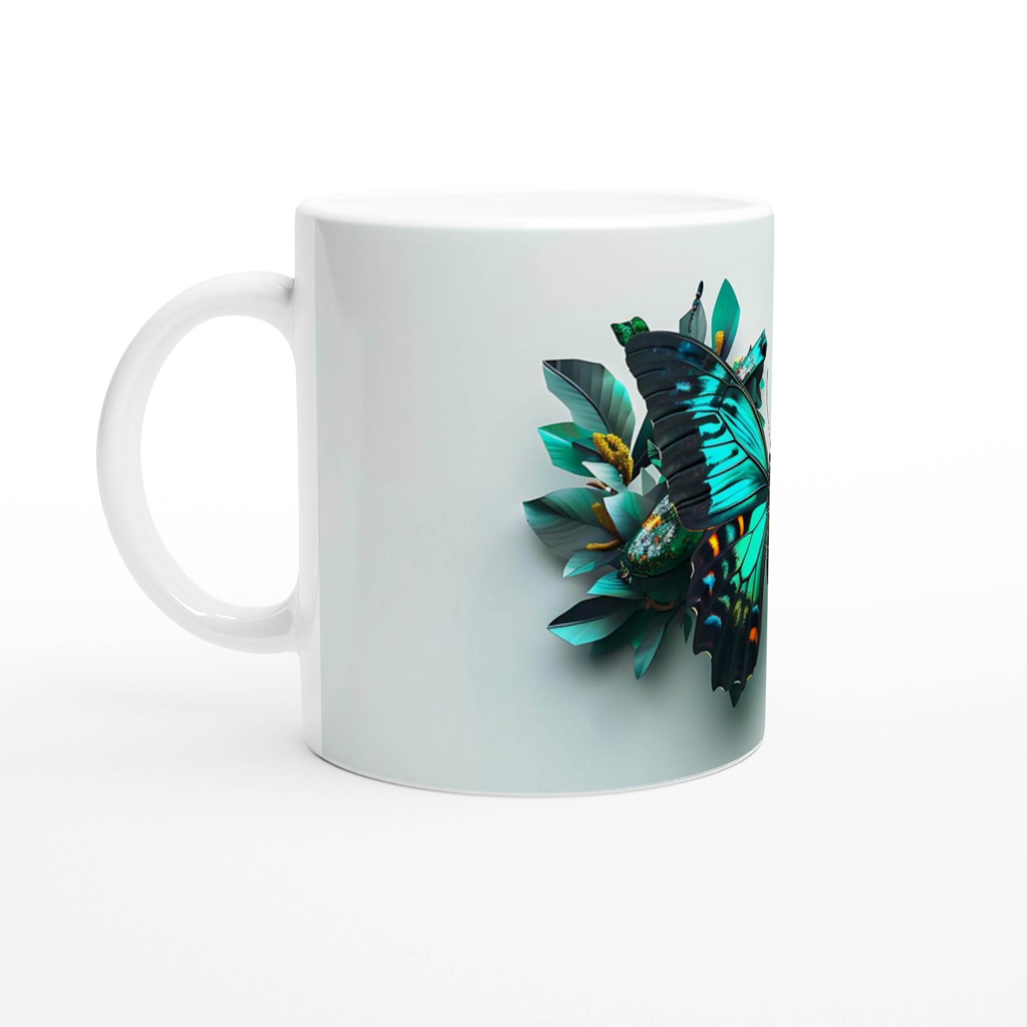 Väck din inre fjäril till liv med denna fängslande keramiska mugg, prydd med en magnifik, blågrön fjäril omgiven av lummiga blad. Dess intrikata design och livfulla färgpalett, med inslag av varma orangea accenter, gör varje klunk till en liten flykt. Den här stilrena muggen blir snabbt en vardagsfavorit. Perfekt för morgonkaffet, kvällens varma choklad eller när du bara vill njuta av en kopp te. Den blanka vita ytan gör att trycken framhävs med klara och levande färger, som håller sig fina även efter många turer i mikron och diskmaskinen.