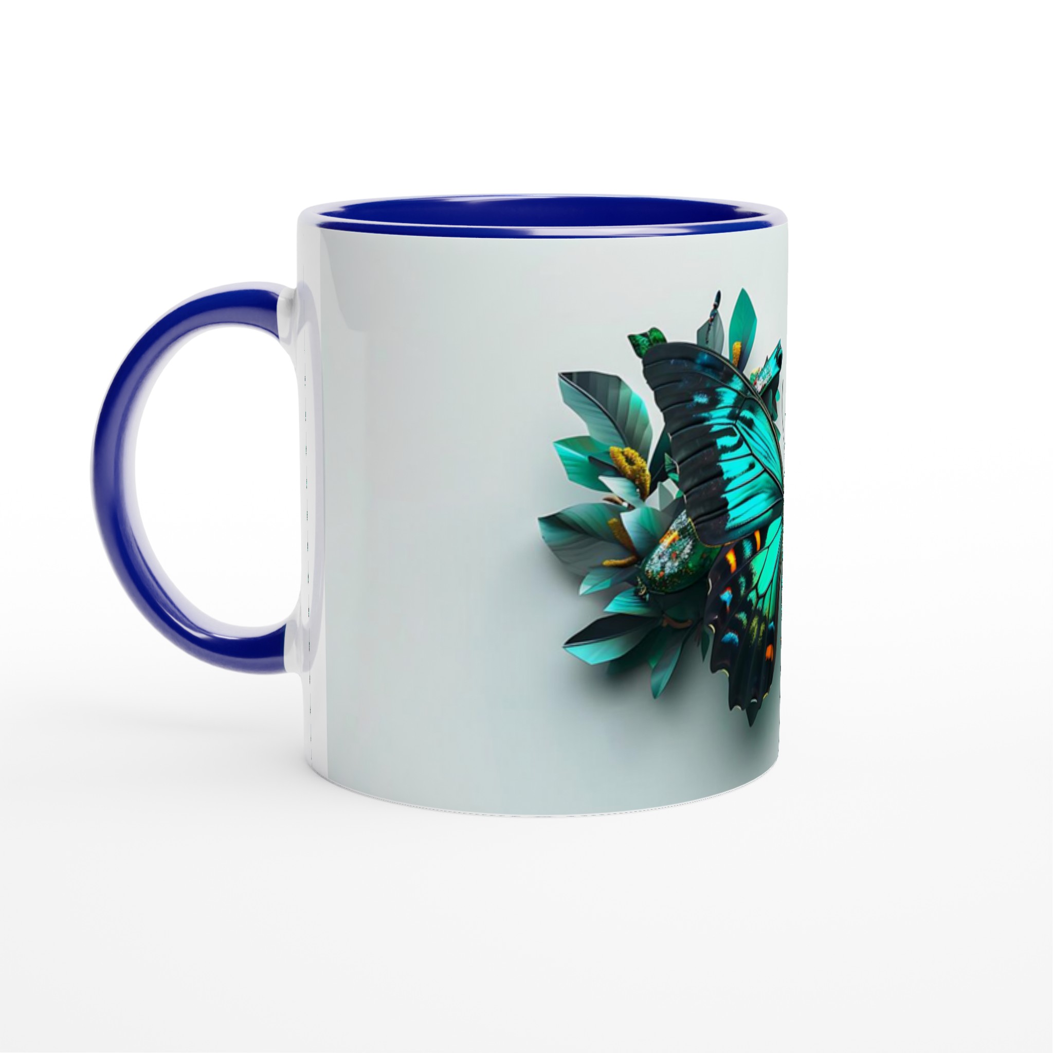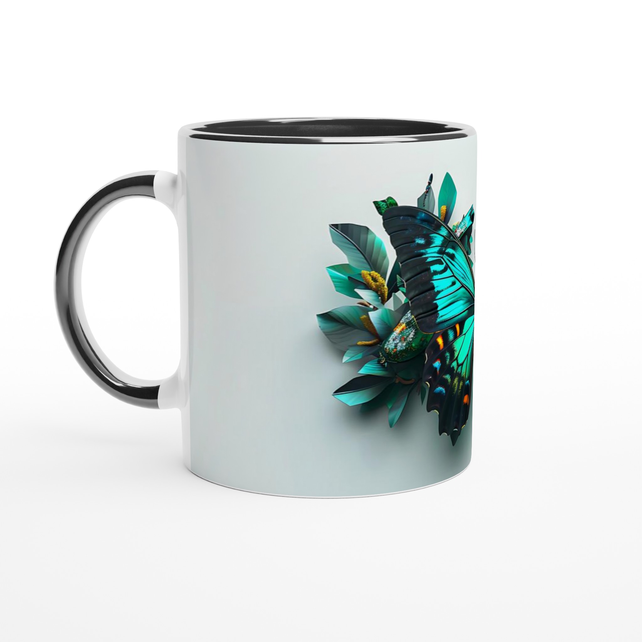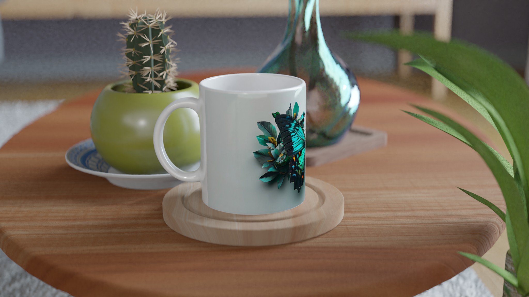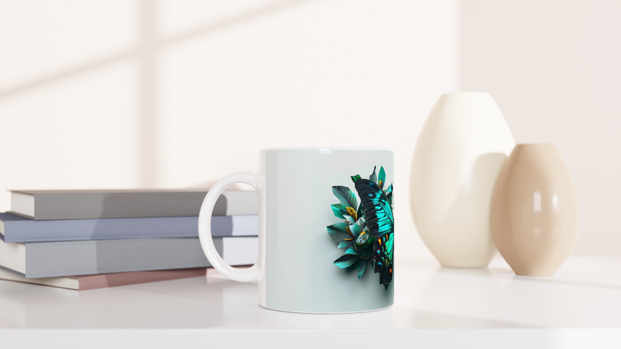 Väck din inre fjäril till liv med denna fängslande keramiska mugg, prydd med en magnifik, blågrön fjäril omgiven av lummiga blad. Dess intrikata design och livfulla färgpalett, med inslag av varma orangea accenter, gör varje klunk till en liten flykt. Den här stilrena muggen blir snabbt en vardagsfavorit. Perfekt för morgonkaffet, kvällens varma choklad eller när du bara vill njuta av en kopp te. Den blanka vita ytan gör att trycken framhävs med klara och levande färger, som håller sig fina även efter många turer i mikron och diskmaskinen.