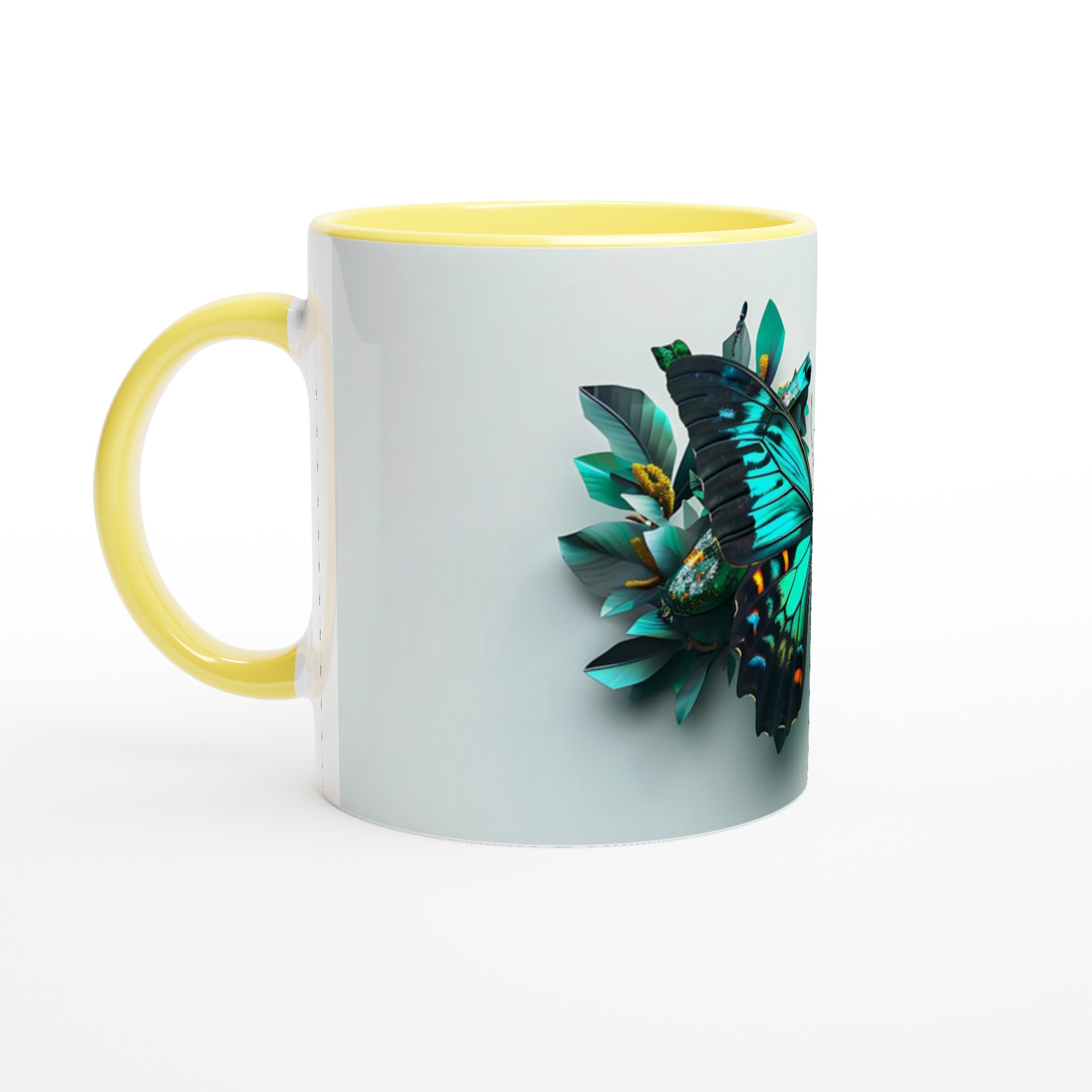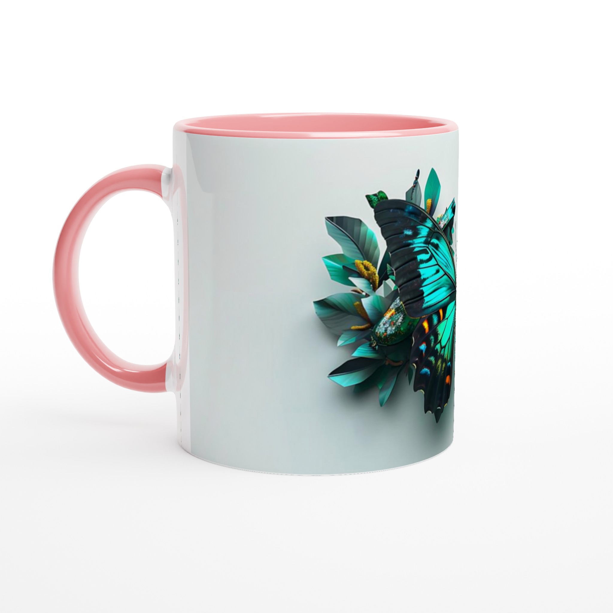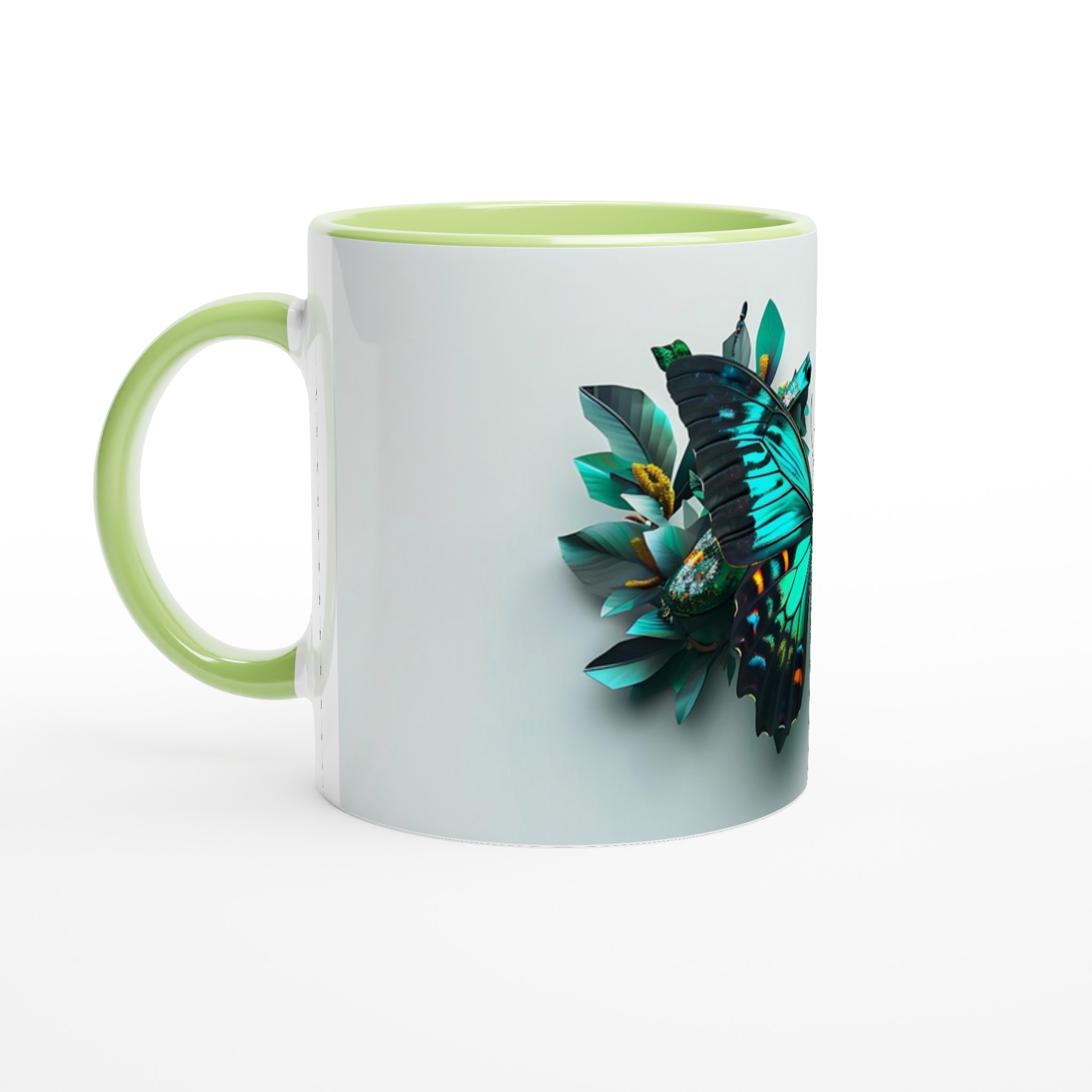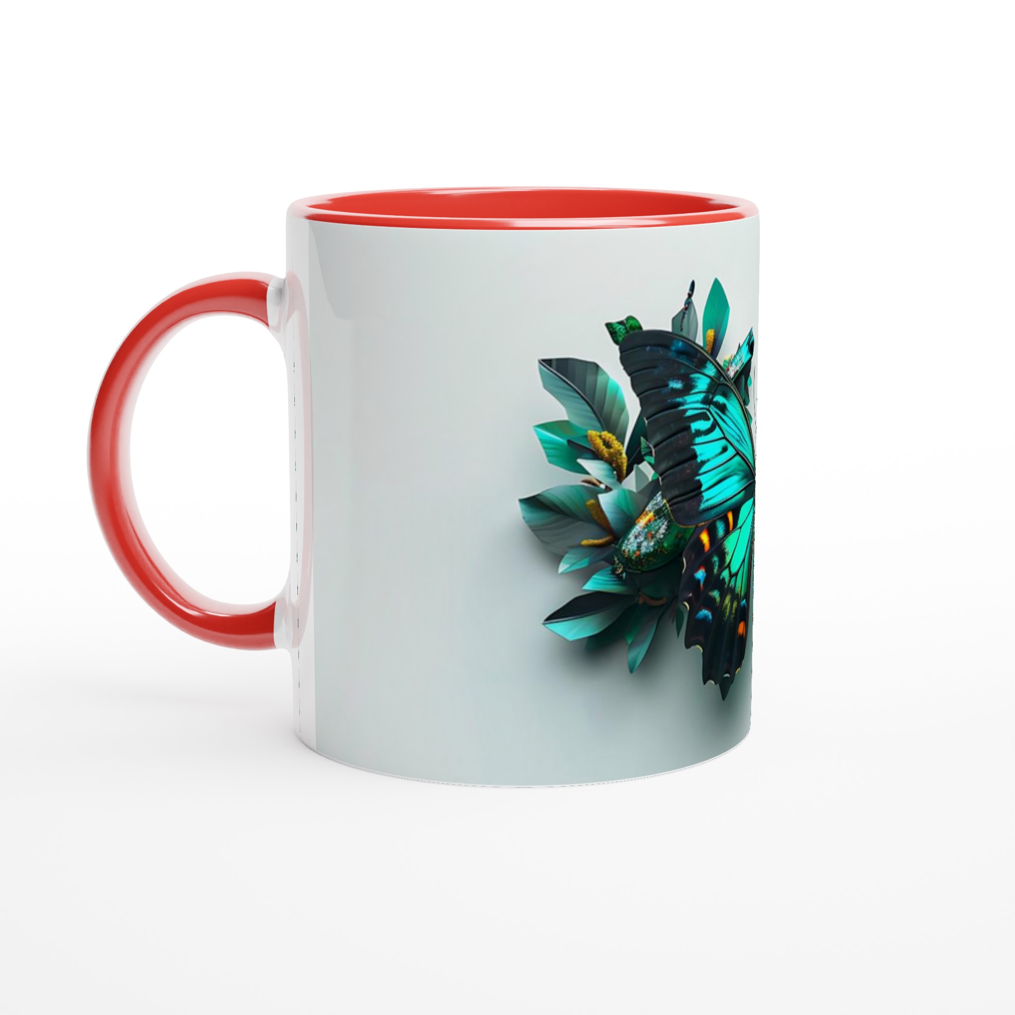 Väck din inre fjäril till liv med denna fängslande keramiska mugg, prydd med en magnifik, blågrön fjäril omgiven av lummiga blad. Dess intrikata design och livfulla färgpalett, med inslag av varma orangea accenter, gör varje klunk till en liten flykt. Den här stilrena muggen blir snabbt en vardagsfavorit. Perfekt för morgonkaffet, kvällens varma choklad eller när du bara vill njuta av en kopp te. Den blanka vita ytan gör att trycken framhävs med klara och levande färger, som håller sig fina även efter många turer i mikron och diskmaskinen.