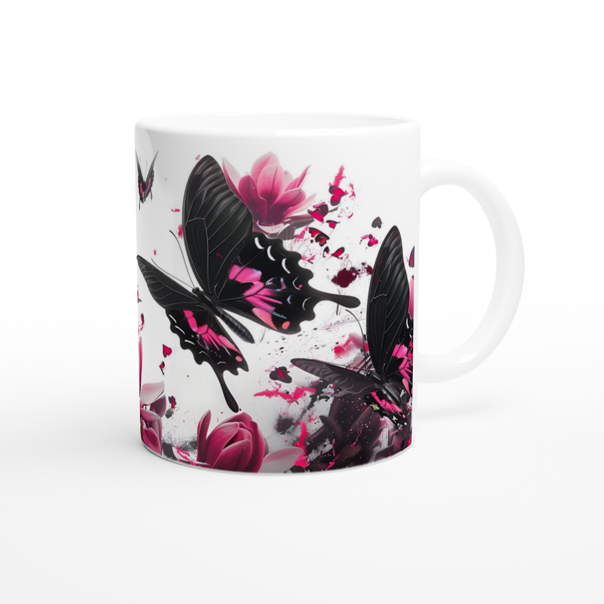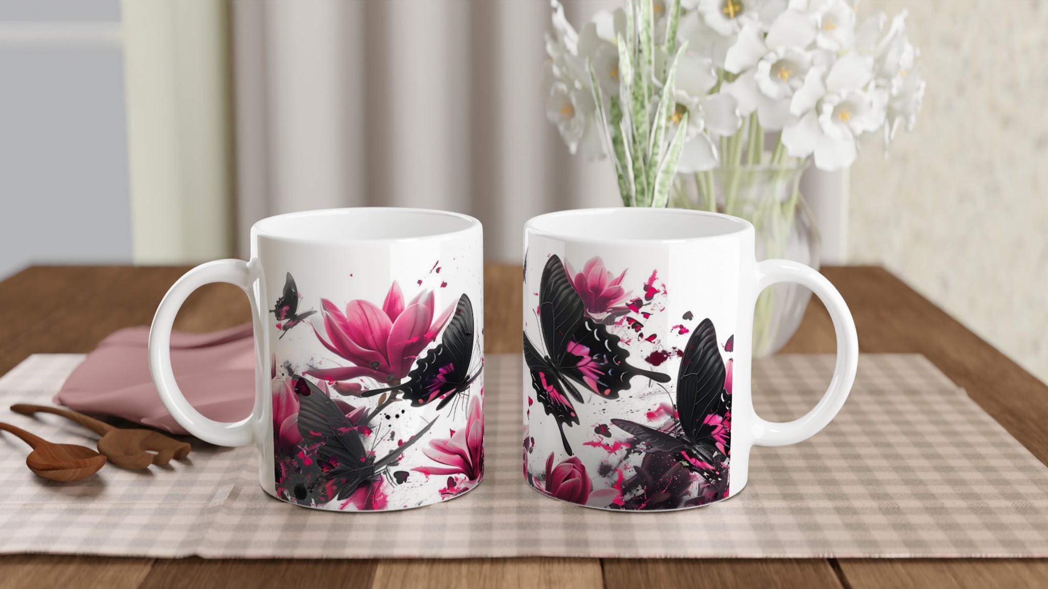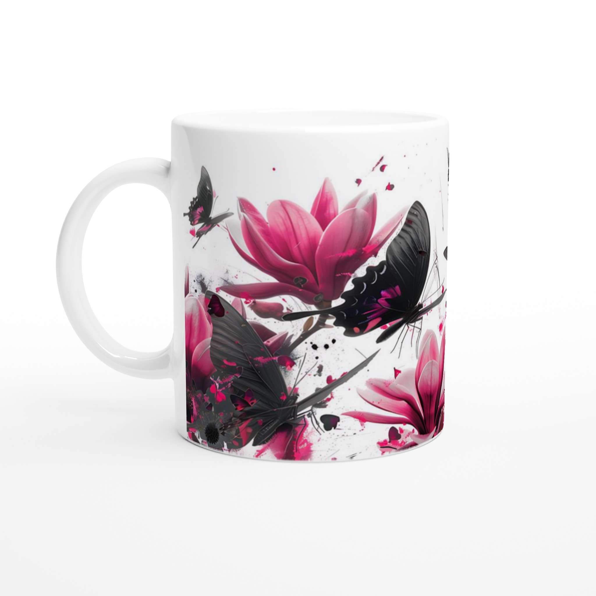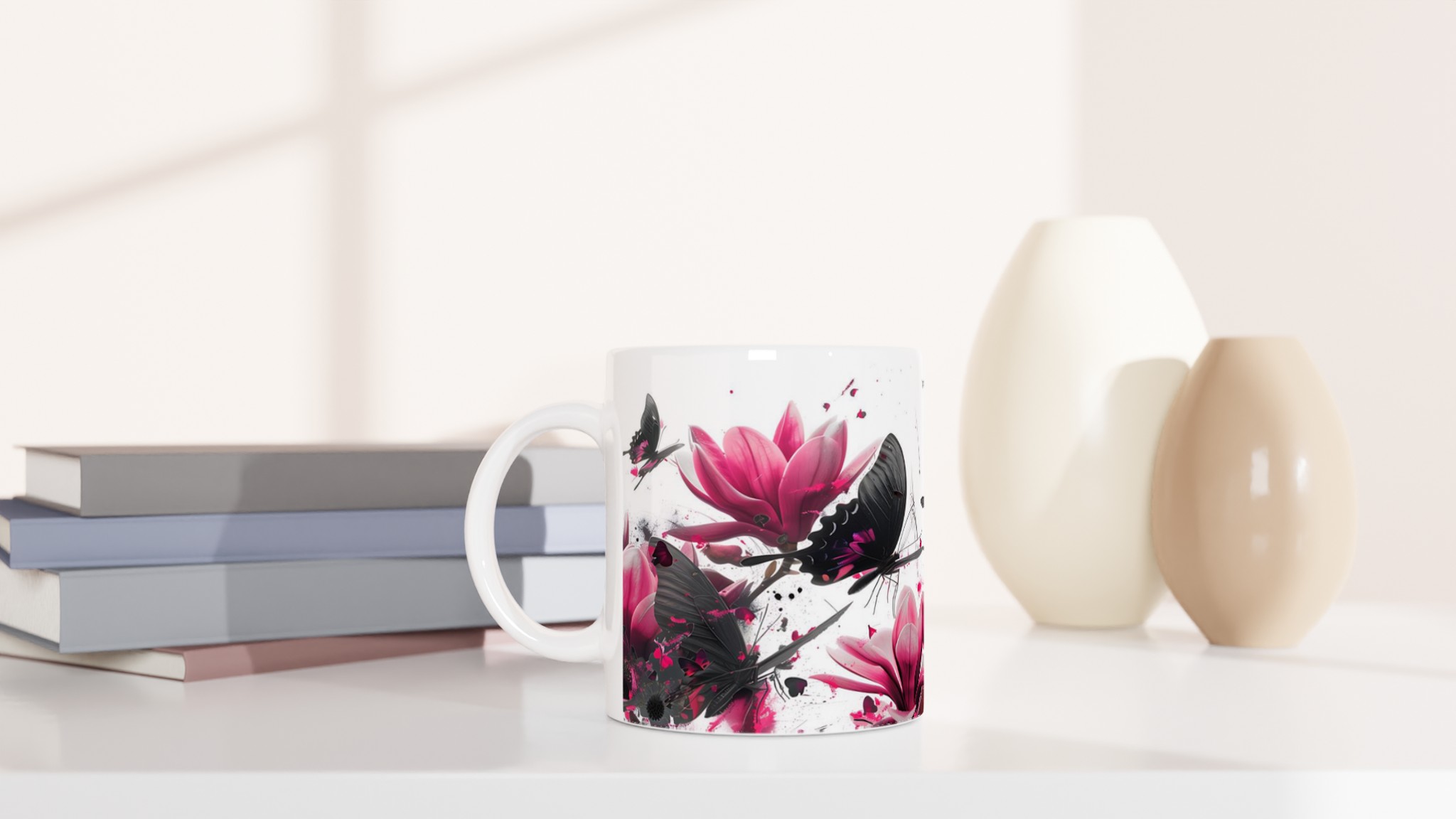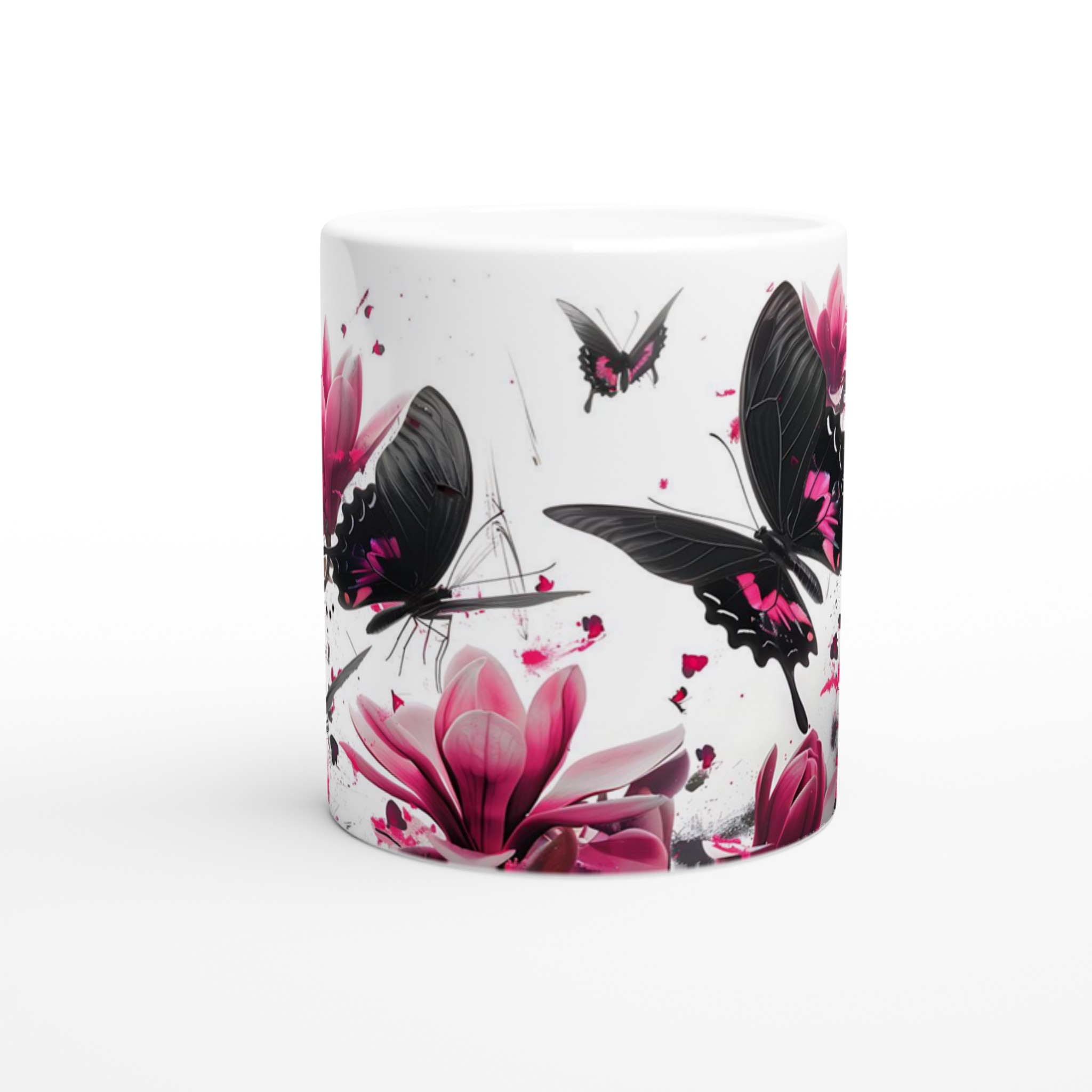 Fånga naturens skönhet och konstens dramatik med vår ”Fjärilsmagi” keramiska mugg. Varje klunk blir en upplevelse när du omfamnas av den fängslande designen med svarta fjärilar och levande ceriseblommor, accentuerade med konstfulla stänk. Denna mugg är inte bara en behållare för din favoritdryck, den är en hyllning till det vackra och oväntade.