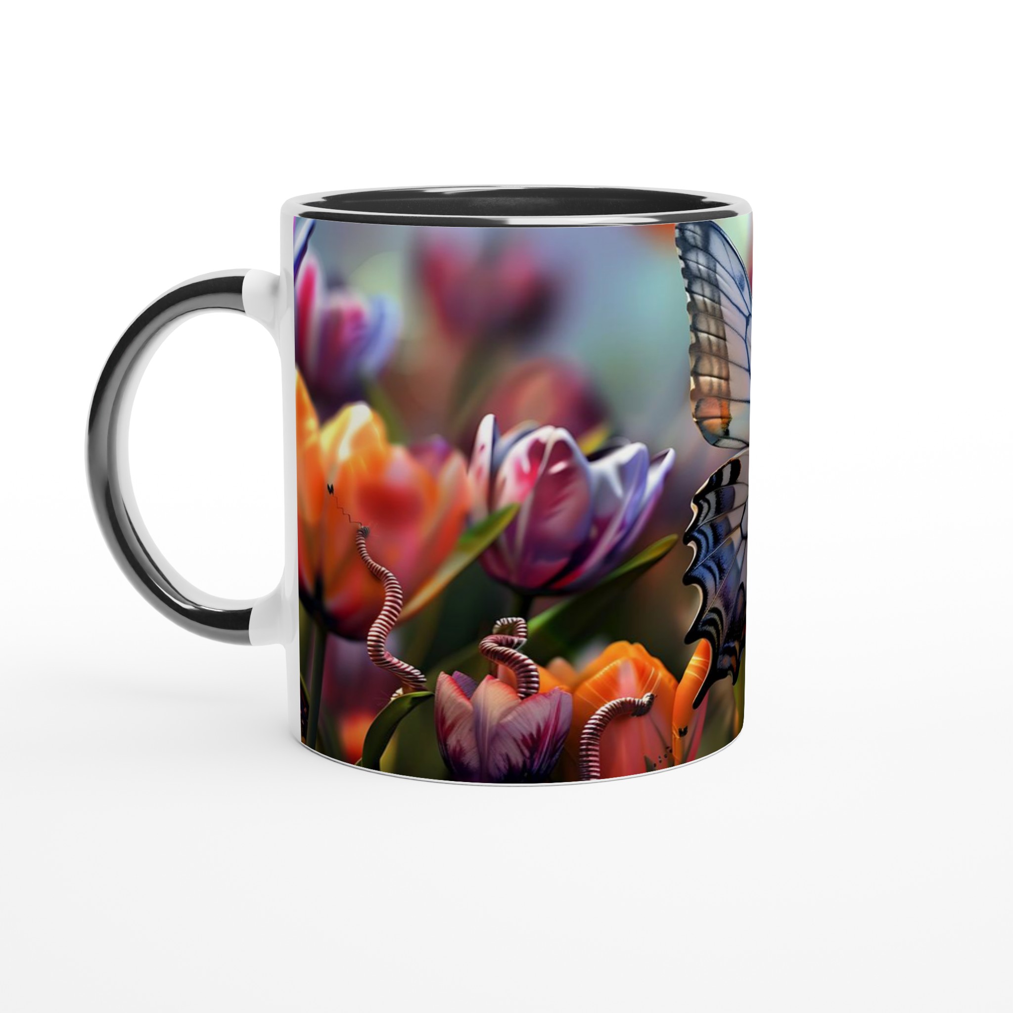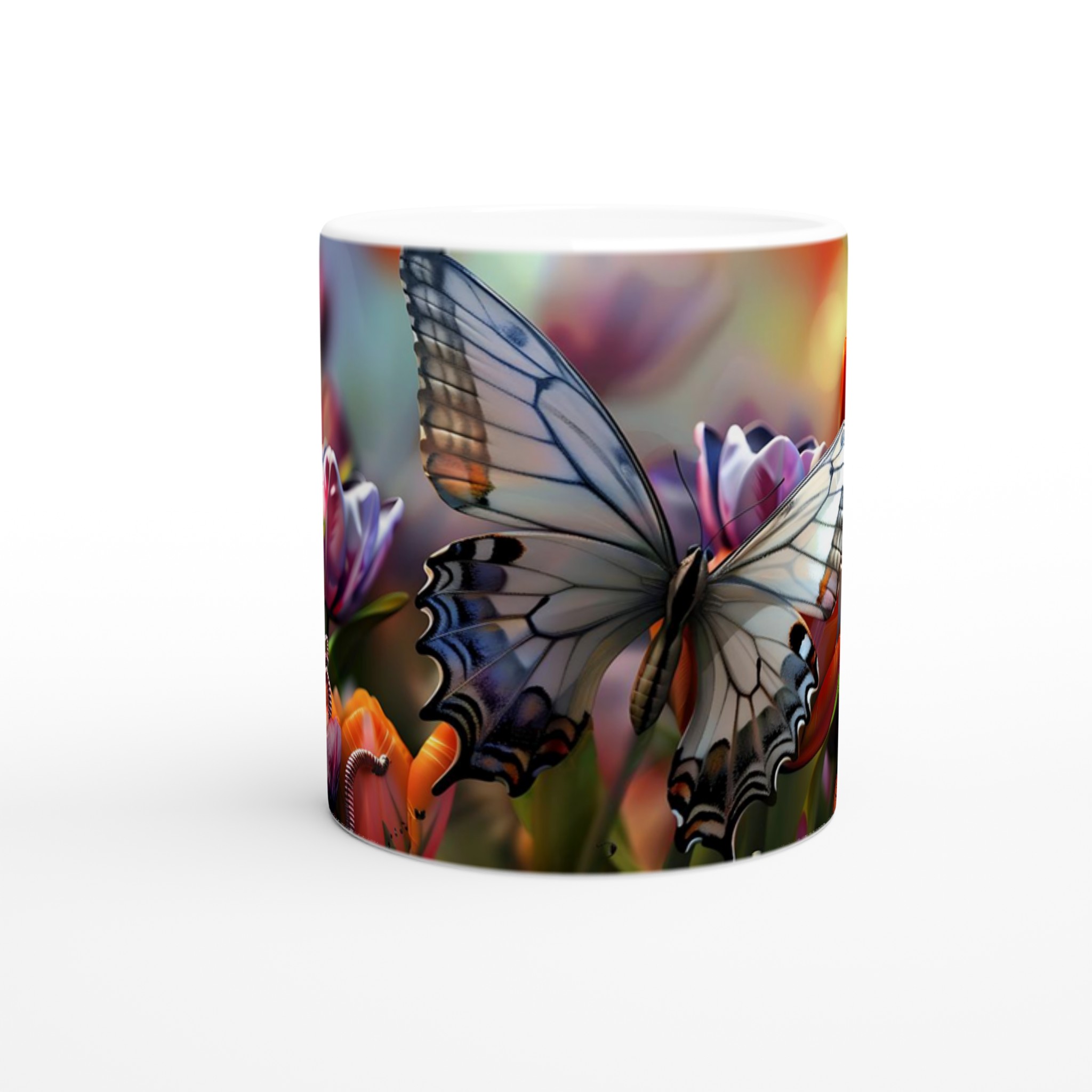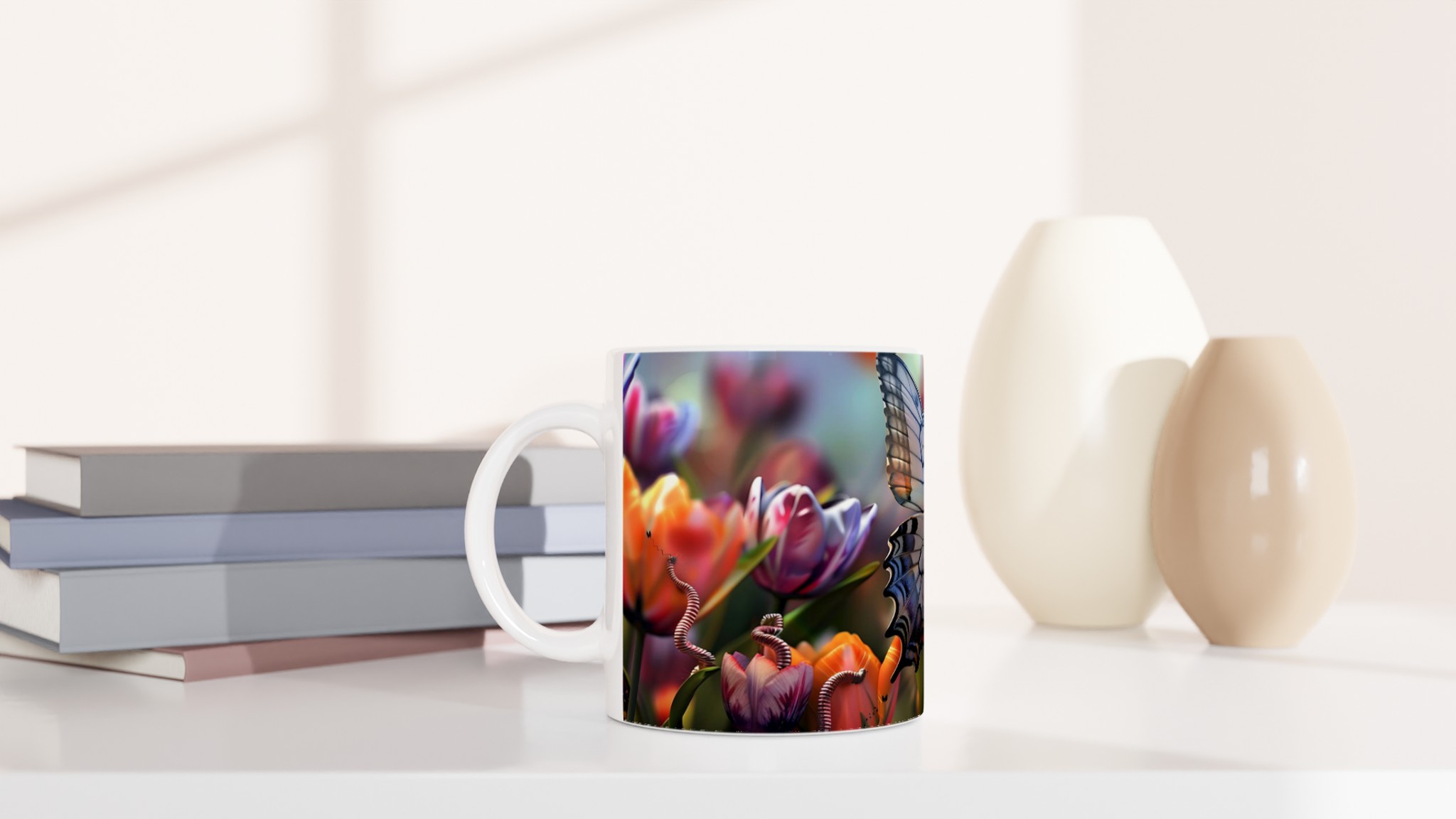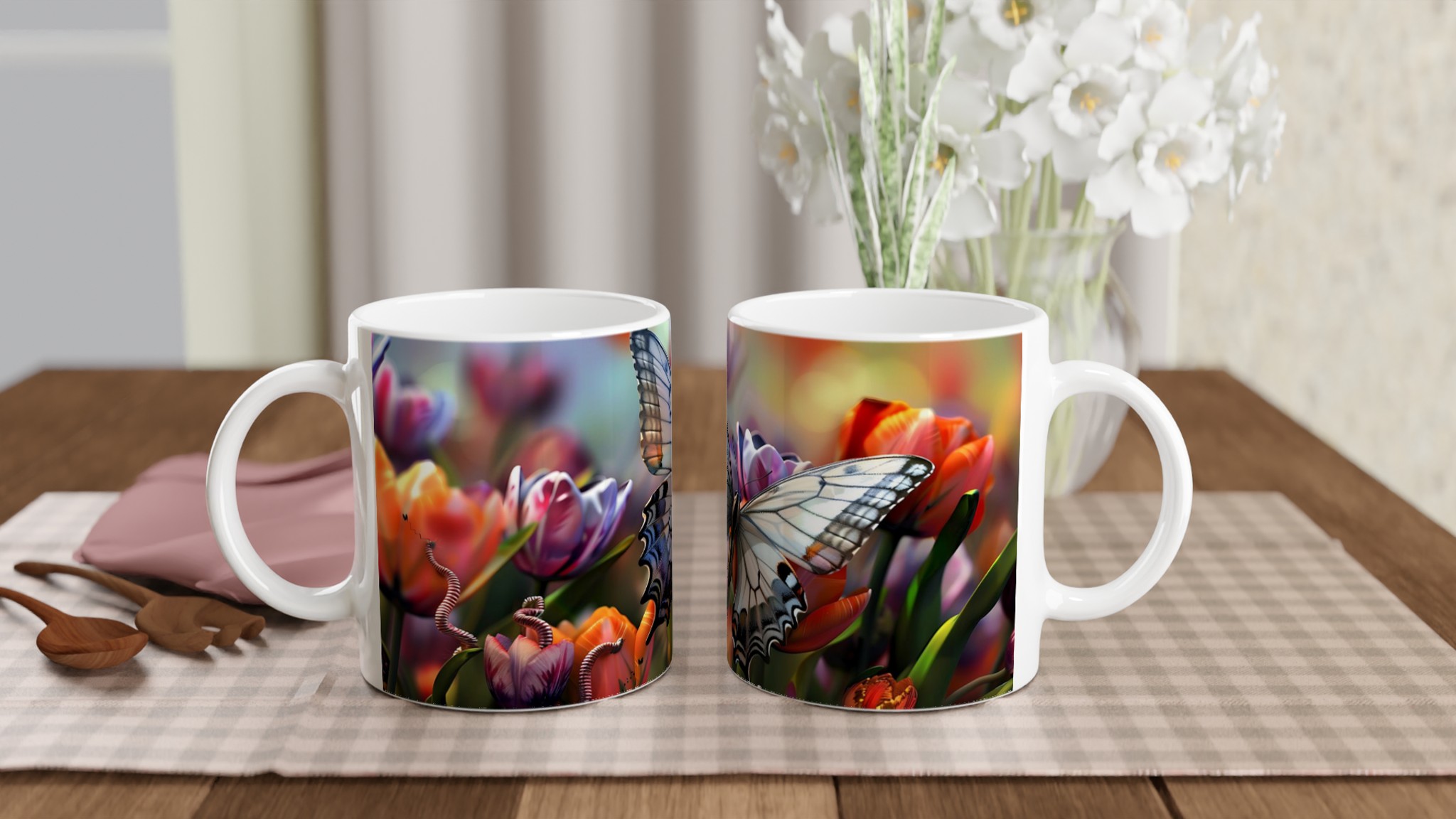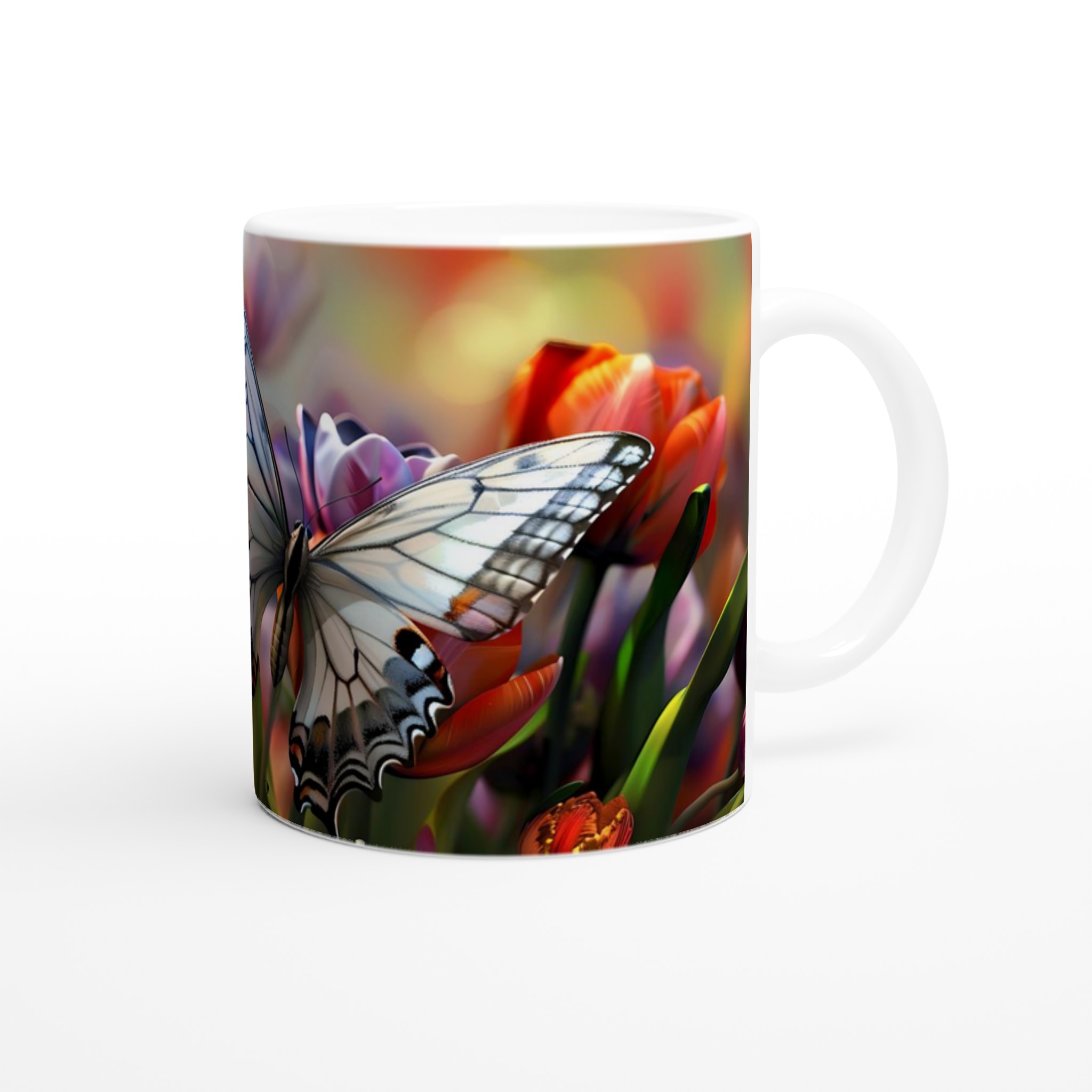 Fånga skönheten i en solkysst trädgård med denna förtrollande keramiska mugg. Designen, som pryds av en majestätisk fjäril bland livfulla tulpaner i varma, drömska toner av rosa, lila och orange, förvandlar varje sipp till en stunds avkoppling. Den här stilrena keramiska muggen blir snabbt en vardagsfavorit. Perfekt för morgonkaffet, kvällens varma choklad eller när du bara vill njuta av en kopp te. Den blanka vita ytan gör att trycken framhävs med klara och levande färger, som håller sig fina även efter många turer i mikron och diskmaskinen.