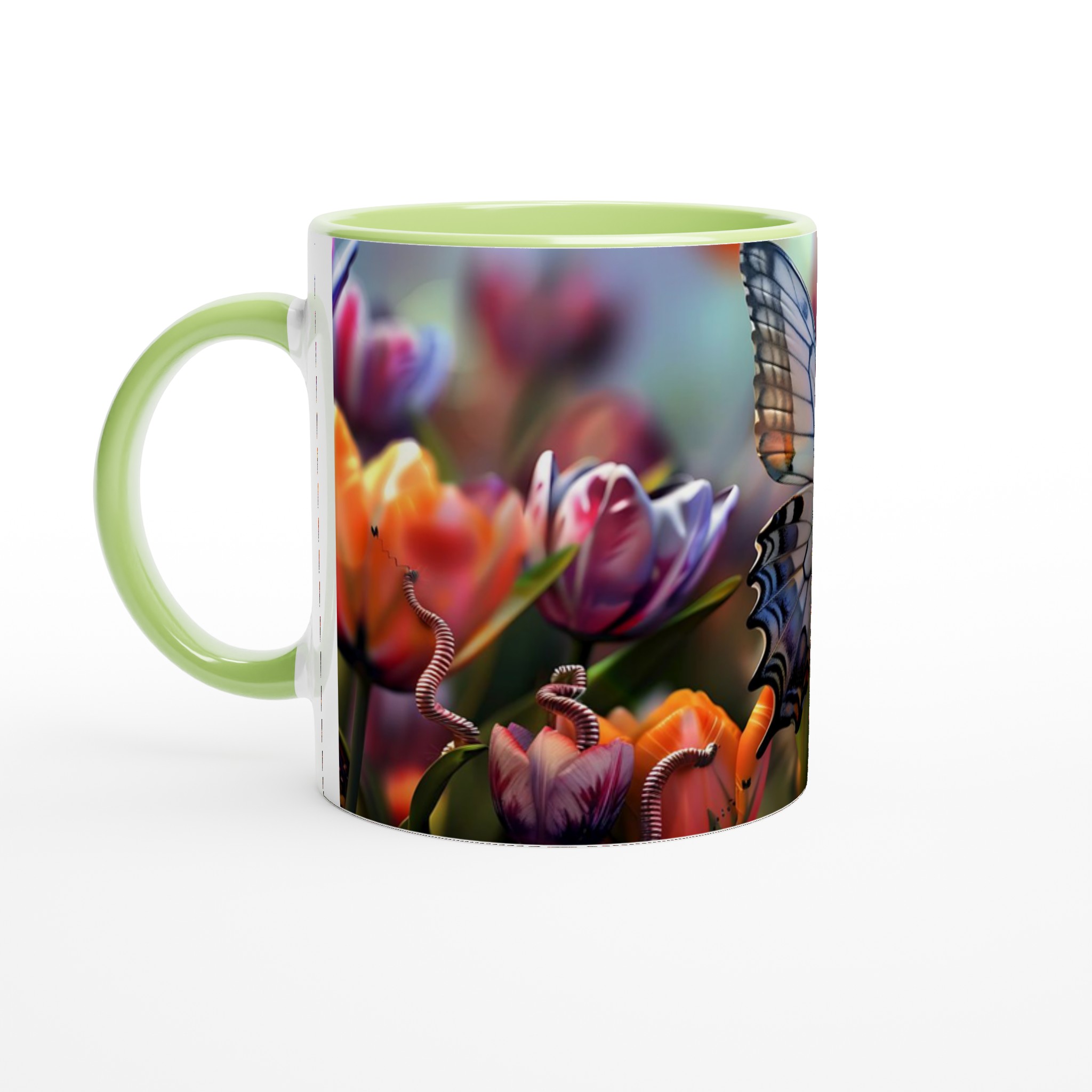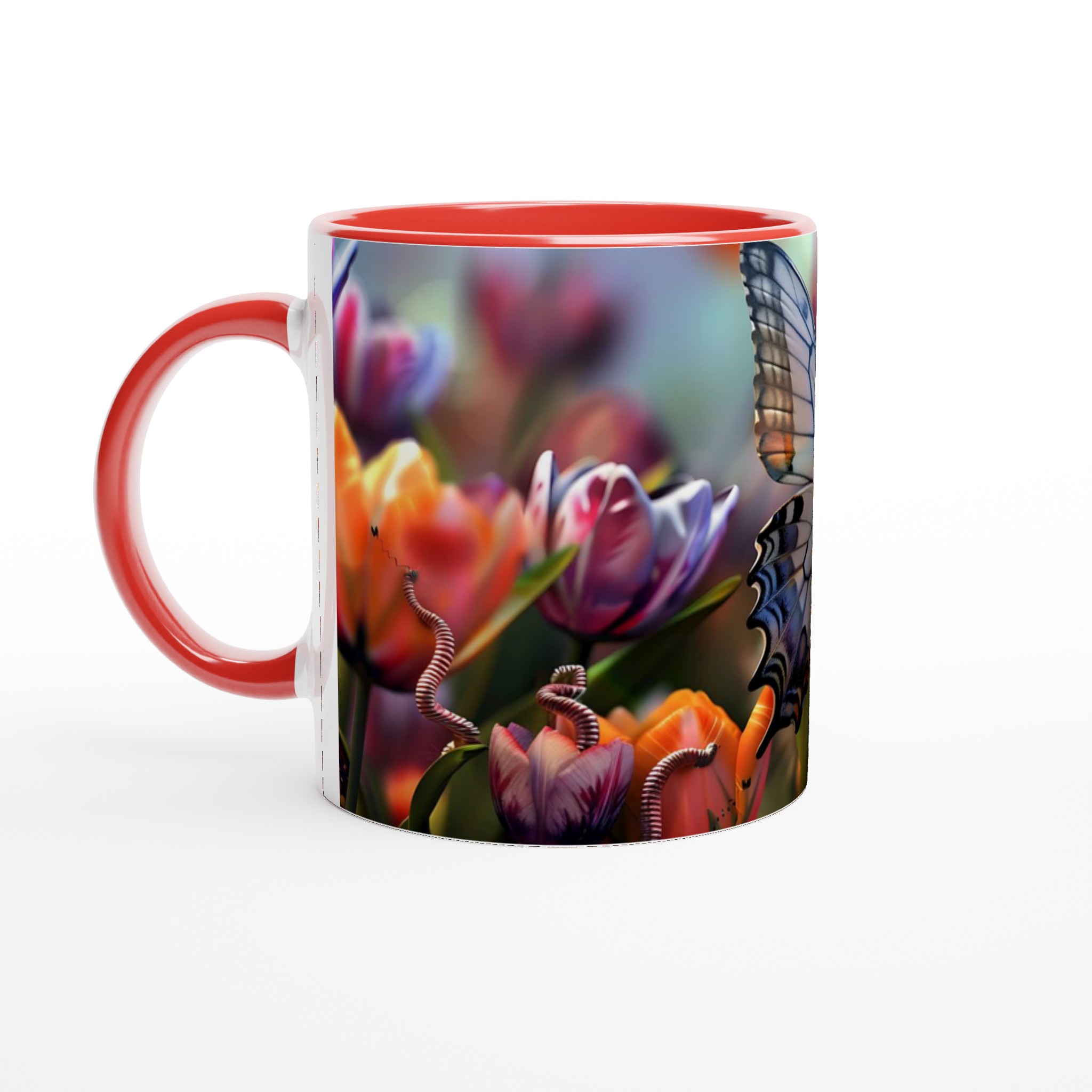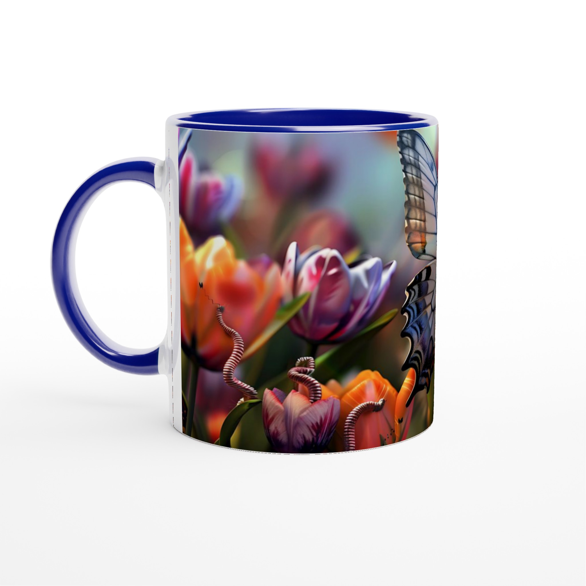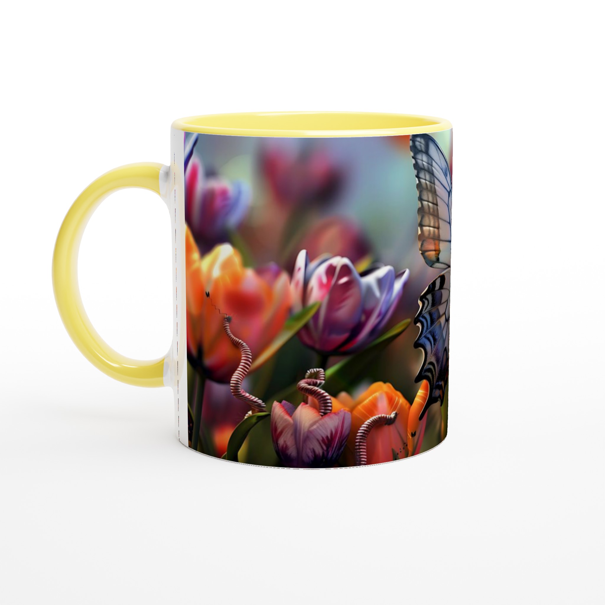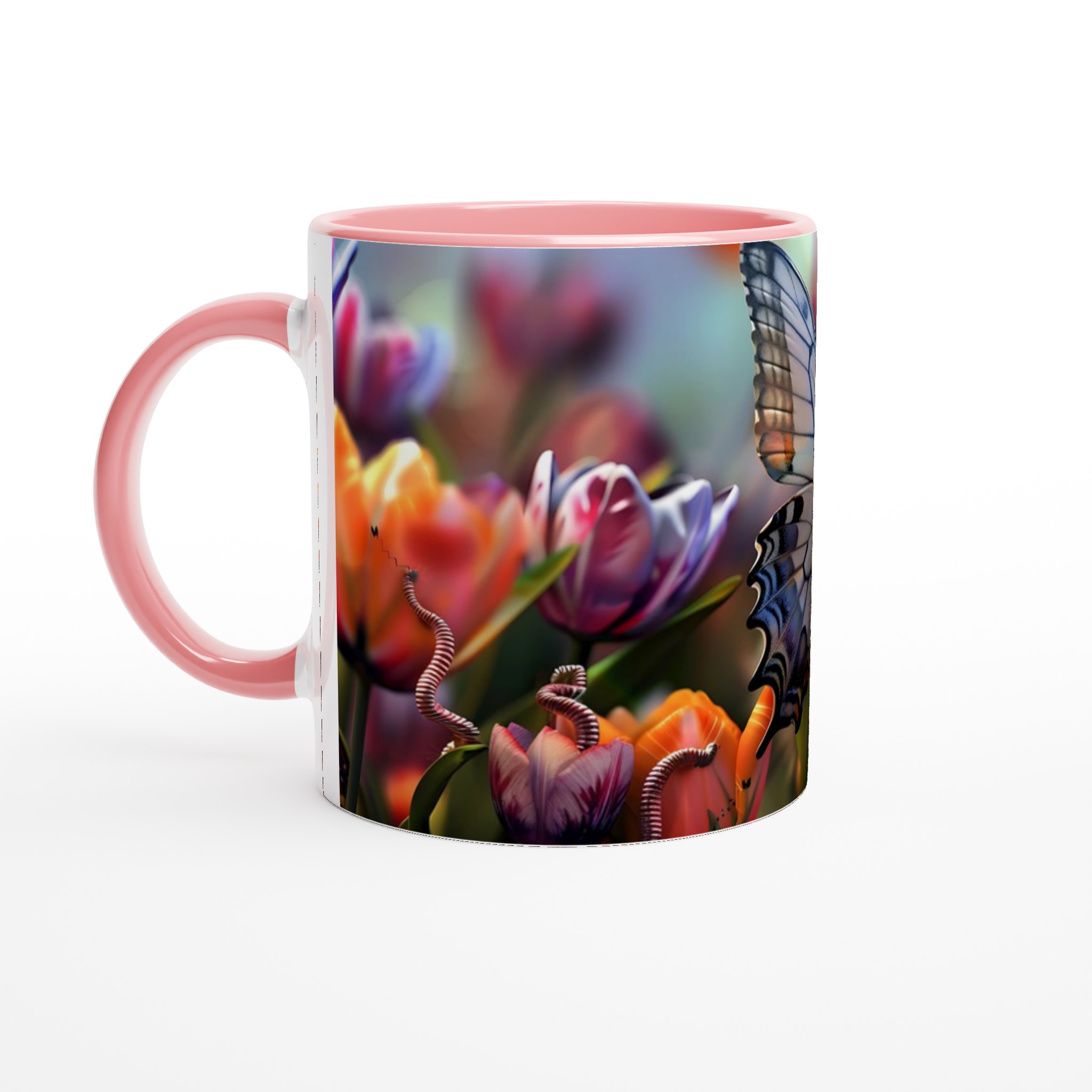 Fånga skönheten i en solkysst trädgård med denna förtrollande keramiska mugg. Designen, som pryds av en majestätisk fjäril bland livfulla tulpaner i varma, drömska toner av rosa, lila och orange, förvandlar varje sipp till en stunds avkoppling. Den här stilrena keramiska muggen blir snabbt en vardagsfavorit. Perfekt för morgonkaffet, kvällens varma choklad eller när du bara vill njuta av en kopp te. Den blanka vita ytan gör att trycken framhävs med klara och levande färger, som håller sig fina även efter många turer i mikron och diskmaskinen.