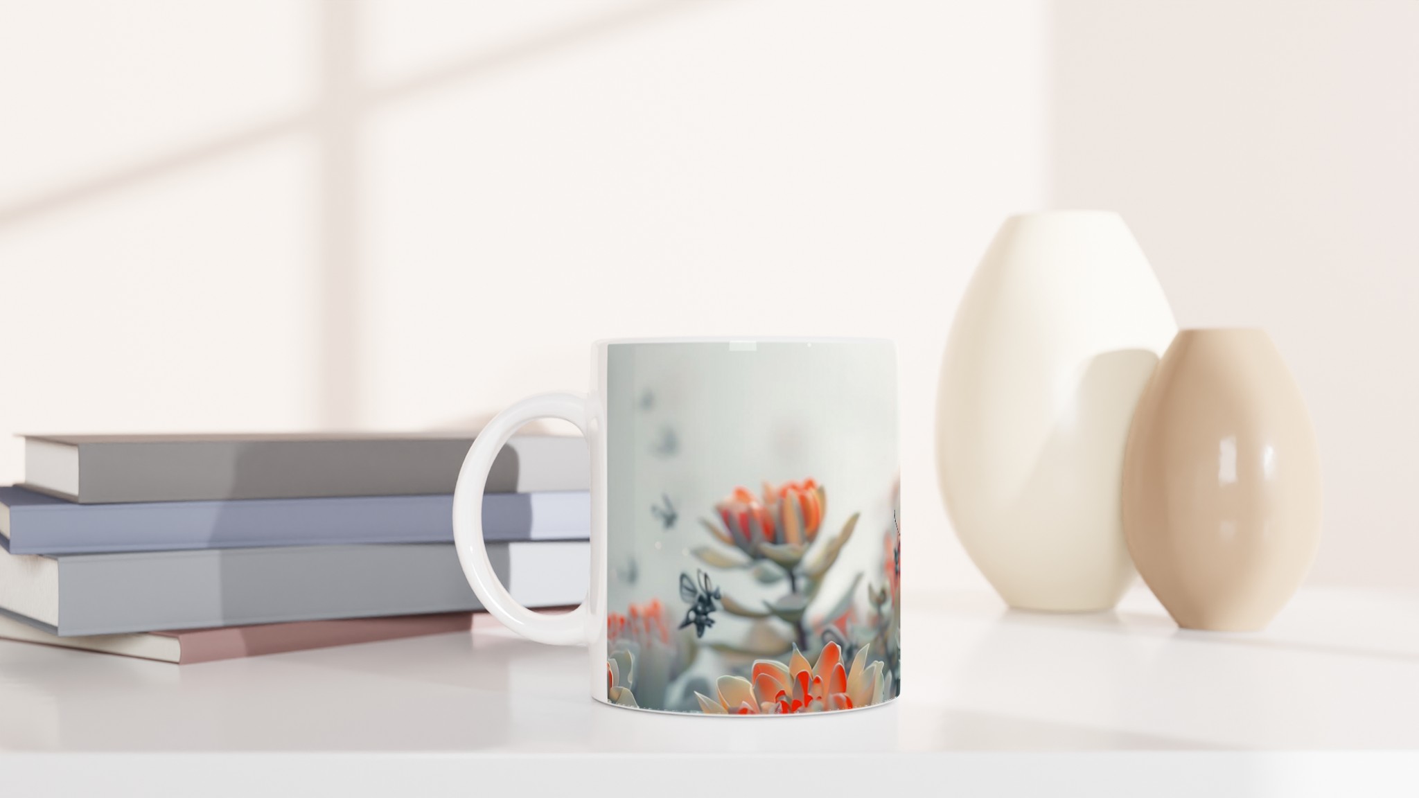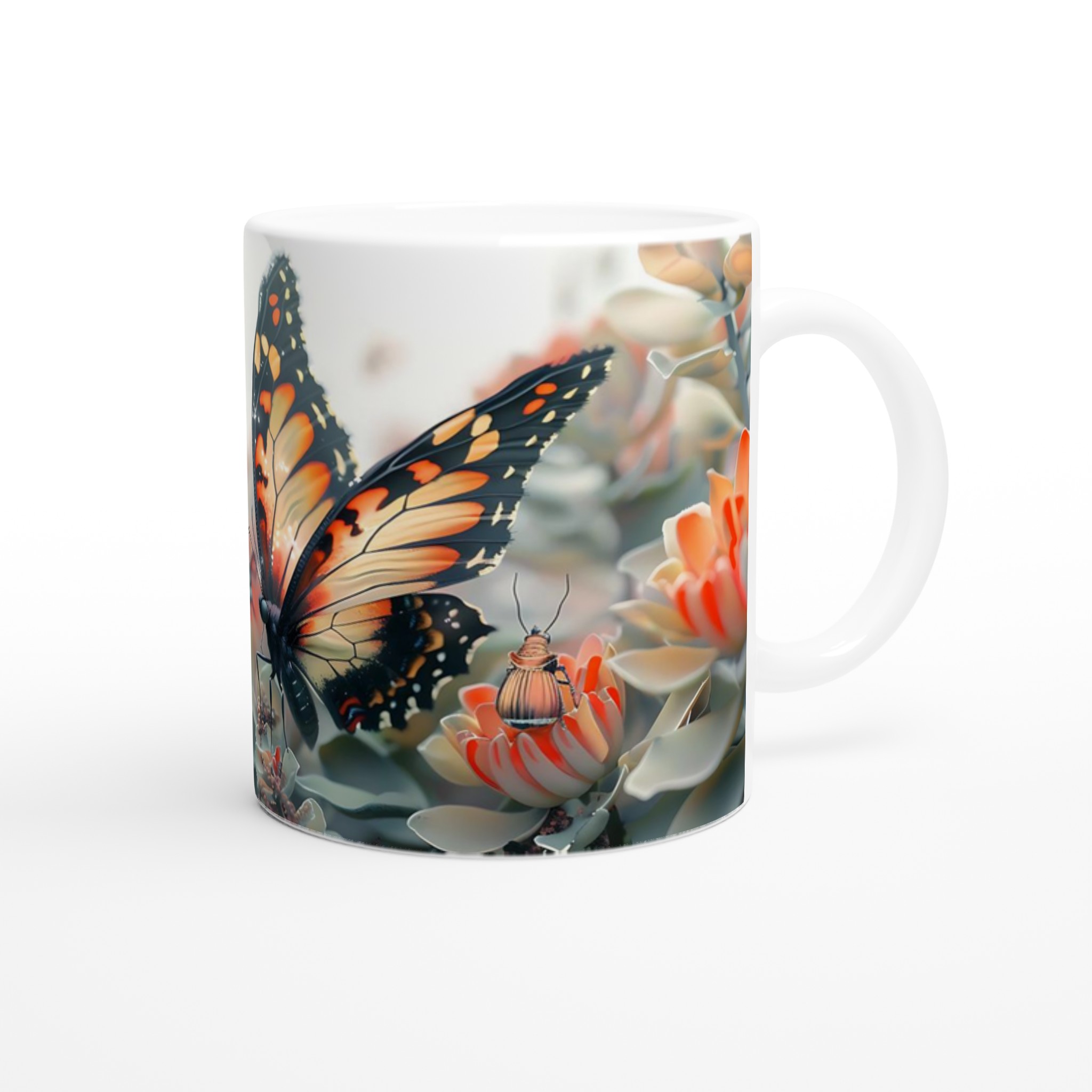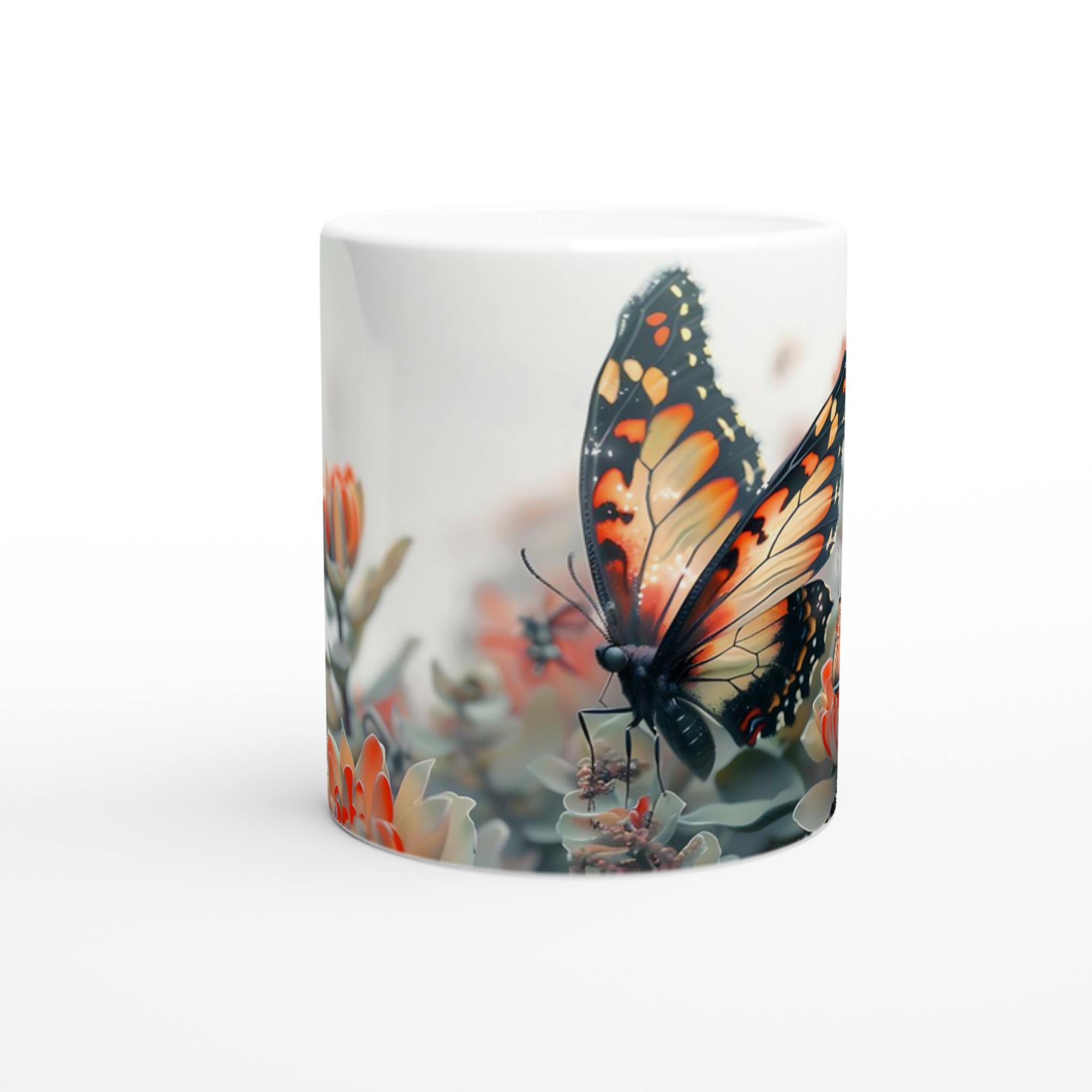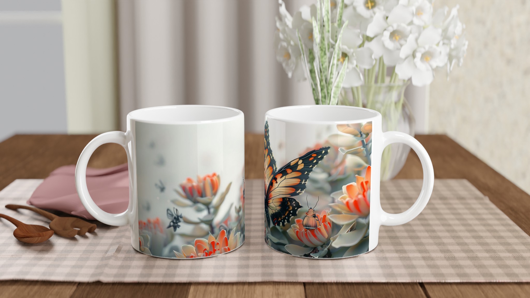 Fånga naturens förtrollande skönhet med vår Keramiska Mugg ”Fjärilsmagi”. Inspirerad av bildens drömska fjärilar och mjuka färgpalett, blir denna mugg en lugnande oas i din hand. Perfekt för morgonkaffet, kvällens varma choklad eller när du bara vill njuta av en kopp te. Den blanka vita ytan framhäver trycken med klara och levande färger, som håller sig fina även efter många turer i mikron och diskmaskinen, vilket gör varje sipp till en stund av ren avkoppling.