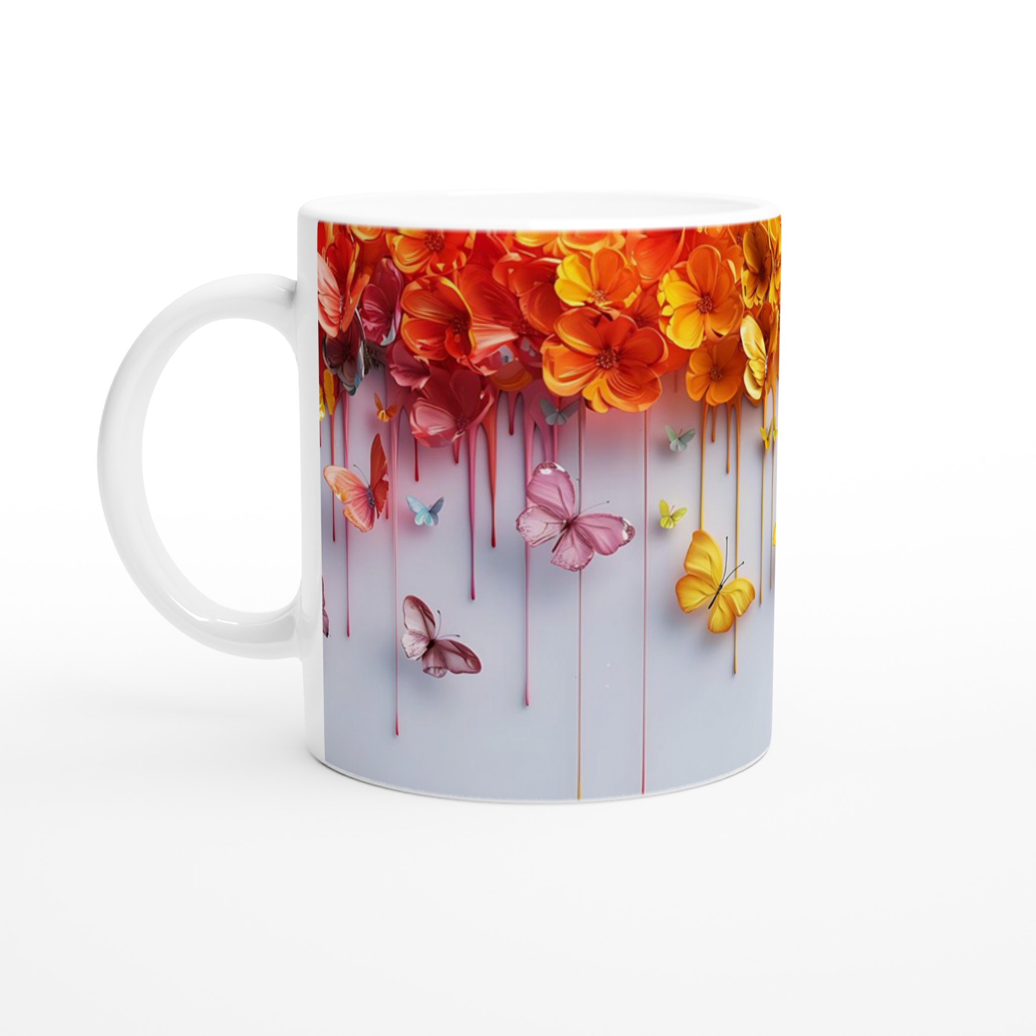 Denna charmiga mugg är inspirerad av naturens skönhet, med en konstnärlig design av fjärilar och blommor i en livfull palett av orange, rosa och blått. De lekfulla ”dropparna” skapar en dynamisk känsla som för tankarna till ett färgrikt drömlandskap. Den blanka vita ytan ger ett skarpt och levande tryck som verkligen sticker ut, oavsett om det är en personlig design, ett roligt citat eller en present till någon du tycker om.