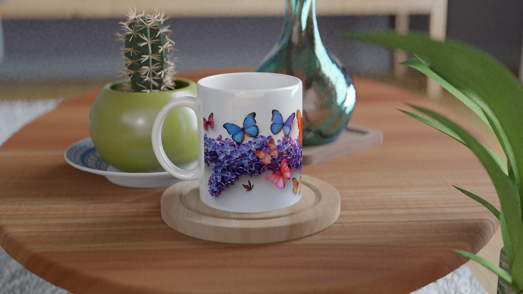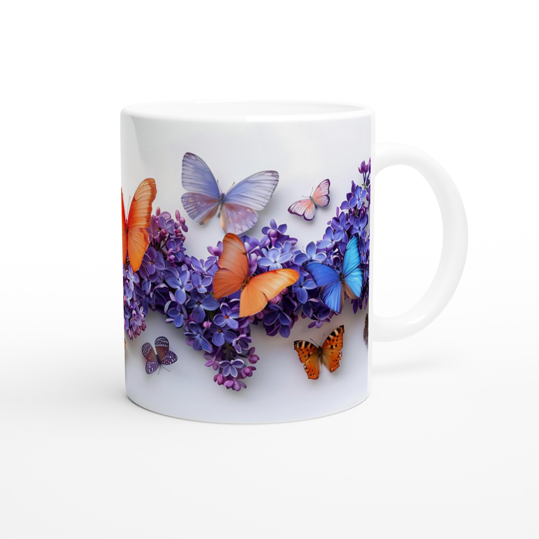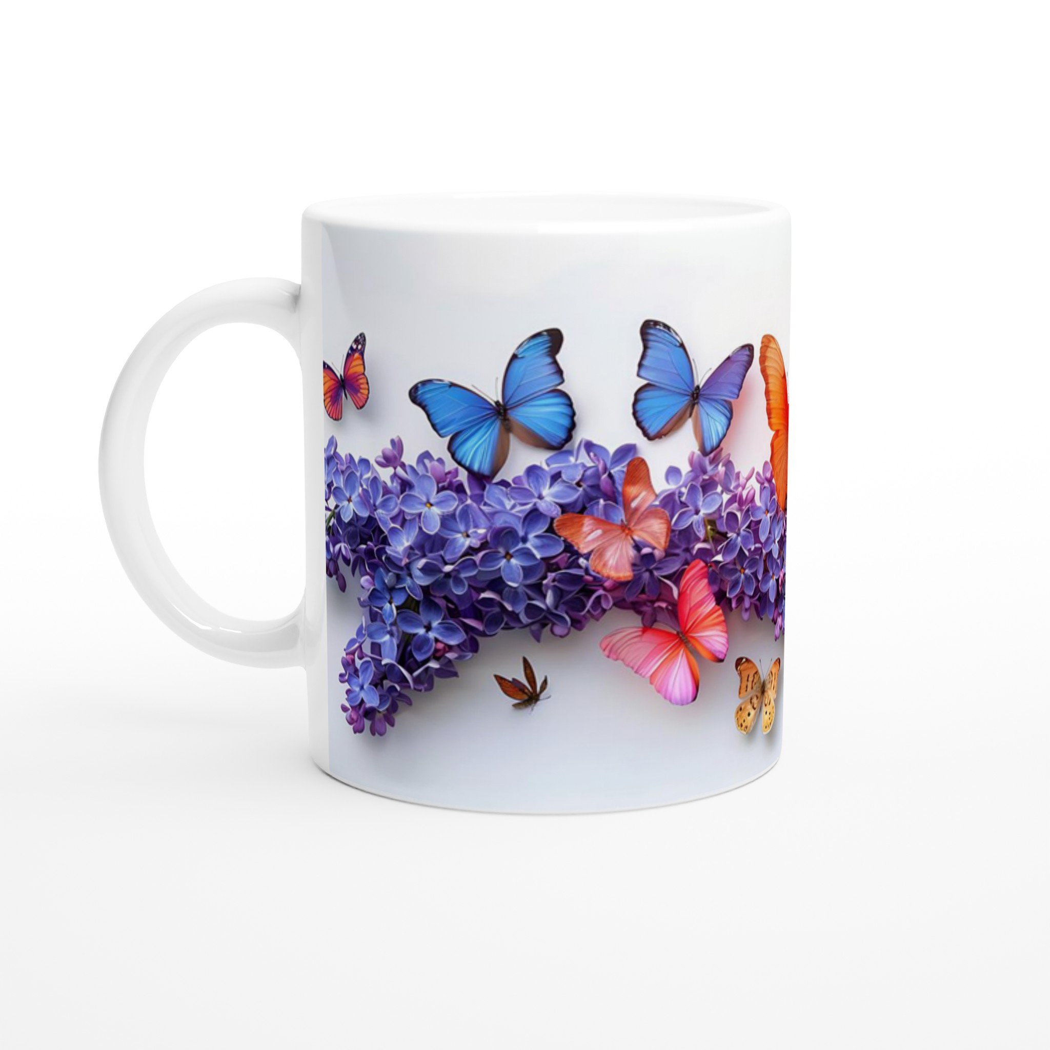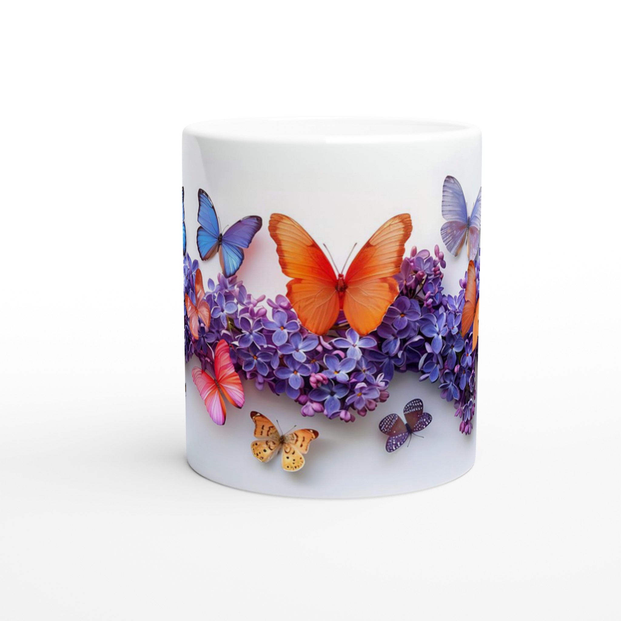 Väck dina sinnen till liv med denna underbara keramiska mugg, som fångar ögonblickets skönhet med sitt livfulla motiv av fjärilar och syrenblommor. Det är den perfekta dagliga följeslagaren för ditt morgonkaffe, en lugnande kvällschoklad, eller vilken dryck du än föredrar. Den blanka vita ytan ger en perfekt bakgrund där de klara, levande färgerna verkligen får lysa, och behåller sin lyster även efter otaliga rundor i mikron och diskmaskinen.
