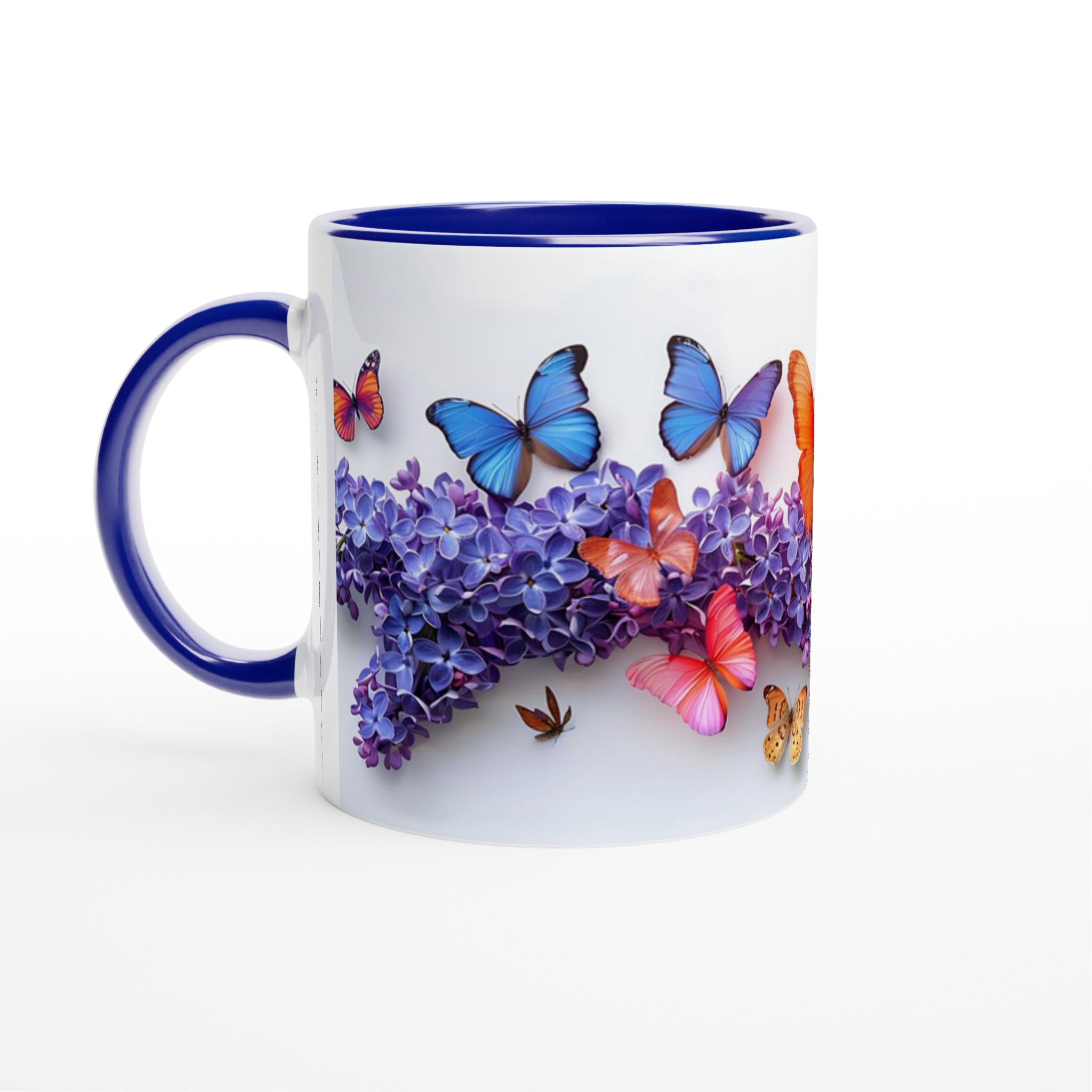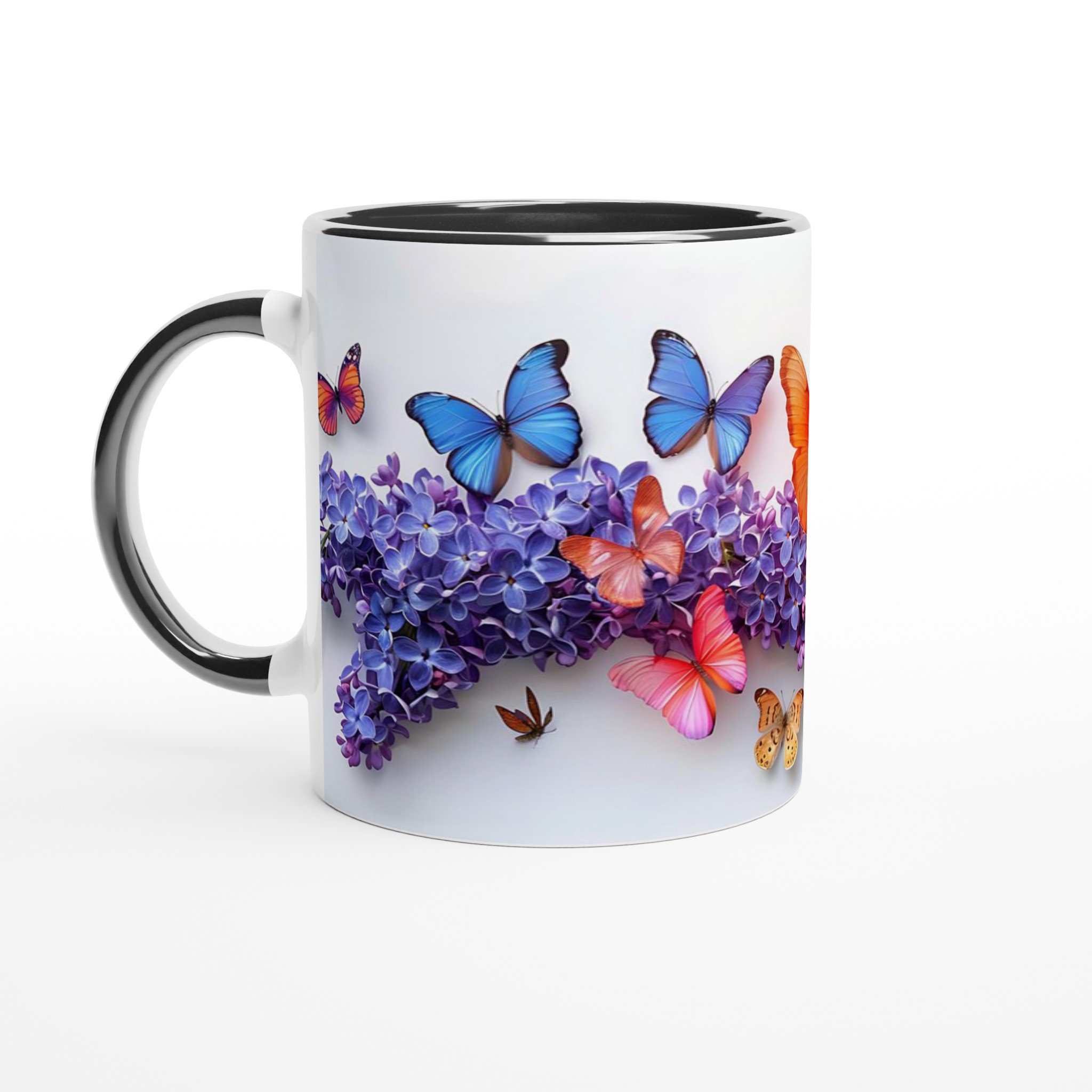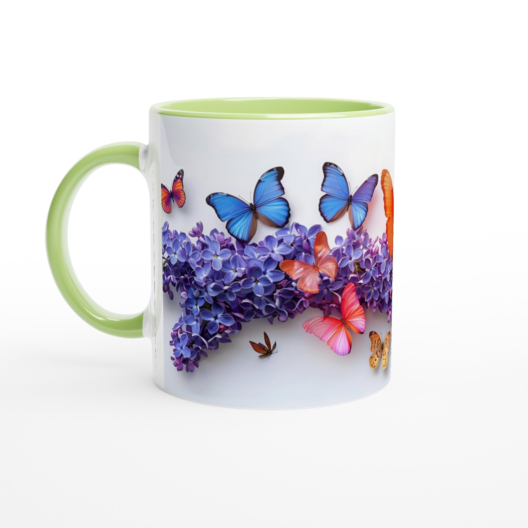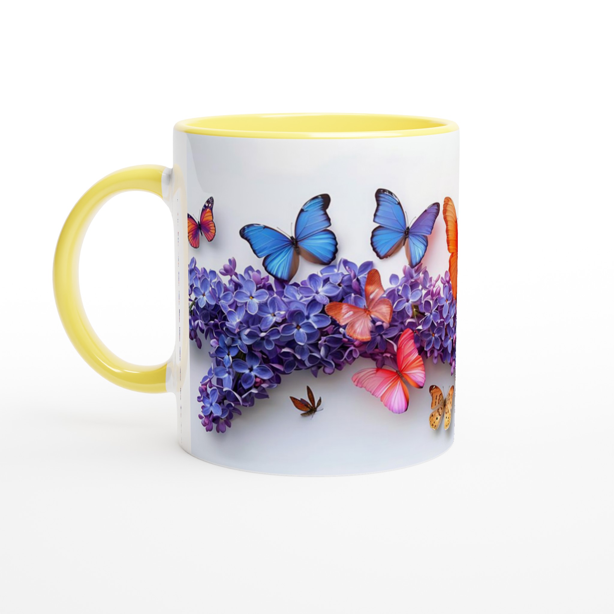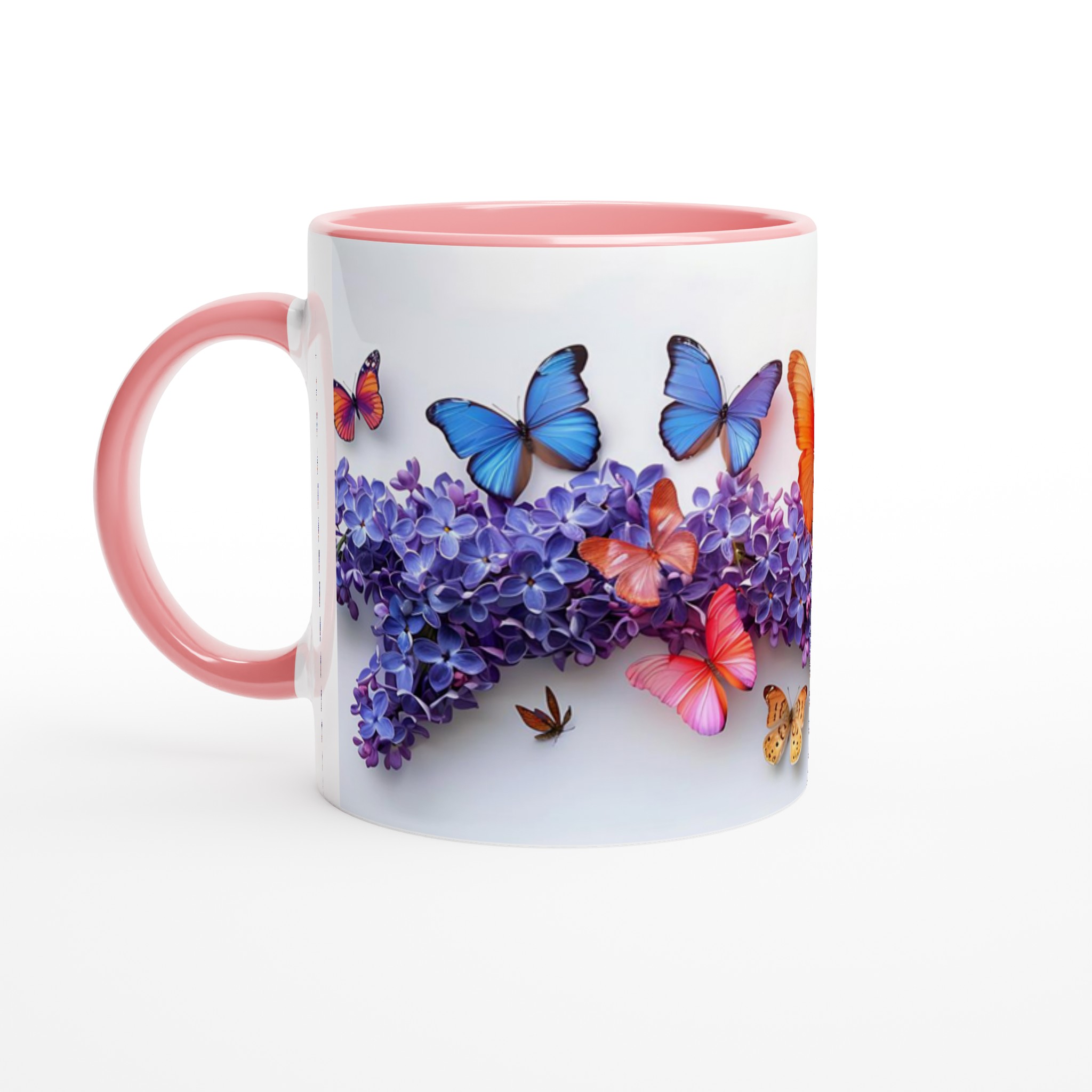 Väck dina sinnen till liv med denna underbara keramiska mugg, som fångar ögonblickets skönhet med sitt livfulla motiv av fjärilar och syrenblommor. Det är den perfekta dagliga följeslagaren för ditt morgonkaffe, en lugnande kvällschoklad, eller vilken dryck du än föredrar. Den blanka vita ytan ger en perfekt bakgrund där de klara, levande färgerna verkligen får lysa, och behåller sin lyster även efter otaliga rundor i mikron och diskmaskinen.