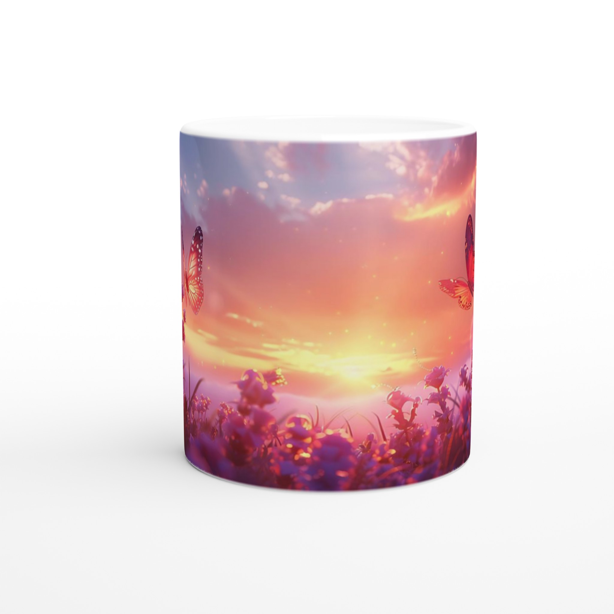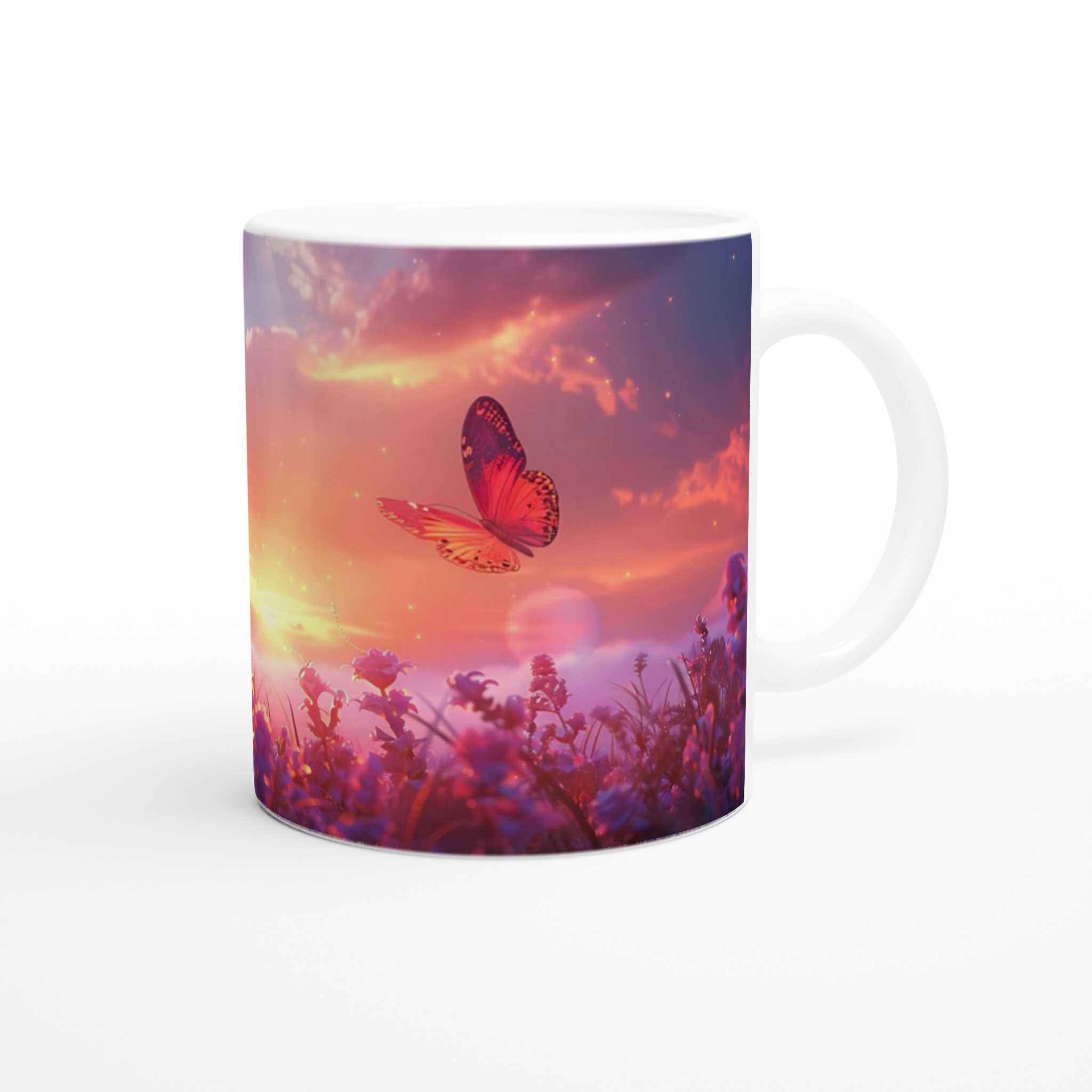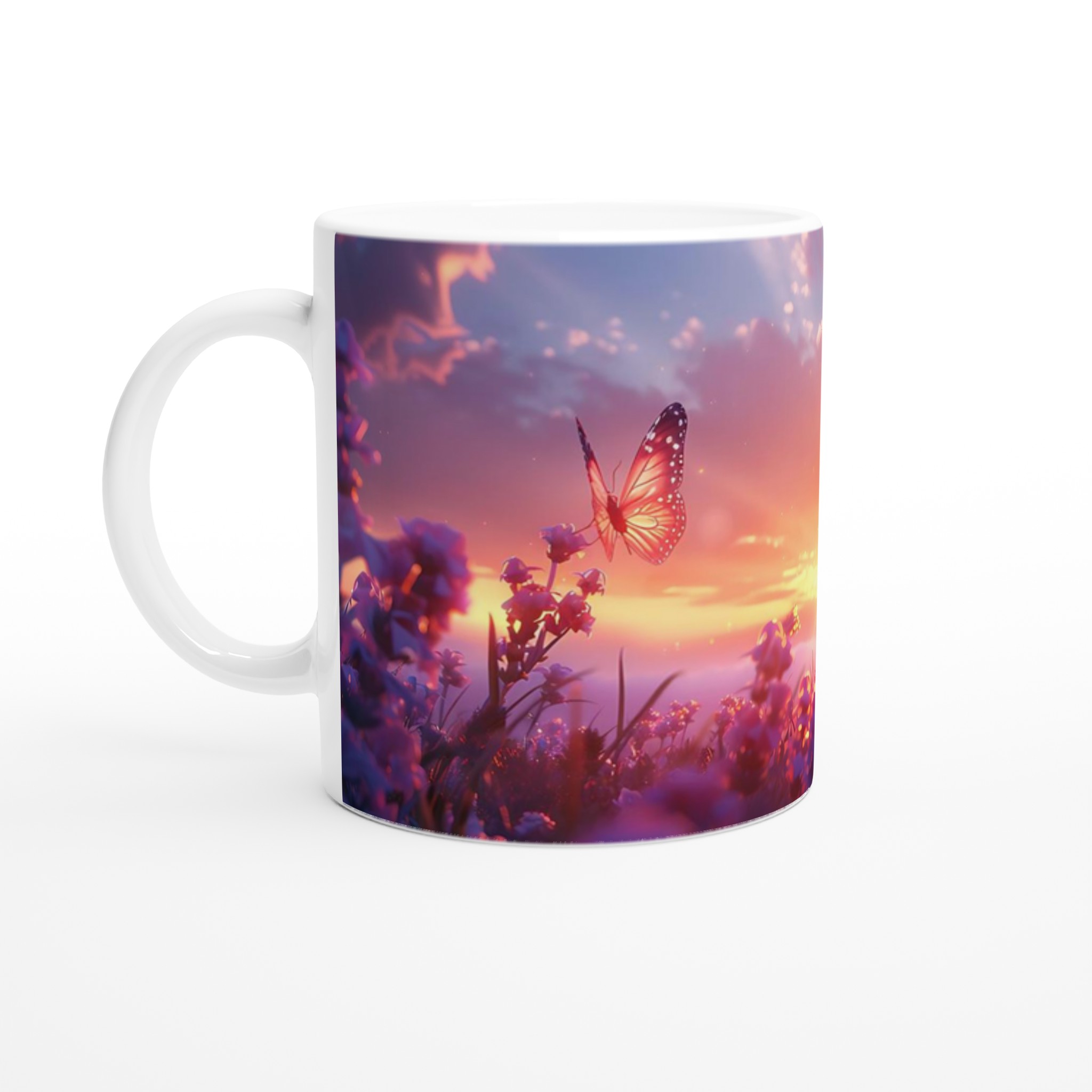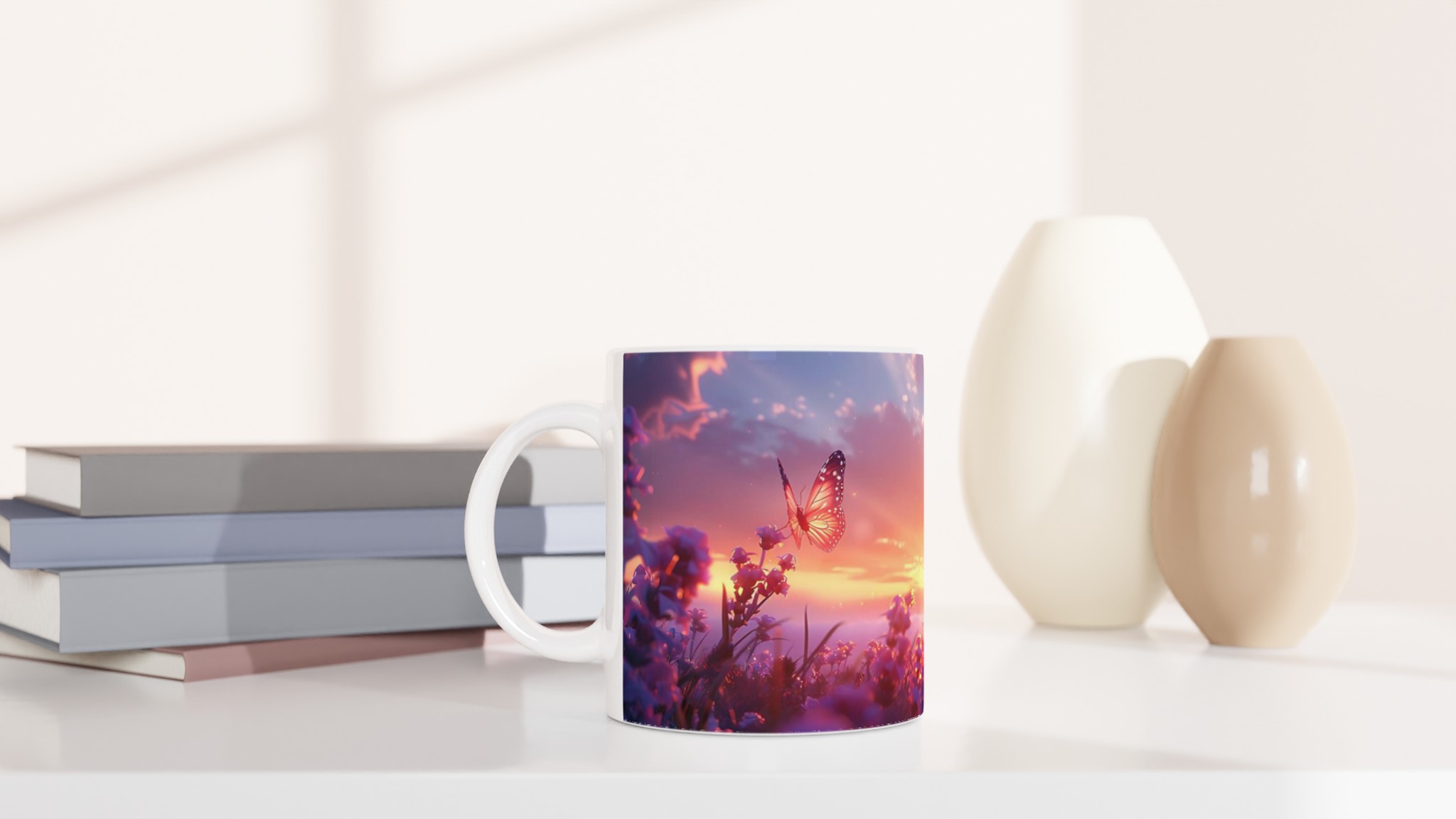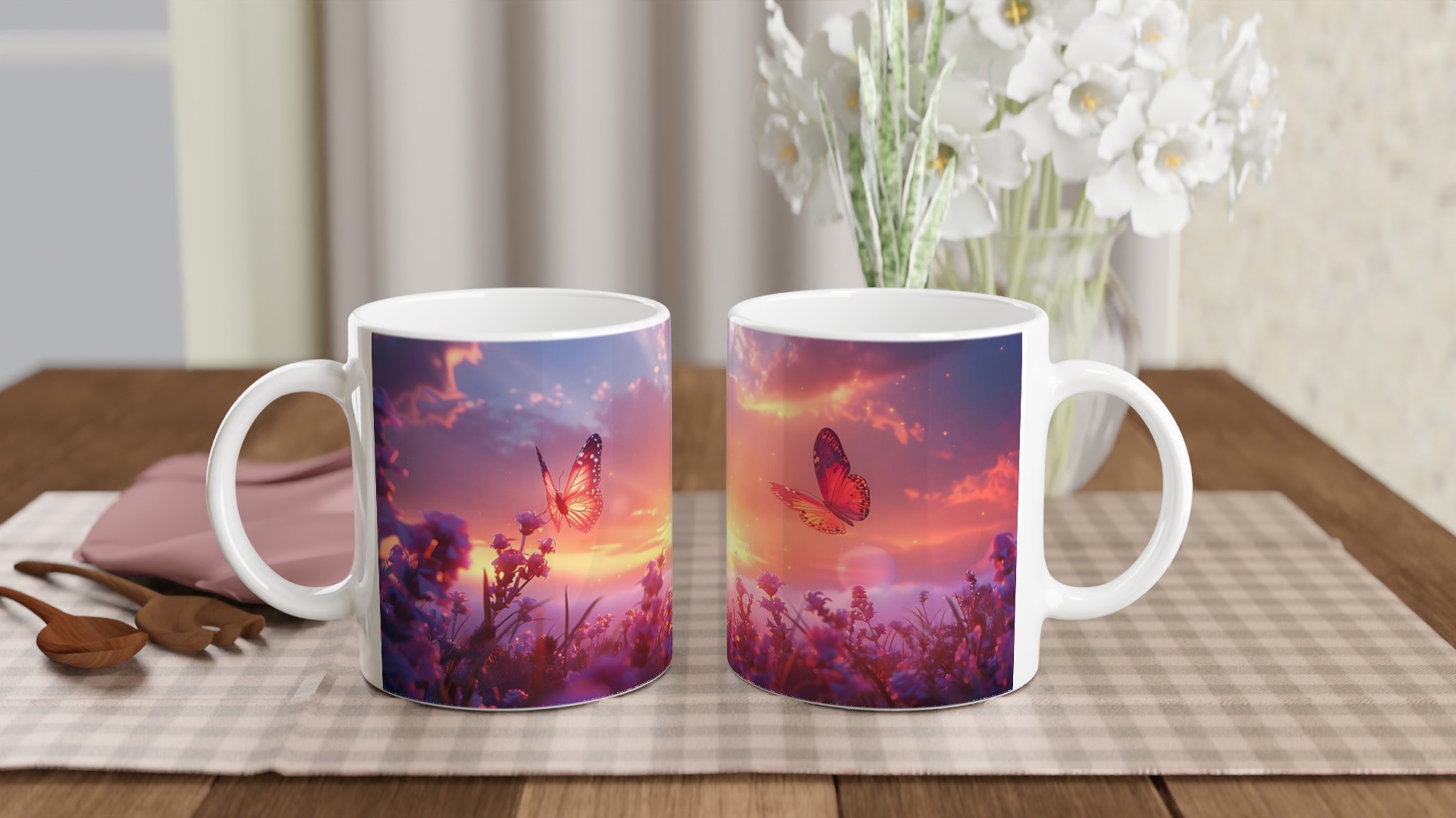 Fånga den magiska känslan av en solnedgång över ett blommande fält med ljuvliga fjärilar, direkt i din hand. Denna förtrollande keramiska mugg blir snabbt en favorit, perfekt för att njuta av ditt morgonkaffe, kvällens varma choklad, eller när du bara vill drömma dig bort med en kopp te. Med sitt livfulla tryck av fjärilar som dansar i solnedgången, kompletteras designen perfekt av den blanka ytan, som framhäver färgerna med en otrolig klarhet och lyster, bevarad även efter otaliga turer i mikron och diskmaskinen.