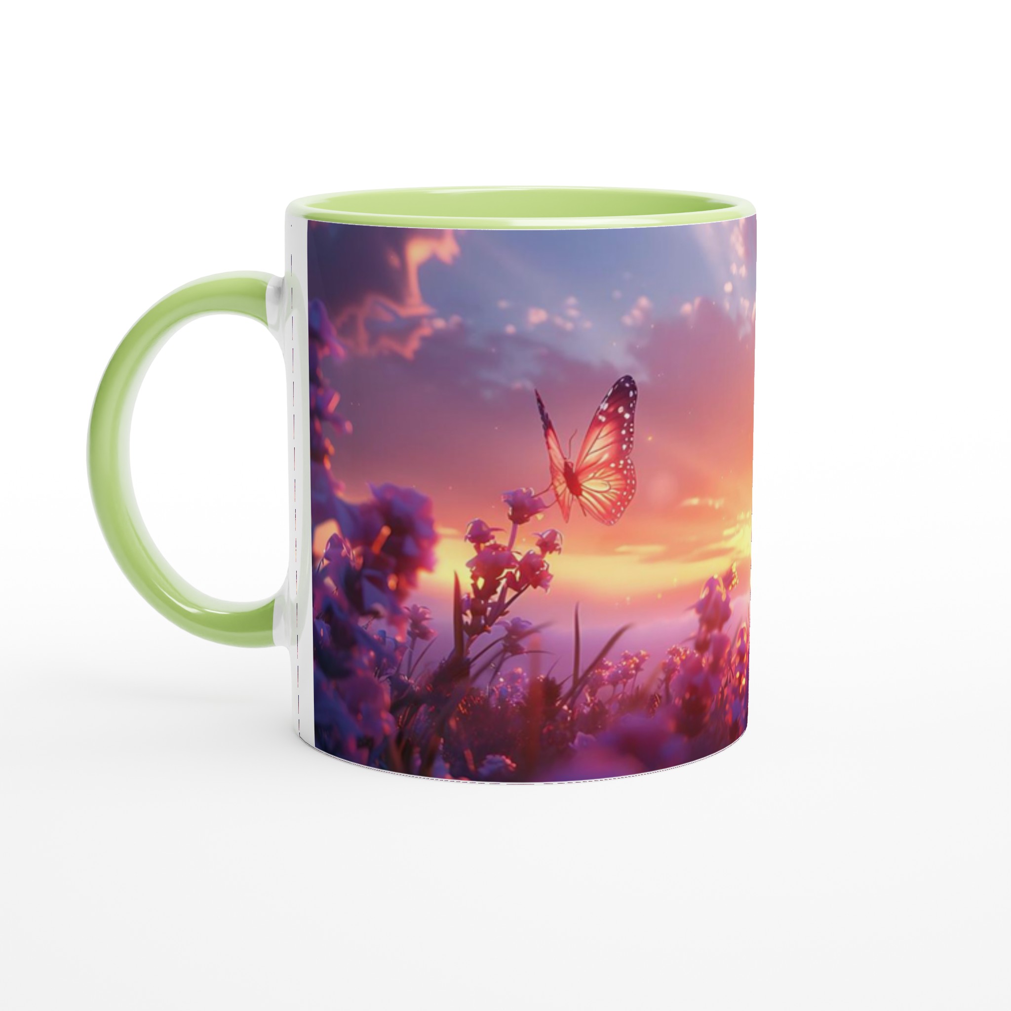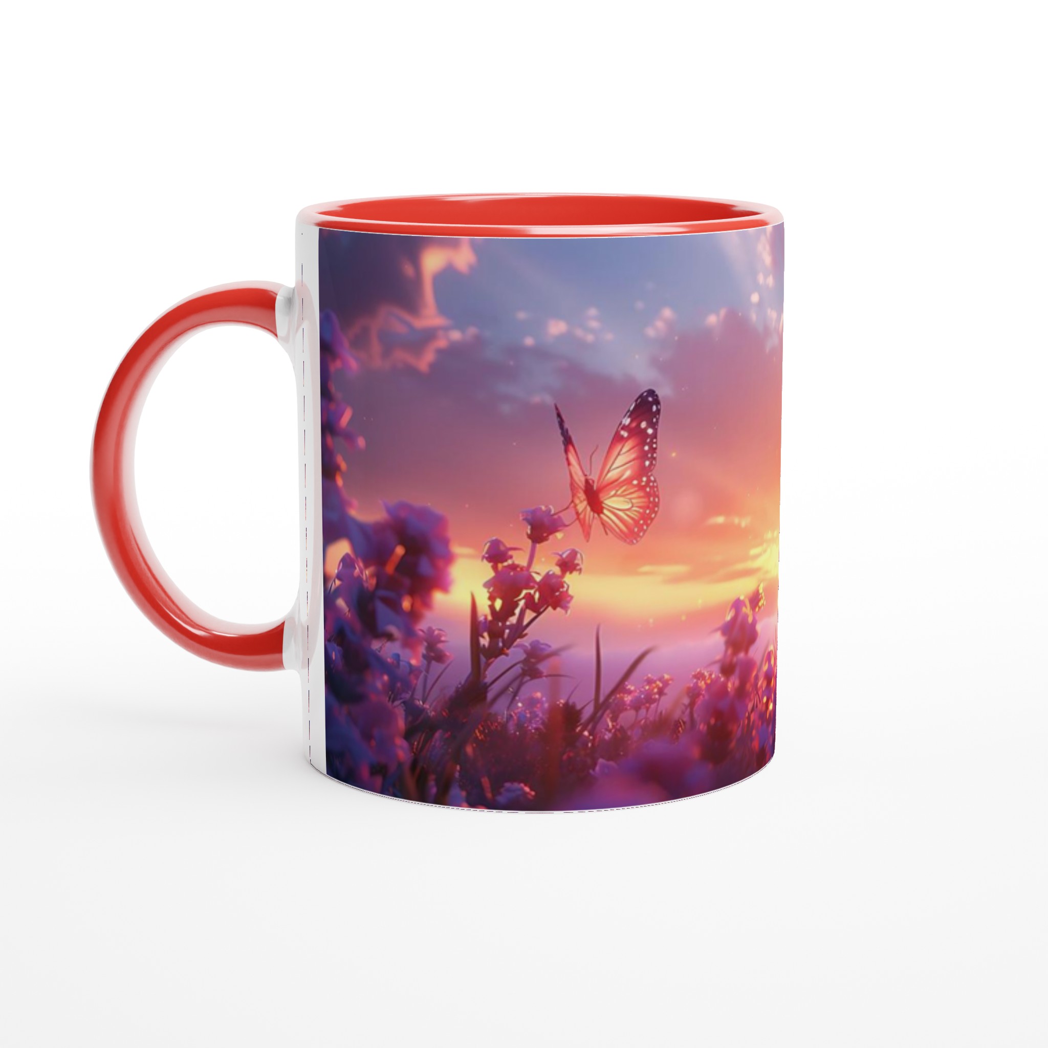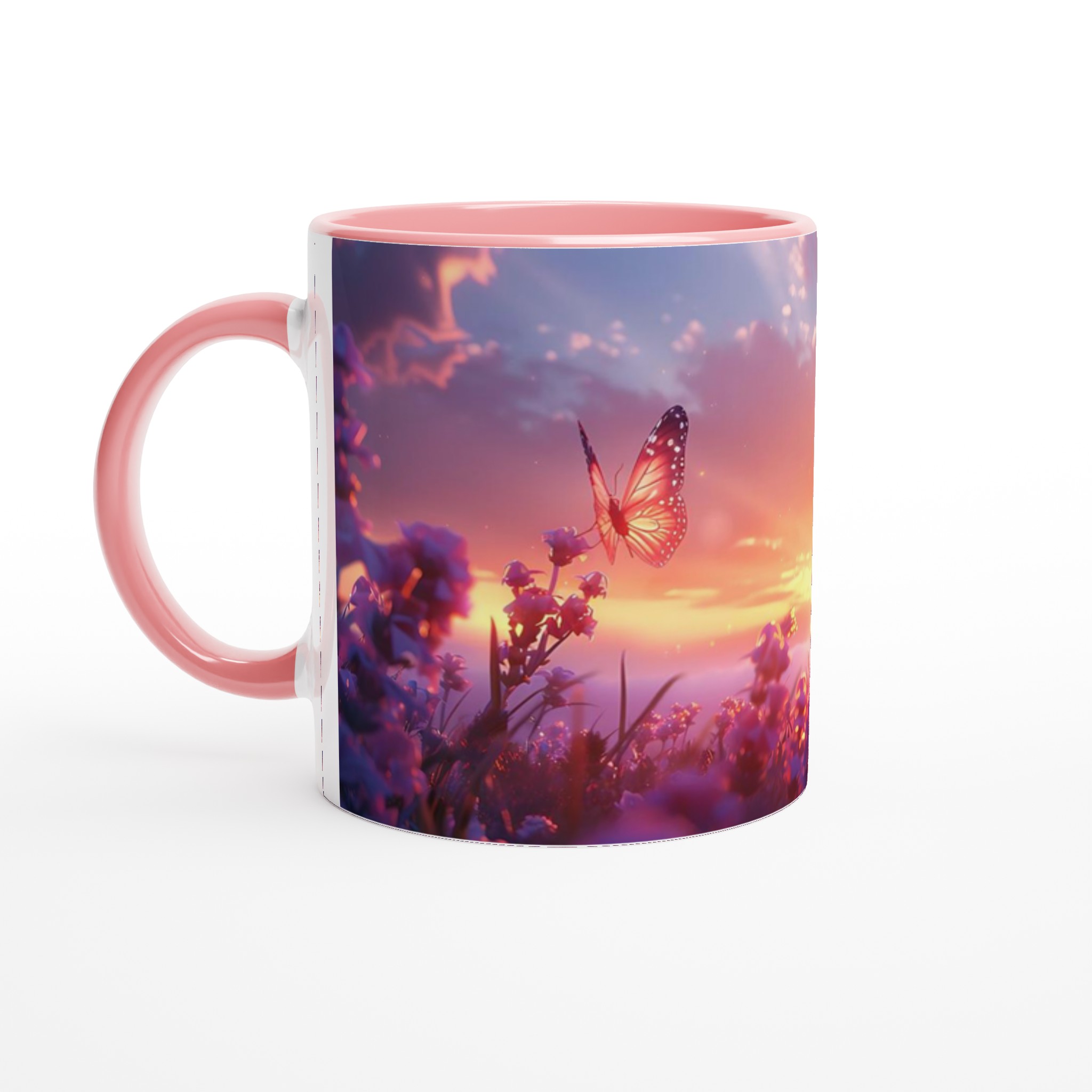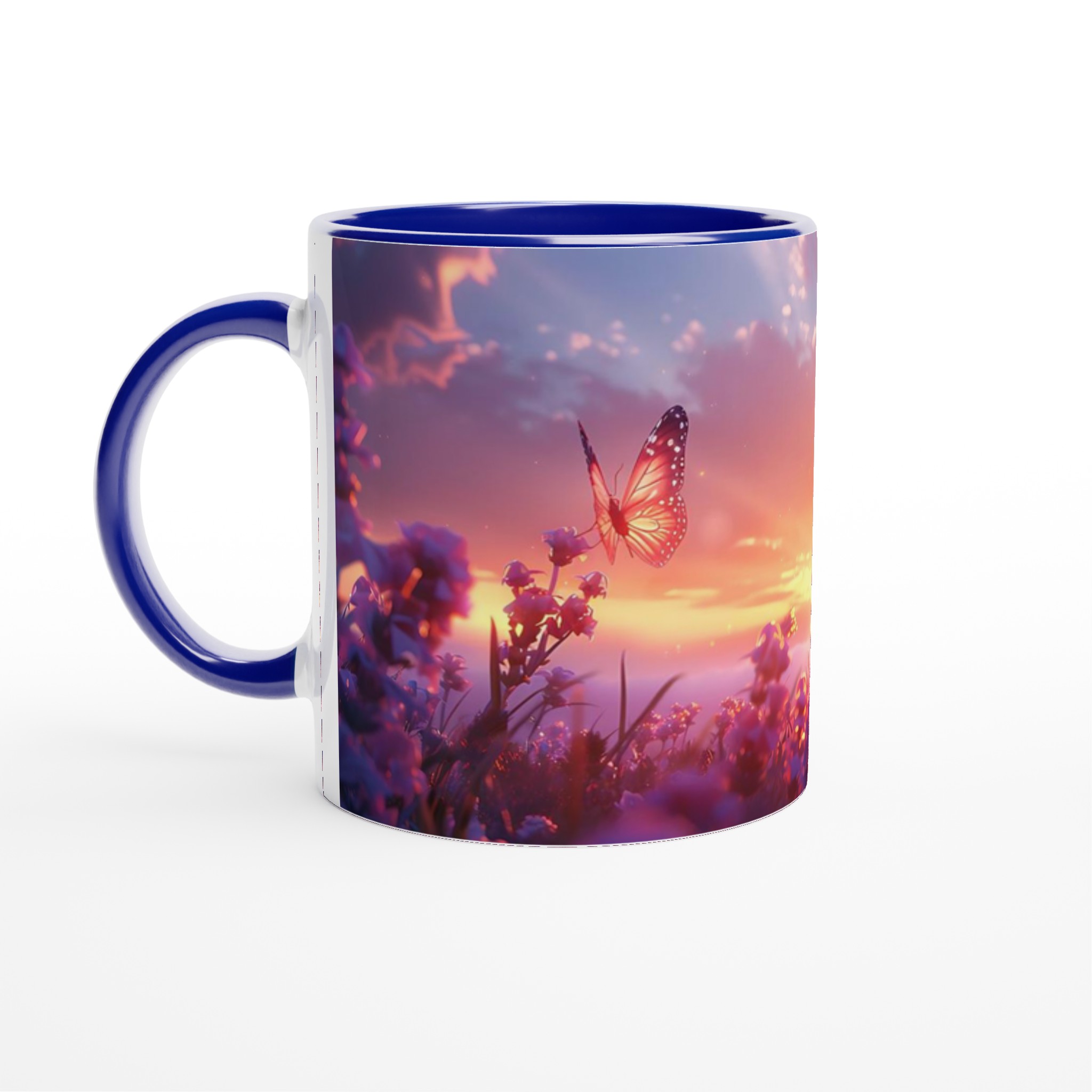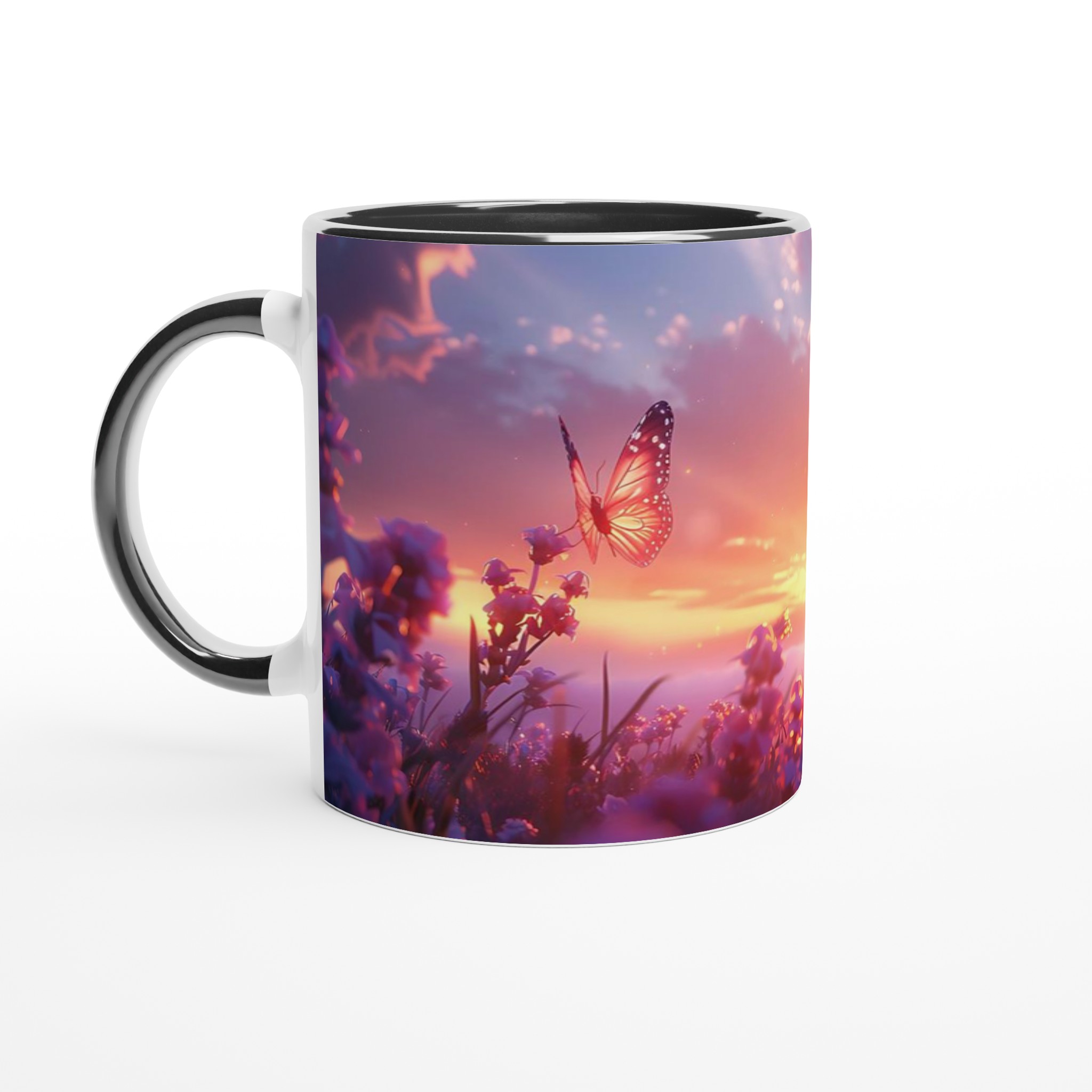 Fånga den magiska känslan av en solnedgång över ett blommande fält med ljuvliga fjärilar, direkt i din hand. Denna förtrollande keramiska mugg blir snabbt en favorit, perfekt för att njuta av ditt morgonkaffe, kvällens varma choklad, eller när du bara vill drömma dig bort med en kopp te. Med sitt livfulla tryck av fjärilar som dansar i solnedgången, kompletteras designen perfekt av den blanka ytan, som framhäver färgerna med en otrolig klarhet och lyster, bevarad även efter otaliga turer i mikron och diskmaskinen.