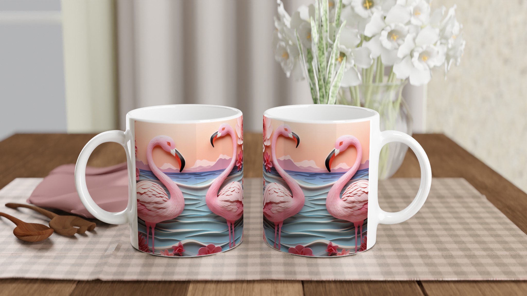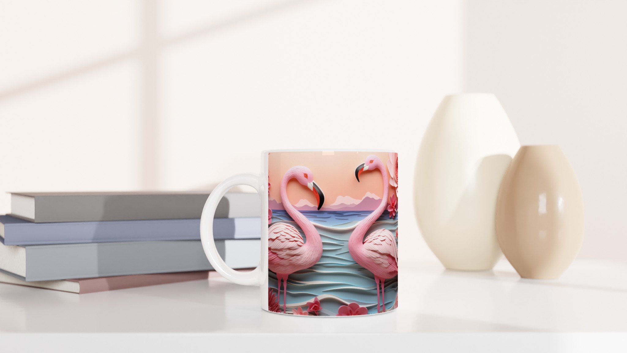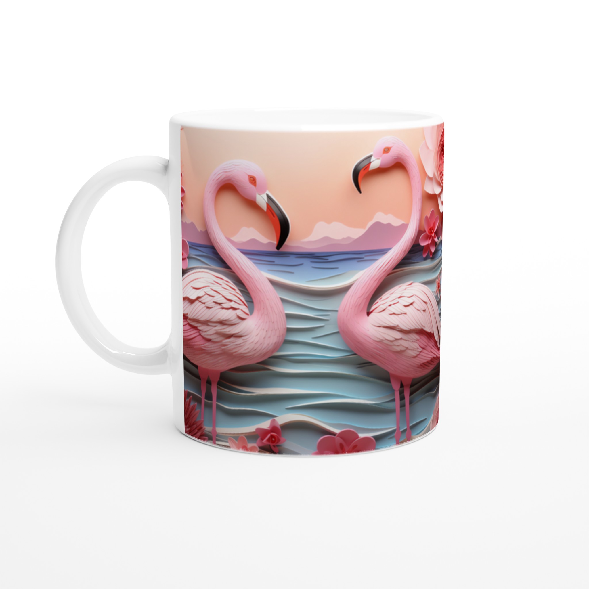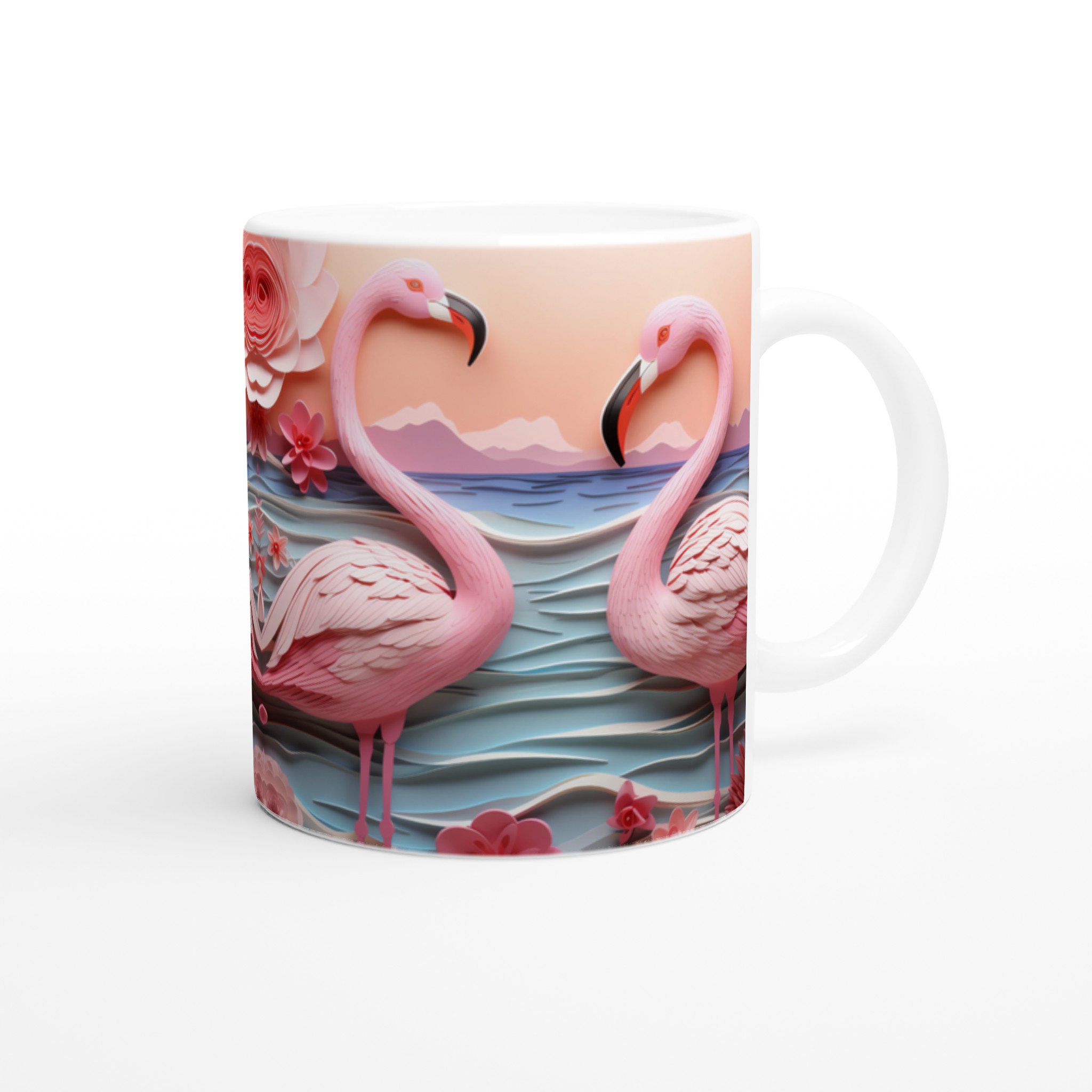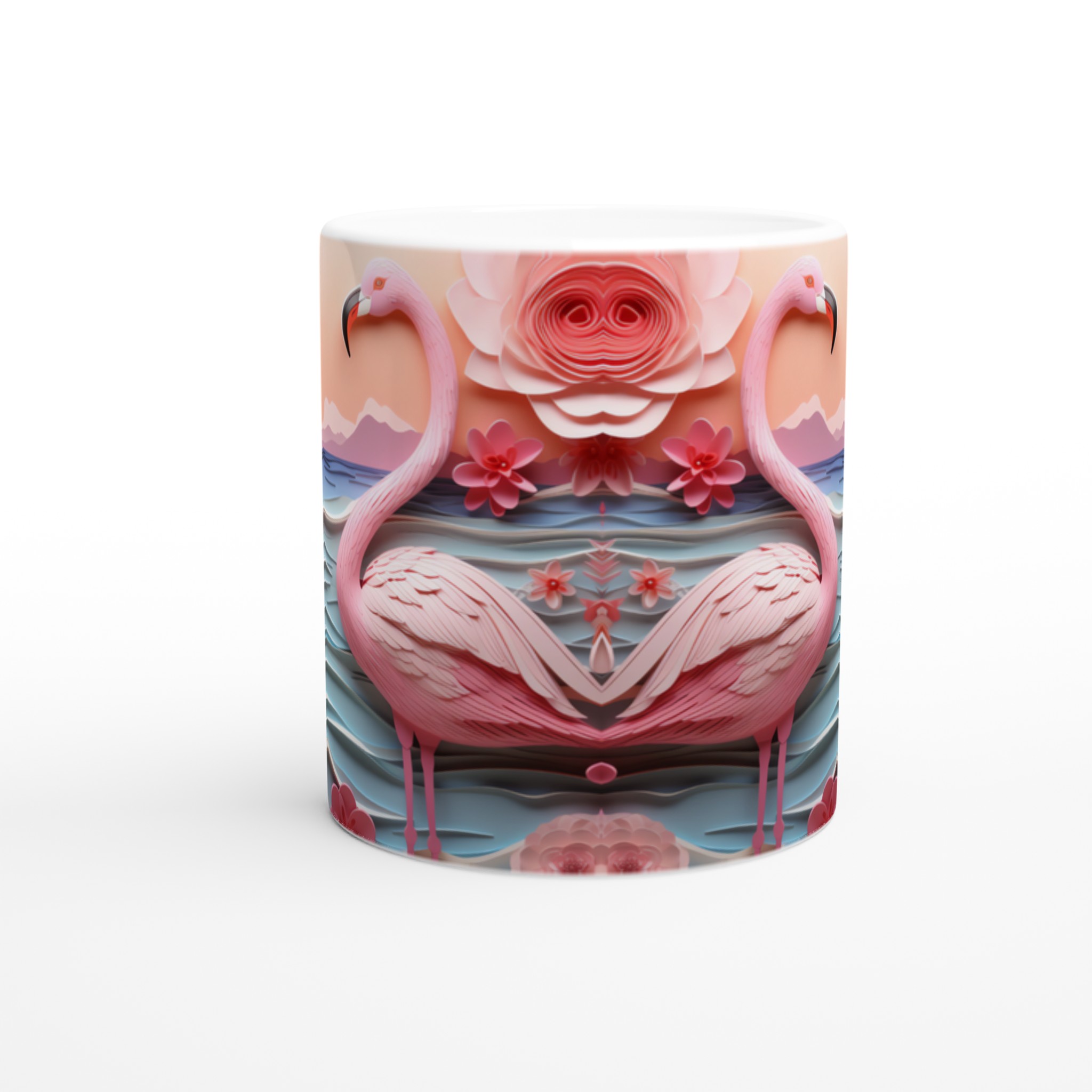 Fånga känslan av en lugn solnedgång över en exotisk sjö med vår Flamingo Paradise keramiska mugg. Denna stilrena mugg, prydd med en drömlik rosa flamingodesign och delikata pappersskärningsblommor, blir snabbt en vardagsfavorit. Perfekt för morgonkaffet, kvällens varma choklad eller när du bara vill njuta av en kopp te. Den blanka vita ytan gör att trycken framhävs med klara och levande färger, som håller sig fina även efter många turer i mikron och diskmaskinen.