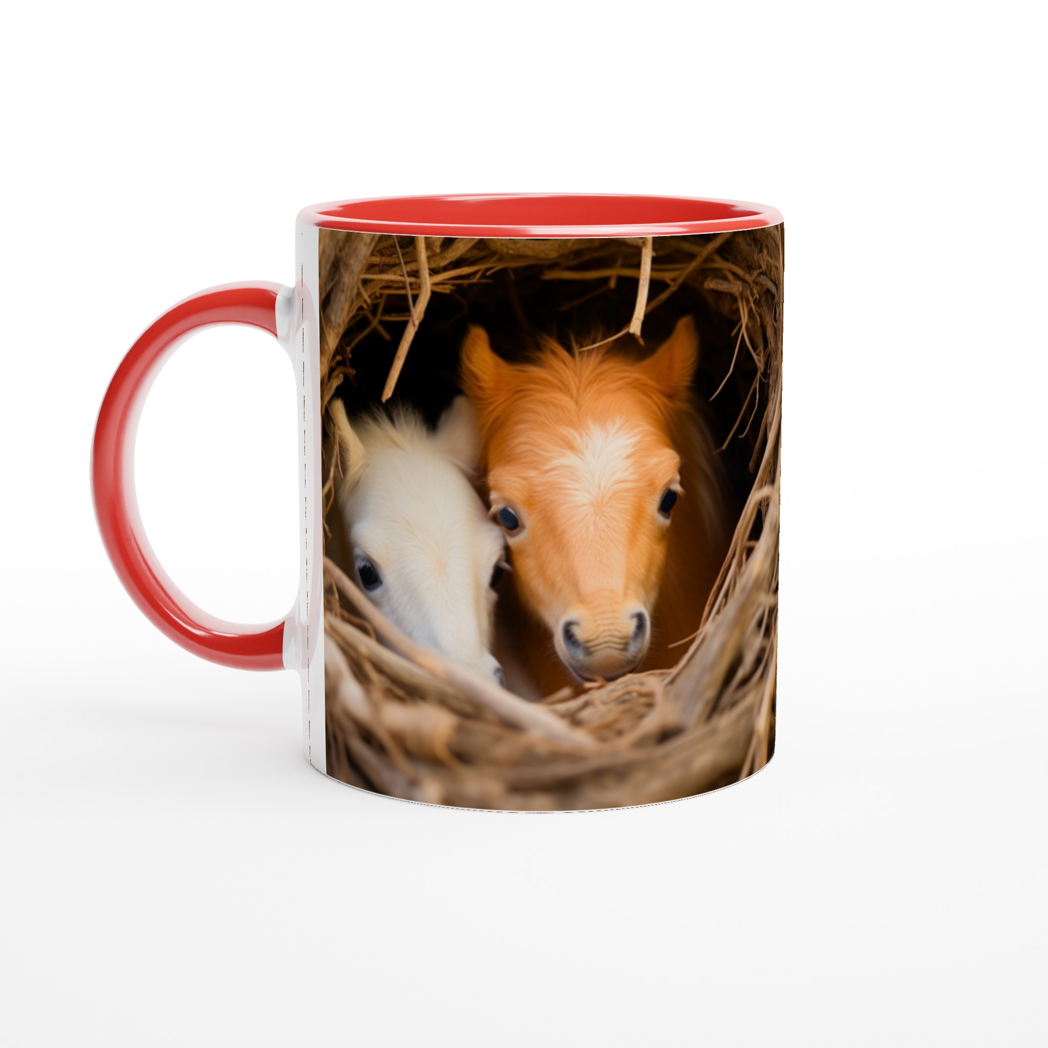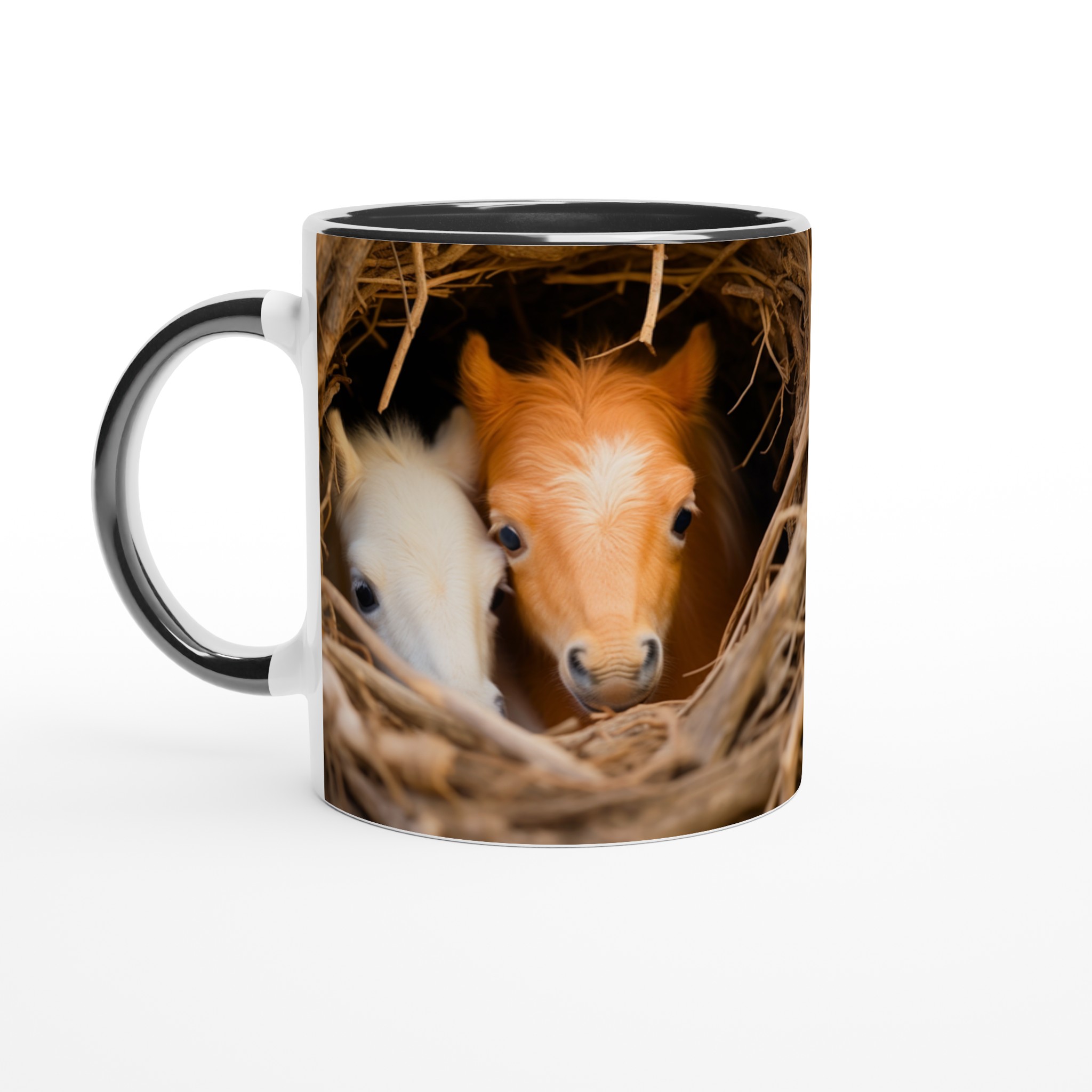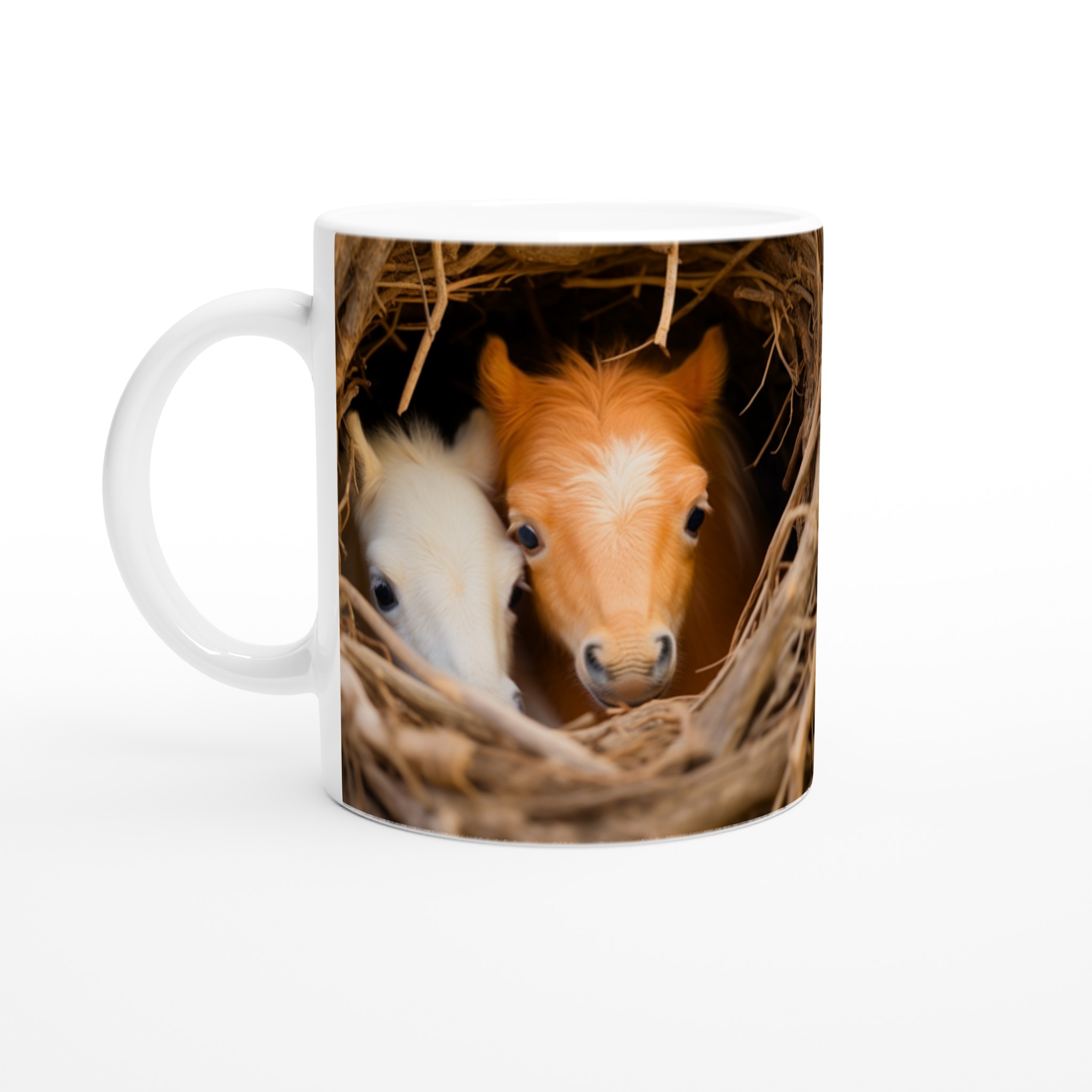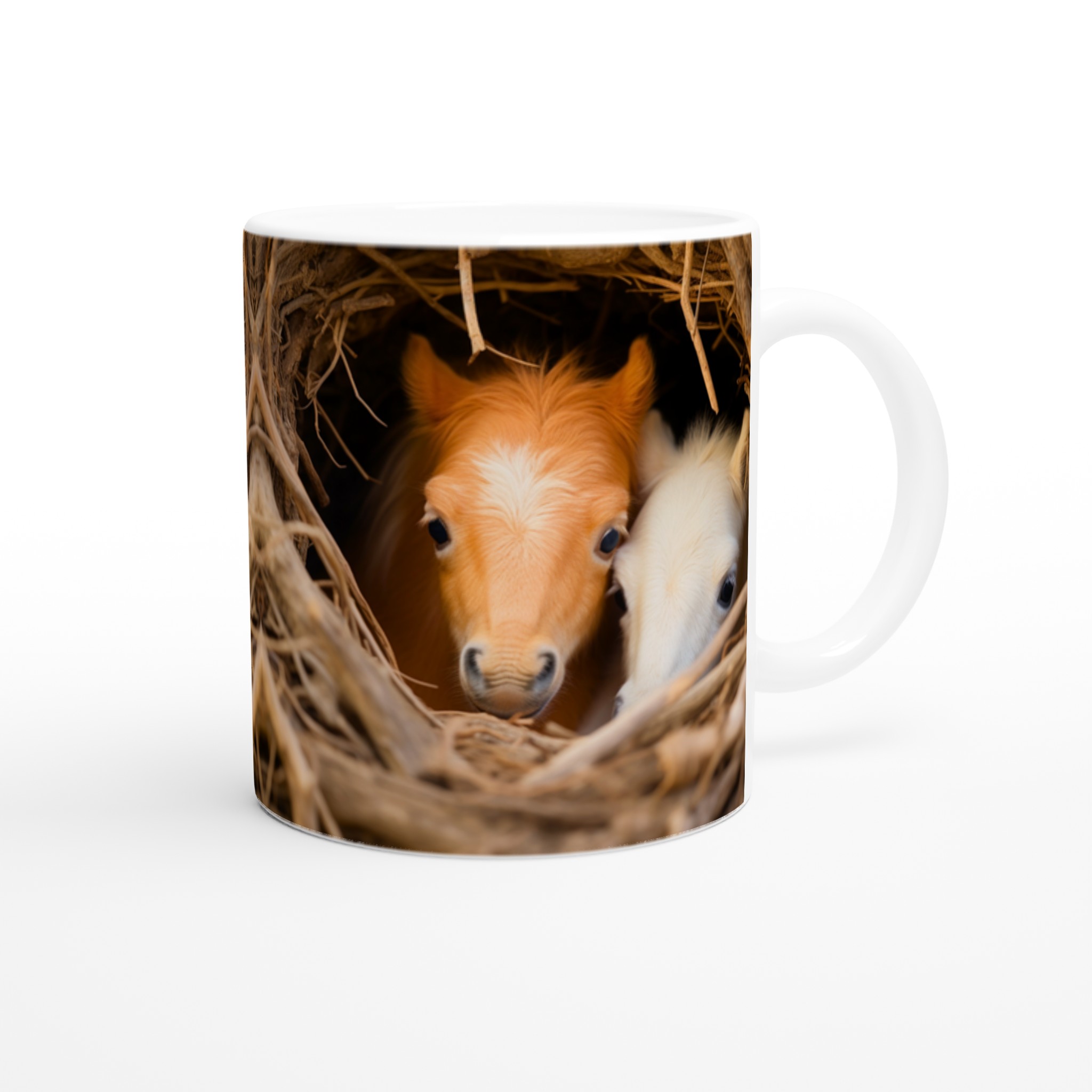 Föreställ dig att vakna upp till denna bedårande syn varje morgon! Denna charmiga keramiska mugg fångar ögonblicket av två söta föl som kikar fram ur sitt mysiga bo, en bild som garanterat värmer hjärtat. Denna stilrena mugg blir snabbt en vardagsfavorit, perfekt för morgonkaffet, kvällens varma choklad eller när du bara vill njuta av en kopp te.