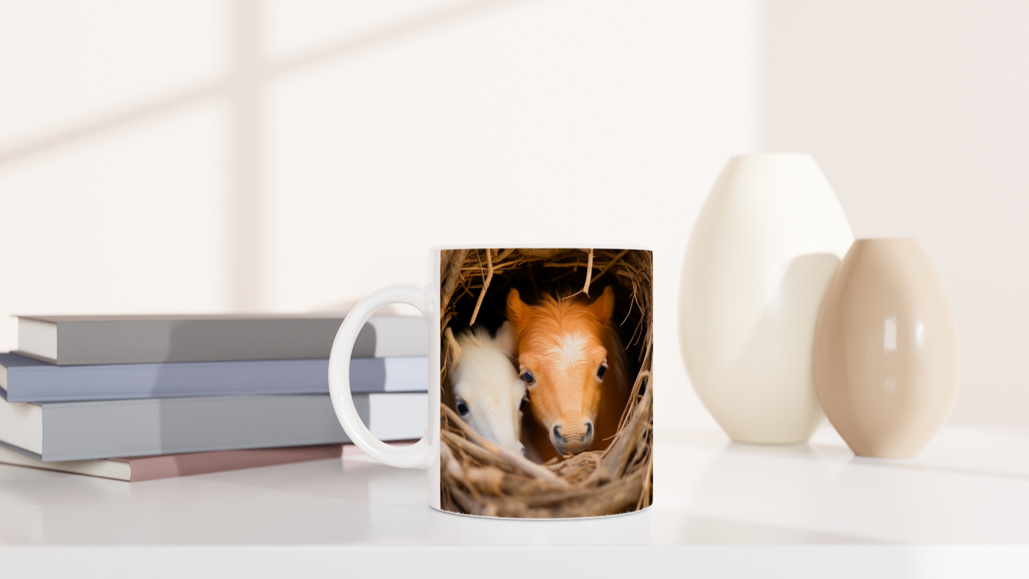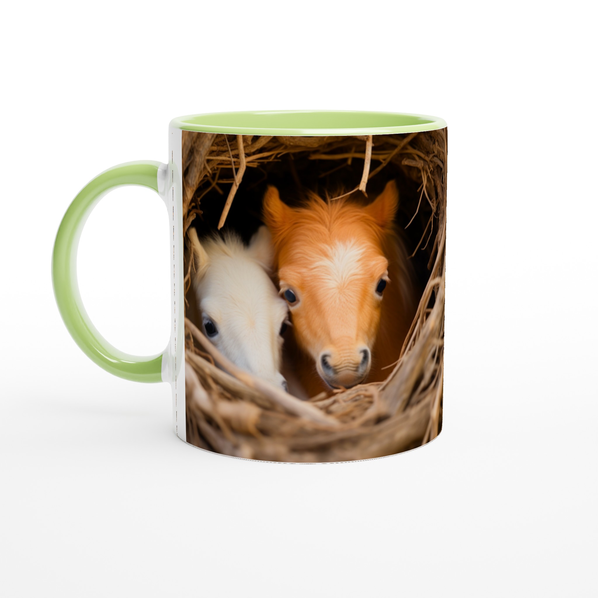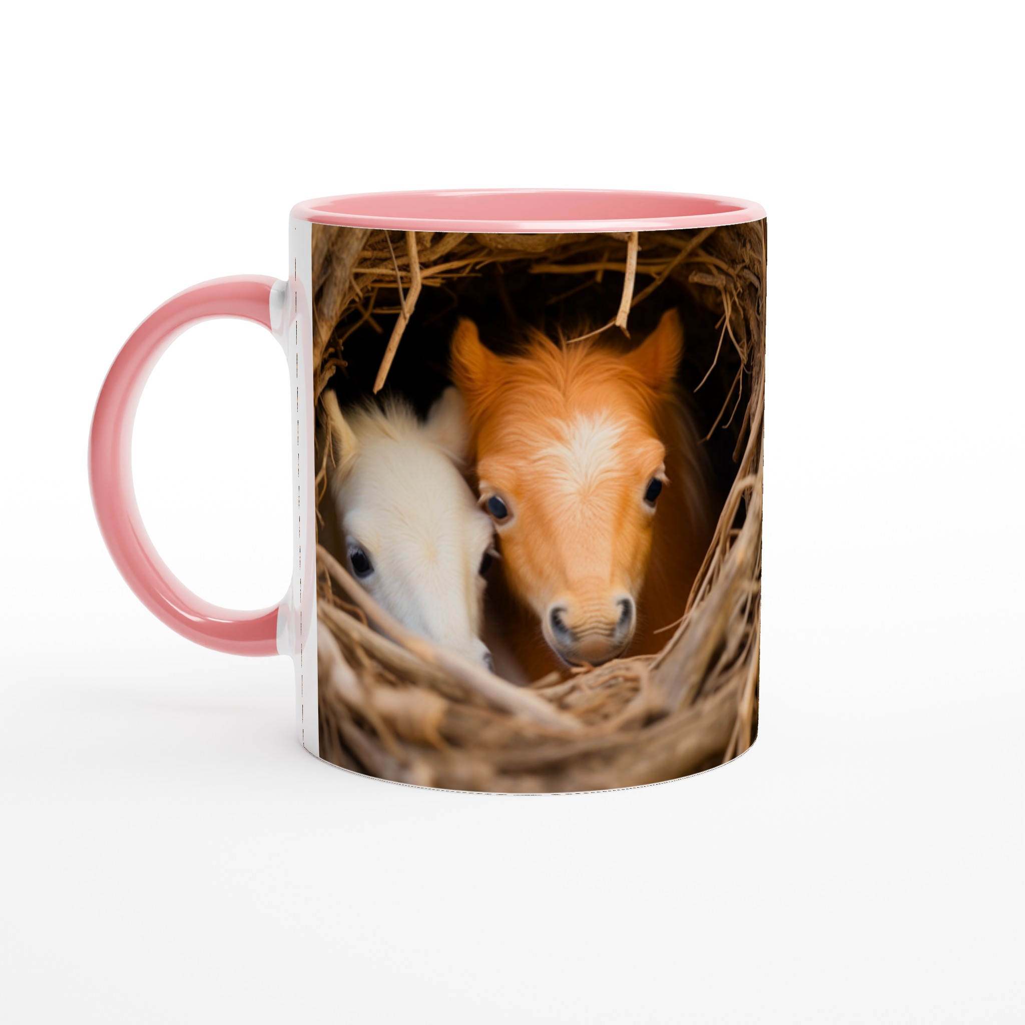 Föreställ dig att vakna upp till denna bedårande syn varje morgon! Denna charmiga keramiska mugg fångar ögonblicket av två söta föl som kikar fram ur sitt mysiga bo, en bild som garanterat värmer hjärtat. Denna stilrena mugg blir snabbt en vardagsfavorit, perfekt för morgonkaffet, kvällens varma choklad eller när du bara vill njuta av en kopp te.