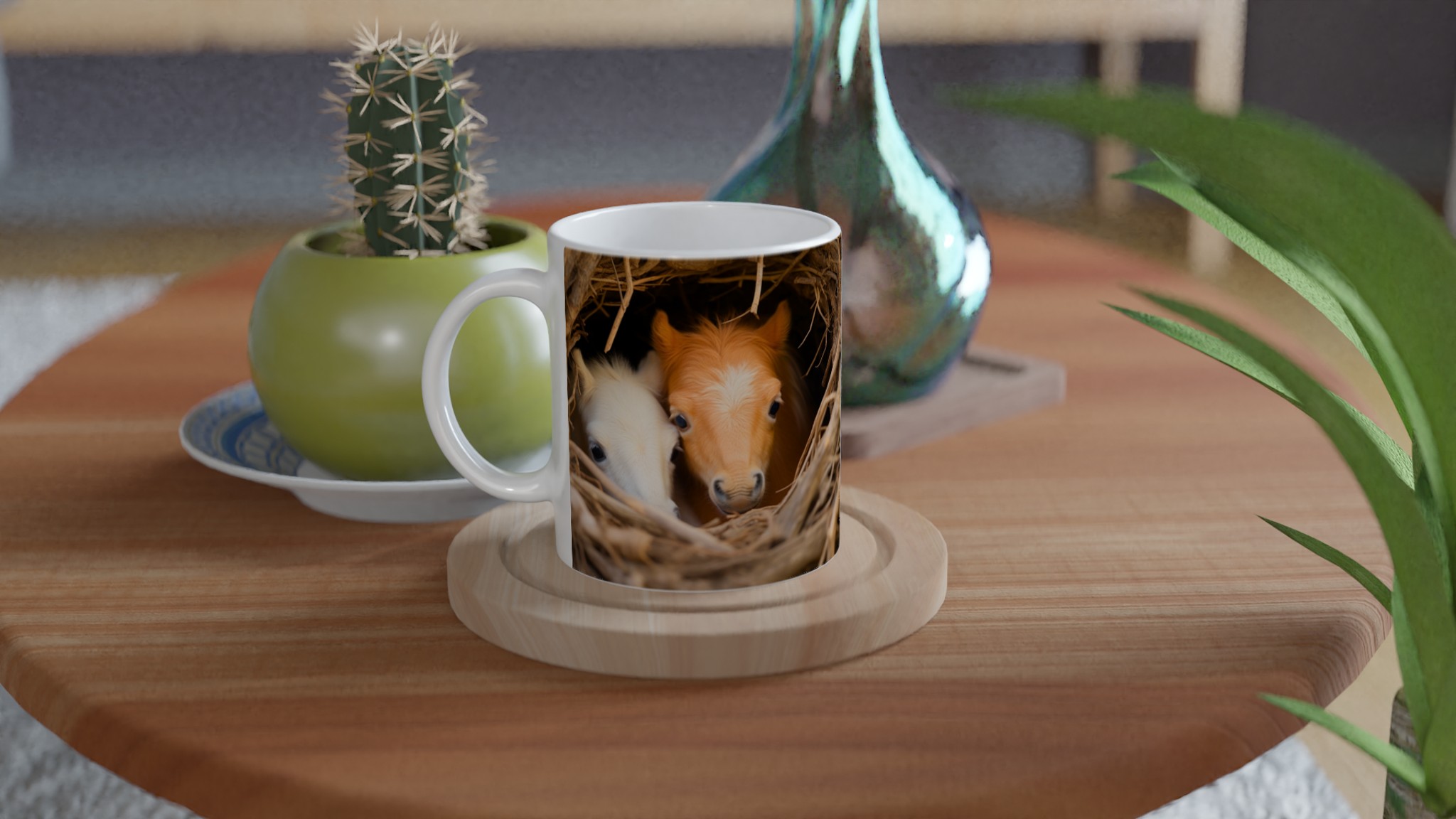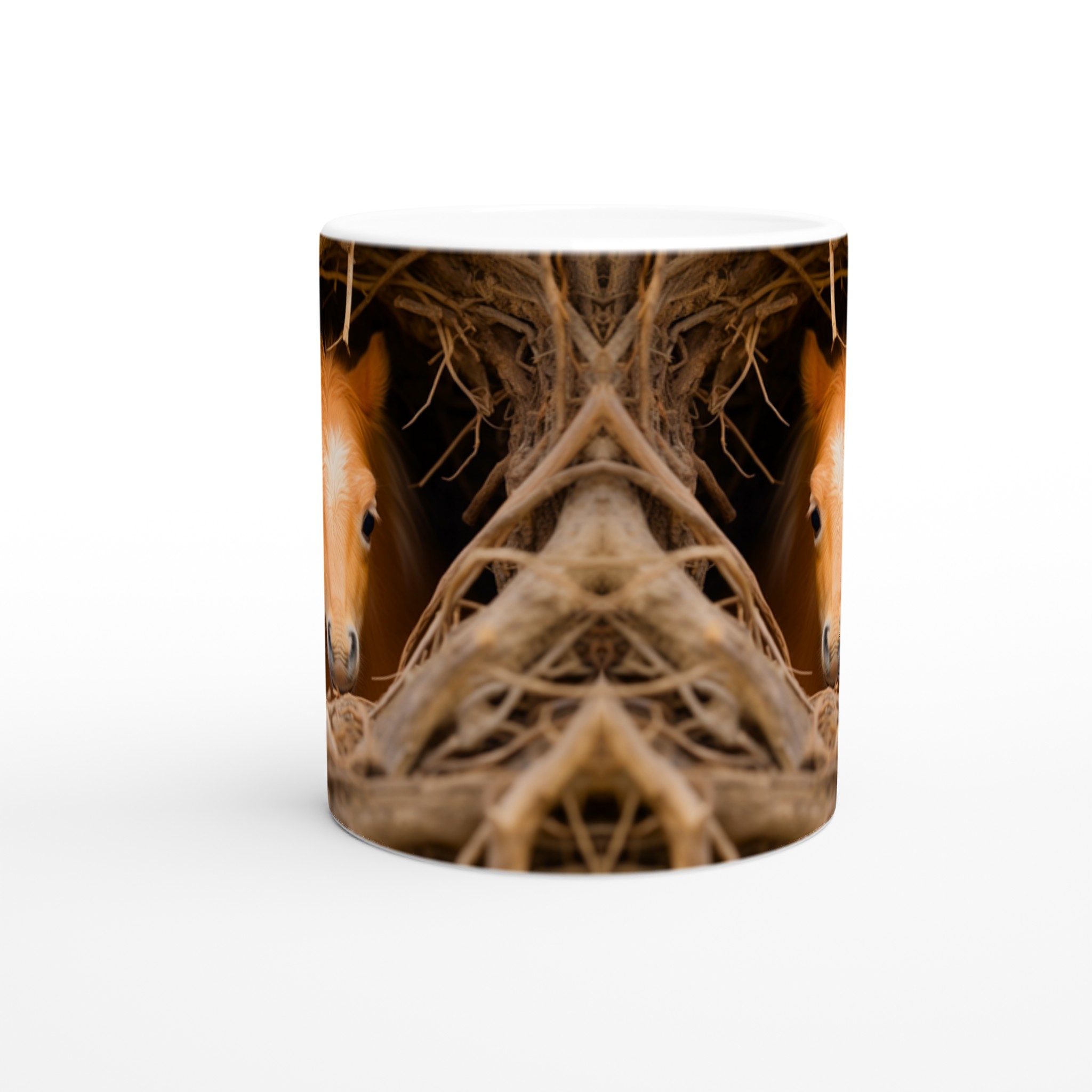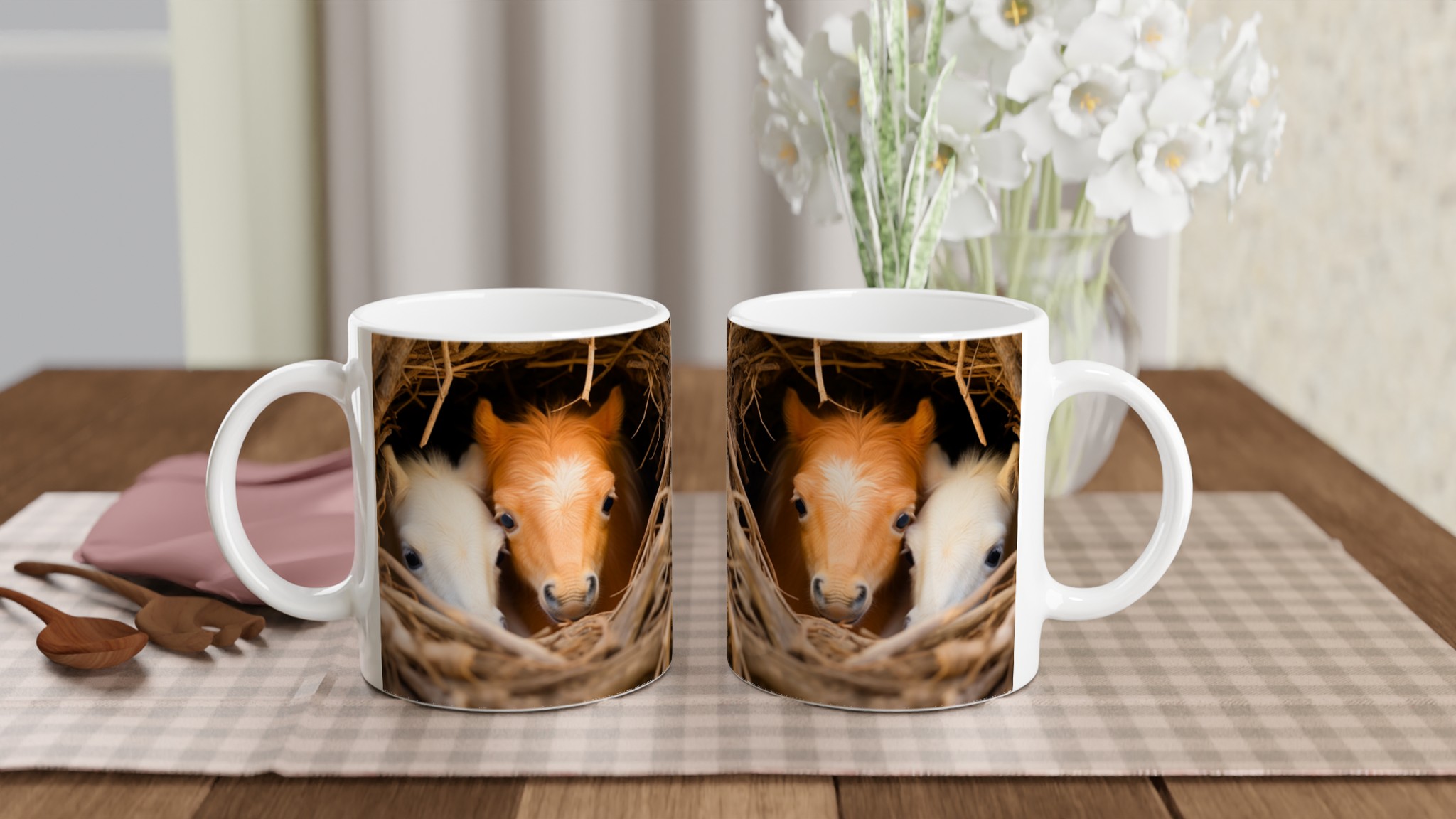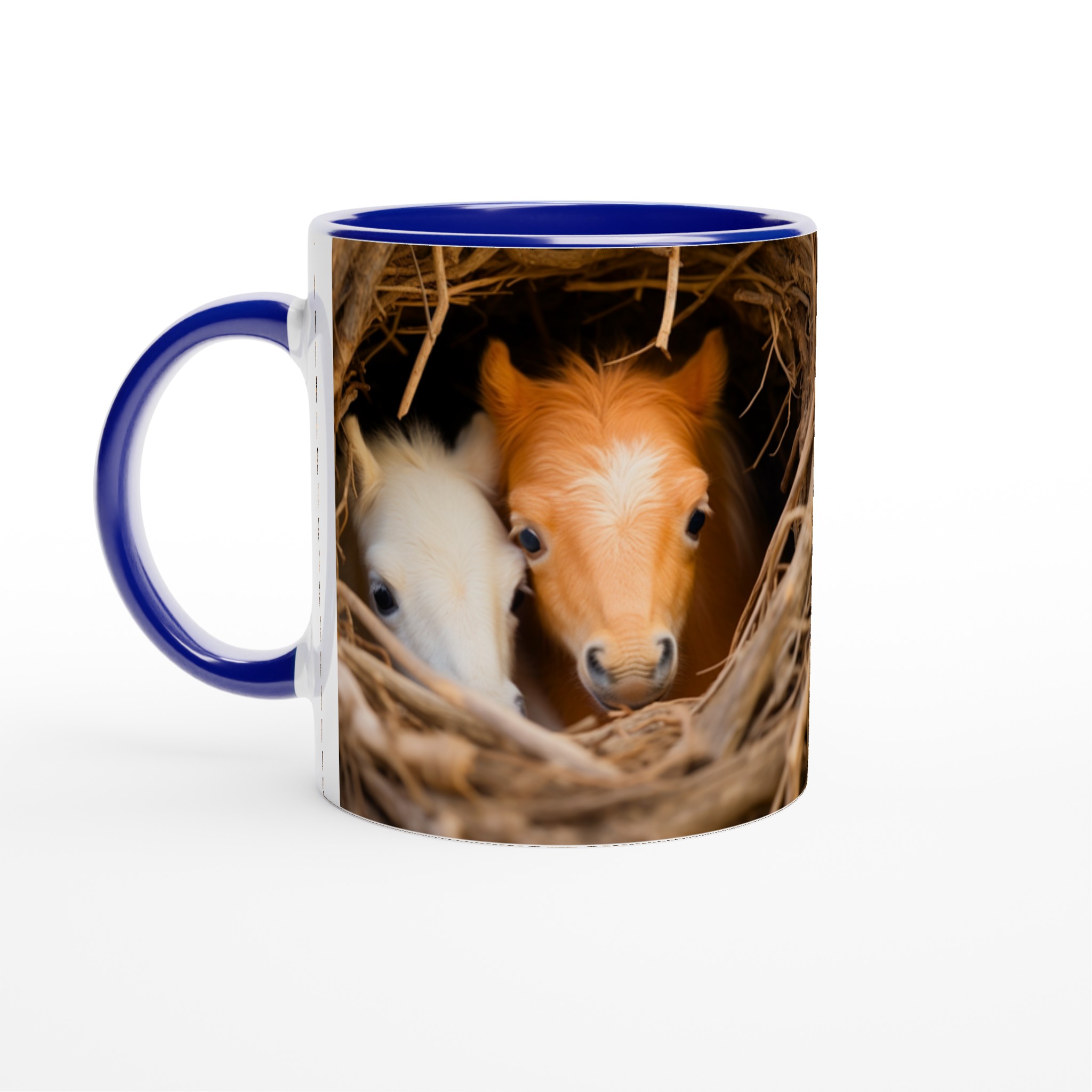 Föreställ dig att vakna upp till denna bedårande syn varje morgon! Denna charmiga keramiska mugg fångar ögonblicket av två söta föl som kikar fram ur sitt mysiga bo, en bild som garanterat värmer hjärtat. Denna stilrena mugg blir snabbt en vardagsfavorit, perfekt för morgonkaffet, kvällens varma choklad eller när du bara vill njuta av en kopp te.