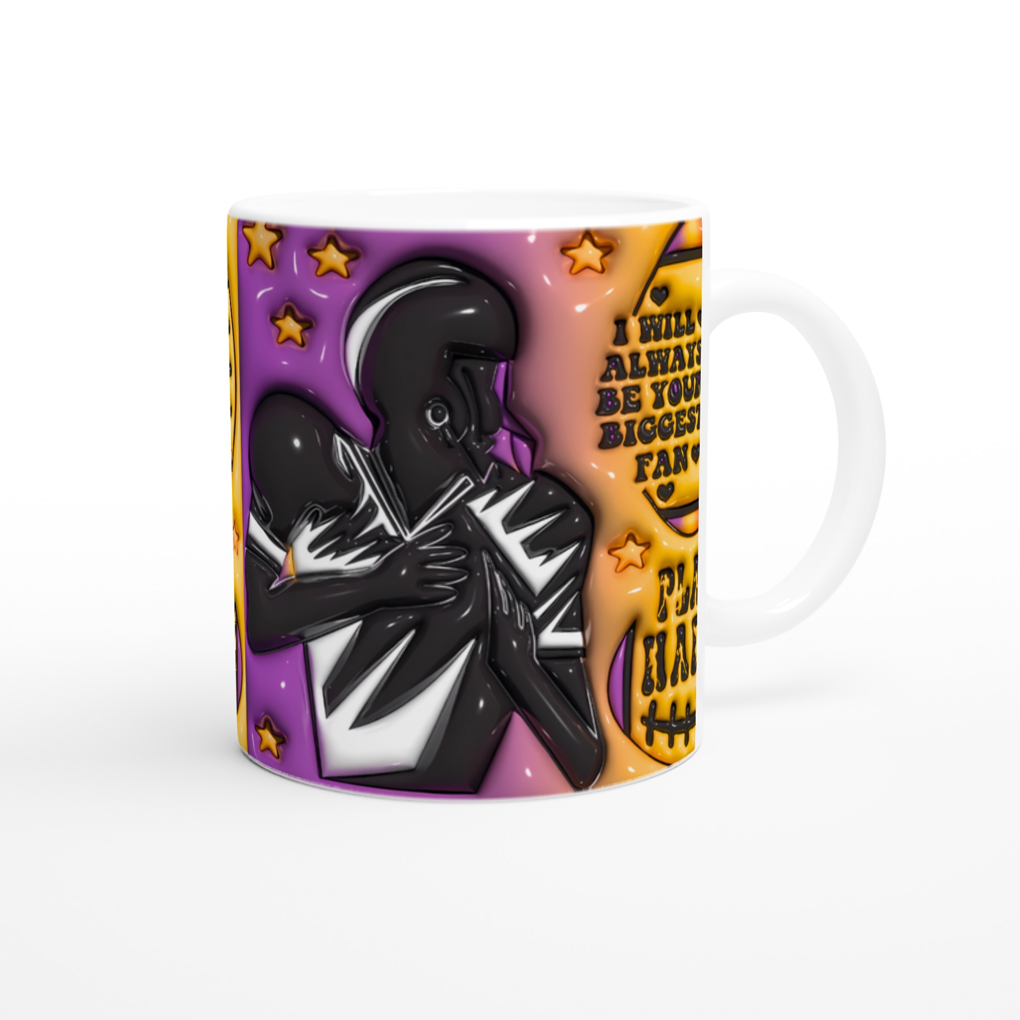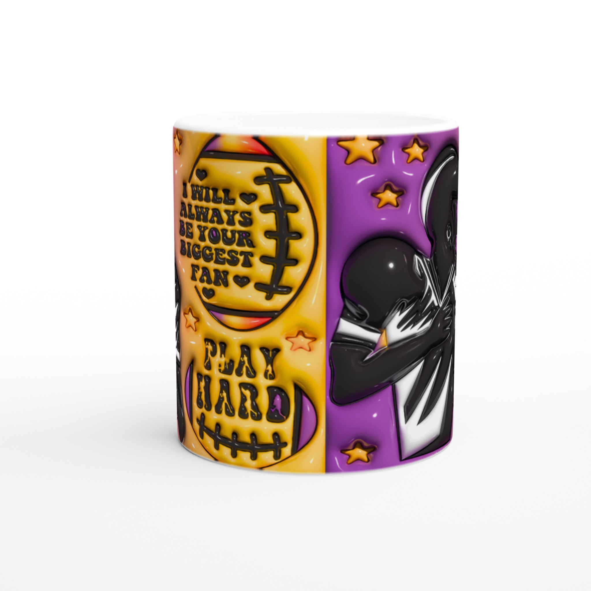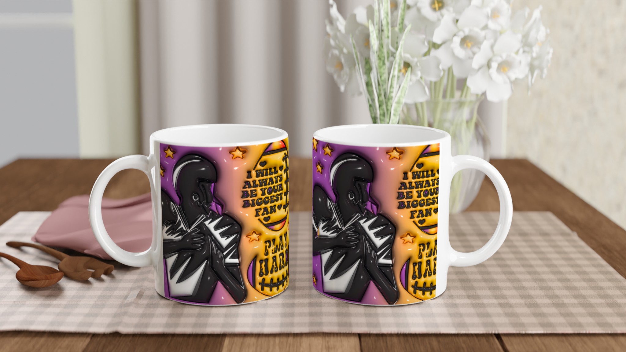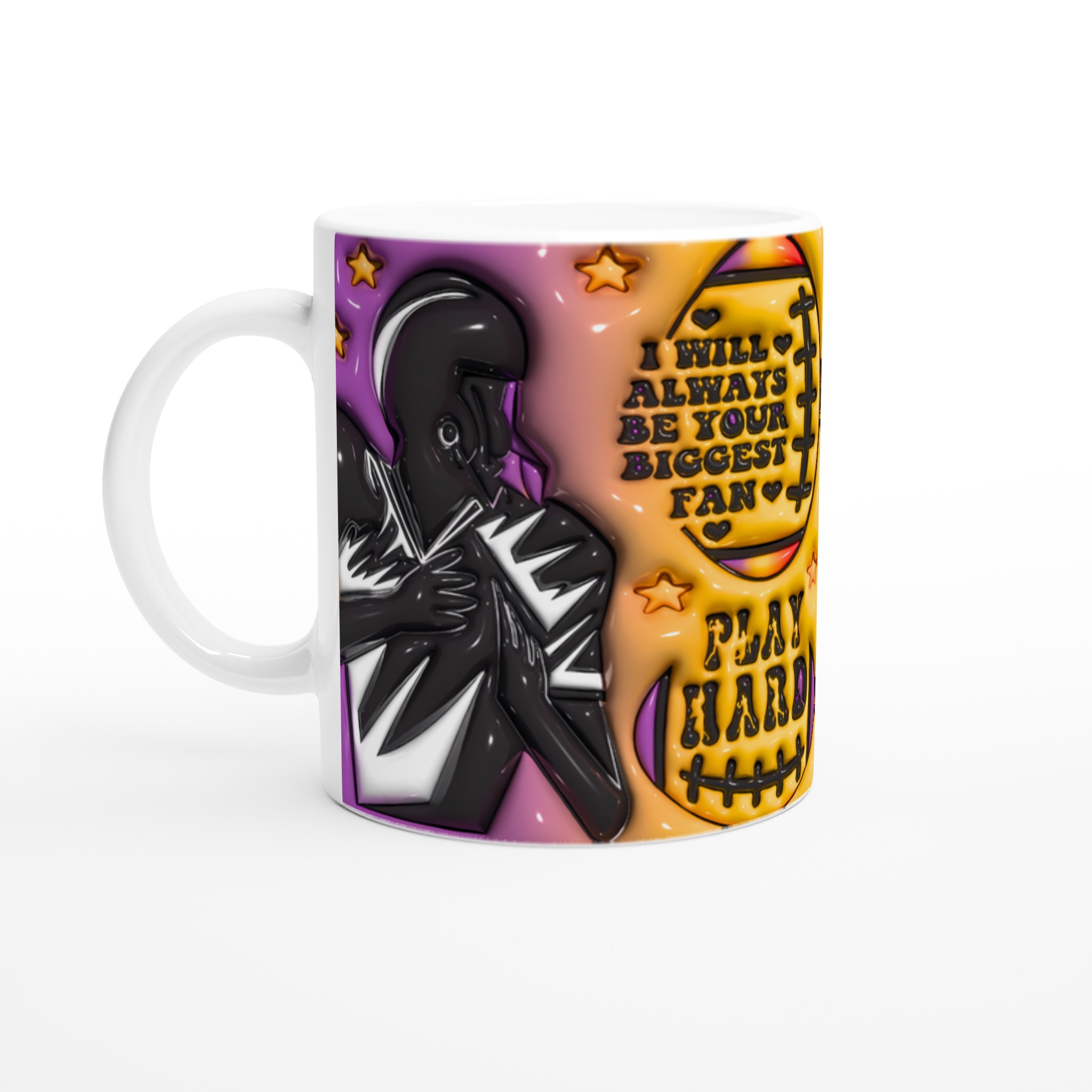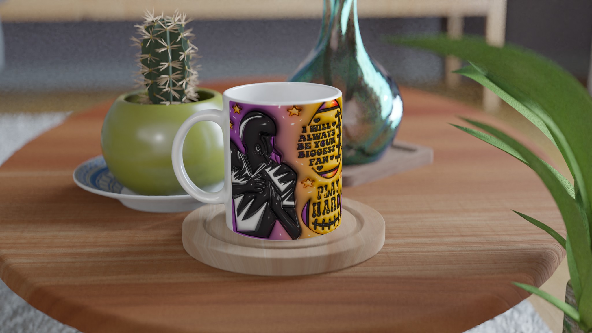 Ge din dag en kickstart eller varva ner med denna inspirerande keramiska mugg, perfekt för alla som älskar fotboll och vill visa sitt stöd! Med budskapet ”I will always be your biggest fan” och ”Play Hard” är denna mugg en hyllning till sportandan och de man håller kär. Den glänsande, detaljerade designen med fotbollsspelare och stjärnor framhävs vackert på den blanka ytan, vilket garanterar att varje morgonkaffe eller kvällste blir en upplyftande upplevelse.