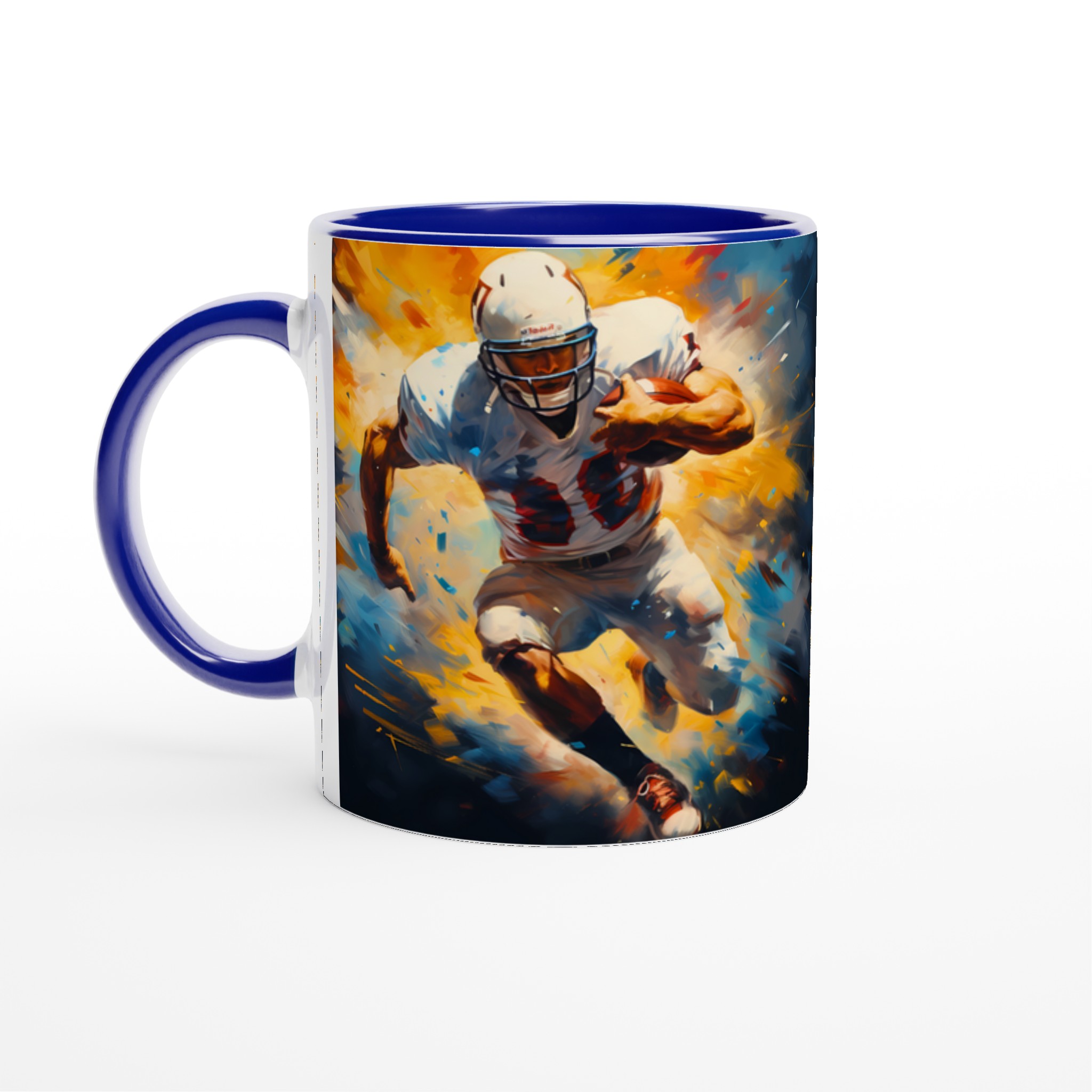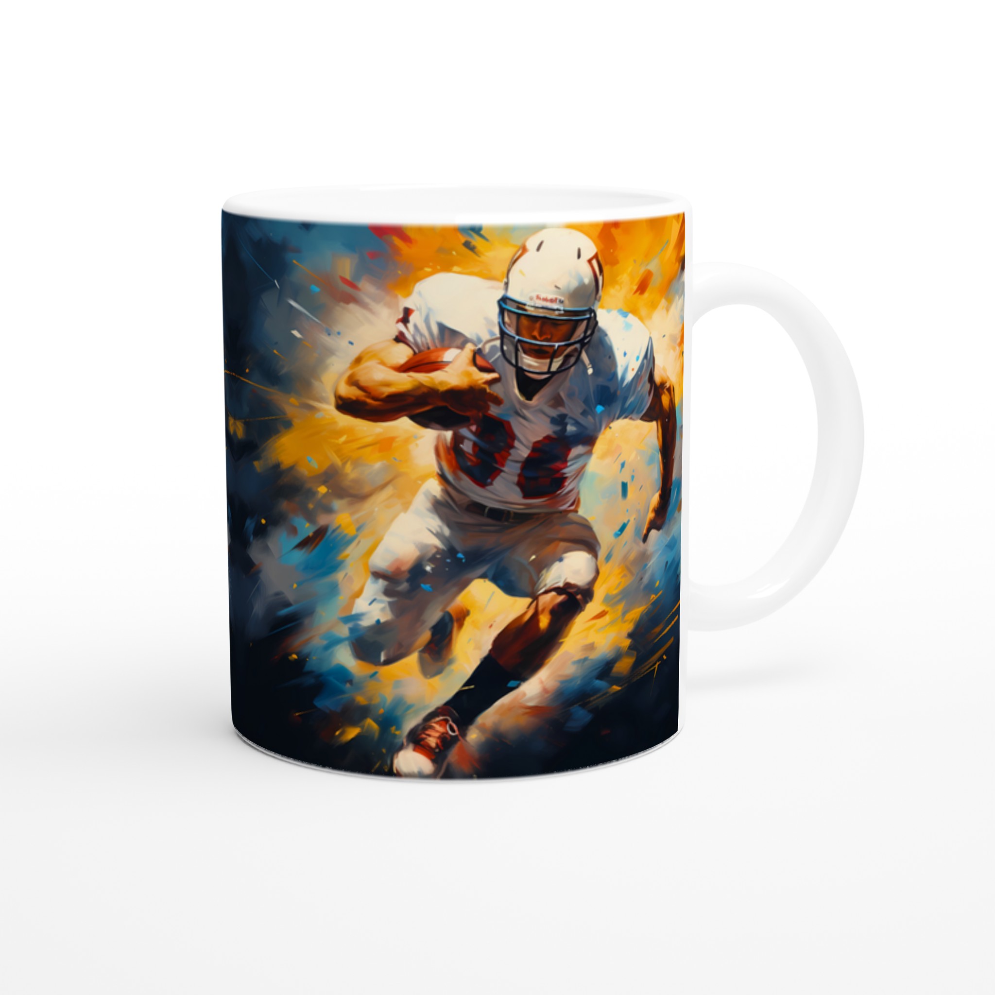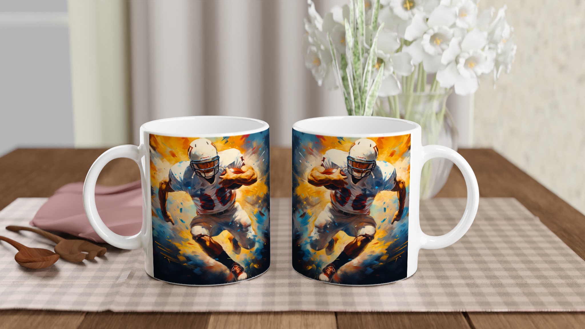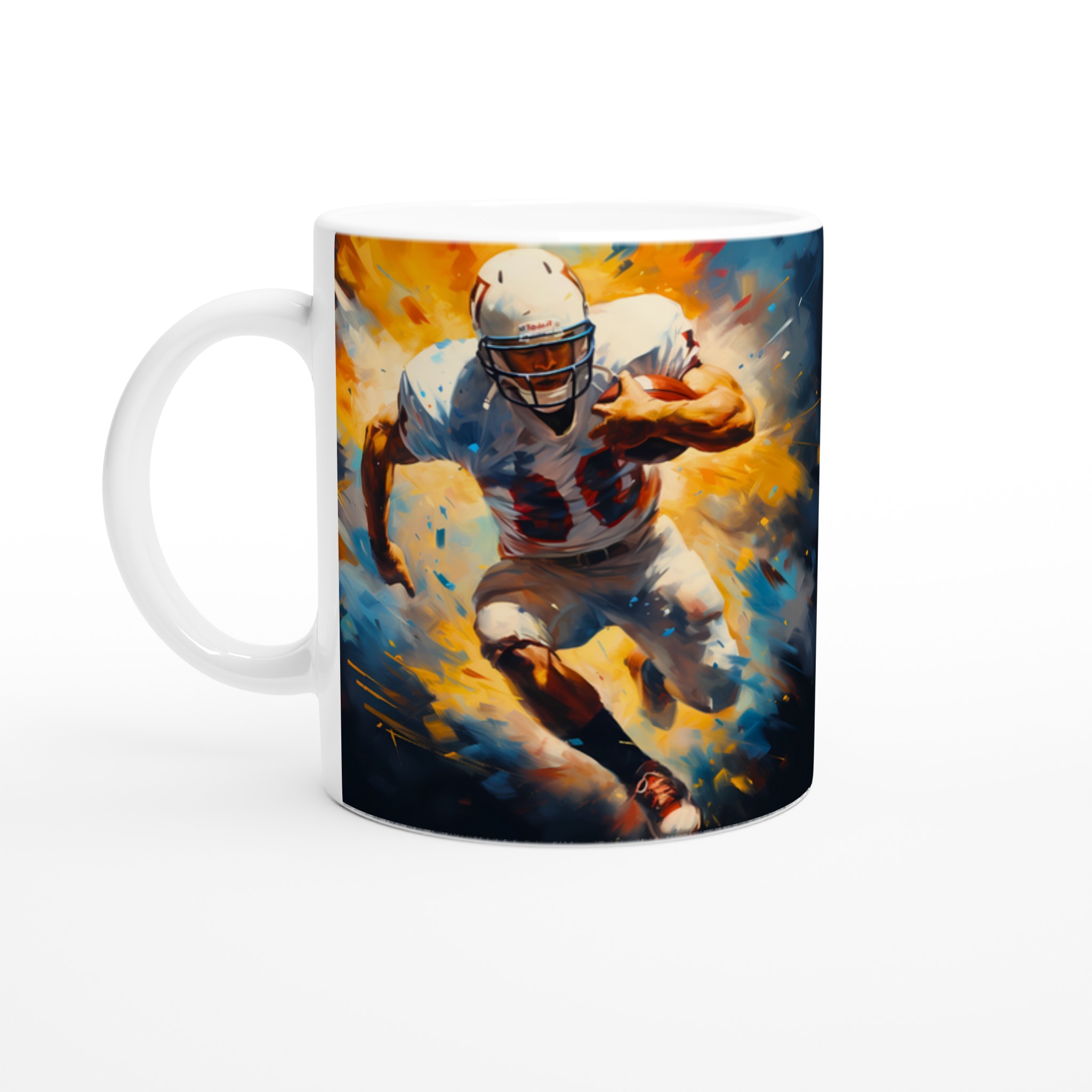 Fånga sportens dynamik med denna exceptionella keramiska mugg, som hyllar den intensiva energin och konsten i amerikansk fotboll. Den här muggen är designad för att inspirera och blir snabbt en vardagsfavorit, perfekt för morgonkaffet, kvällens varma choklad eller när du bara vill njuta av en kopp te medan du drömmer om nästa stora match.