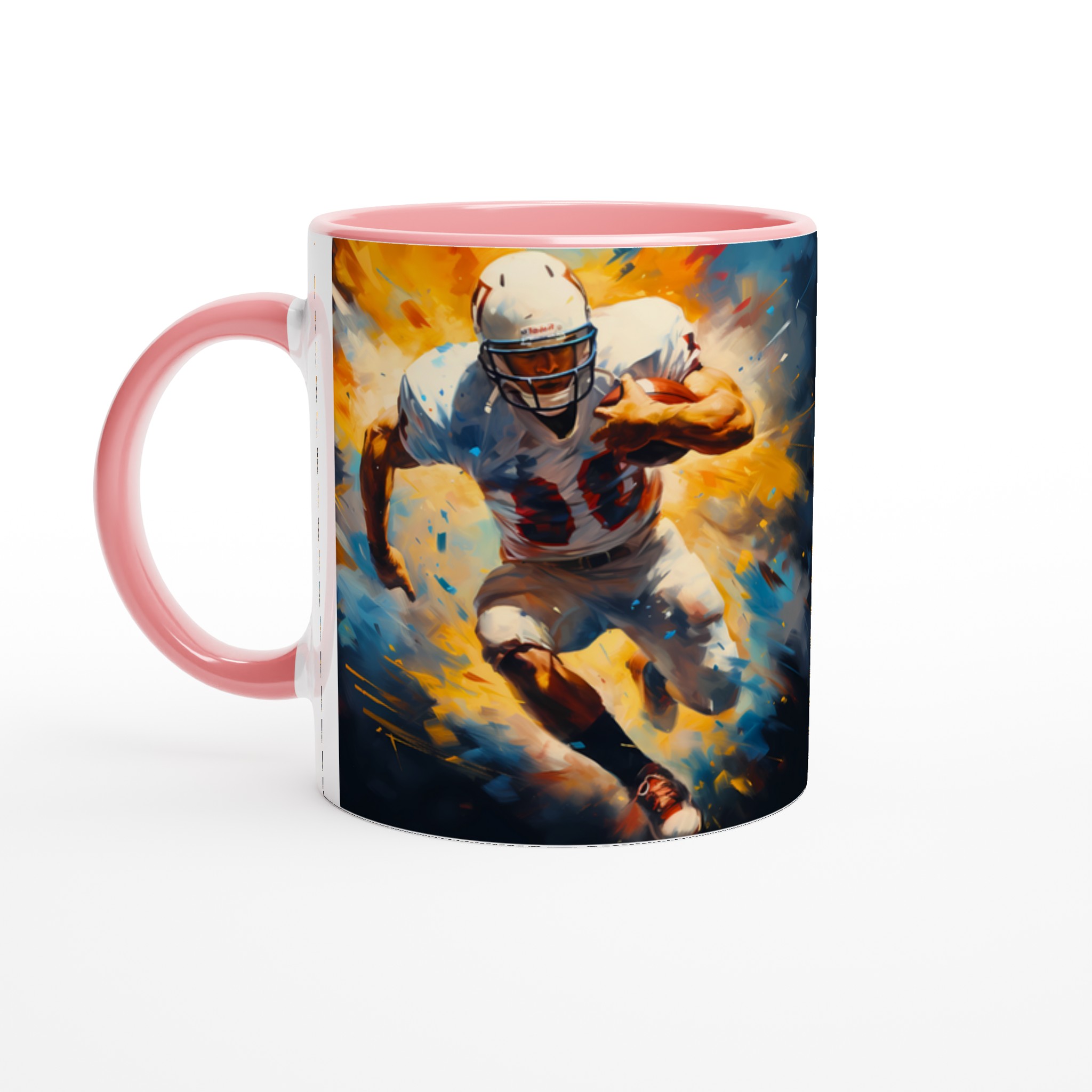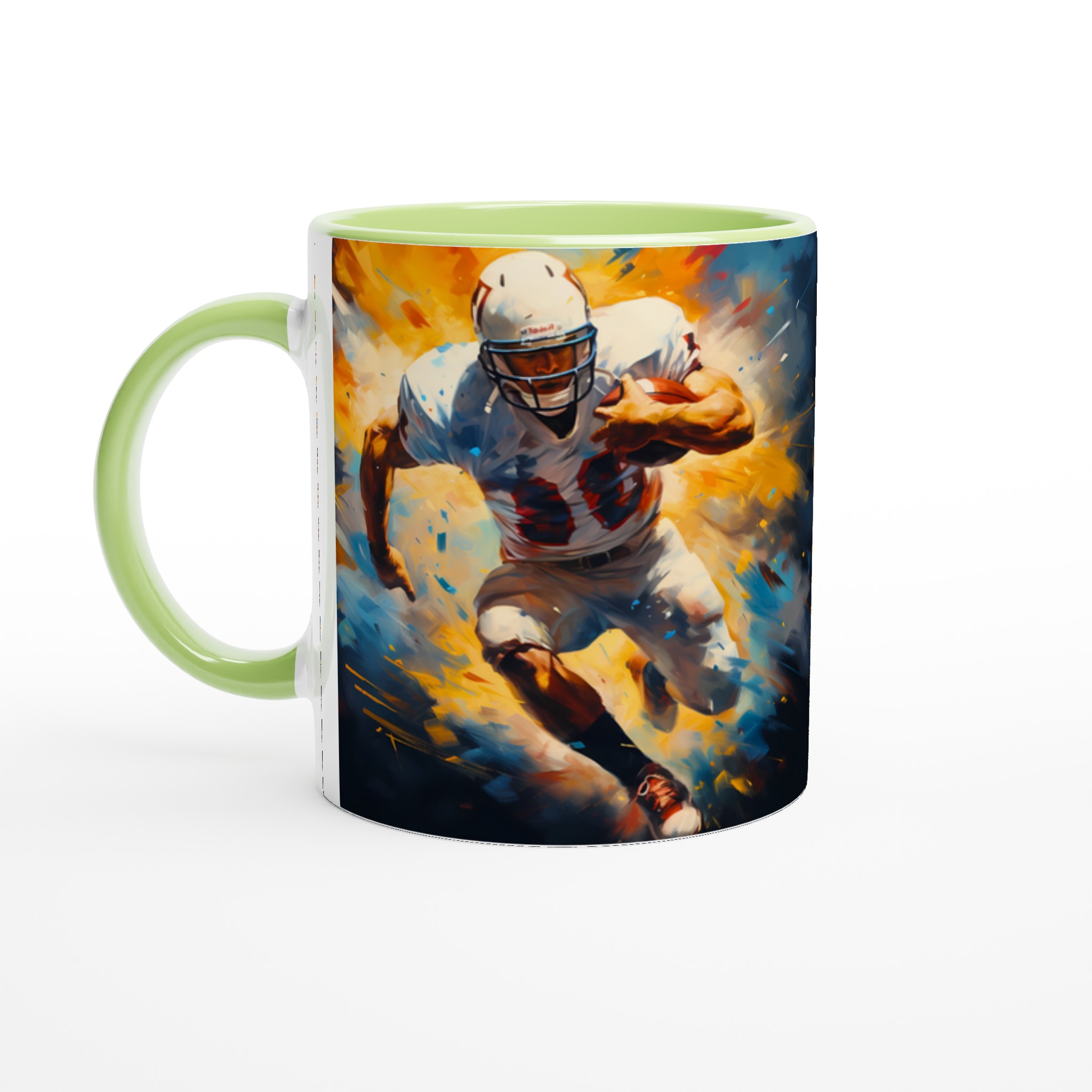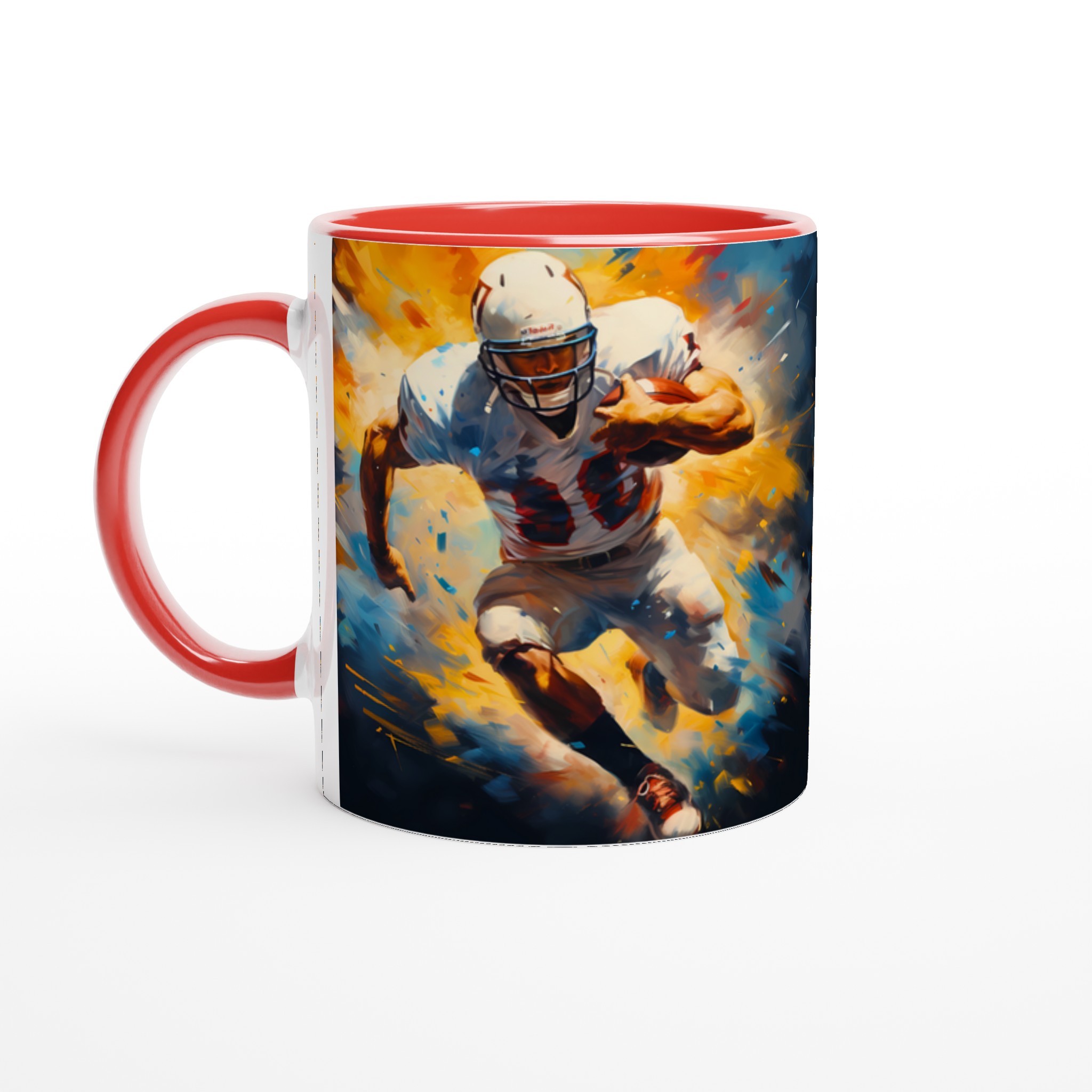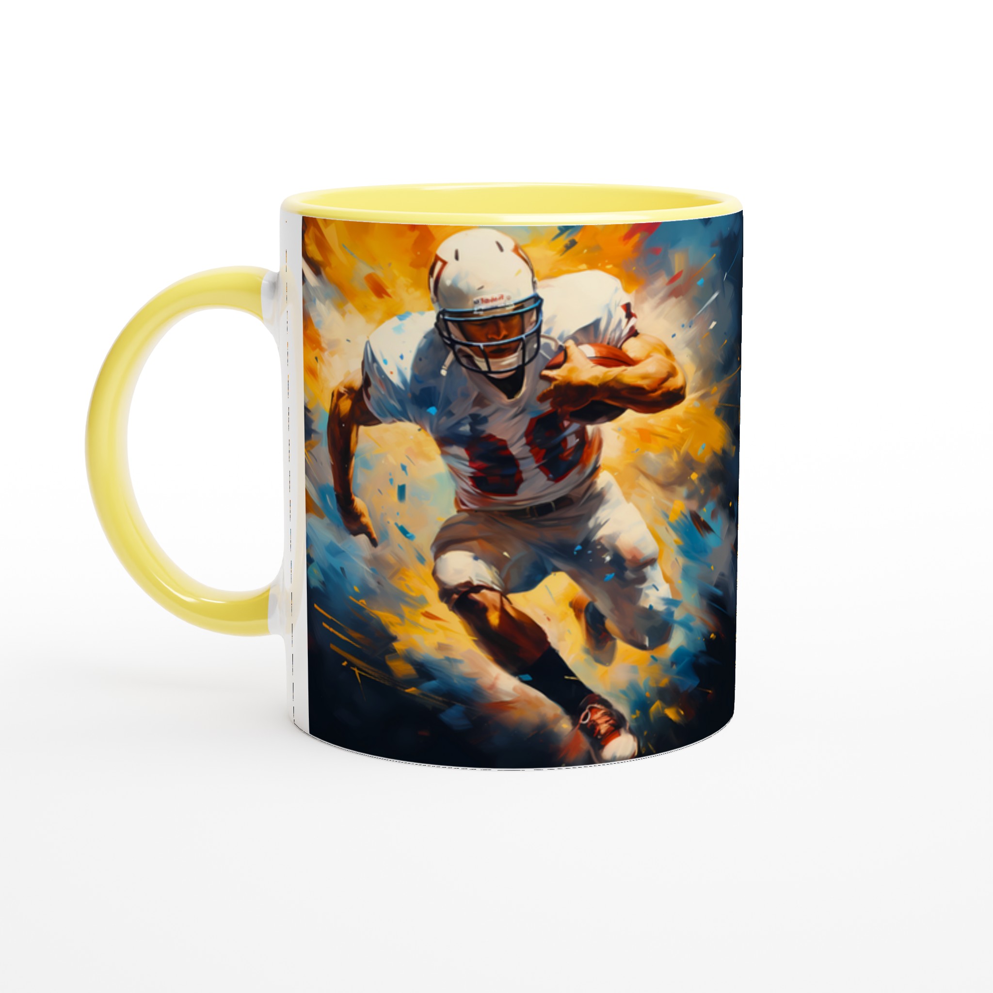 Fånga sportens dynamik med denna exceptionella keramiska mugg, som hyllar den intensiva energin och konsten i amerikansk fotboll. Den här muggen är designad för att inspirera och blir snabbt en vardagsfavorit, perfekt för morgonkaffet, kvällens varma choklad eller när du bara vill njuta av en kopp te medan du drömmer om nästa stora match.