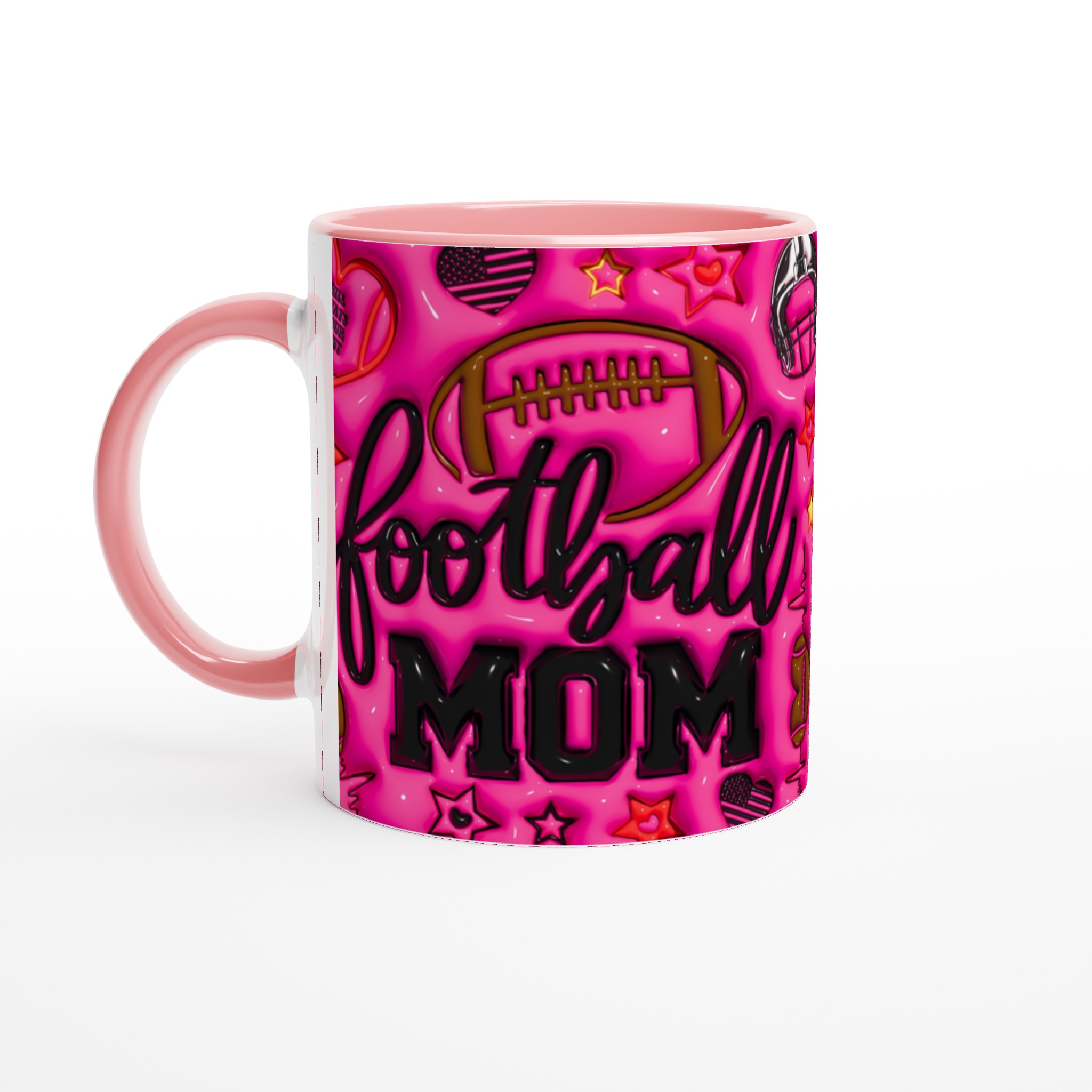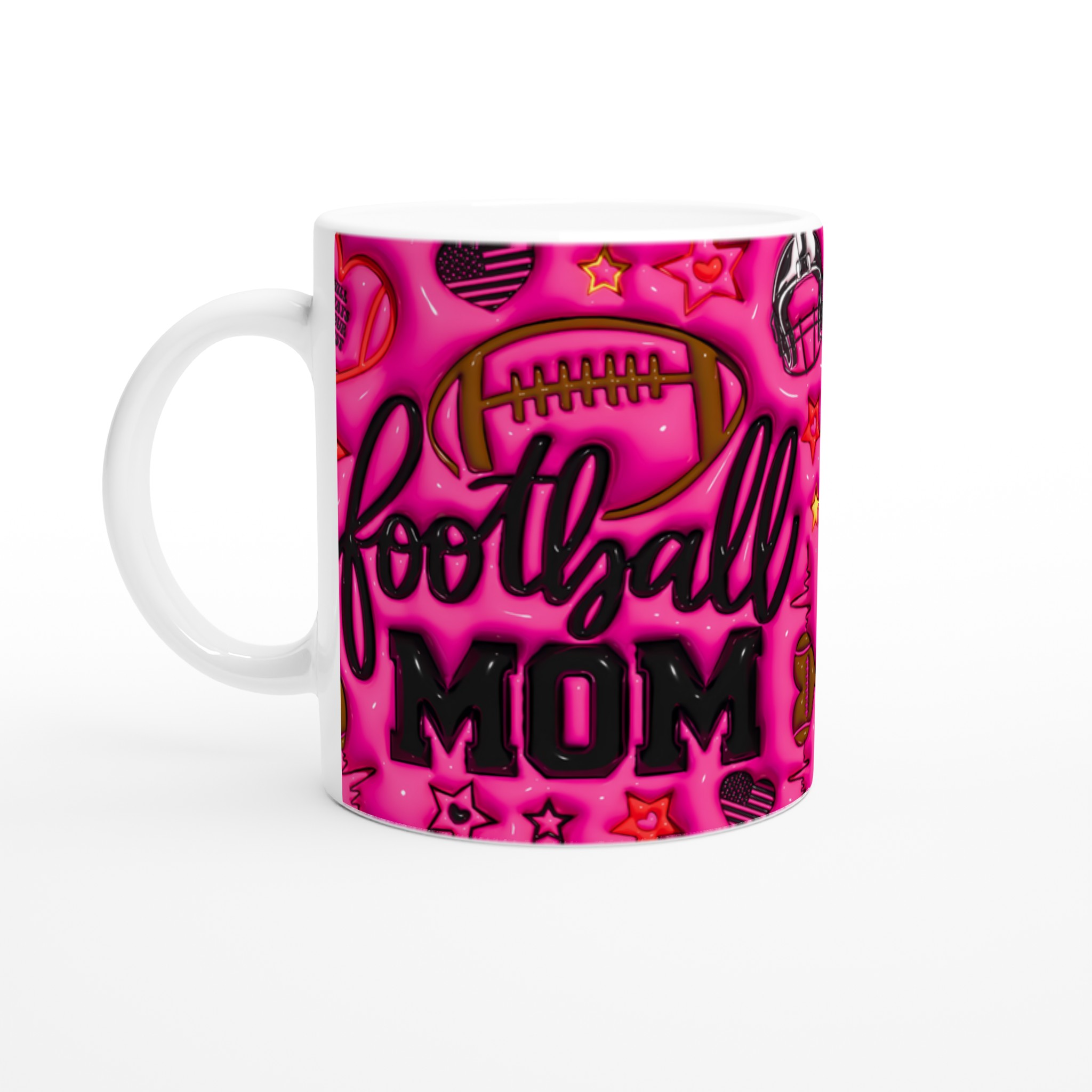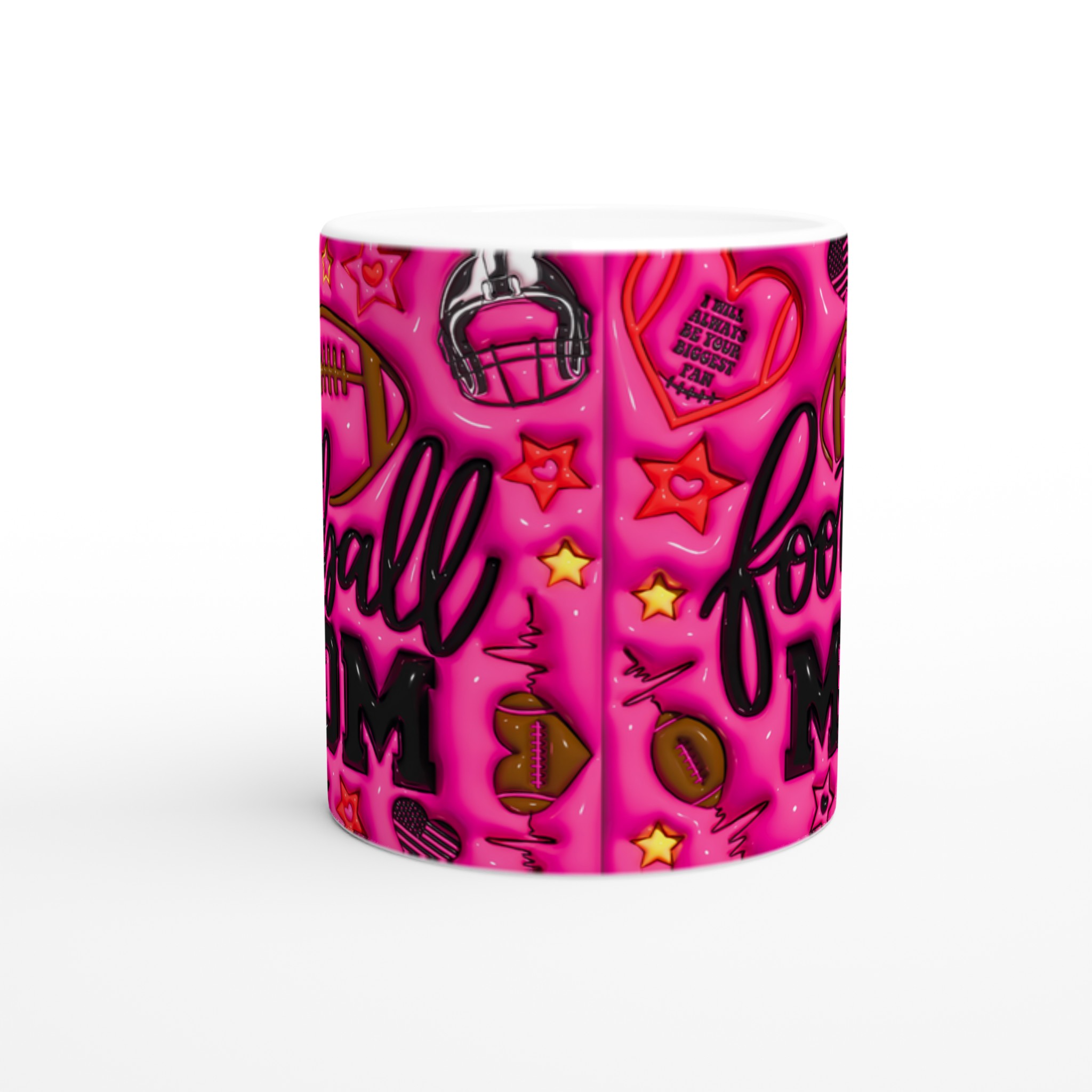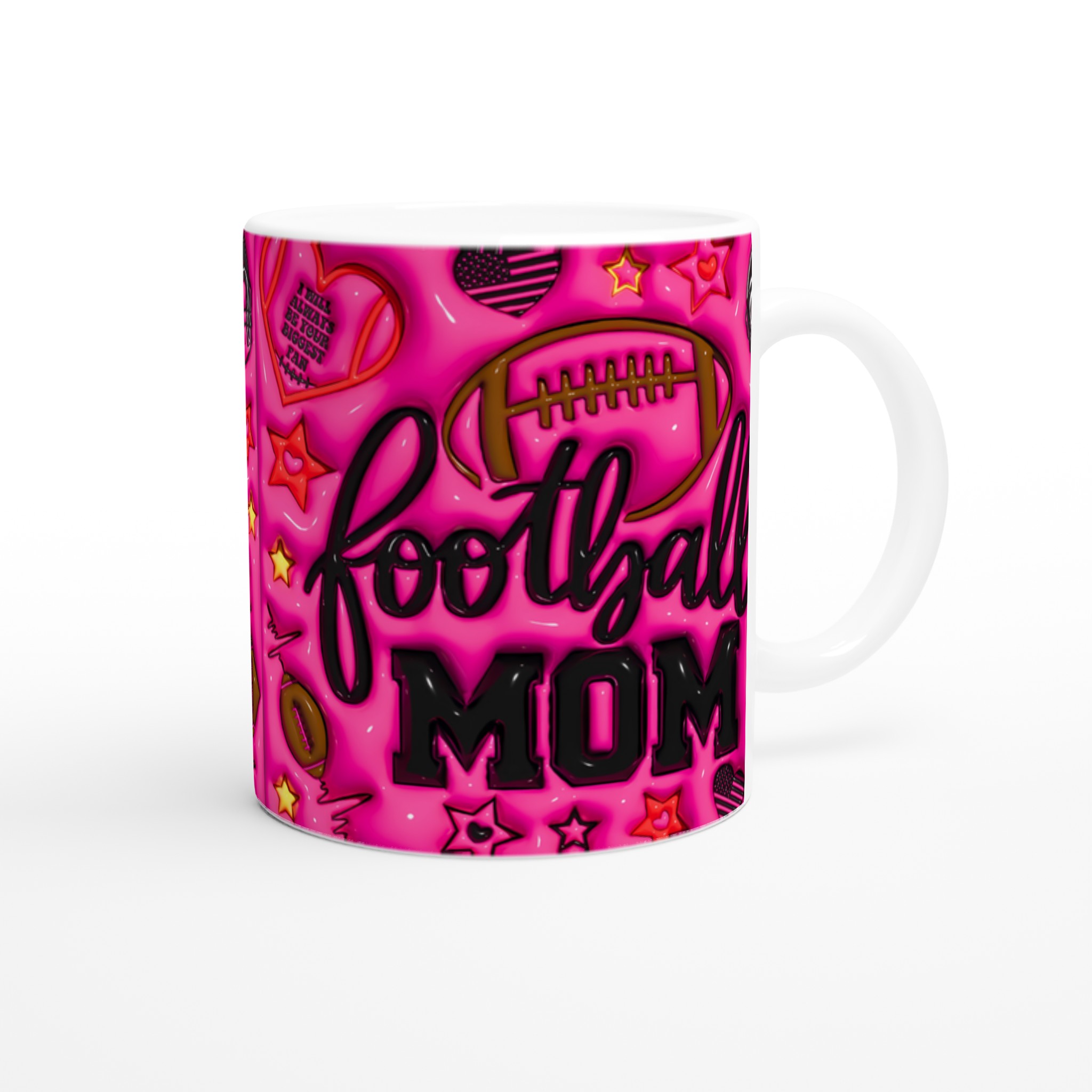 Fira din roll som hejarklackens stjärna med vår ”Football Mom” keramiska mugg! Denna mugg är designad för att sticka ut, med en levande rosa bakgrund fylld av glansiga fotbollsmotiv, stjärnor och det hjärtevärmande budskapet ”I will always be your biggest fan”. Perfekt för morgonkaffet före matchen, kvällens varma choklad efter en vinst, eller när du bara vill njuta av en kopp te medan du drömmer om nästa säsong. Den blanka ytan säkerställer att trycket framhävs med klara och levande färger, som håller sig fina även efter många turer i mikron och diskmaskinen.
