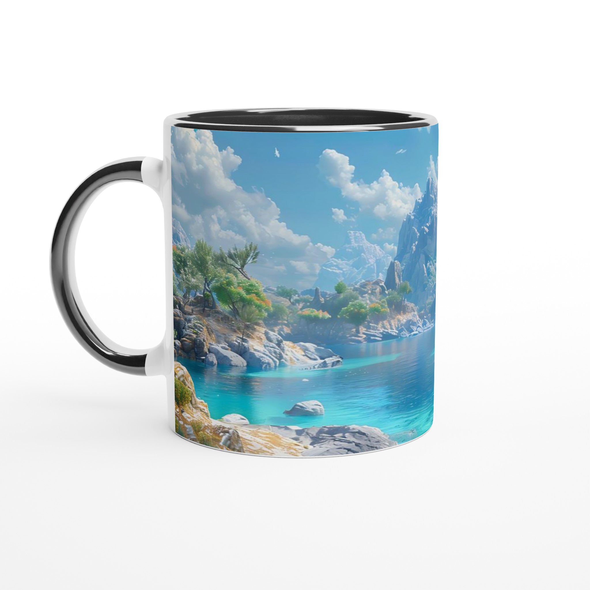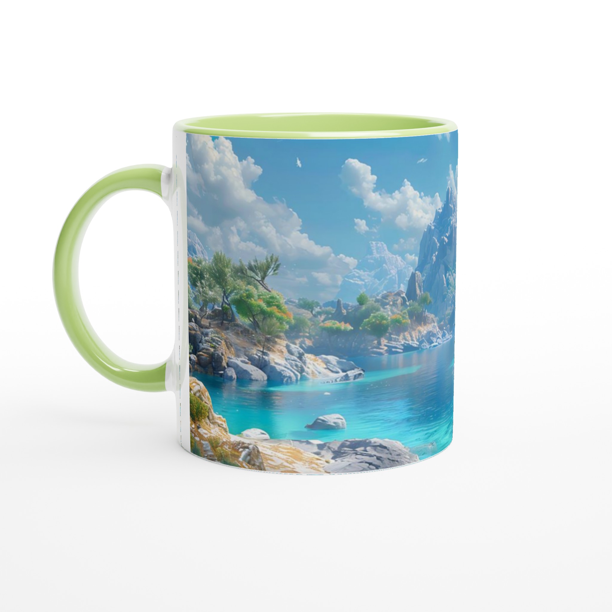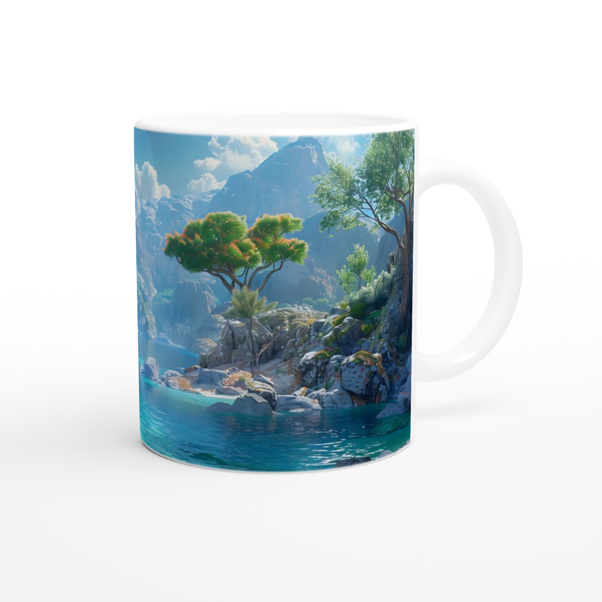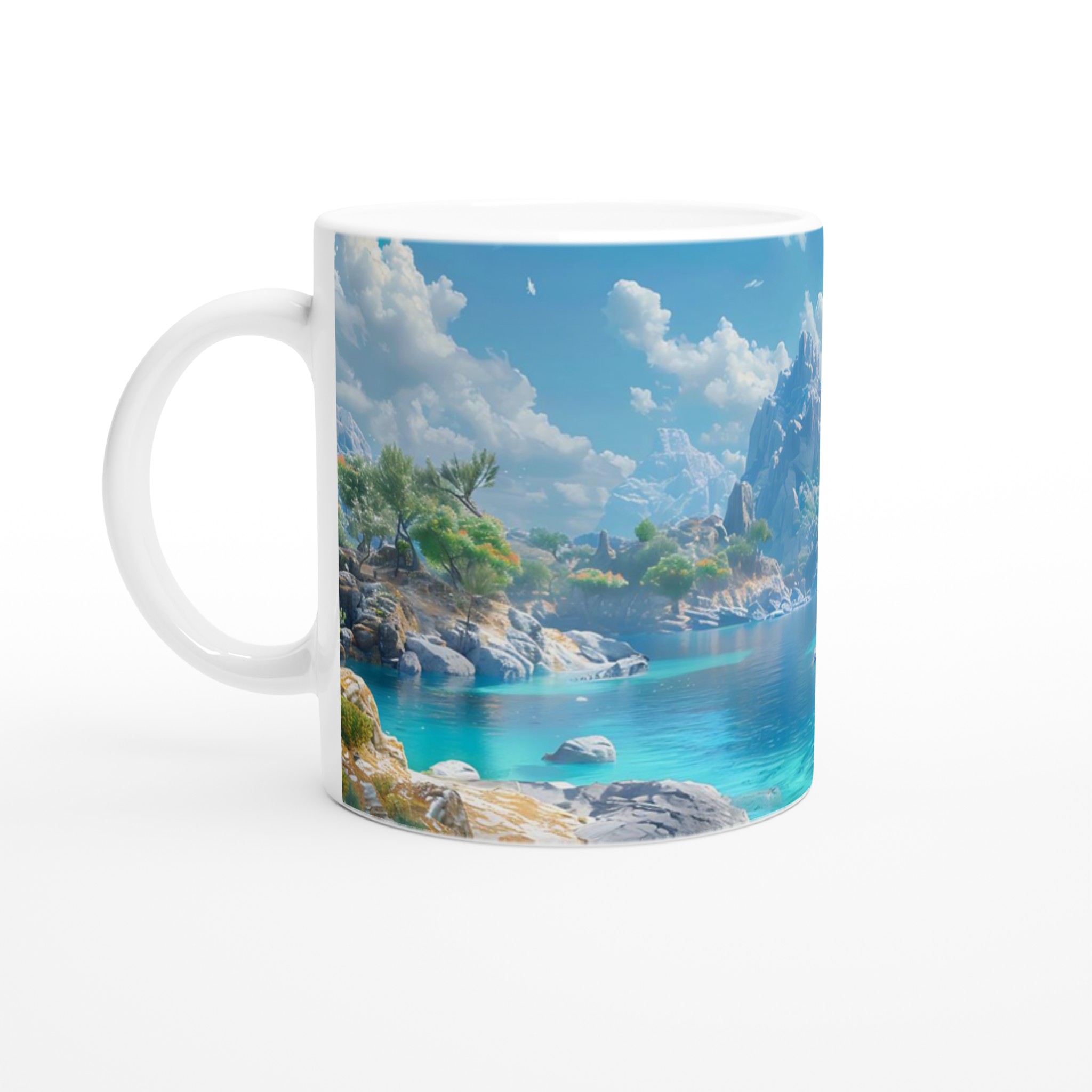 Föreställ dig att du sitter vid en stilla, turkosblå sjö, omgiven av majestätiska berg och lummiga träd, med den svalkande brisen mot din hud. Denna känsla av lugn och harmoni fångas i designen på vår keramiska mugg. Varje detalj är inspirerad av naturens skönhet, från det klara vattnets nyanser till de frodiga bergens grönska, och inbjuder dig att fördjupa dig i en stund av stillhet med varje kopp.