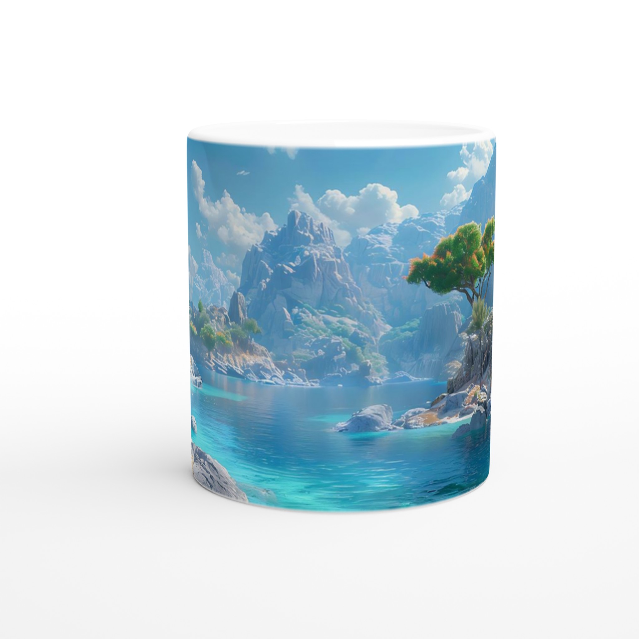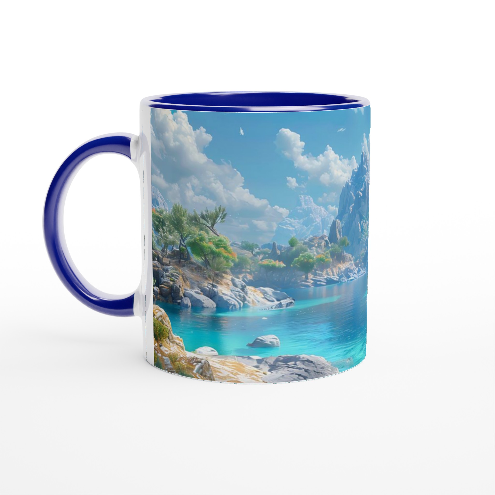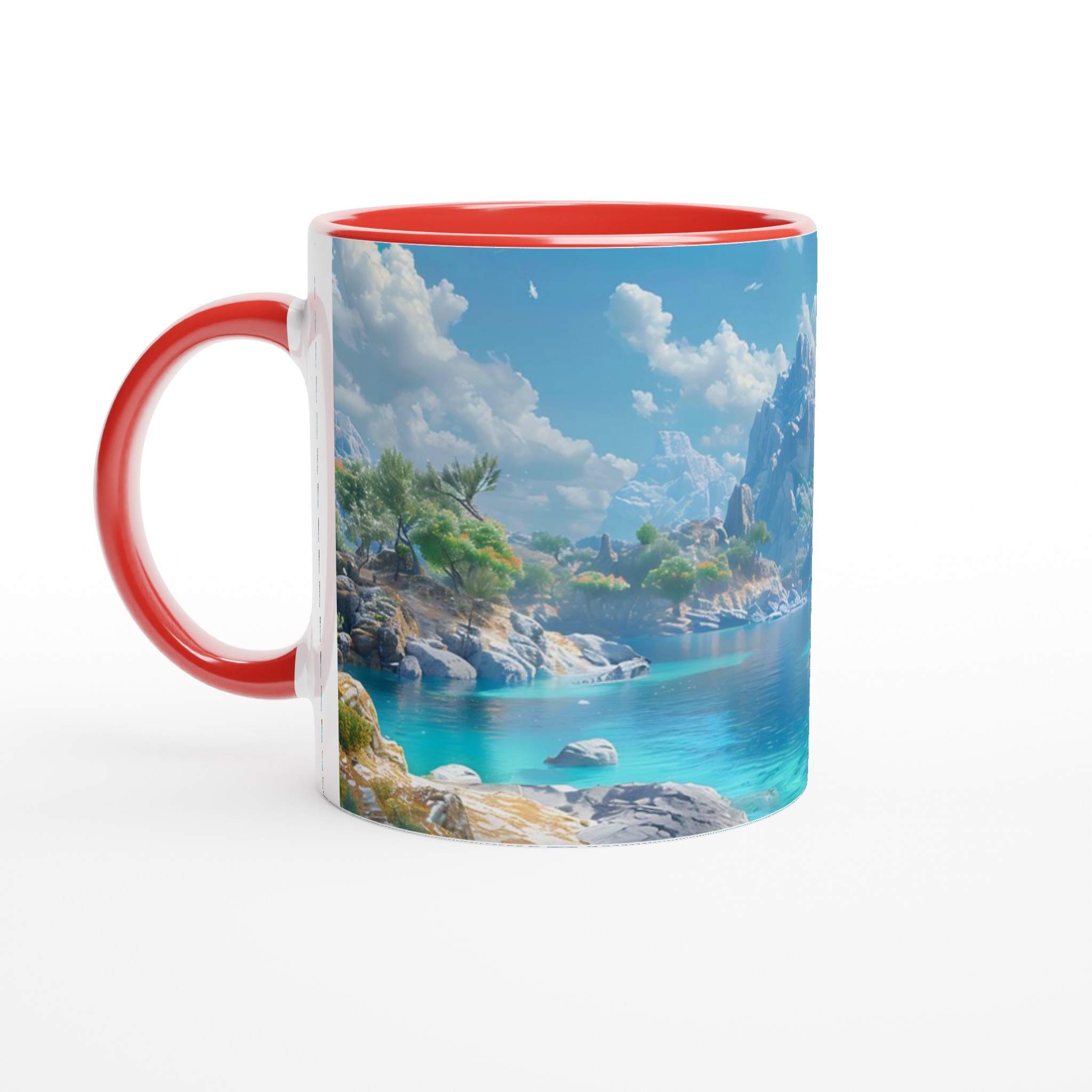 Föreställ dig att du sitter vid en stilla, turkosblå sjö, omgiven av majestätiska berg och lummiga träd, med den svalkande brisen mot din hud. Denna känsla av lugn och harmoni fångas i designen på vår keramiska mugg. Varje detalj är inspirerad av naturens skönhet, från det klara vattnets nyanser till de frodiga bergens grönska, och inbjuder dig att fördjupa dig i en stund av stillhet med varje kopp.