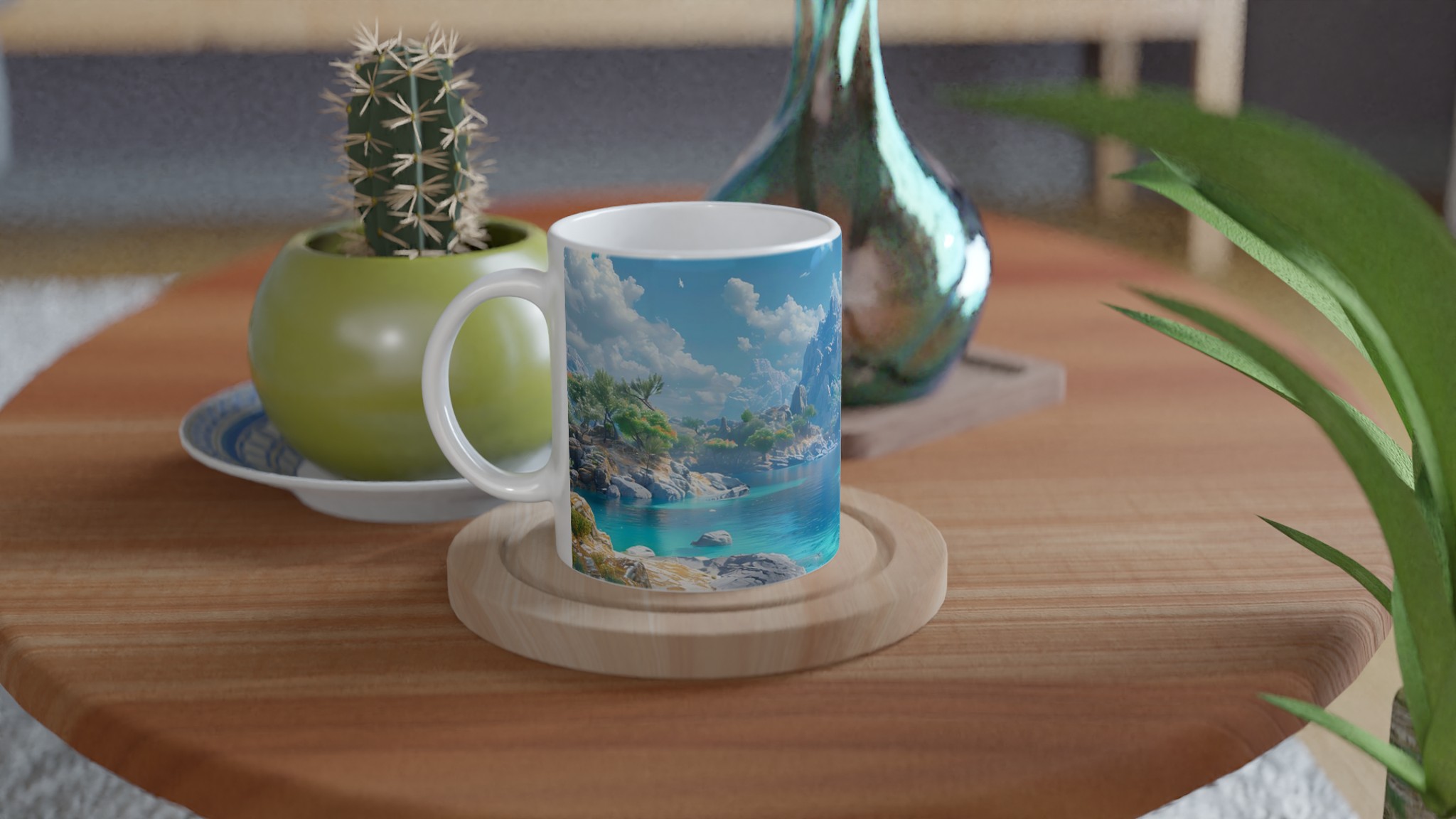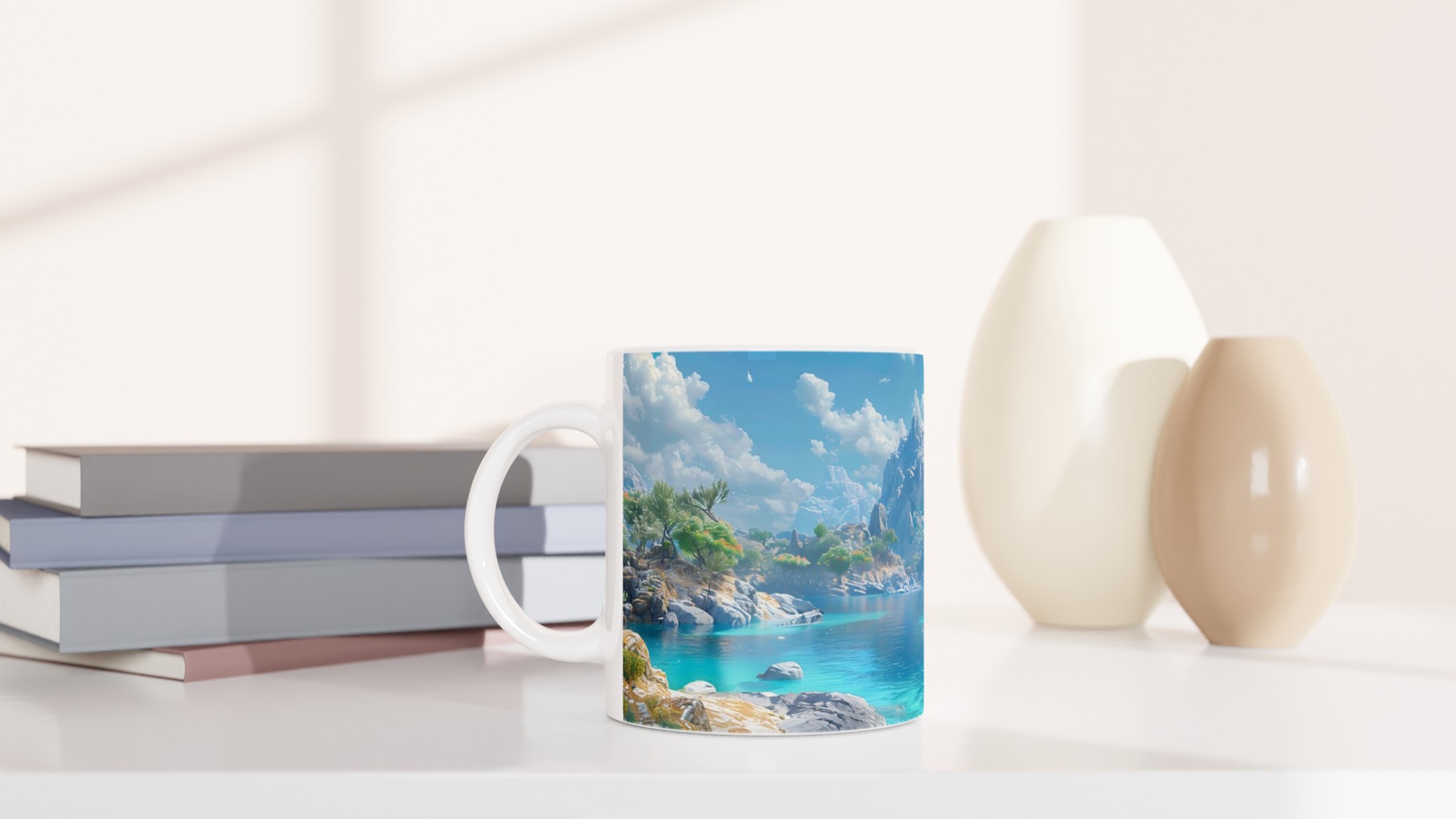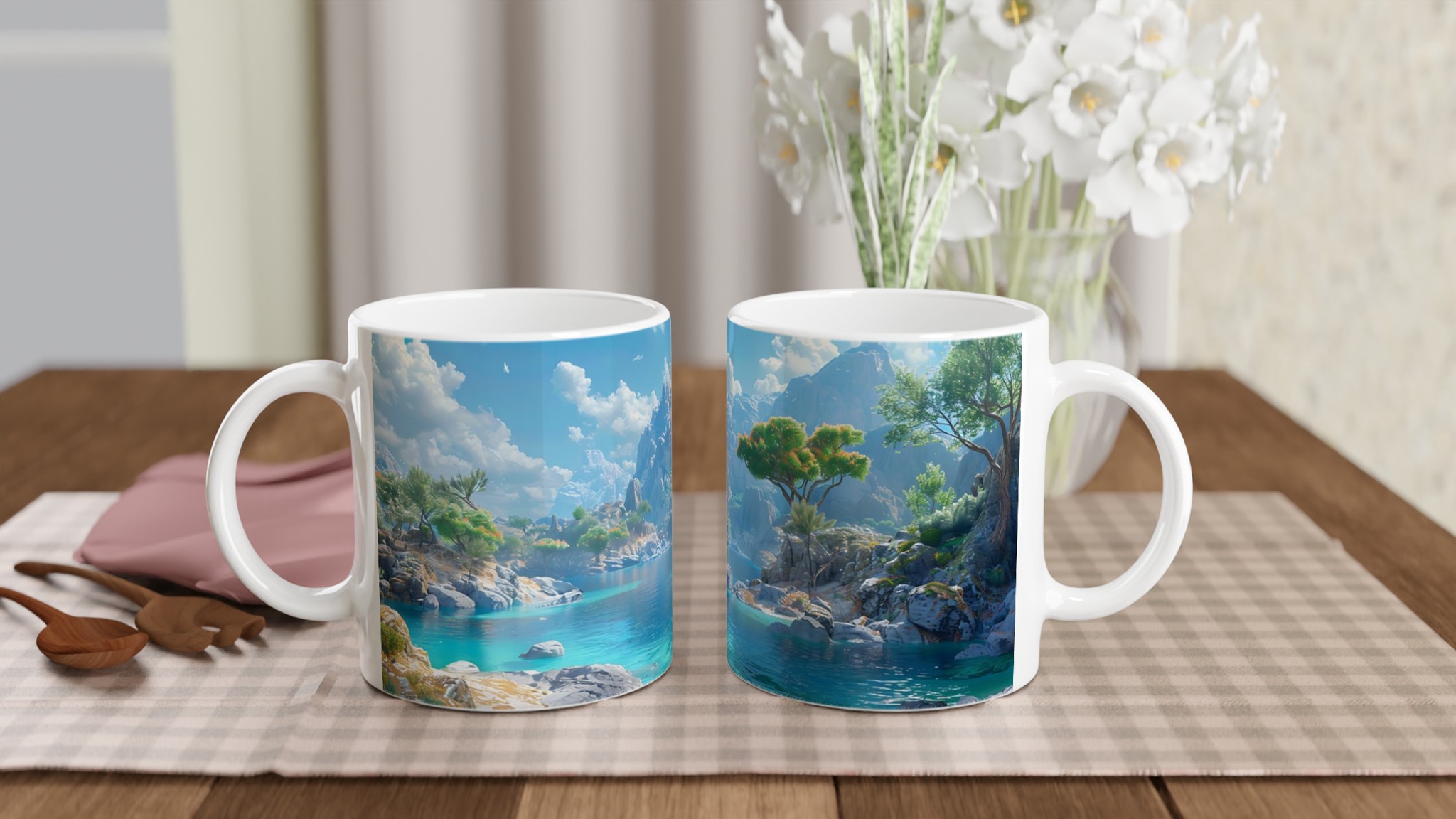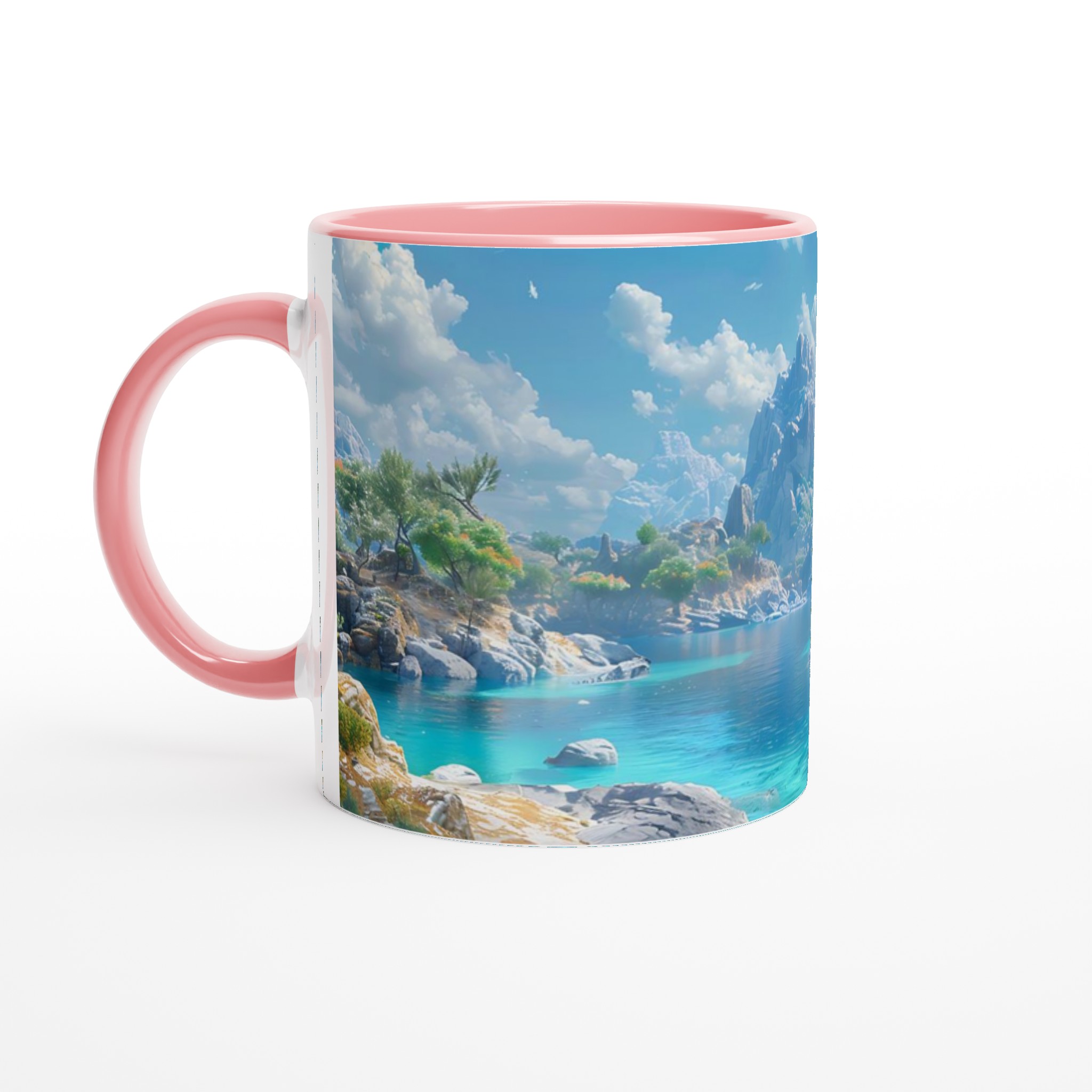Föreställ dig att du sitter vid en stilla, turkosblå sjö, omgiven av majestätiska berg och lummiga träd, med den svalkande brisen mot din hud. Denna känsla av lugn och harmoni fångas i designen på vår keramiska mugg. Varje detalj är inspirerad av naturens skönhet, från det klara vattnets nyanser till de frodiga bergens grönska, och inbjuder dig att fördjupa dig i en stund av stillhet med varje kopp.