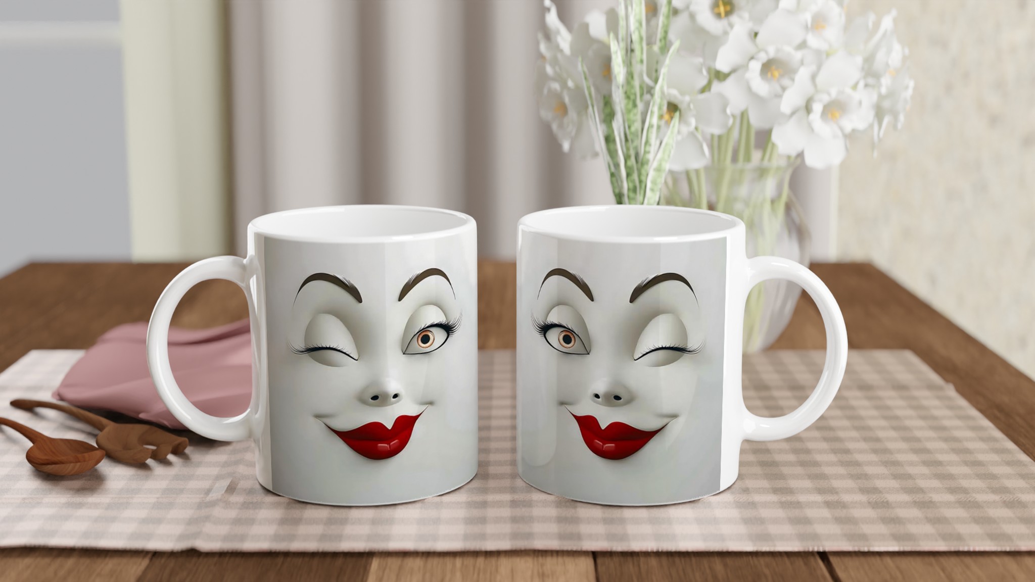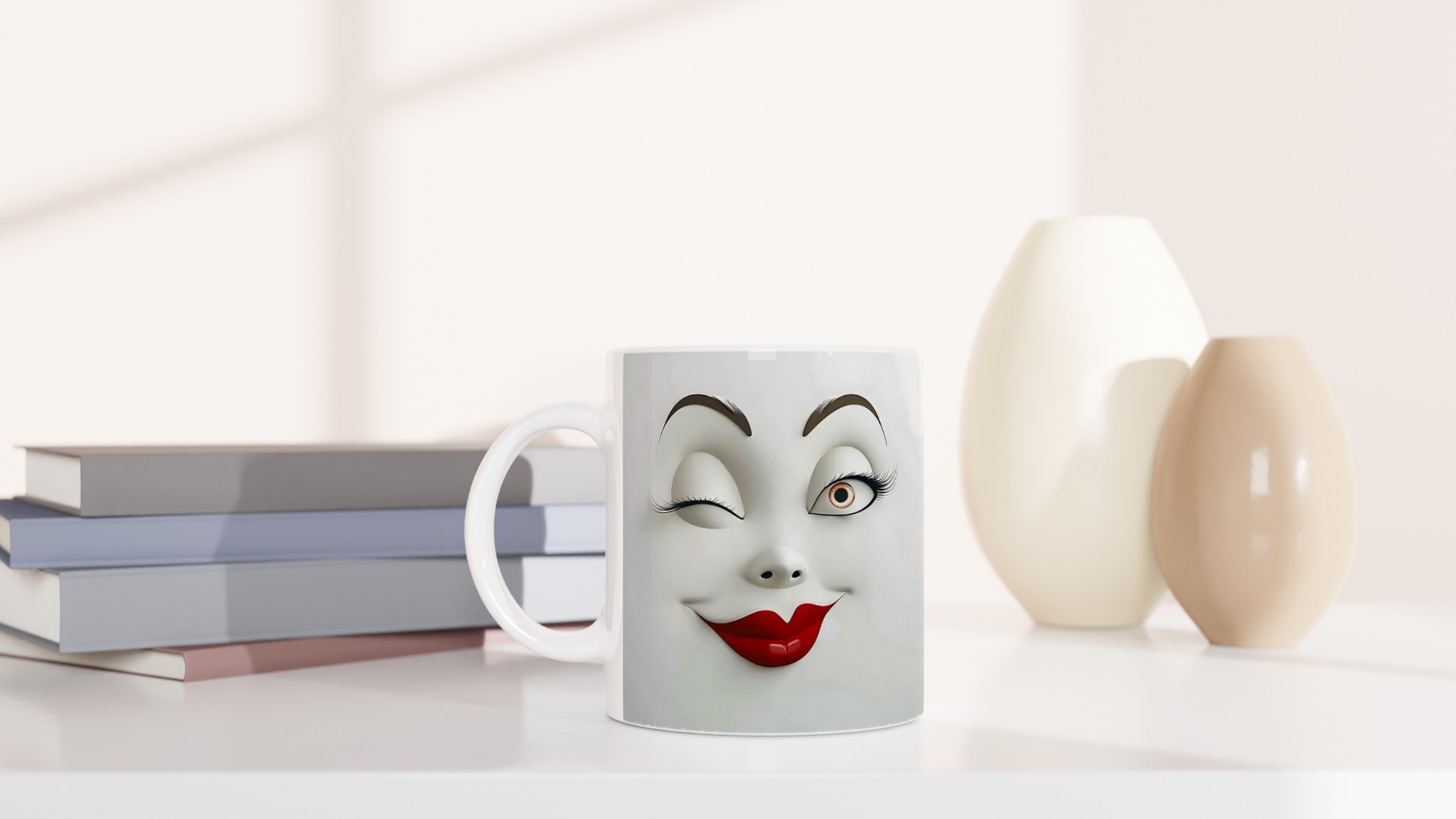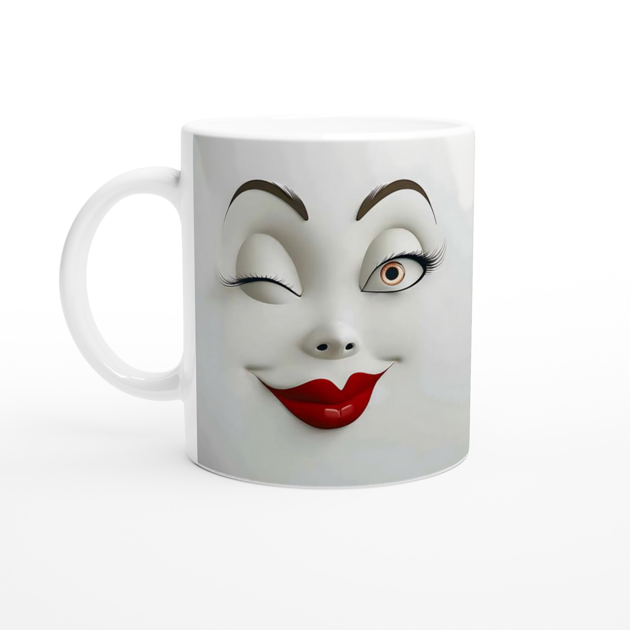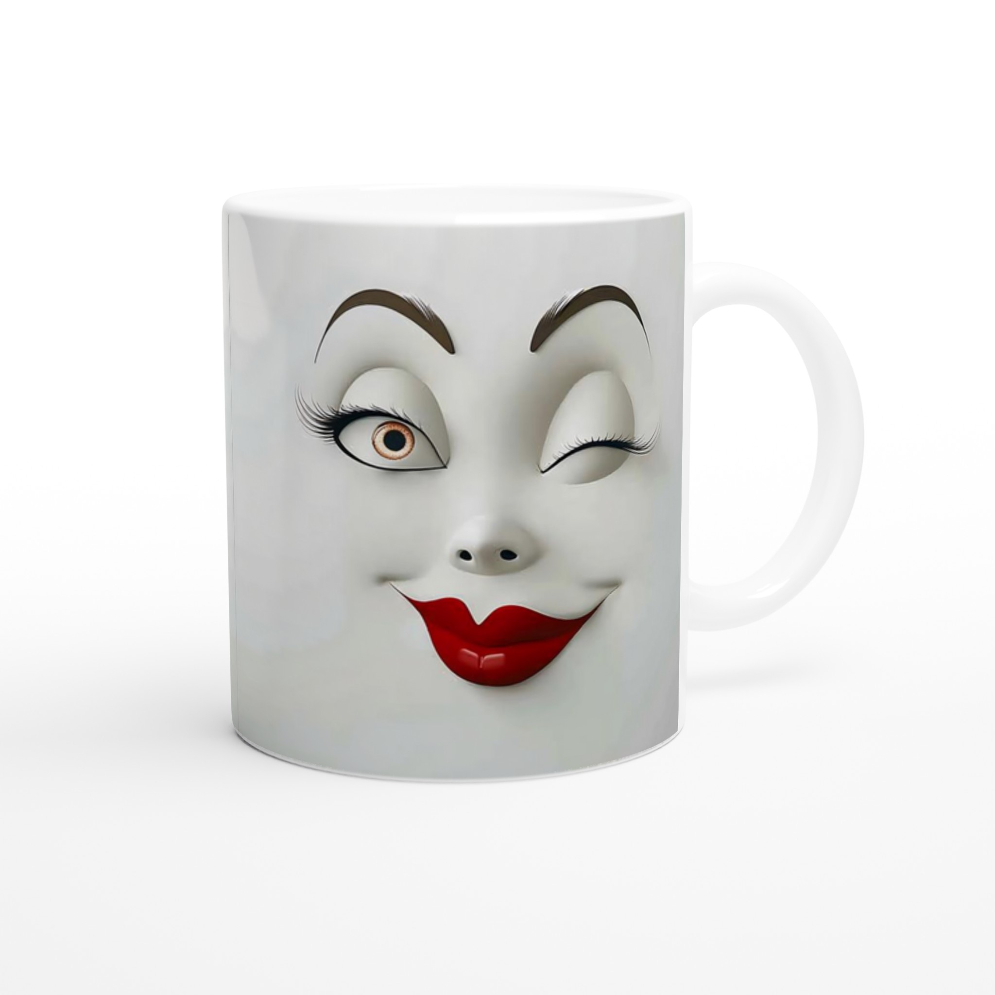 Denna lekfulla design med en förförisk blinkning och ett sött leende ger din mugg en unik personlighet, perfekt för att starta dagen med ett skratt eller ge bort en present som garanterat uppskattas. Den blanka vita ytan ger ett skarpt och levande tryck som verkligen sticker ut, oavsett om det är en personlig design, ett roligt citat eller en present till någon du tycker om.