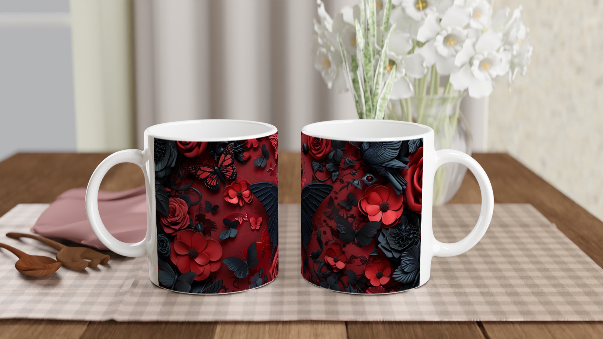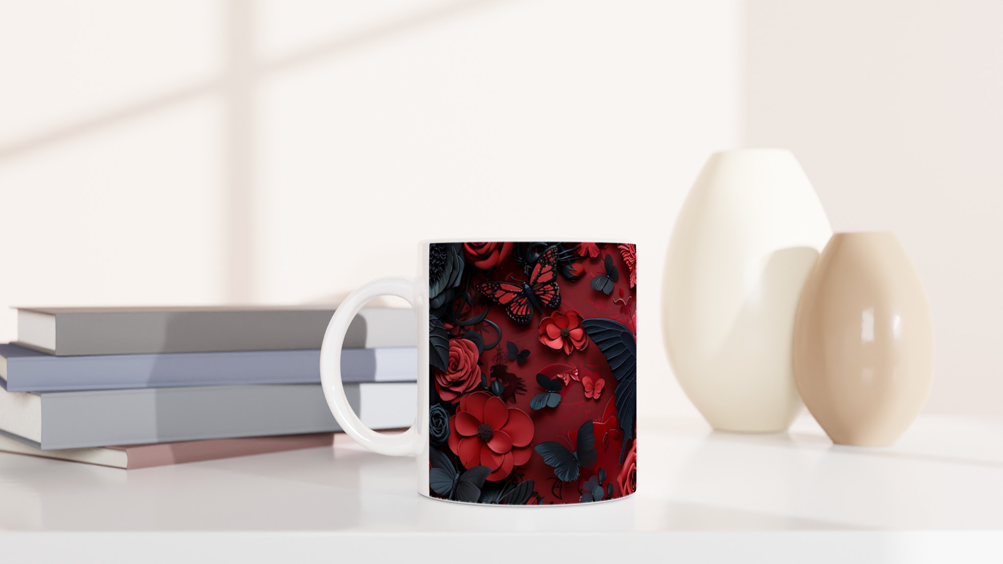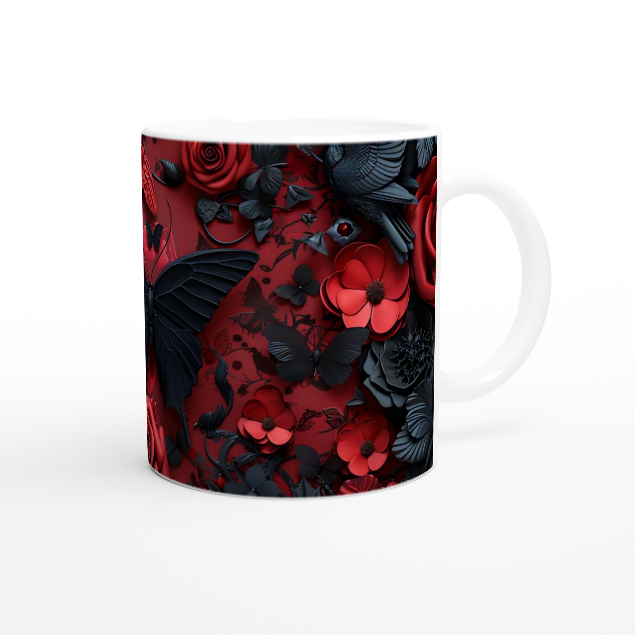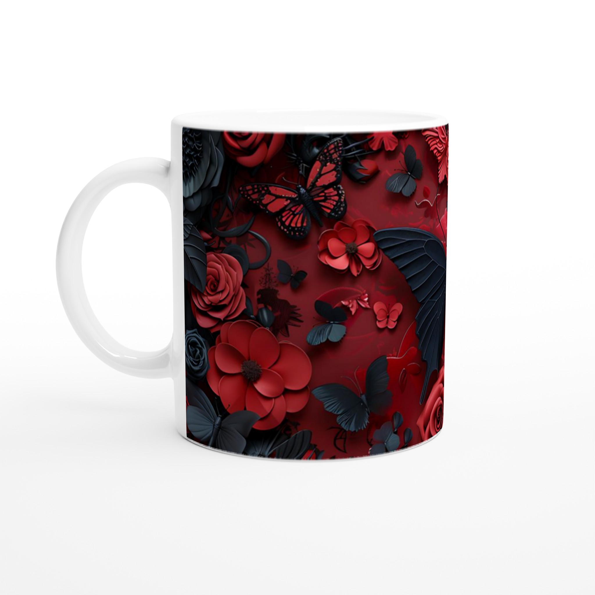 Den här stilrena keramiska muggen blir snabbt en vardagsfavorit. Kliv in i en värld av gotisk romantik varje gång du tar en klunk. Med en förtrollande design av djupröda rosor, svarta blommor och eleganta fjärilar, förvandlar denna mugg din fikapaus till en stund av mörk skönhet. Perfekt för morgonkaffet, kvällens varma choklad eller när du bara vill njuta av en kopp te. Den blanka vita ytan gör att trycken framhävs med klara och levande färger, som håller sig fina även efter många turer i mikron och diskmaskinen.