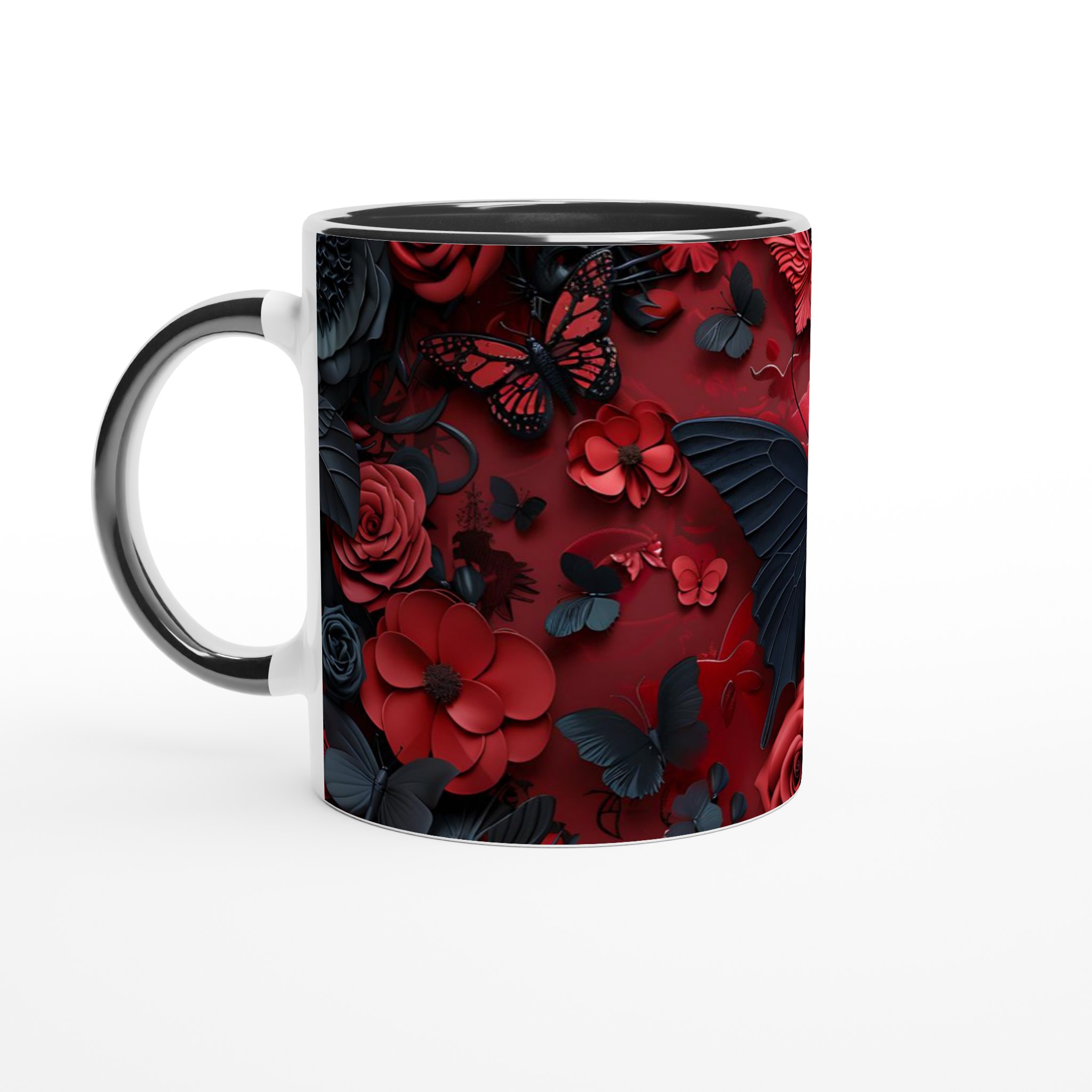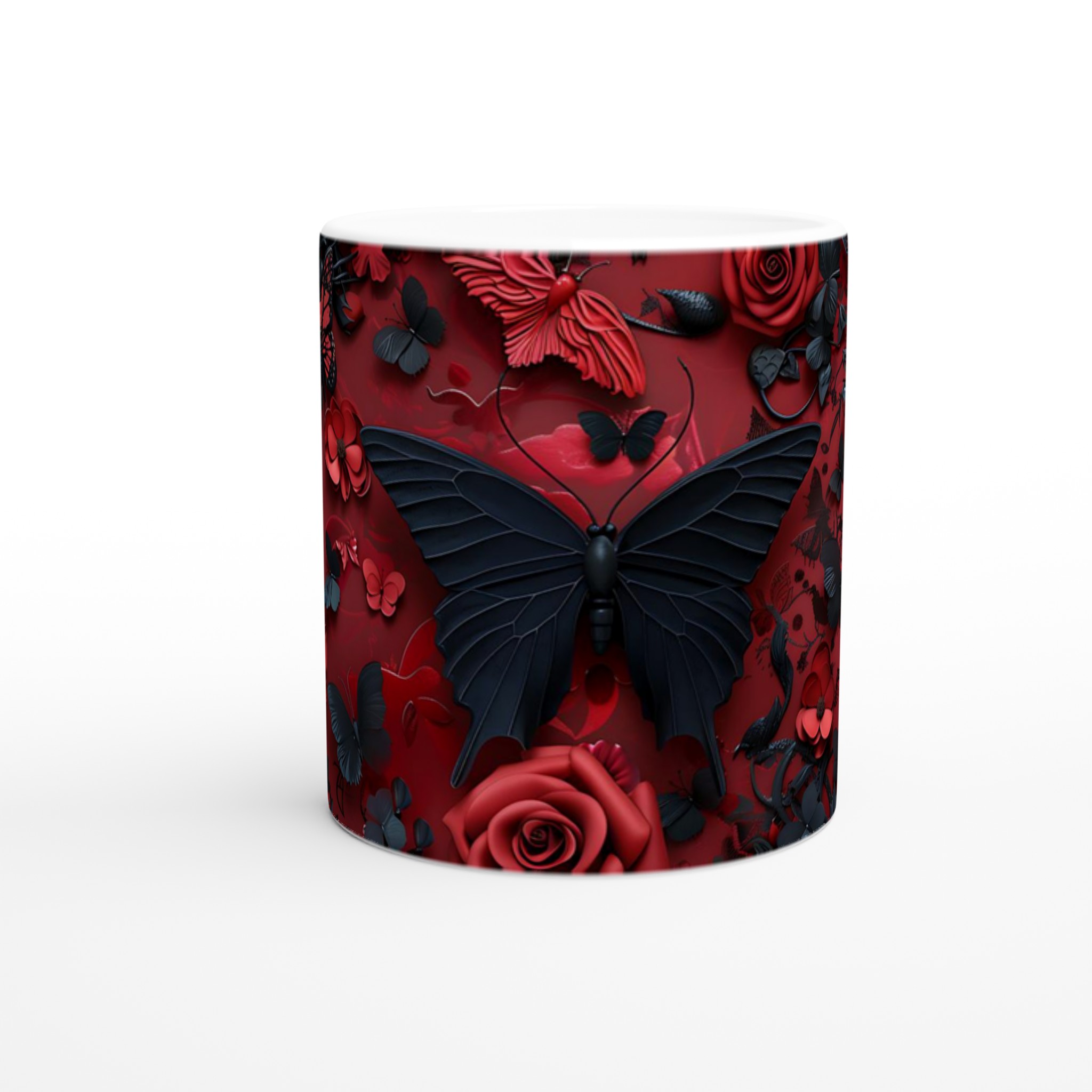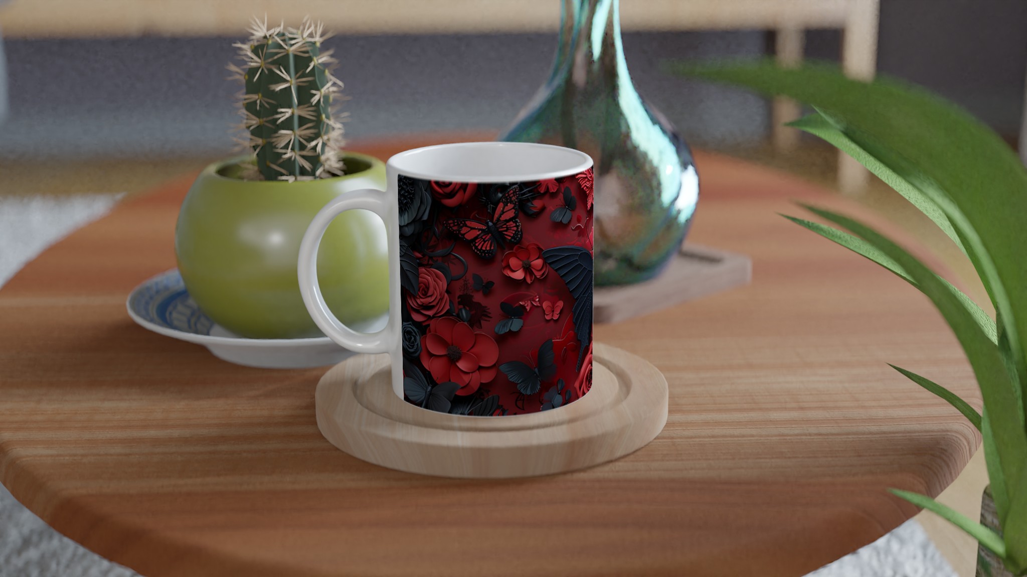 Den här stilrena keramiska muggen blir snabbt en vardagsfavorit. Kliv in i en värld av gotisk romantik varje gång du tar en klunk. Med en förtrollande design av djupröda rosor, svarta blommor och eleganta fjärilar, förvandlar denna mugg din fikapaus till en stund av mörk skönhet. Perfekt för morgonkaffet, kvällens varma choklad eller när du bara vill njuta av en kopp te. Den blanka vita ytan gör att trycken framhävs med klara och levande färger, som håller sig fina även efter många turer i mikron och diskmaskinen.