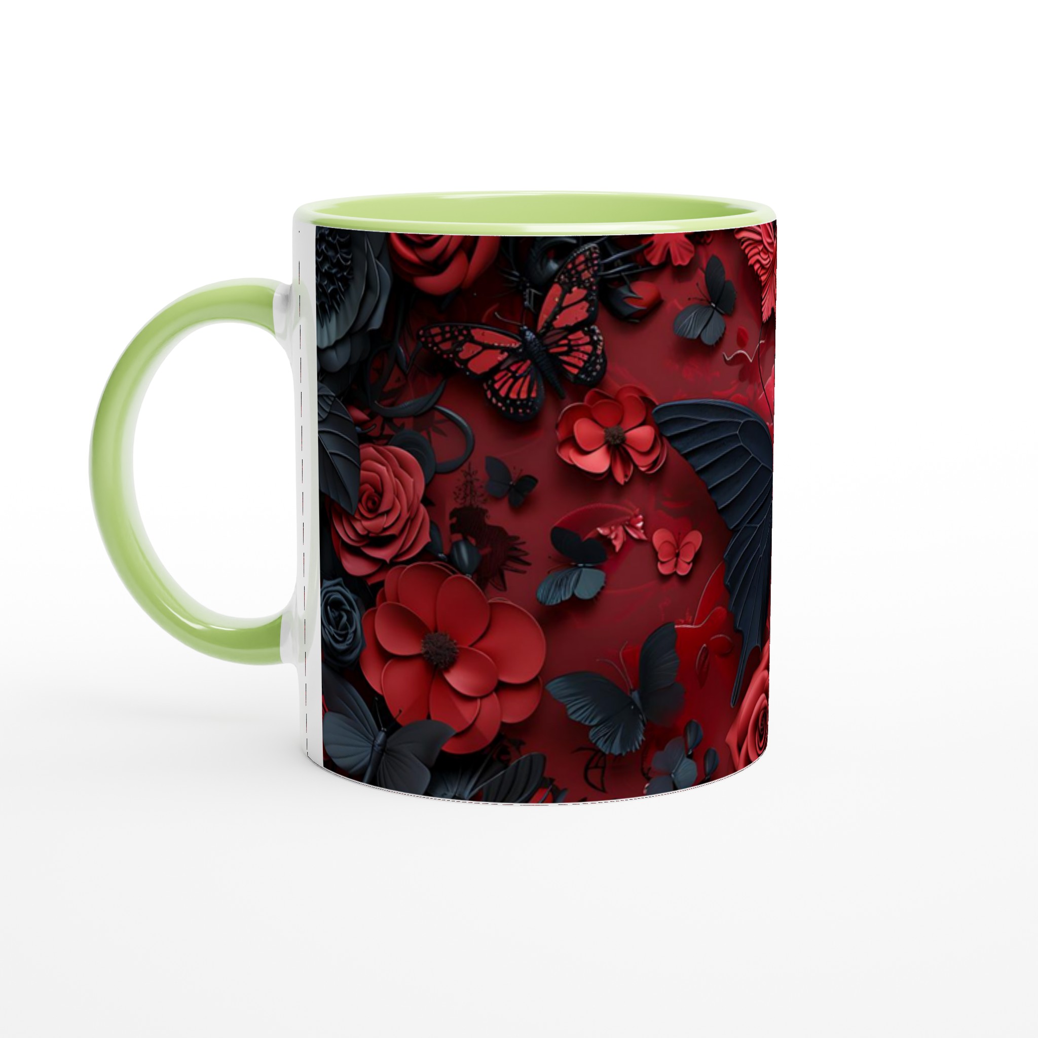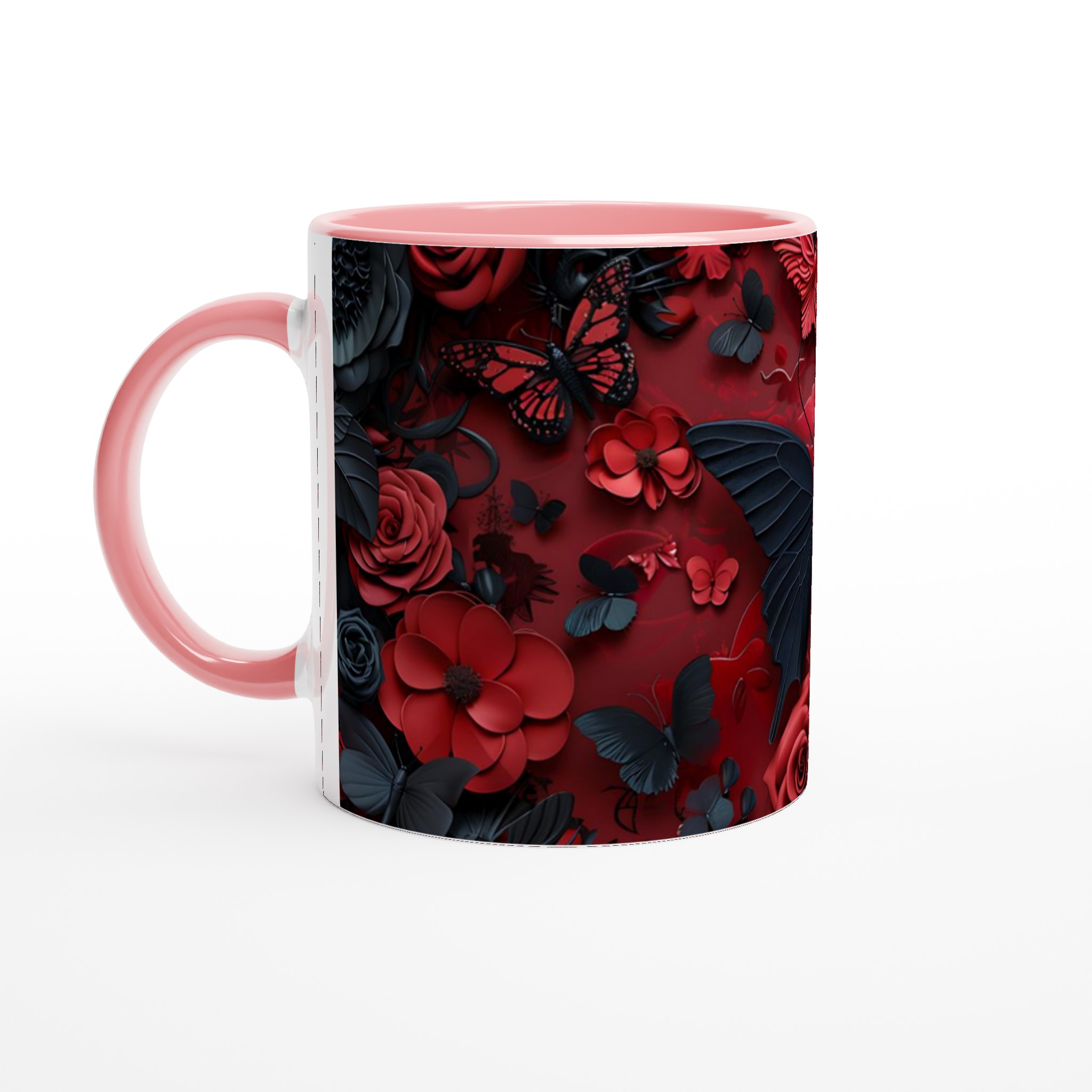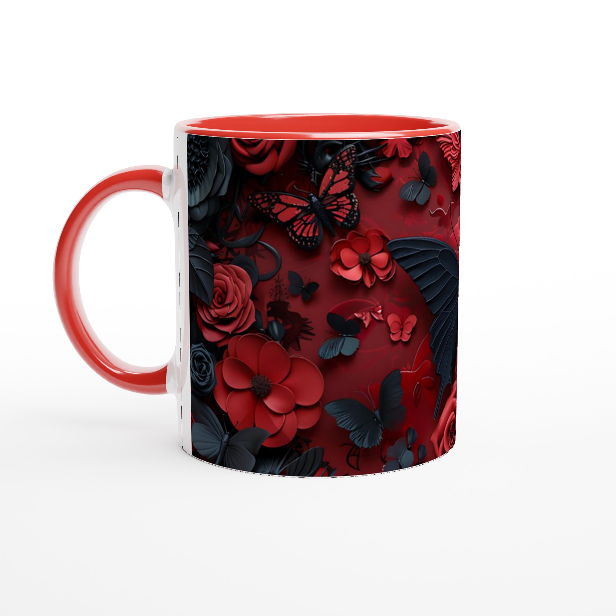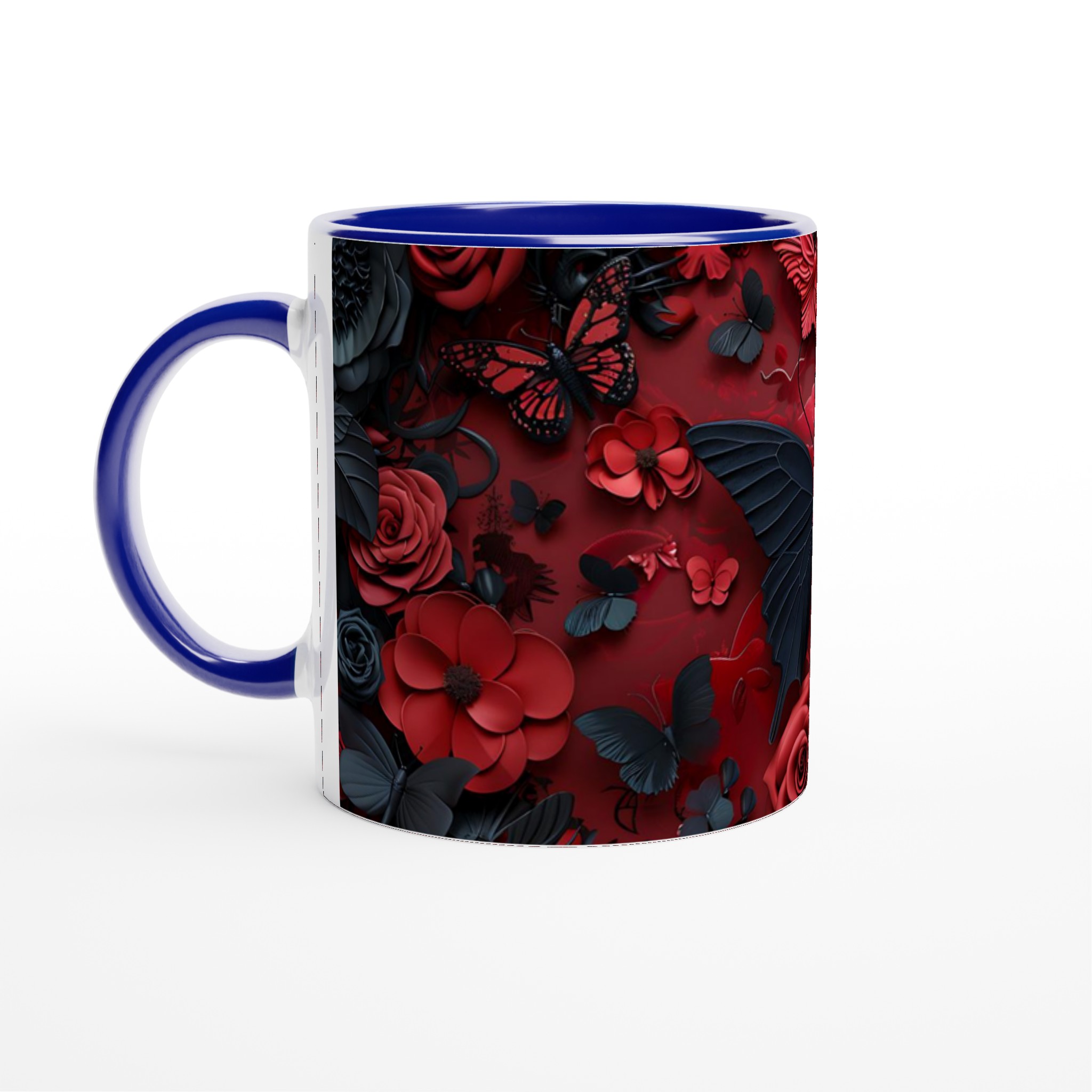 Den här stilrena keramiska muggen blir snabbt en vardagsfavorit. Kliv in i en värld av gotisk romantik varje gång du tar en klunk. Med en förtrollande design av djupröda rosor, svarta blommor och eleganta fjärilar, förvandlar denna mugg din fikapaus till en stund av mörk skönhet. Perfekt för morgonkaffet, kvällens varma choklad eller när du bara vill njuta av en kopp te. Den blanka vita ytan gör att trycken framhävs med klara och levande färger, som håller sig fina även efter många turer i mikron och diskmaskinen.