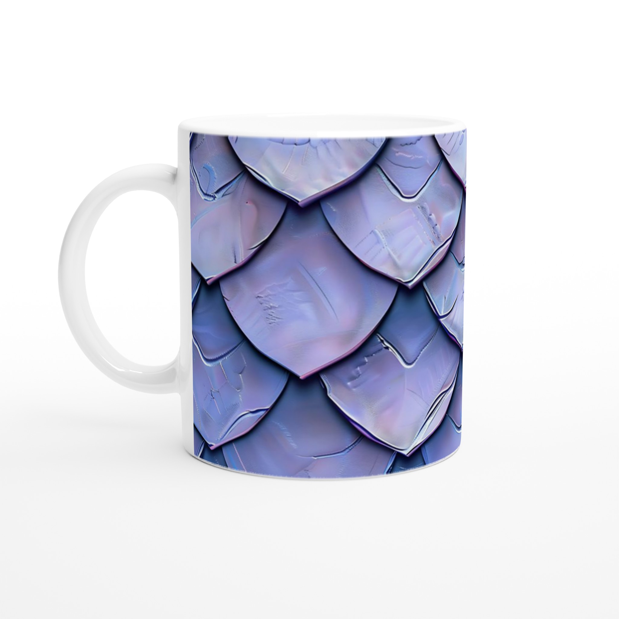 Inspirerad av mystiska drakfjäll i skiftande nyanser av lila och blått, erbjuder denna mugg en touch av fantasy till din dag. Den blanka vita ytan ger ett skarpt och levande tryck som verkligen sticker ut, oavsett om det är en personlig design, ett roligt citat eller en present till någon du tycker om.