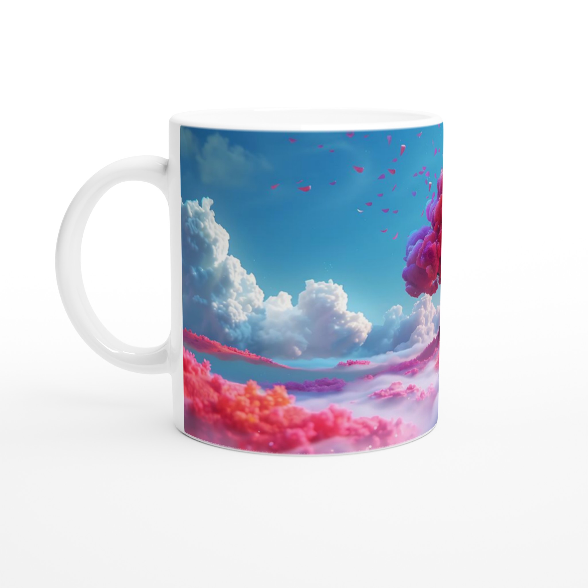 Väck dina drömmar till liv med varje klunk. Inspirerad av en värld där rosa fluffiga träd möter en himmelsblå horisont, fångar denna mugg en känsla av lugn och magi. Oavsett om du föredrar den klassiska vita eller vill lägga till en touch av färg med alternativ som Ceramic Yellow, Pink, Green, Red, Black eller Blue, kan du skräddarsy din mugg för att matcha din unika stil. Varje färgval förstärker ditt motiv och förvandlar din dryckesupplevelse till en daglig njutning.