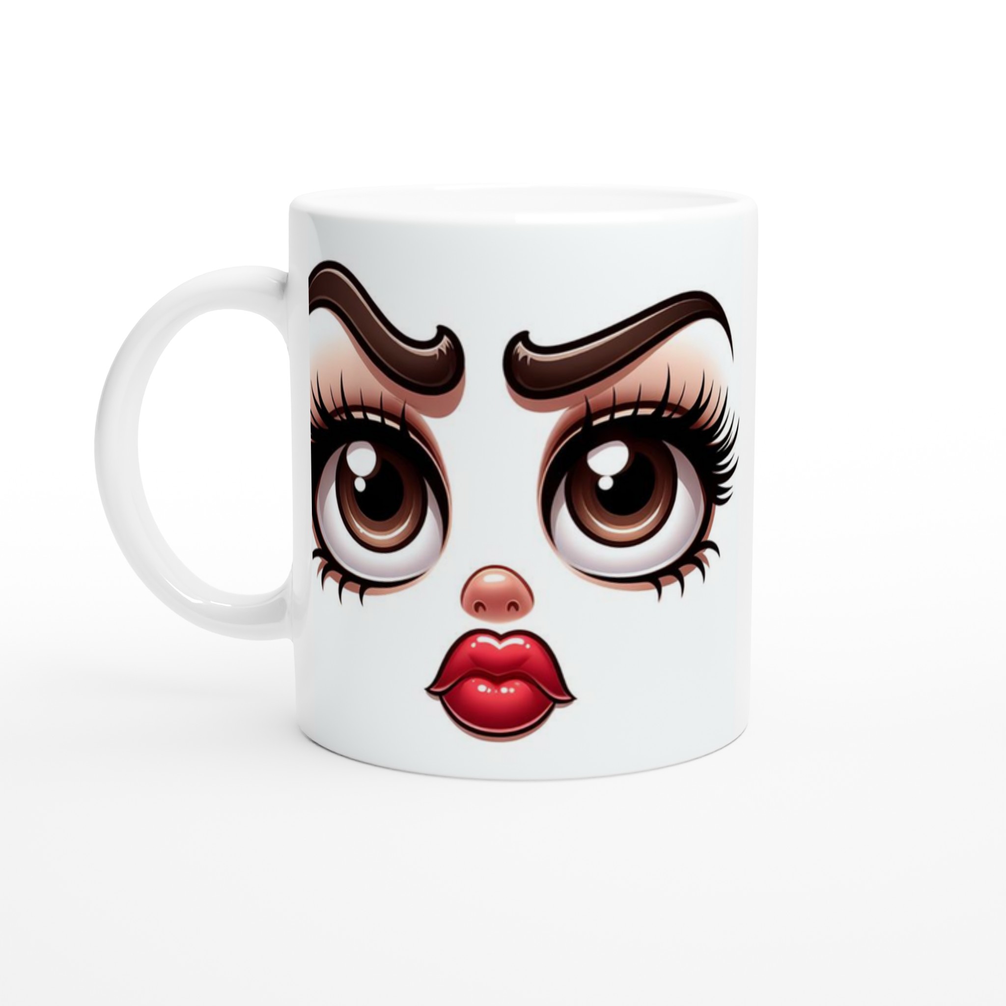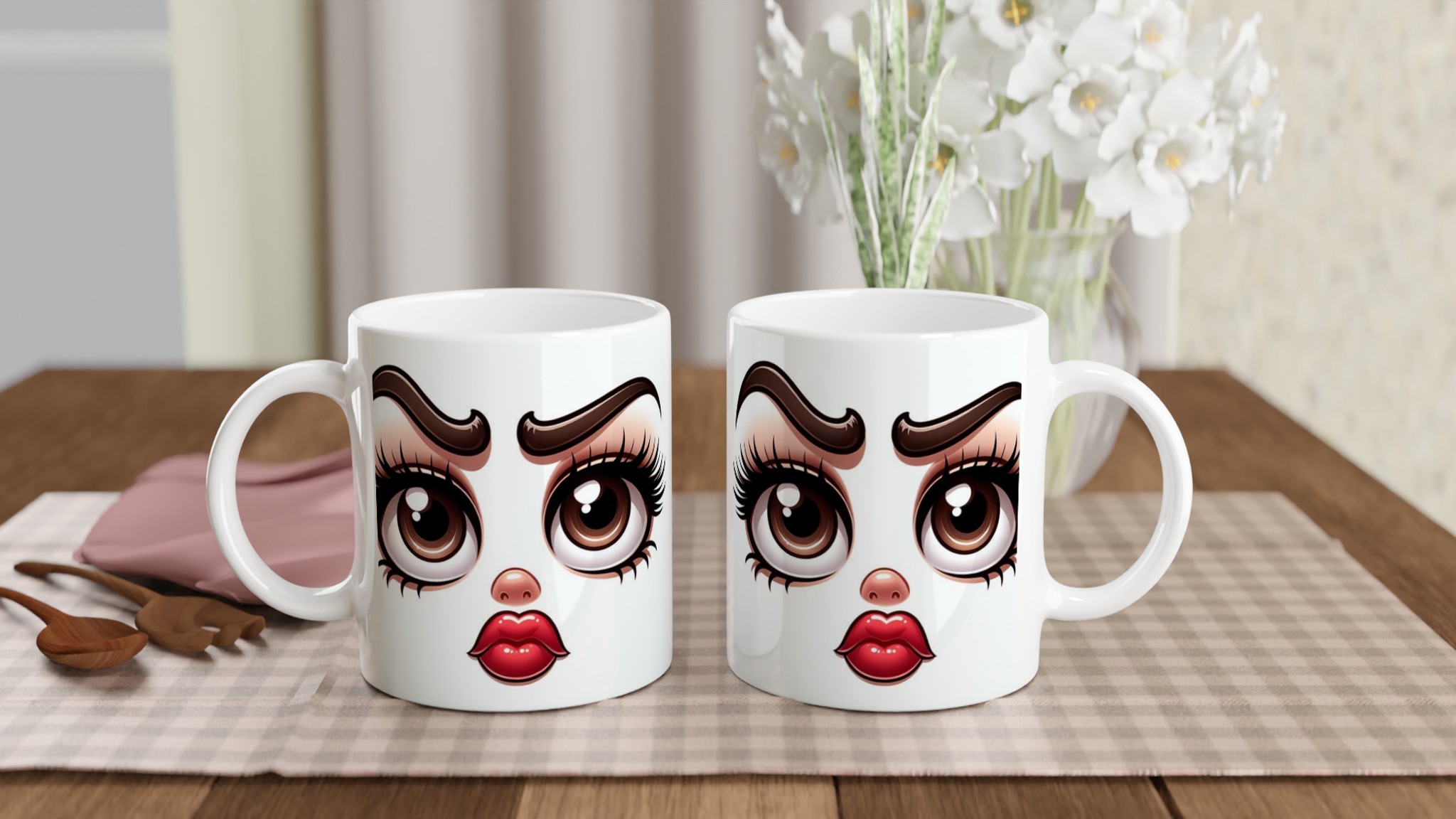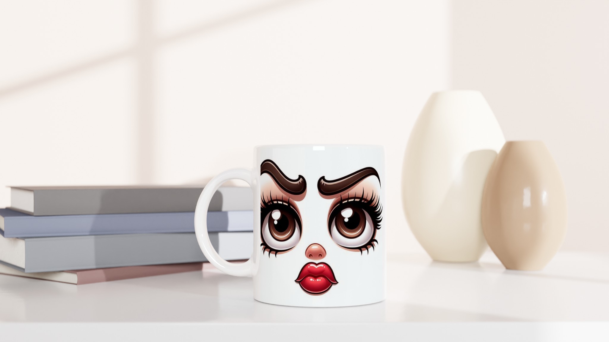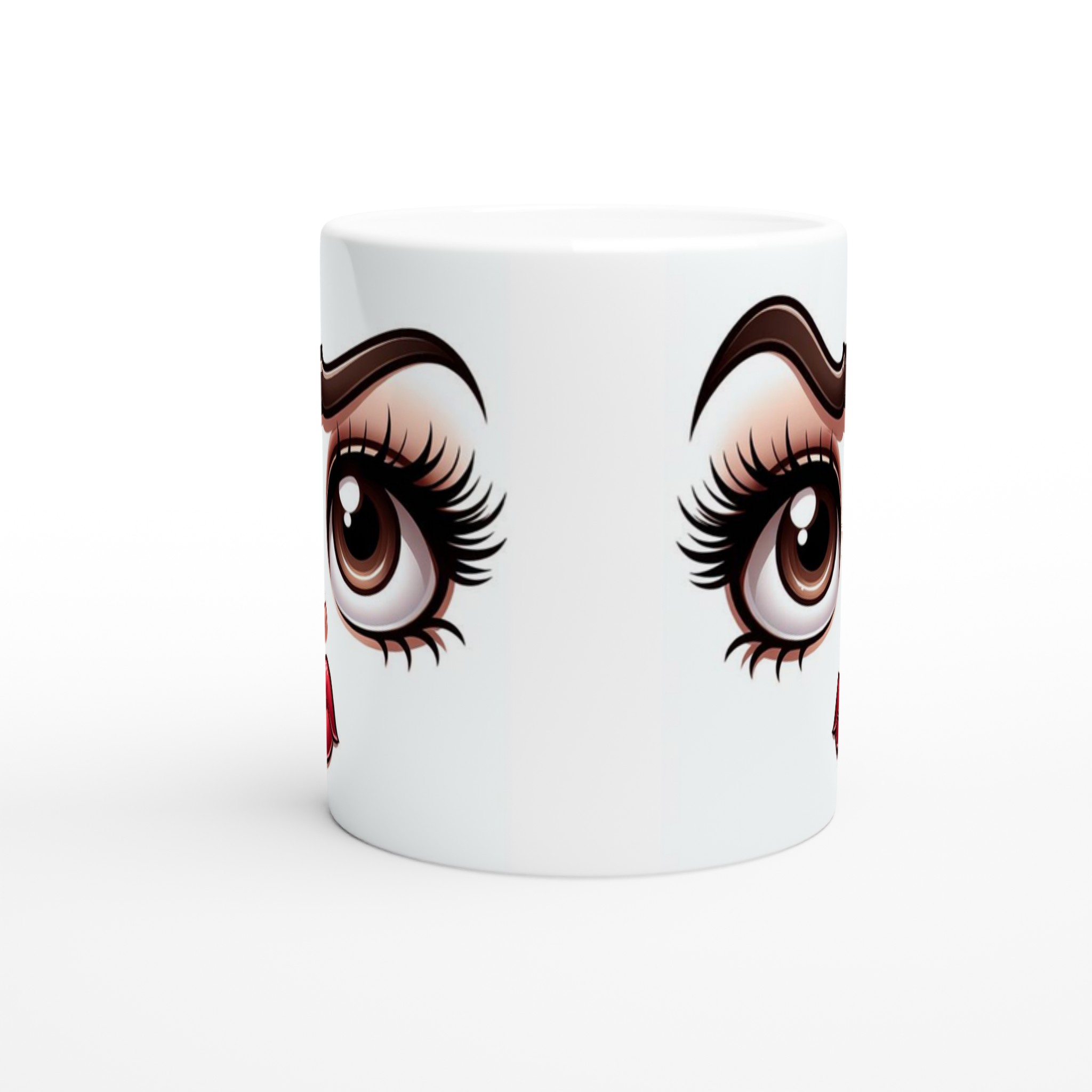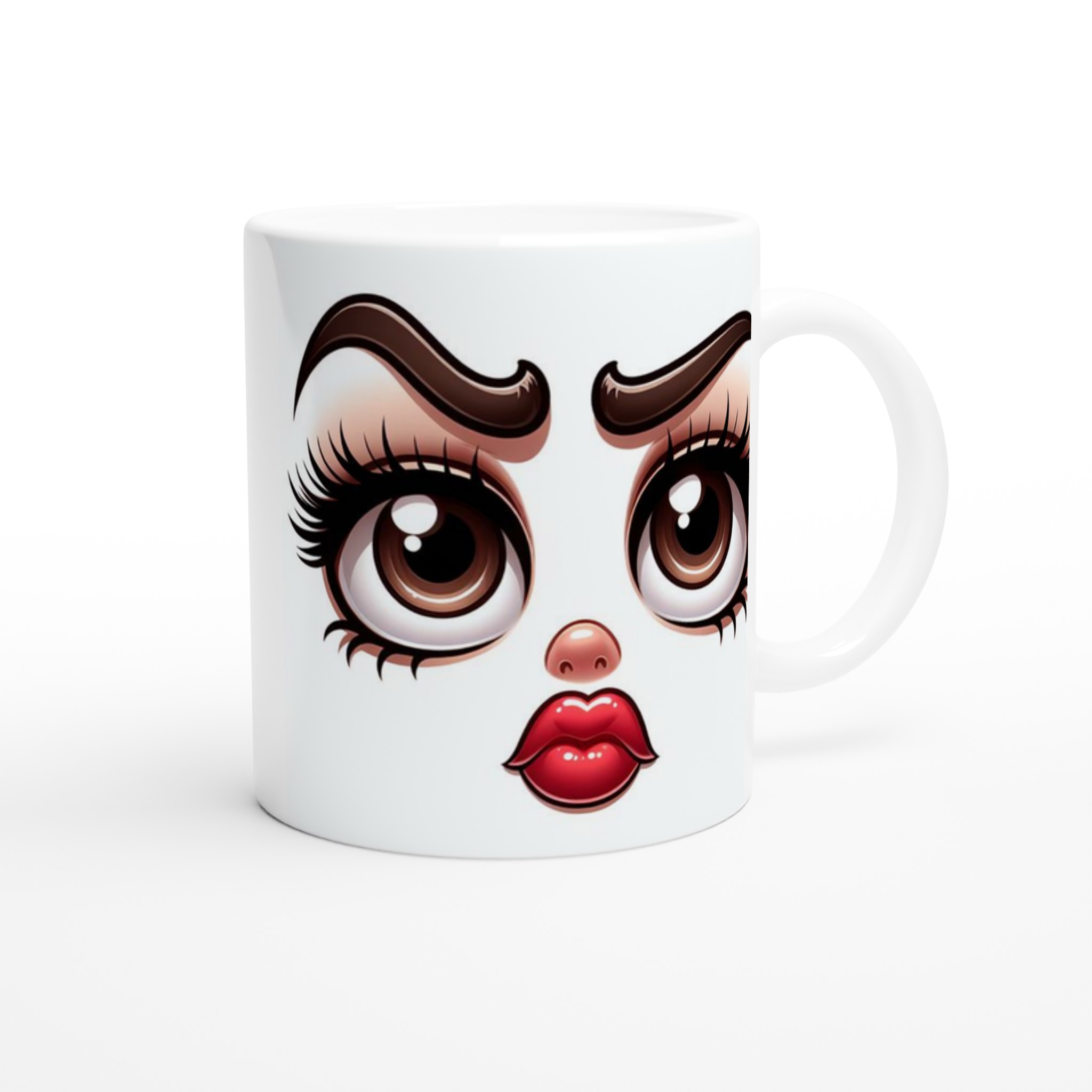 Denna charmiga mugg fångar blicken med ett förföriskt ansikte, stora uttrycksfulla ögon, långa ögonfransar, och putande röda läppar som andas lekfull glamour. Den blanka vita ytan ger ett skarpt och levande tryck som verkligen sticker ut, oavsett om det är en personlig design, ett roligt citat eller en present till någon du tycker om.
