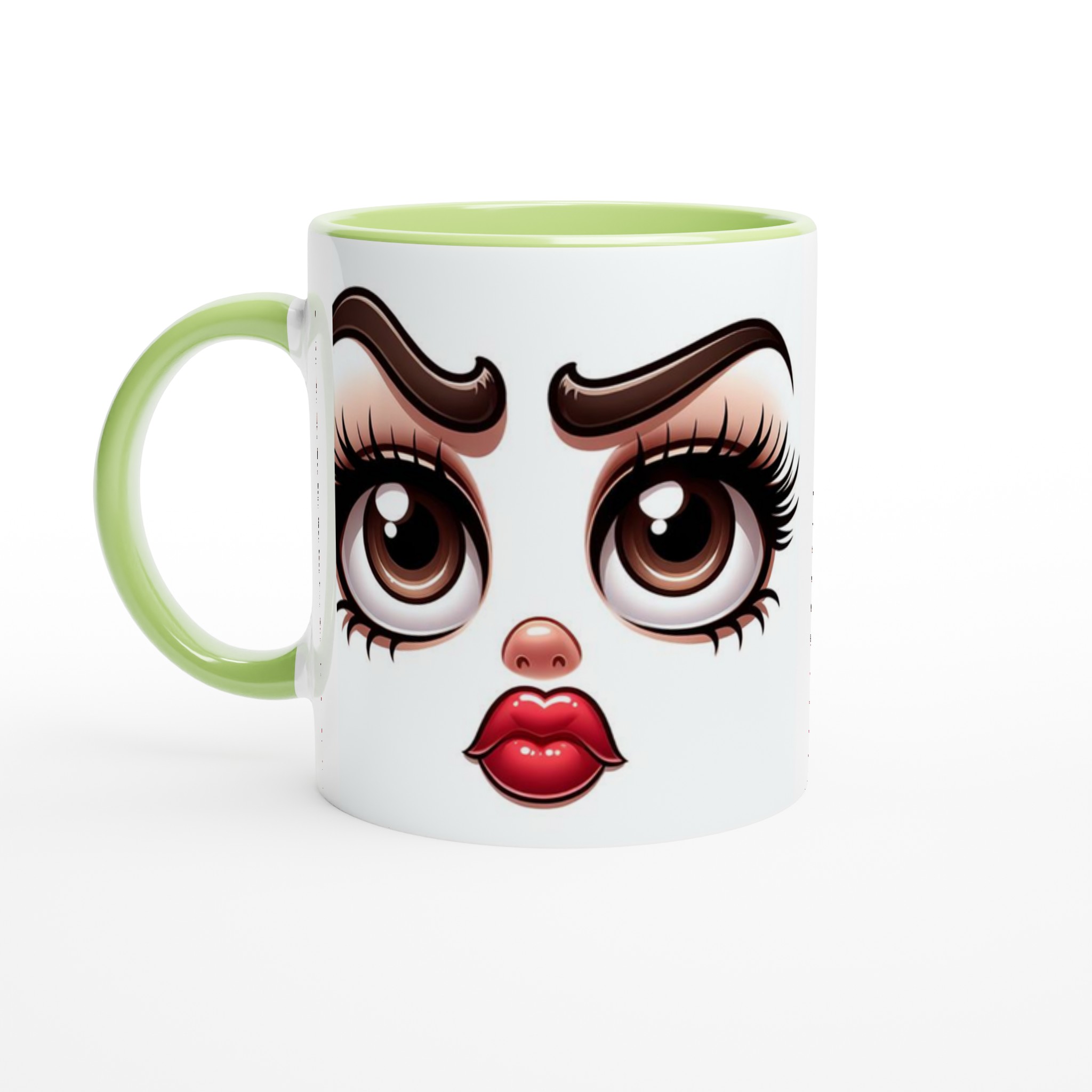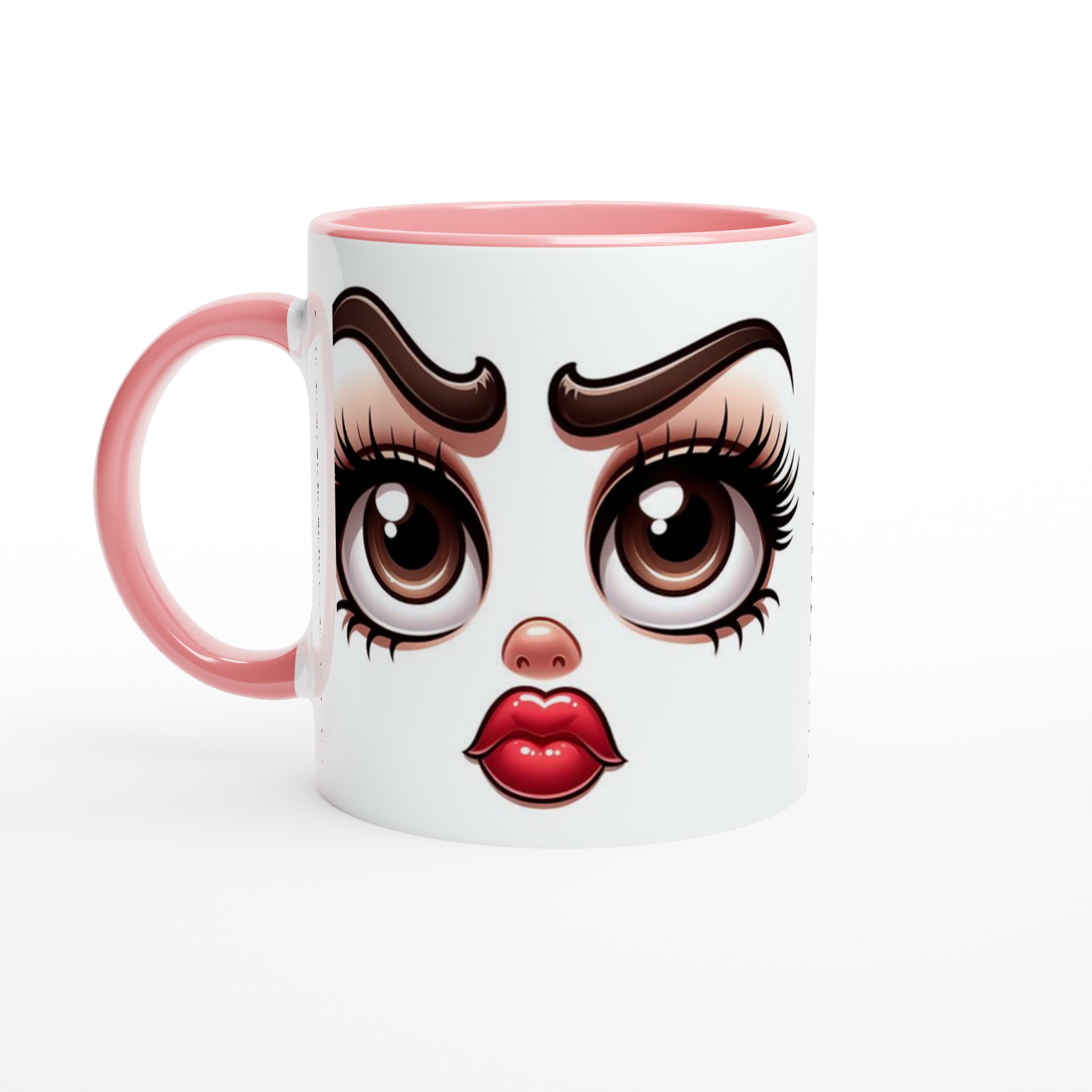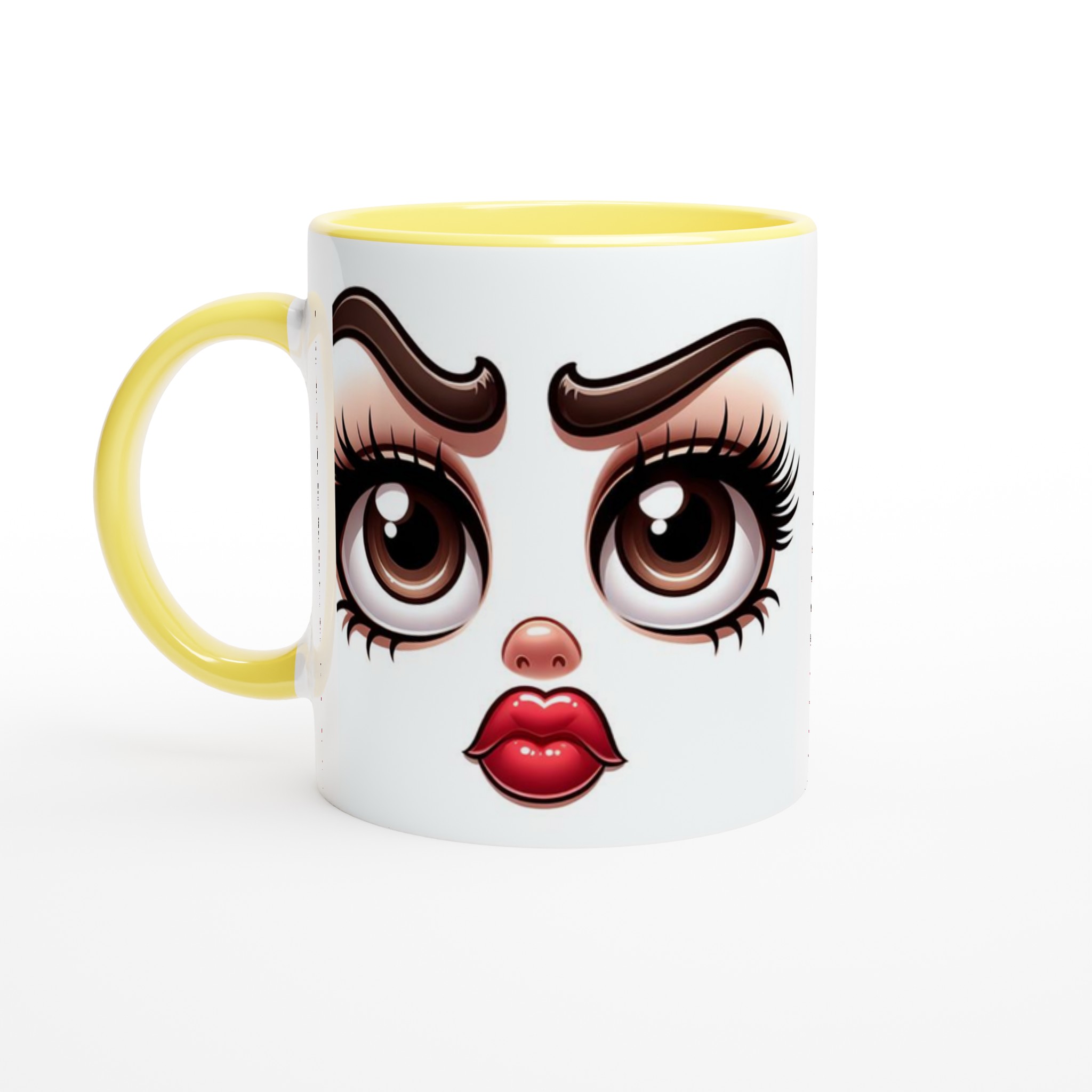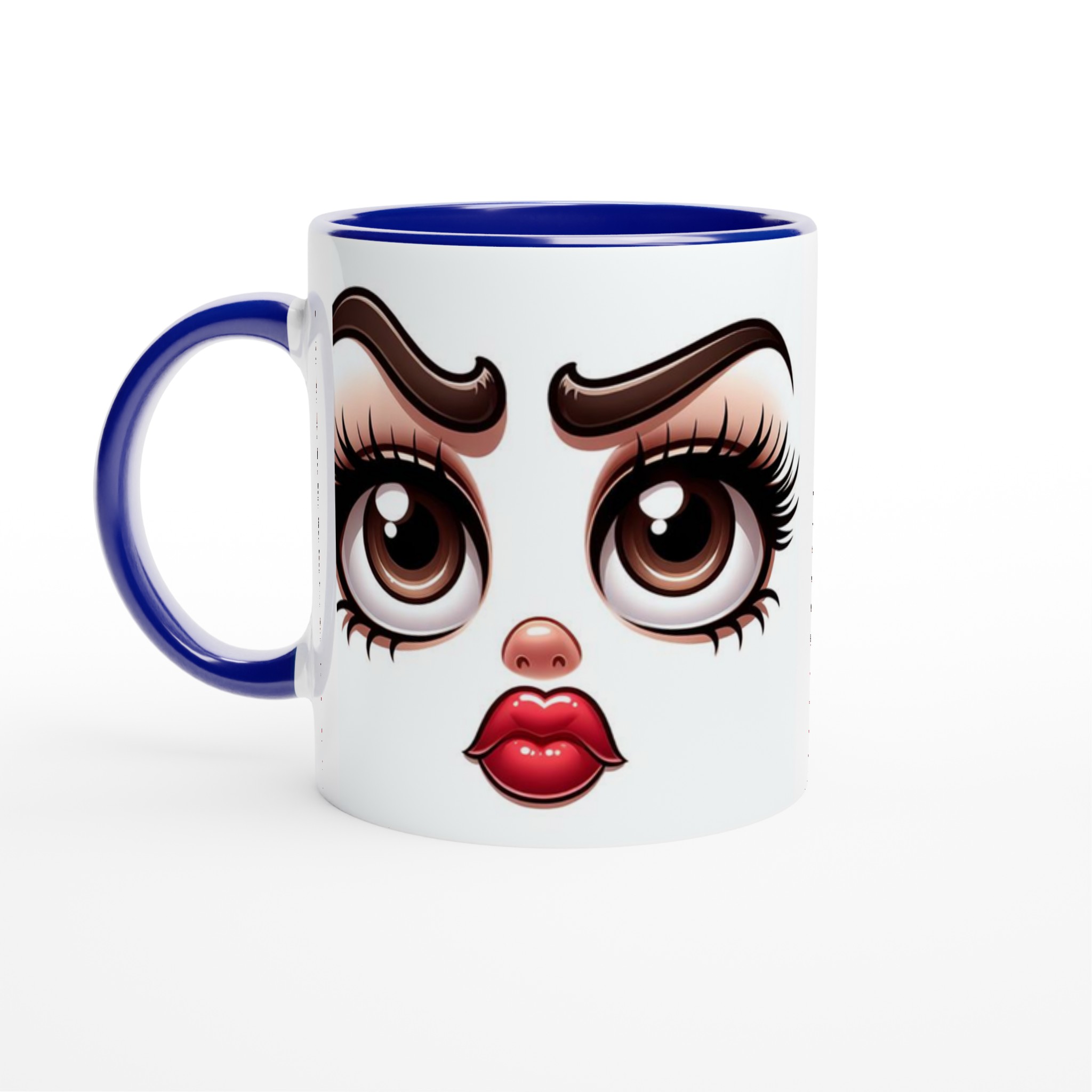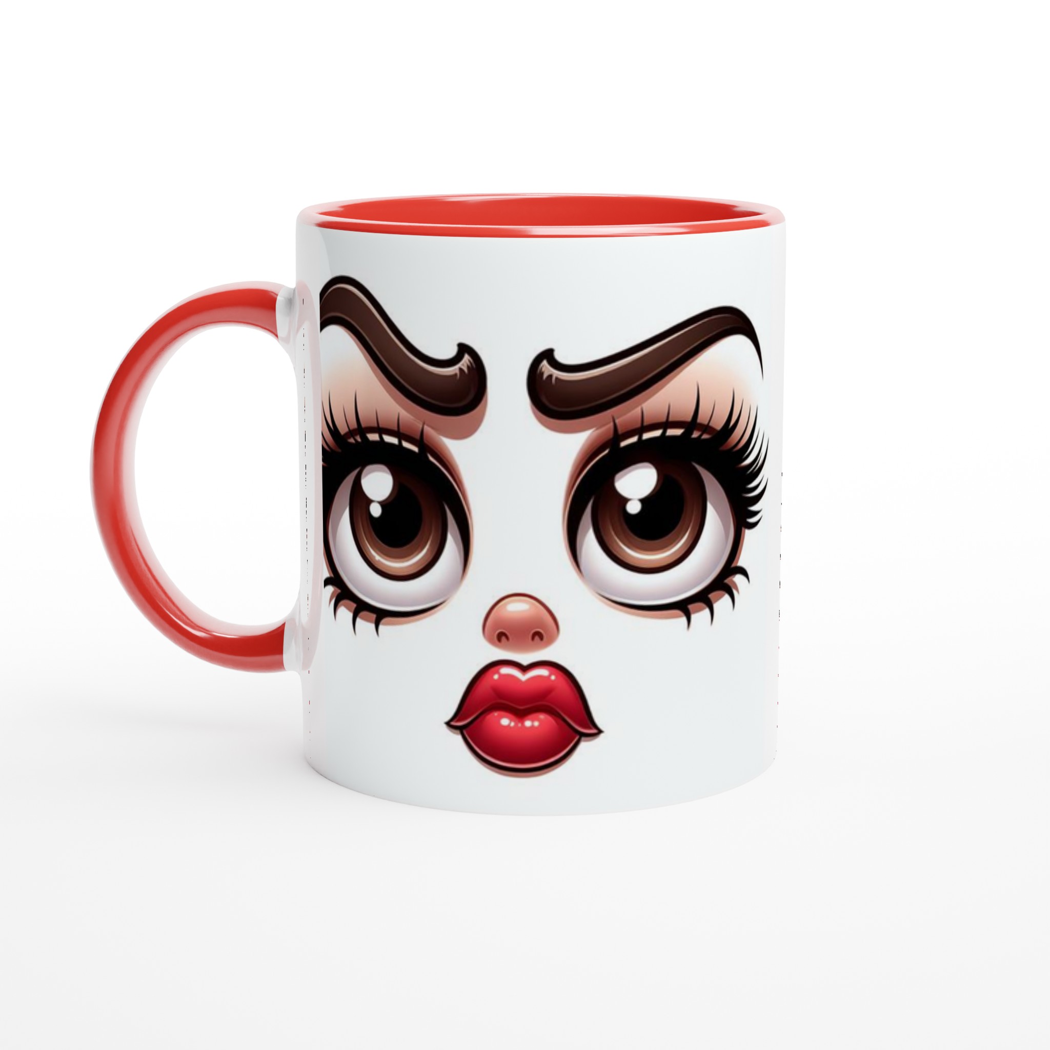 Denna charmiga mugg fångar blicken med ett förföriskt ansikte, stora uttrycksfulla ögon, långa ögonfransar, och putande röda läppar som andas lekfull glamour. Den blanka vita ytan ger ett skarpt och levande tryck som verkligen sticker ut, oavsett om det är en personlig design, ett roligt citat eller en present till någon du tycker om.
