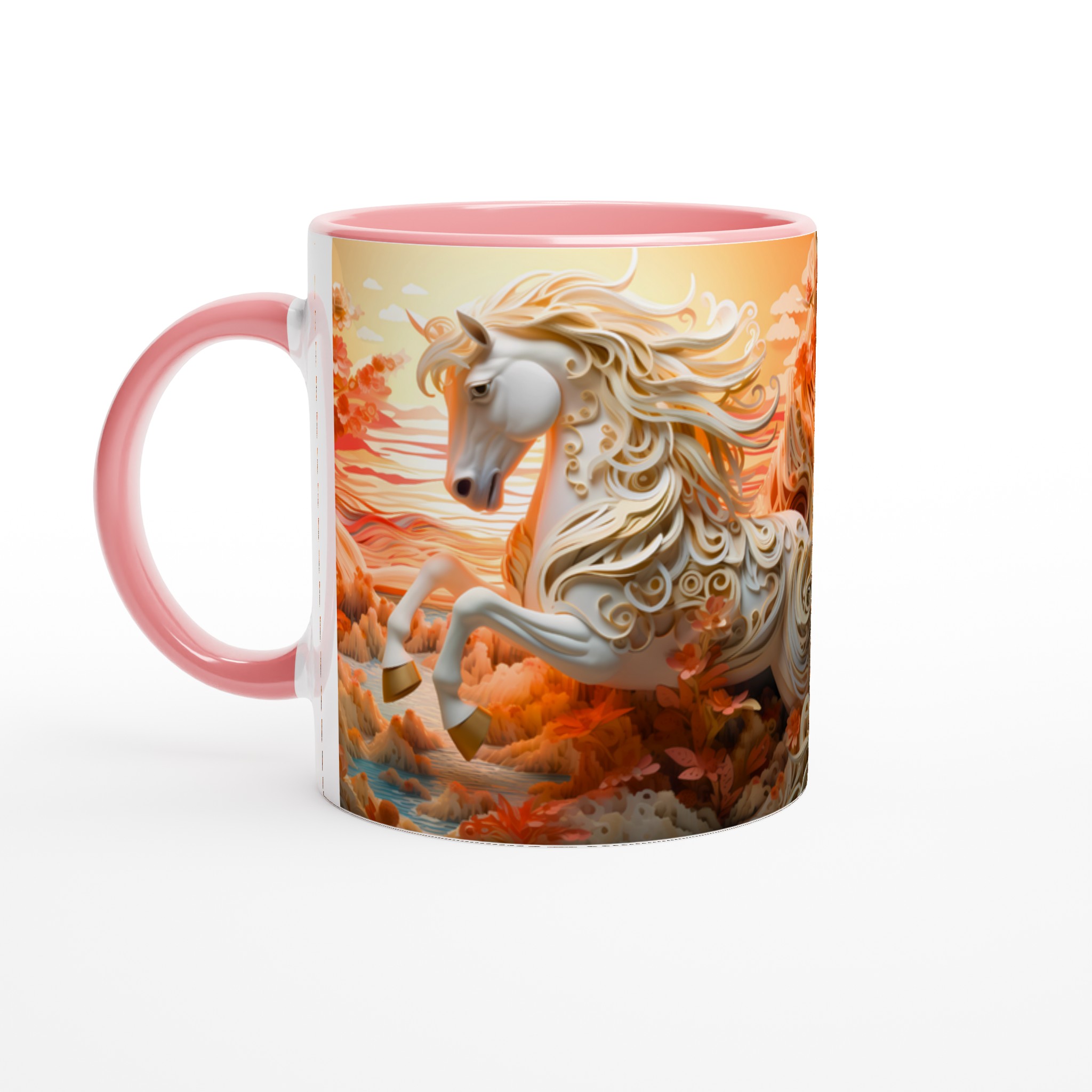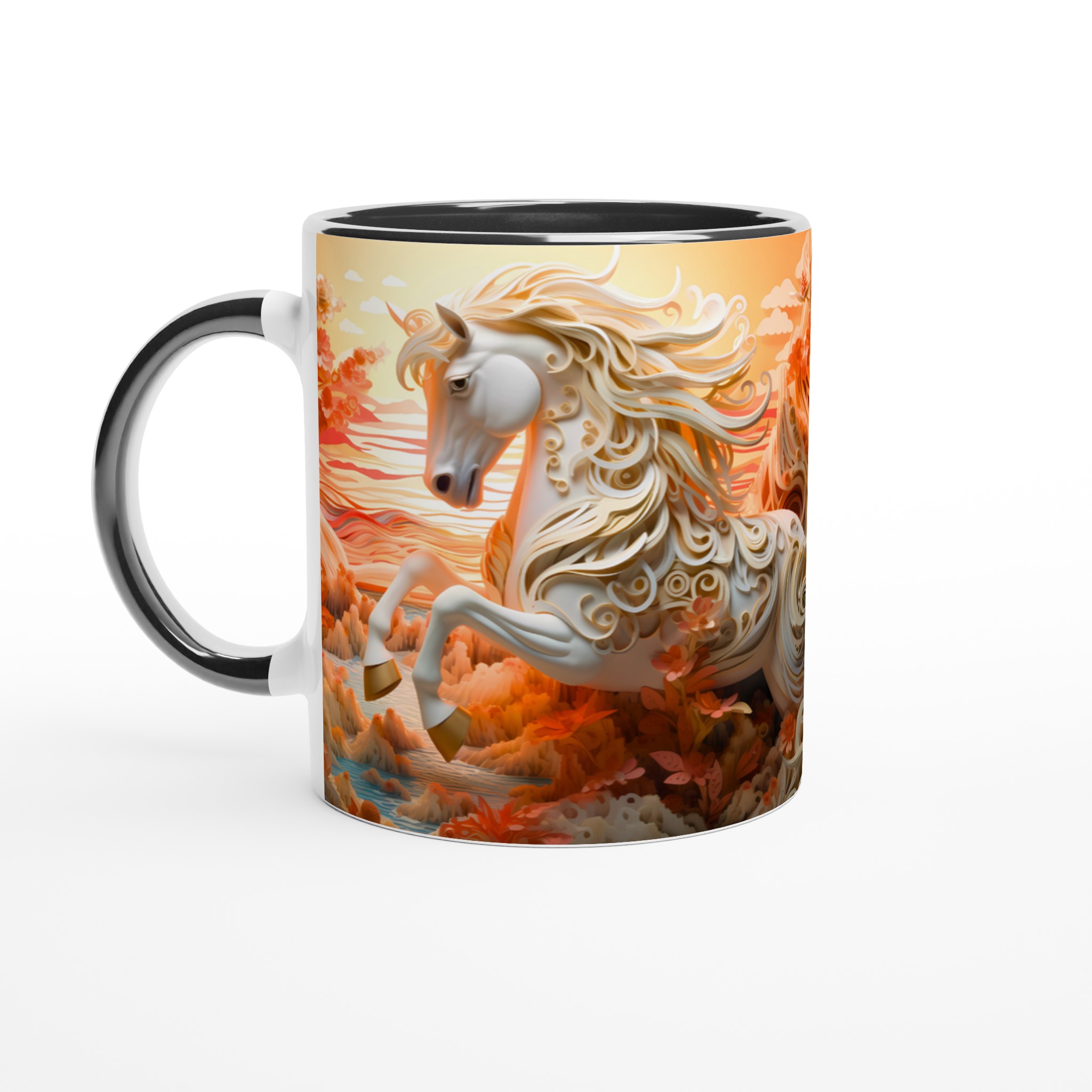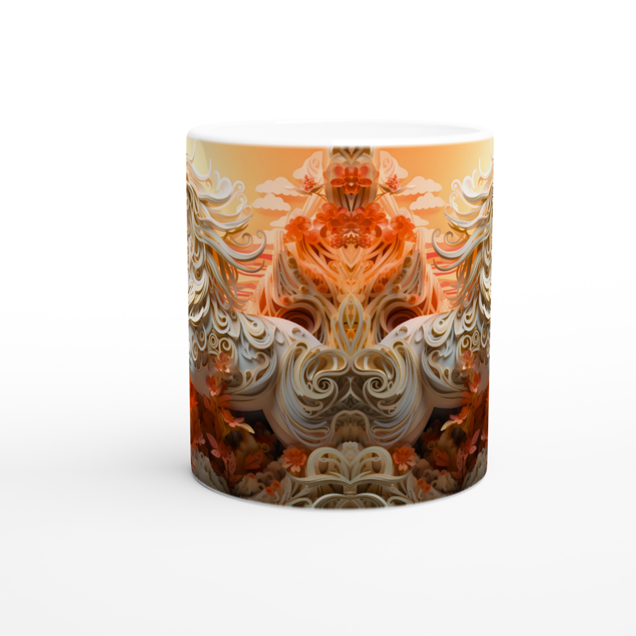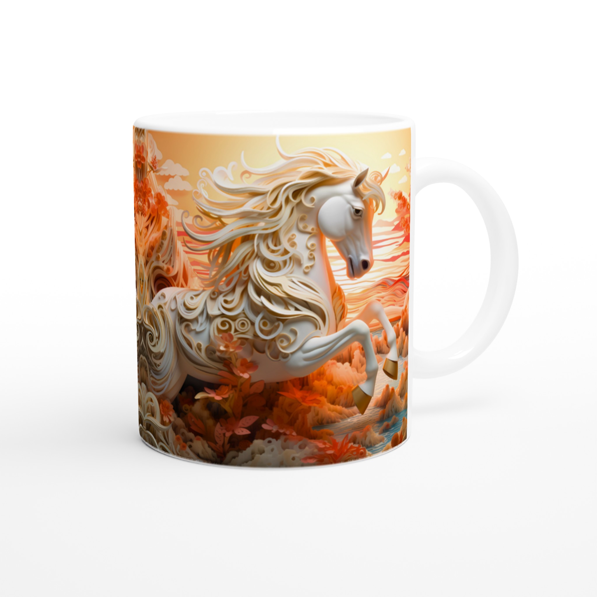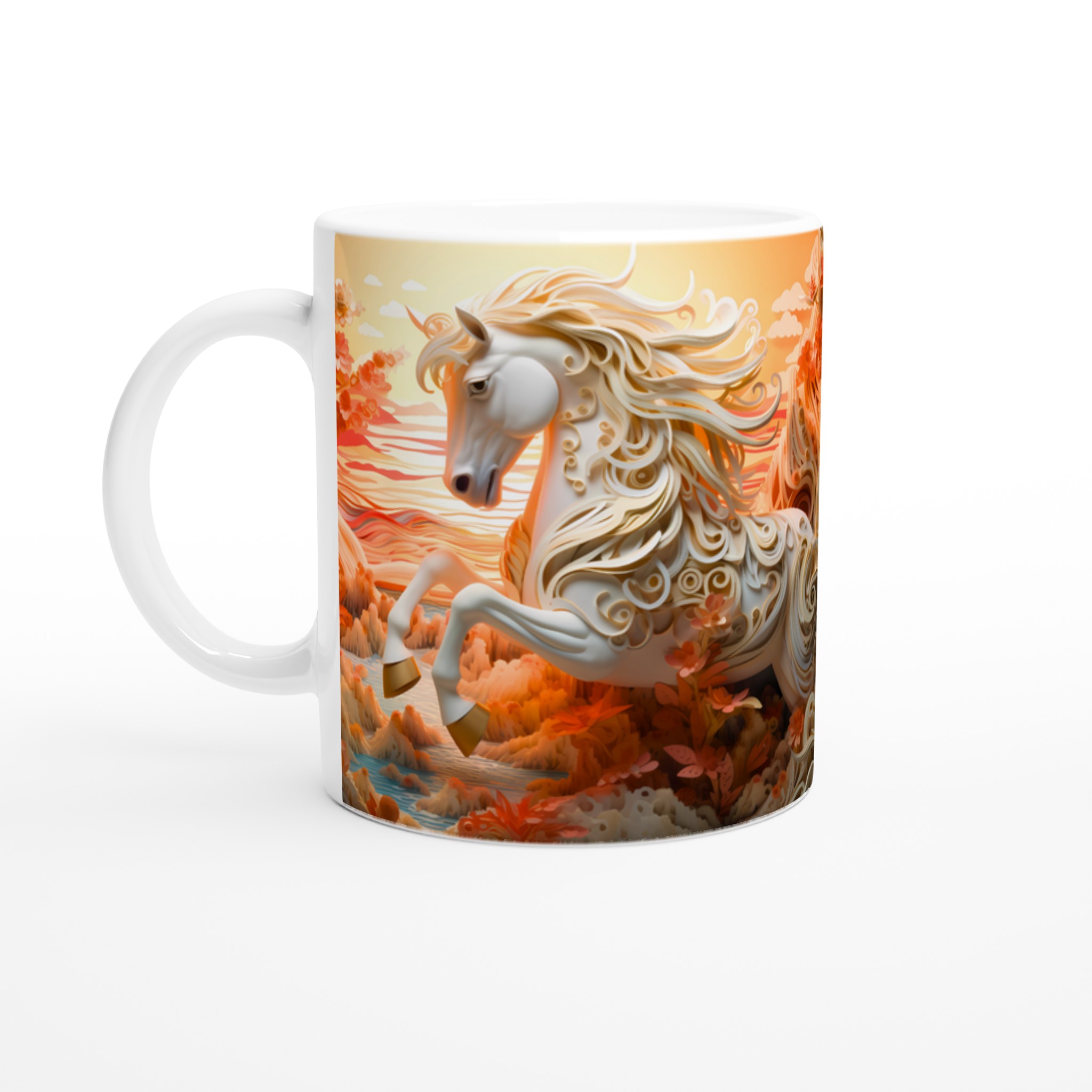 Stig in i en värld av fantasi varje gång du tar en klunk med vår förtrollande Pegasus Keramikmugg. Inspirerad av bilden av majestätiska vita pegasusar som galopperar genom ett surrealistiskt, drömskt landskap av orangea och korallfärgade nyanser, förvandlar denna mugg din fikastund till ett magiskt ögonblick. Den blanka vita ytan framhäver illustrationens eteriska skönhet med klara och levande färger, och håller sig lika fin även efter otaliga turer i mikron och diskmaskinen.