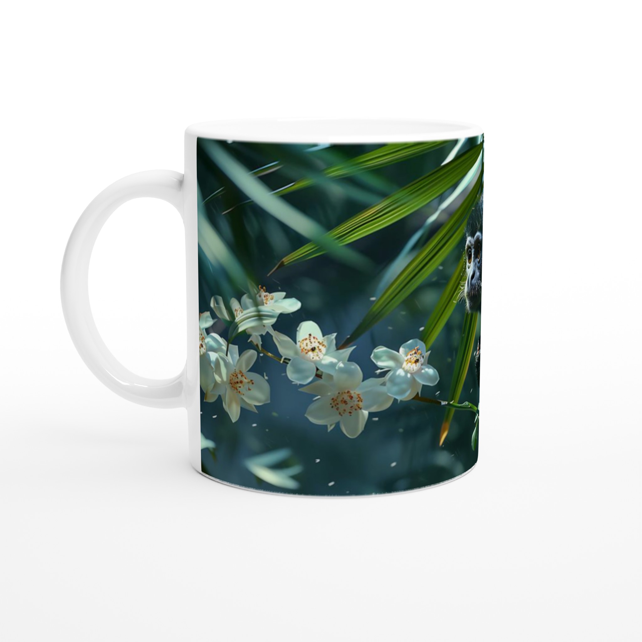 Fånga magin från djungelns hjärta med vår ”Förlorad i Djungeln” mugg. Denna unika mugg har en söt och nyfiken apa omgiven av frodiga gröna blad och delikata vita blommor, perfekt för naturälskaren eller den som söker en touch av exotisk lugn i sin vardag. Den blanka vita ytan ger ett skarpt och levande tryck som verkligen sticker ut, oavsett om det är en personlig design, ett roligt citat eller en present till någon du tycker om.
