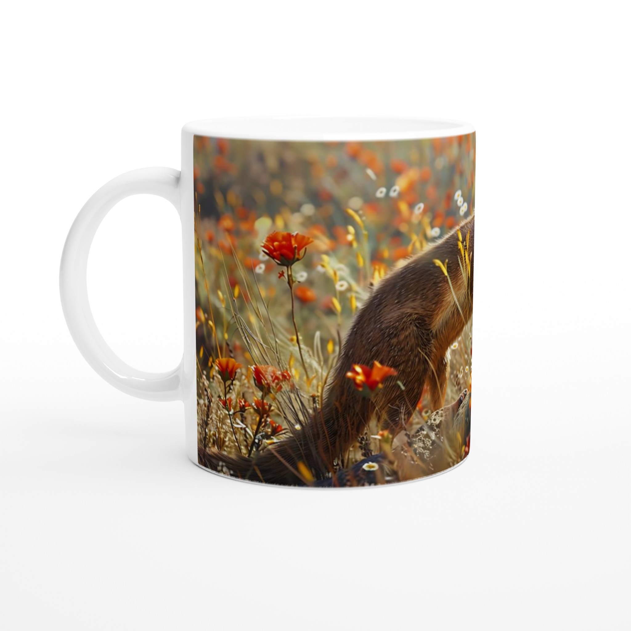 Denna exklusiva mugg fångar den fängslande skönheten hos ett smidigt djur i dess naturliga habitat, omgivet av sprakande orangea blommor och ett varmt, drömskt ljus. Den blanka vita ytan ger ett skarpt och levande tryck som verkligen sticker ut, oavsett om det är en personlig design, ett roligt citat eller en present till någon du tycker om.