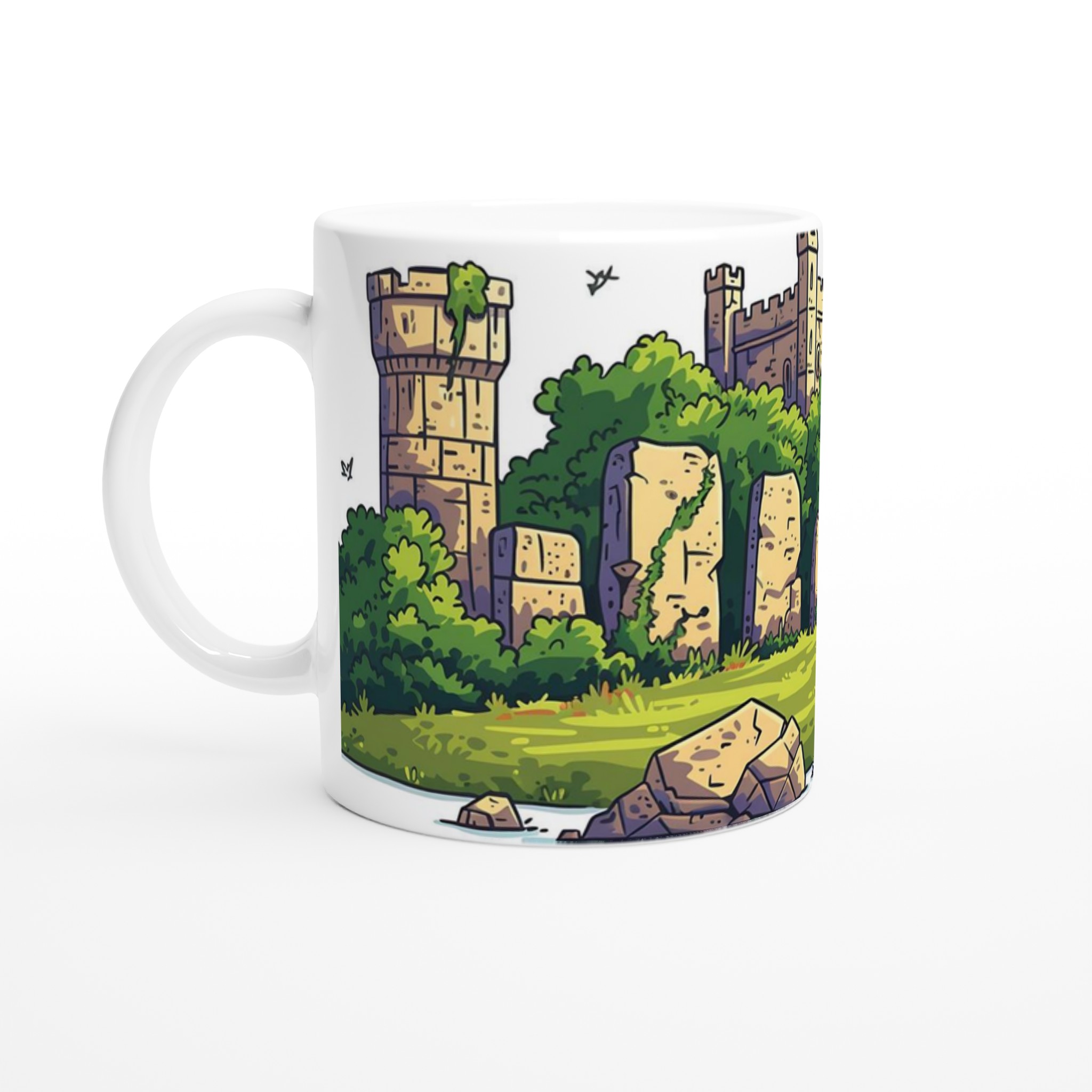 Föreställ dig att ta en klunk kaffe medan du blickar ut över det mystiska förlorade kungariket, omgivet av lummiga träd och majestätiska slottstorn. Denna design fångar en känsla av äventyr och forntida hemligheter, perfekt för den som älskar fantasy och unika motiv. Den blanka vita ytan ger ett skarpt och levande tryck som verkligen sticker ut, oavsett om det är en personlig design, ett roligt citat eller en present till någon du tycker om.