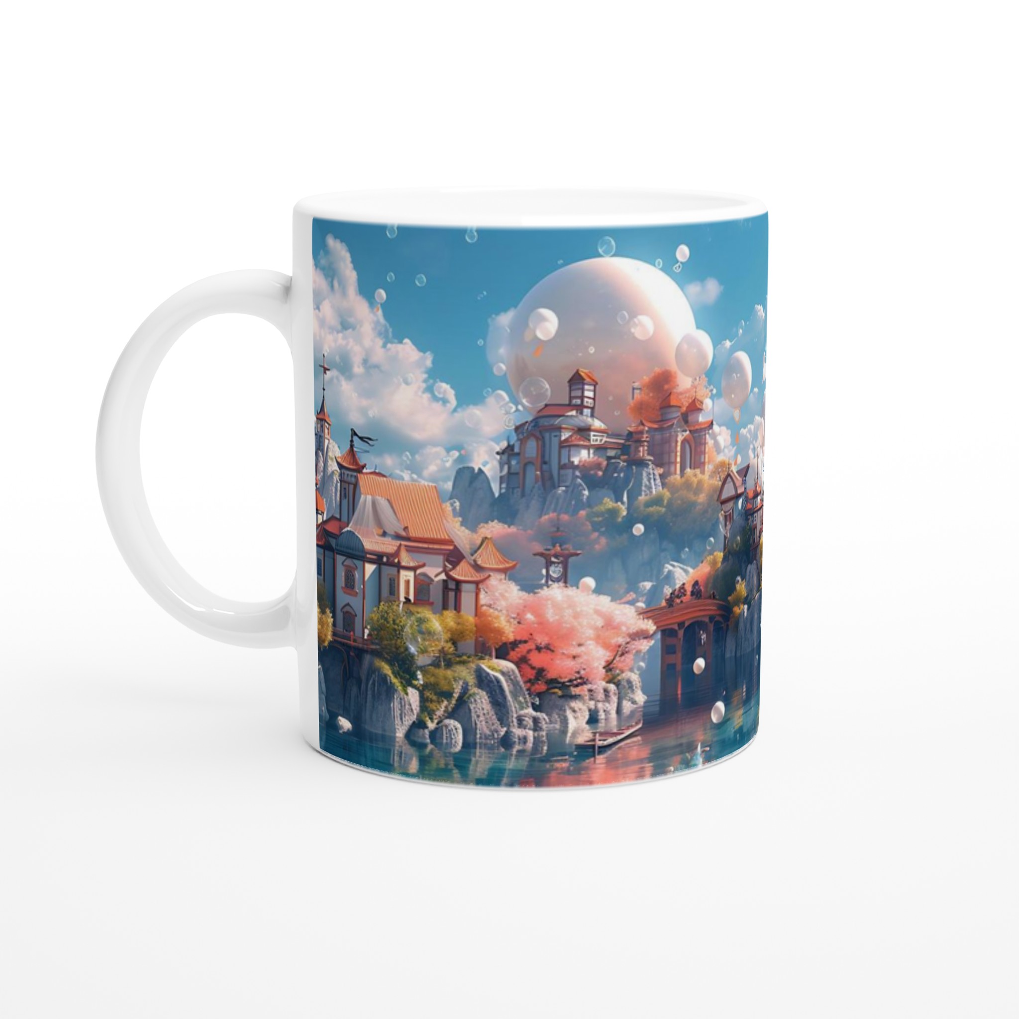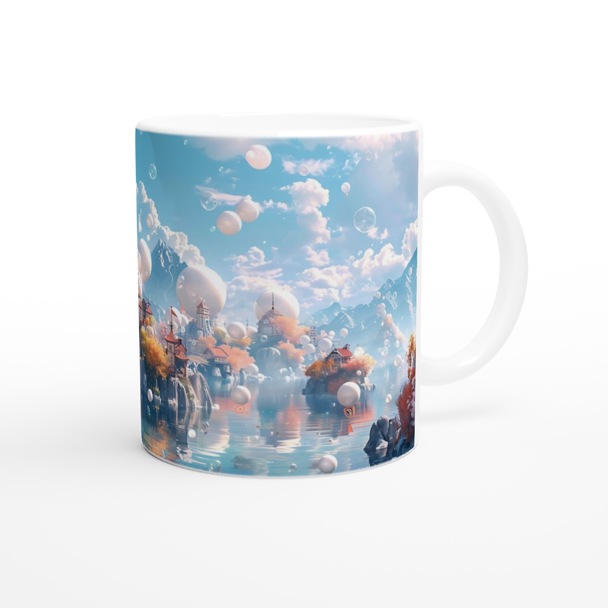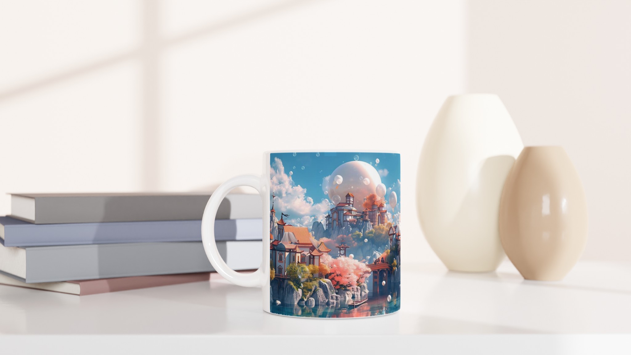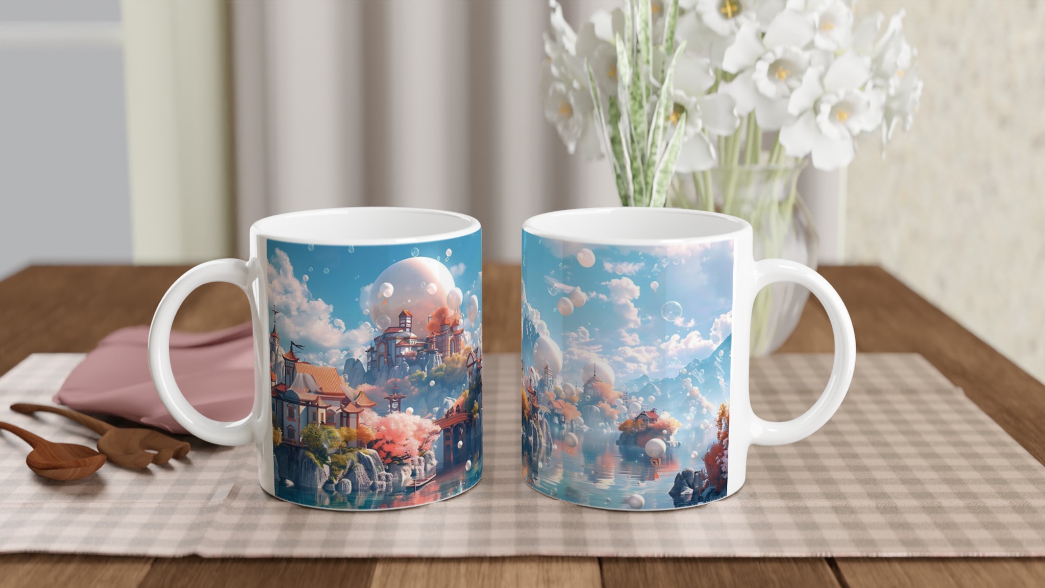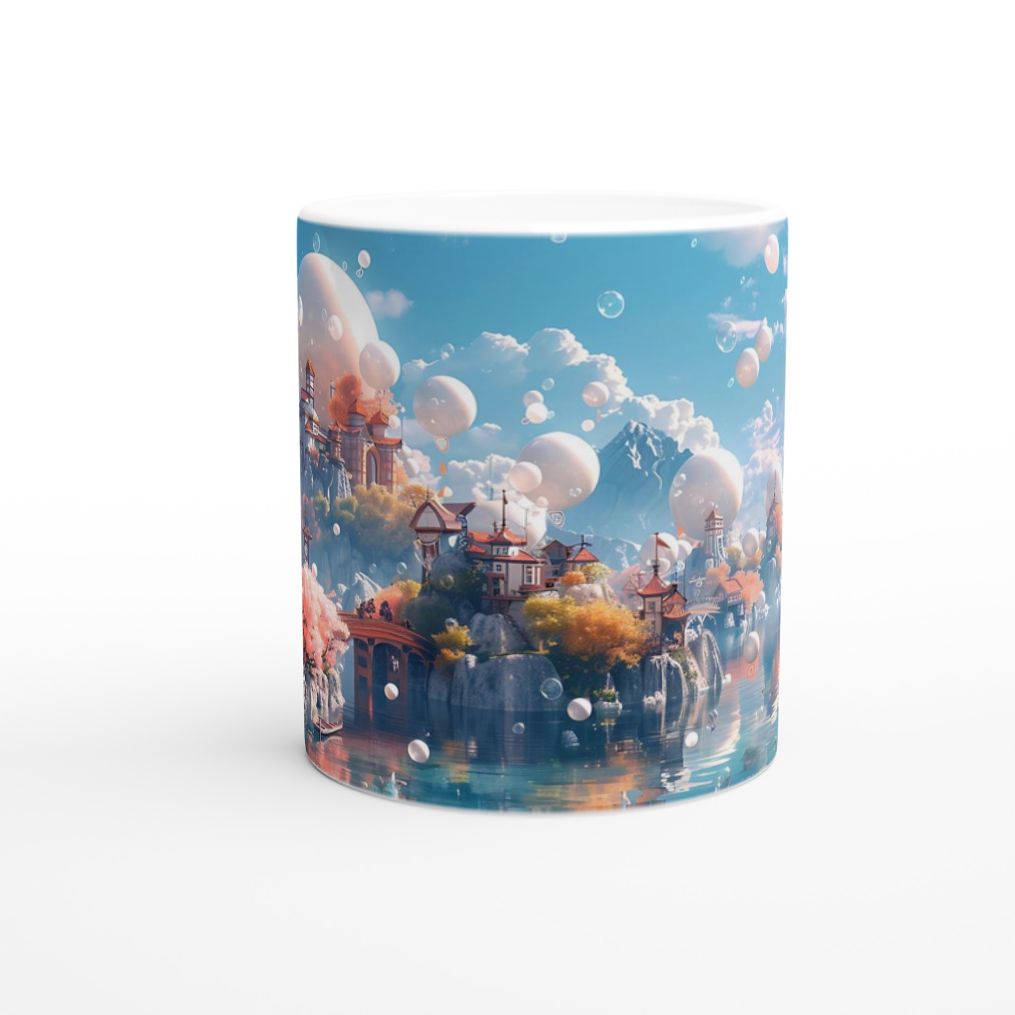Stig in i en värld av lugn och magi varje gång du lyfter denna förtrollande keramiska mugg. Med sitt motiv av en drömsk ö-värld med svävande bubblor och pastellfärger, blir denna mugg snabbt en vardagsfavorit. Den är perfekt för att omfamna morgonkaffet med en känsla av stillhet, avnjuta en kvällens varma choklad under stjärnorna eller bara njuta av en kopp te medan du låter tankarna vandra till avlägsna, fridfulla landskap.