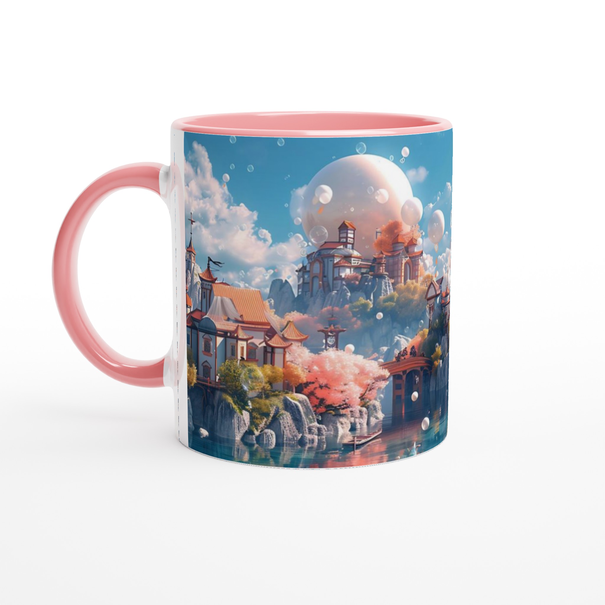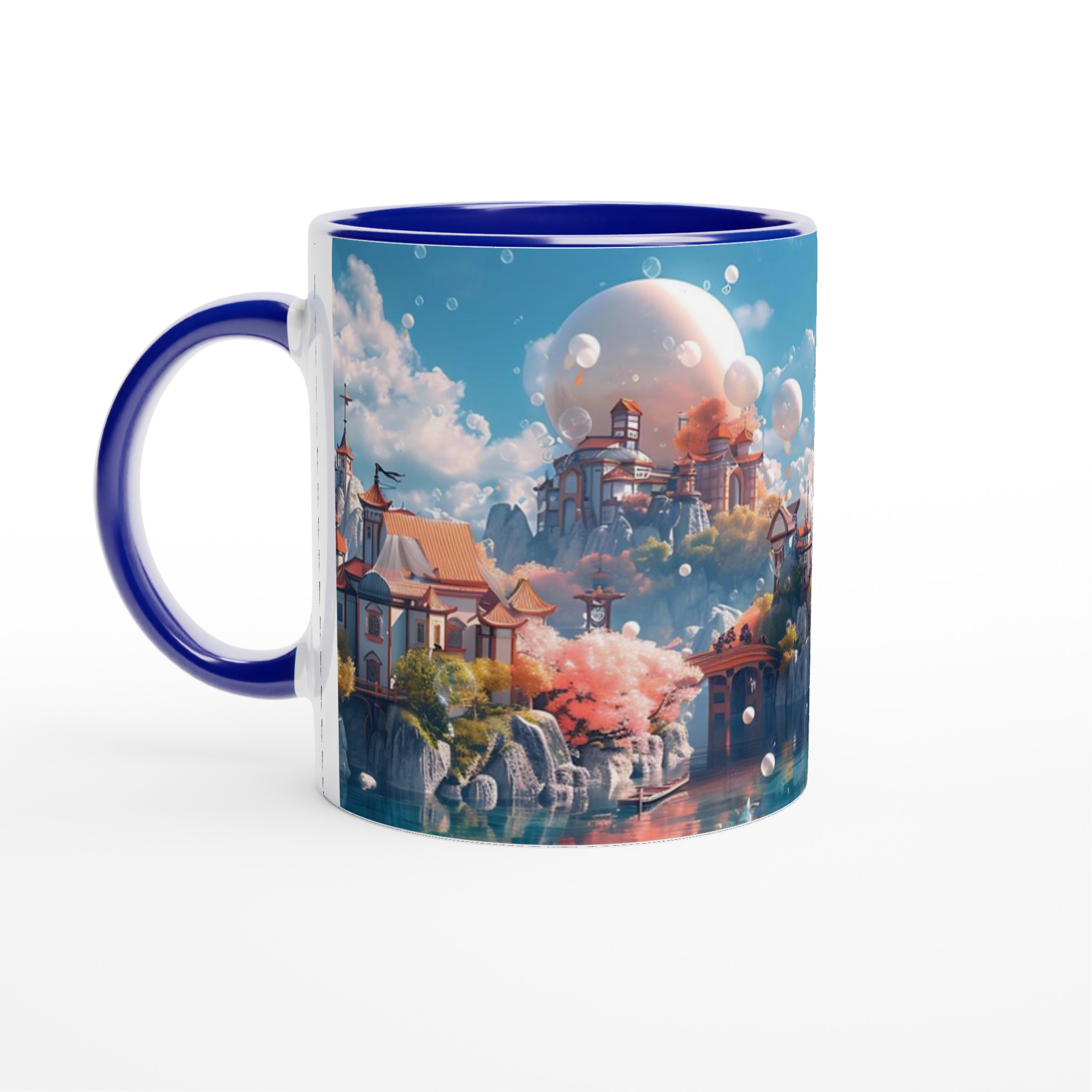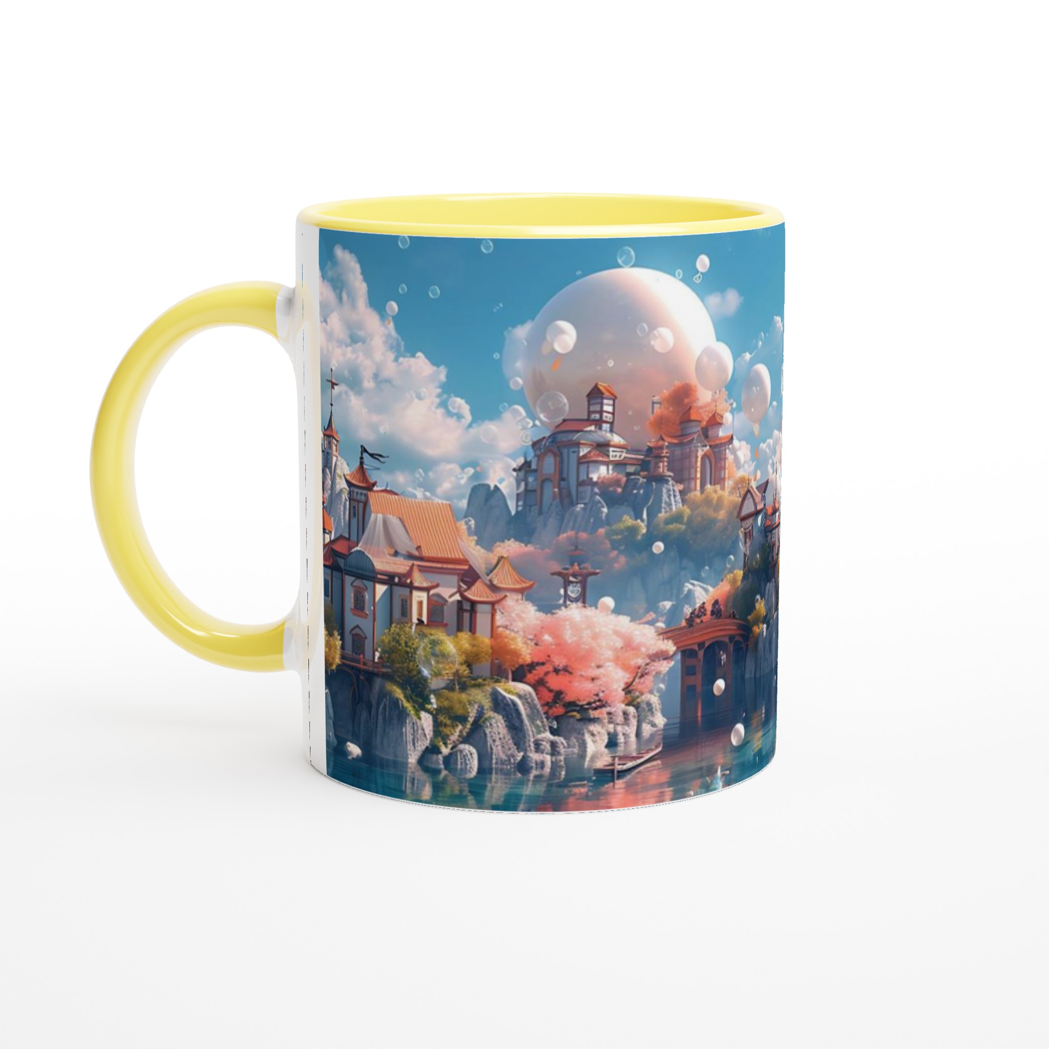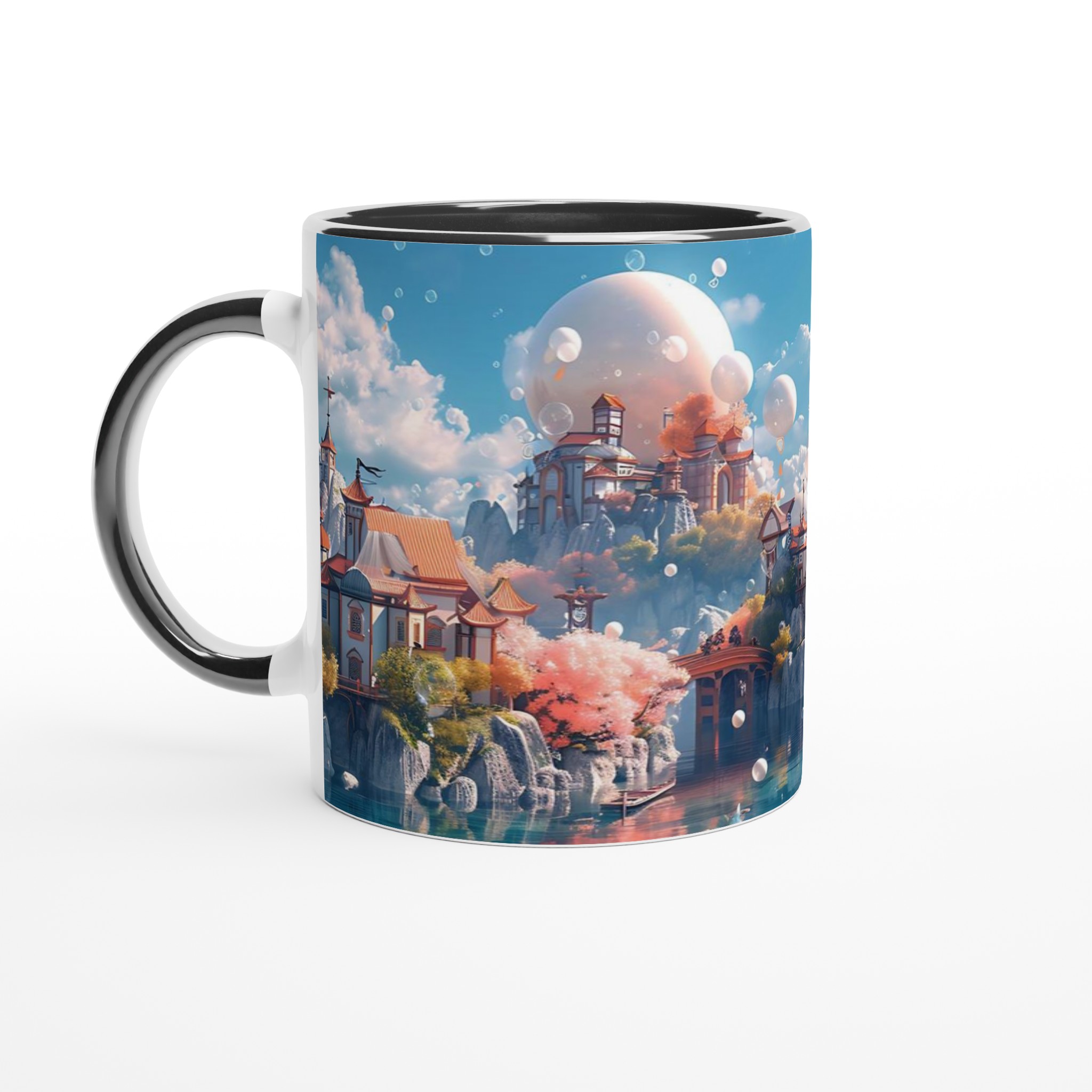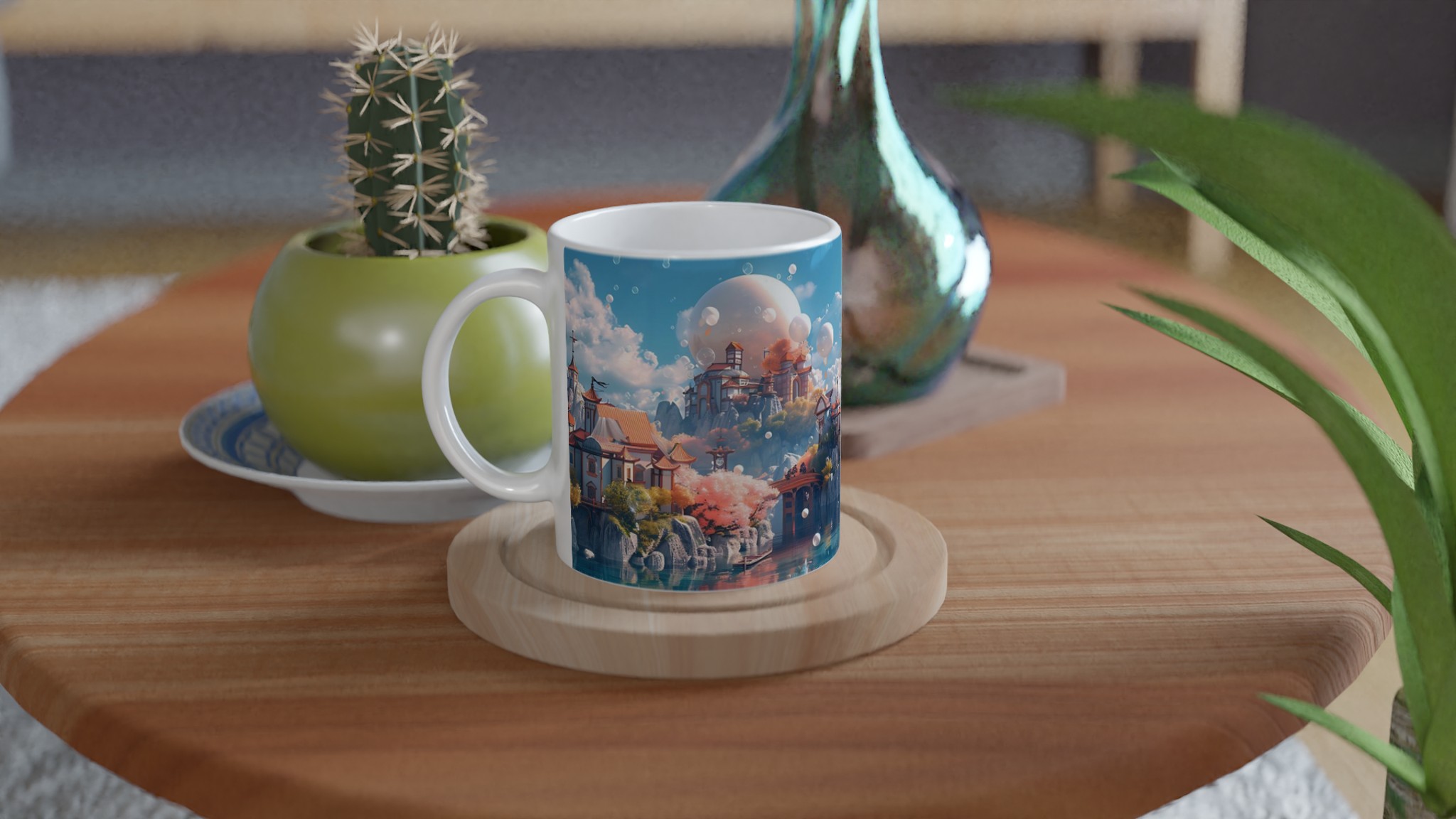 Stig in i en värld av lugn och magi varje gång du lyfter denna förtrollande keramiska mugg. Med sitt motiv av en drömsk ö-värld med svävande bubblor och pastellfärger, blir denna mugg snabbt en vardagsfavorit. Den är perfekt för att omfamna morgonkaffet med en känsla av stillhet, avnjuta en kvällens varma choklad under stjärnorna eller bara njuta av en kopp te medan du låter tankarna vandra till avlägsna, fridfulla landskap.