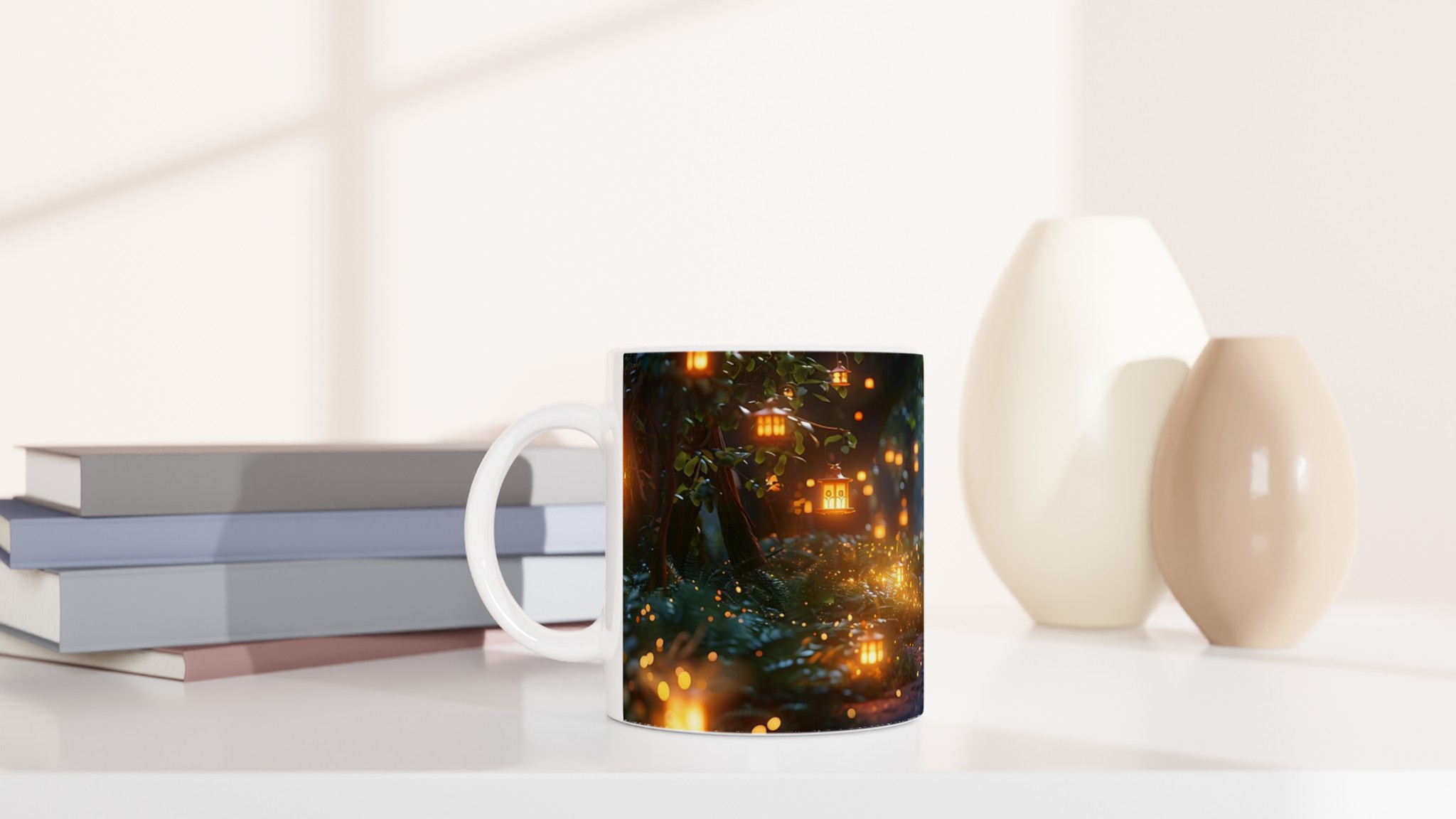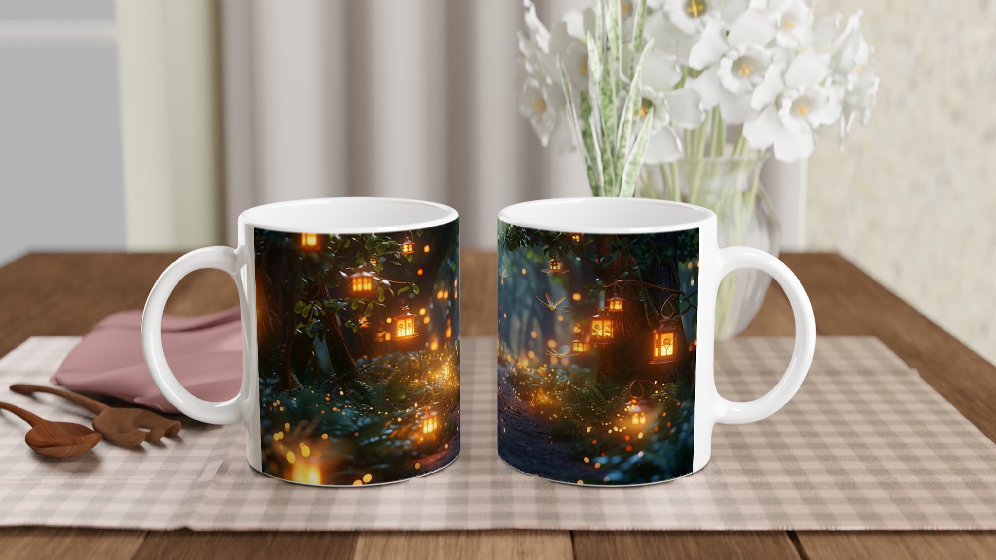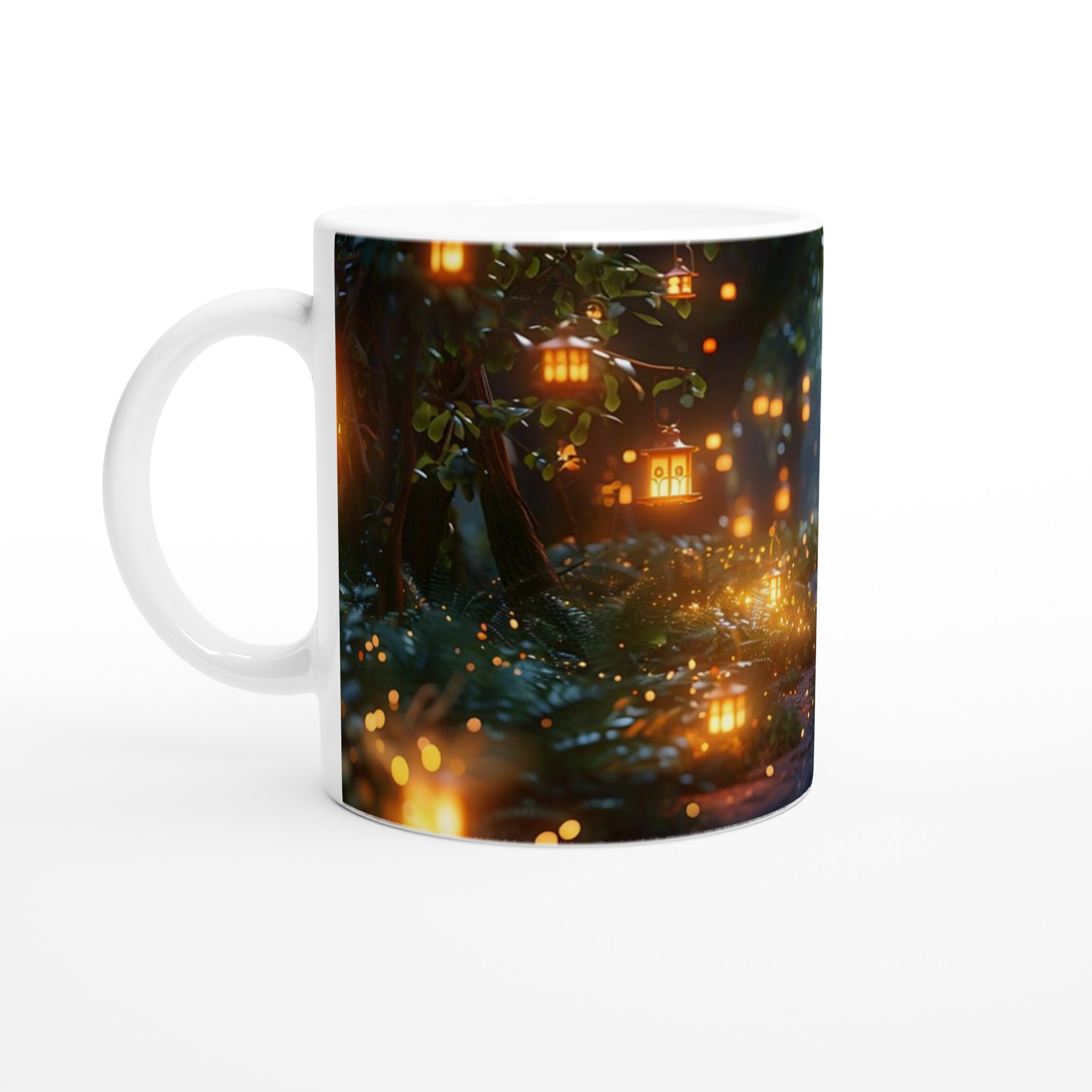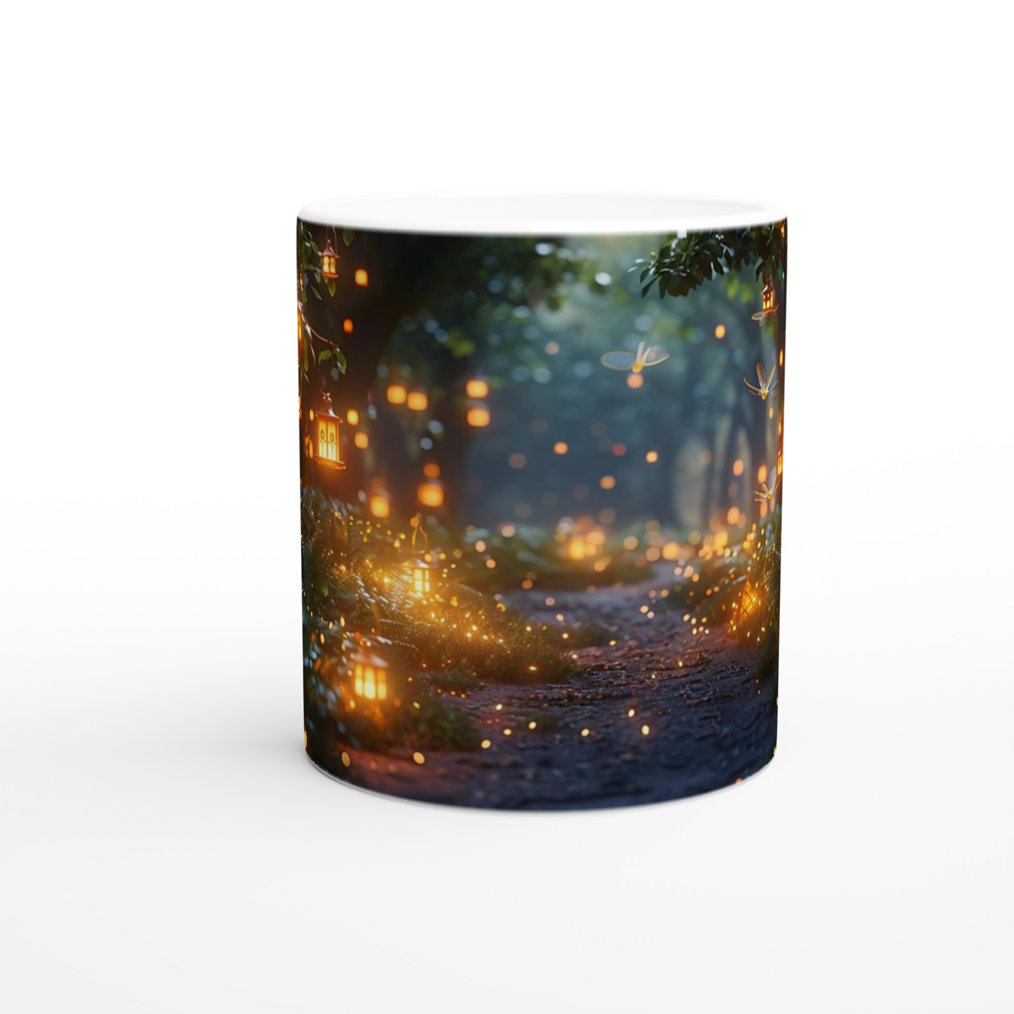 Stig in i en värld av förtrollning med denna magiska keramiska mugg, inspirerad av en glödande skogsstig upplyst av lyktor och eldflugor. Den här stilrena keramiska muggen blir snabbt en vardagsfavorit, perfekt för morgonkaffet, kvällens varma choklad eller när du bara vill njuta av en kopp te. Den blanka vita ytan gör att trycken framhävs med klara och levande färger, som håller sig fina även efter många turer i mikron och diskmaskinen.