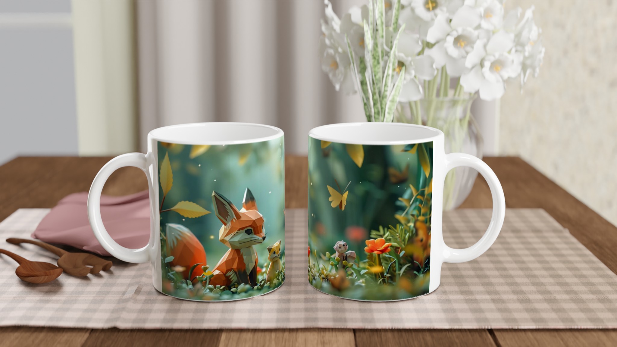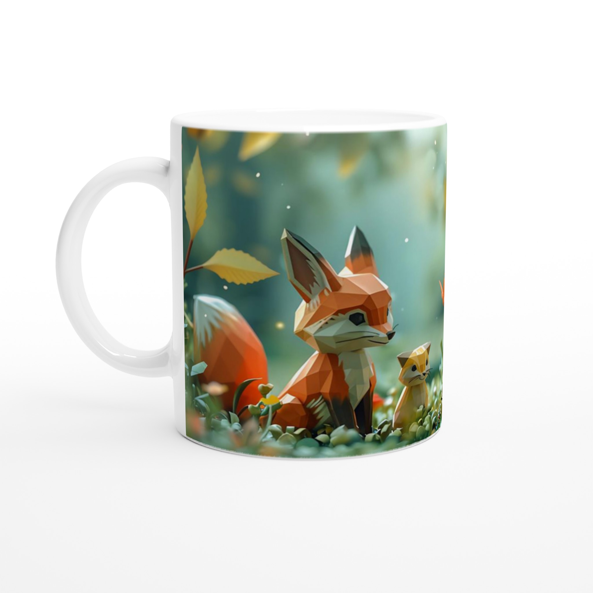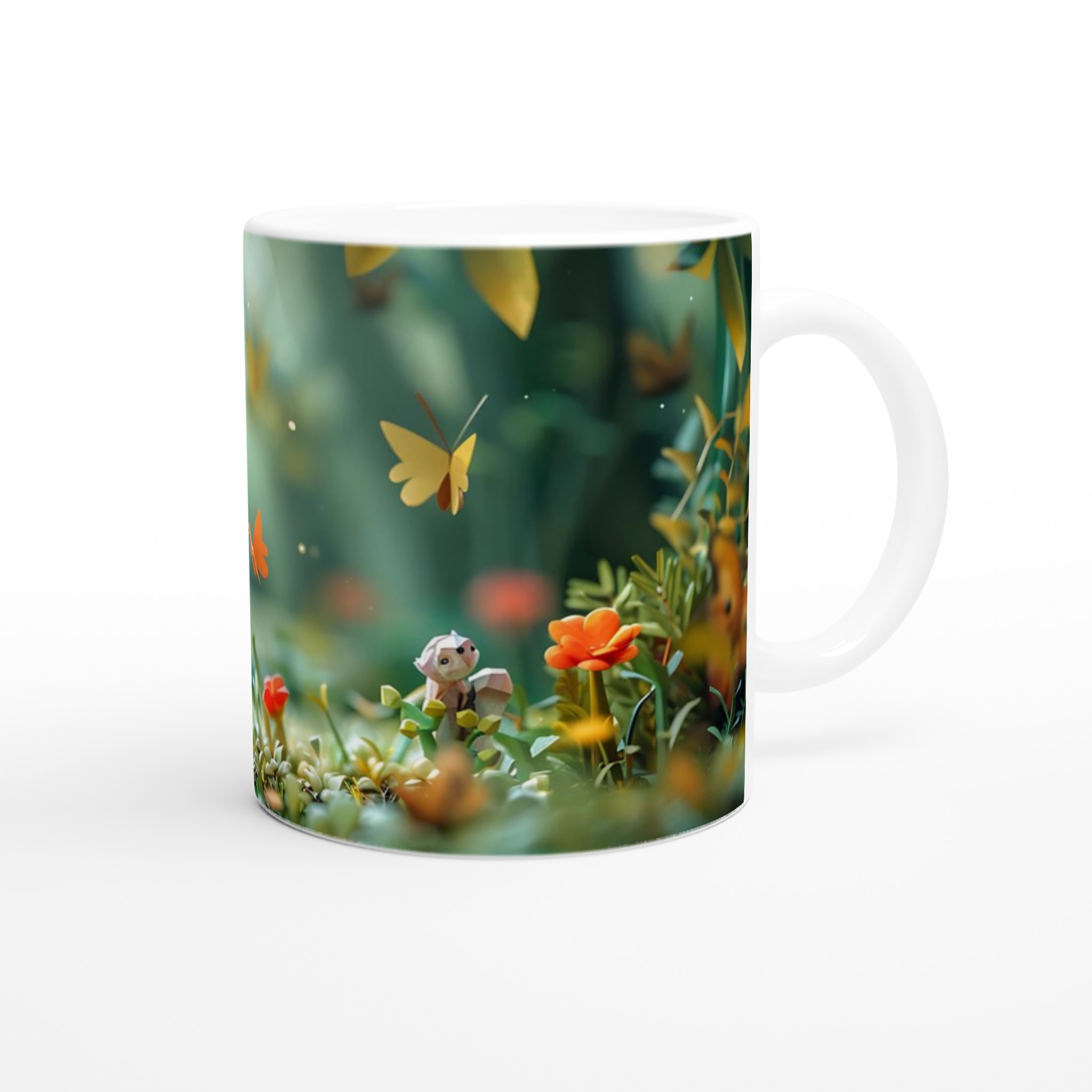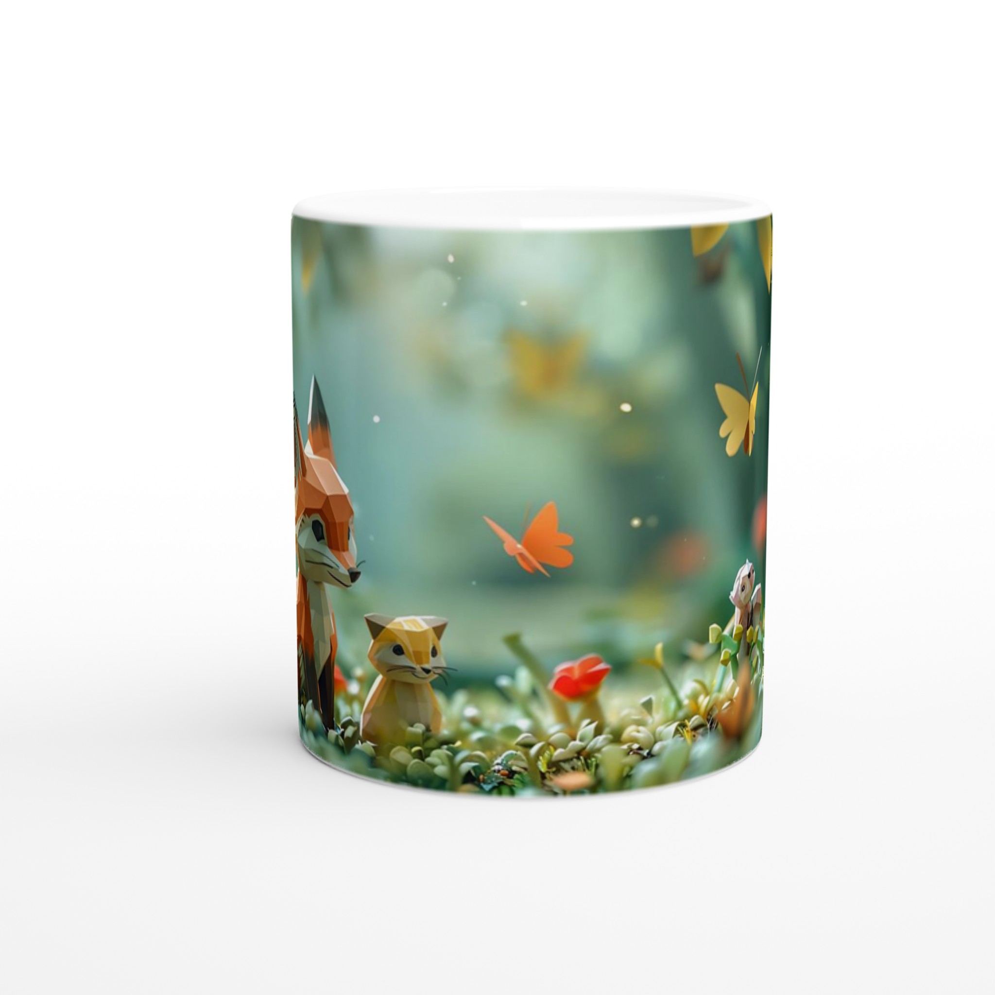 Stig in i en värld av förtrollning med denna charmiga keramiska mugg, som fångar den lekfulla andan från en magisk skog med sina lågpolygondjur och flygande fjärilar. Denna stilrena mugg blir snabbt en vardagsfavorit, perfekt för morgonkaffet, kvällens varma choklad eller när du bara vill njuta av en kopp te i gott sällskap. Den blanka vita ytan gör att trycken framhävs med klara och levande färger, som håller sig fina även efter många turer i mikron och diskmaskinen, vilket bevarar den förtrollande designen.