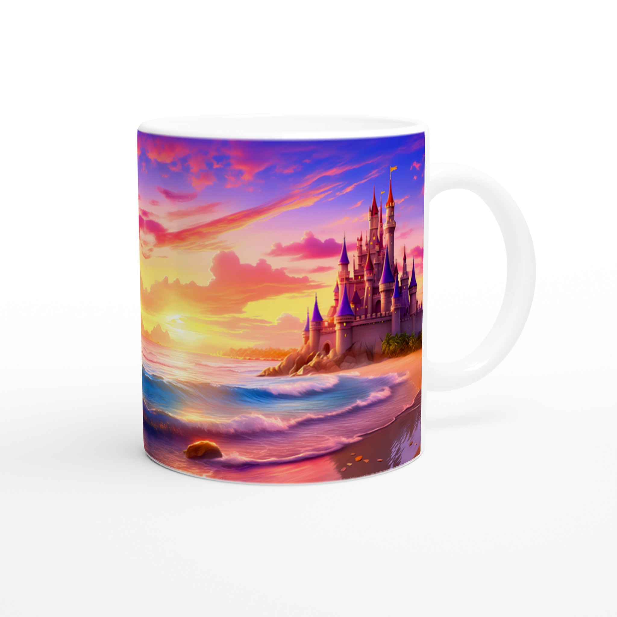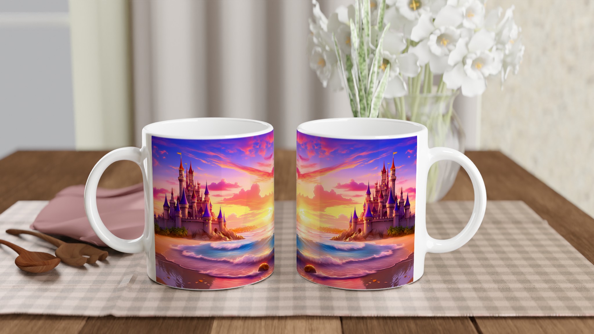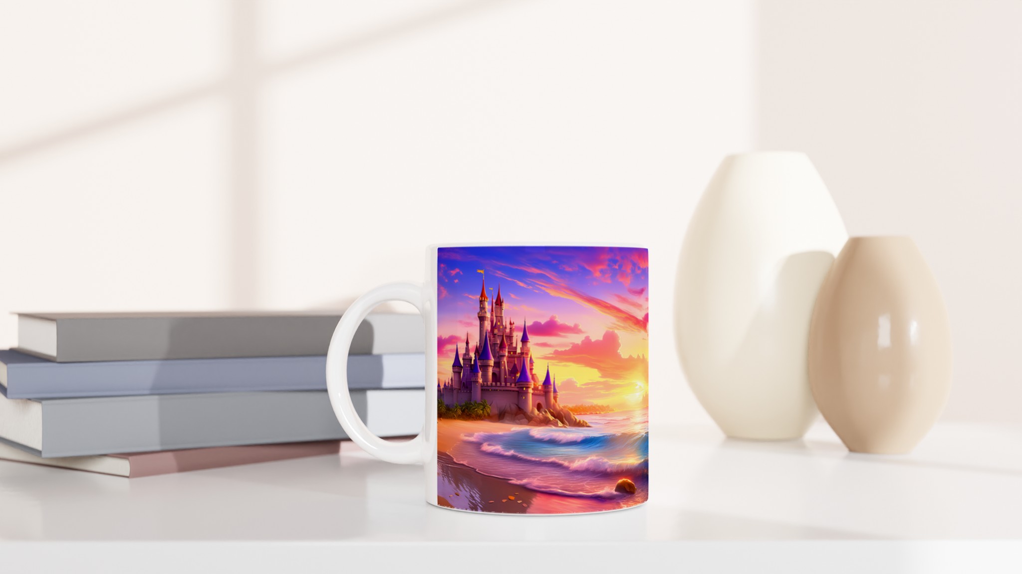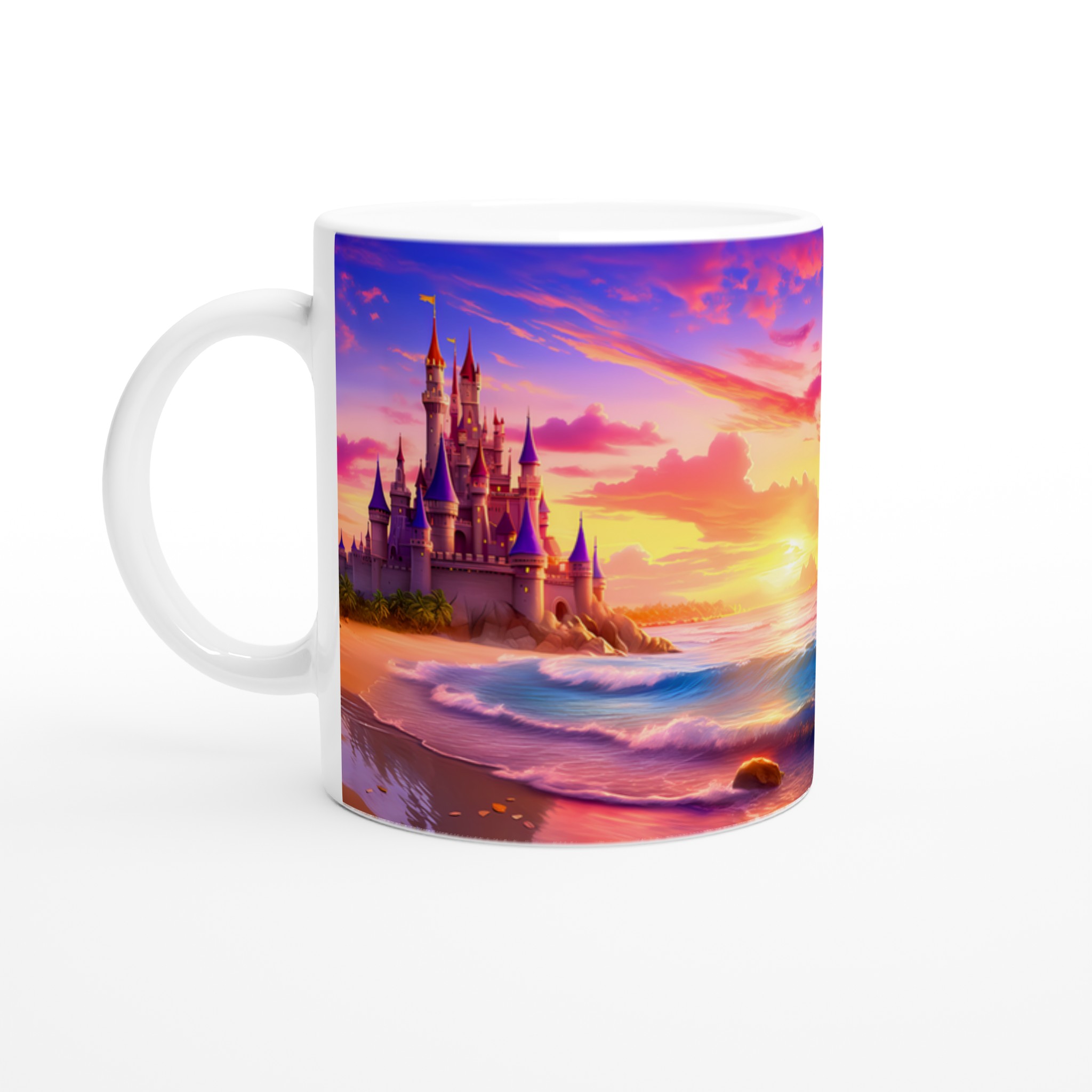 Fånga magin från en drömlik solnedgång varje gång du tar en klunk med denna förtrollande keramiska mugg. Med sitt levande och färgsprakande tryck av ett fantasislott vid en strandkant, badat i nyanser av rosa, lila och guld, blir varje fika en stund av ren avkoppling och dagdrömmar. Perfekt för morgonkaffet, kvällens varma choklad eller när du bara vill njuta av en kopp te. Den blanka ytan framhäver trycket med klara och levande färger, som håller sig fina även efter många turer i mikron och diskmaskinen.