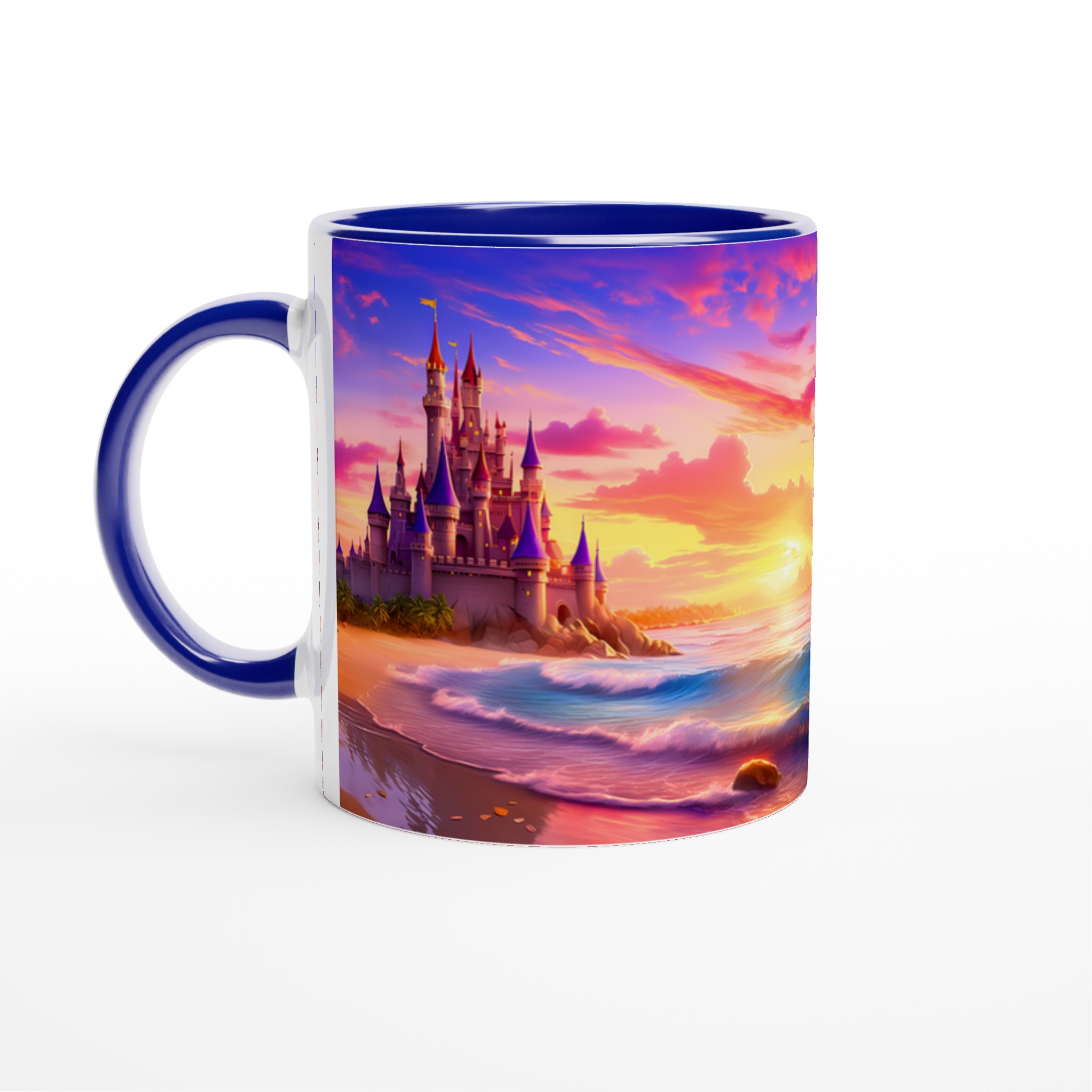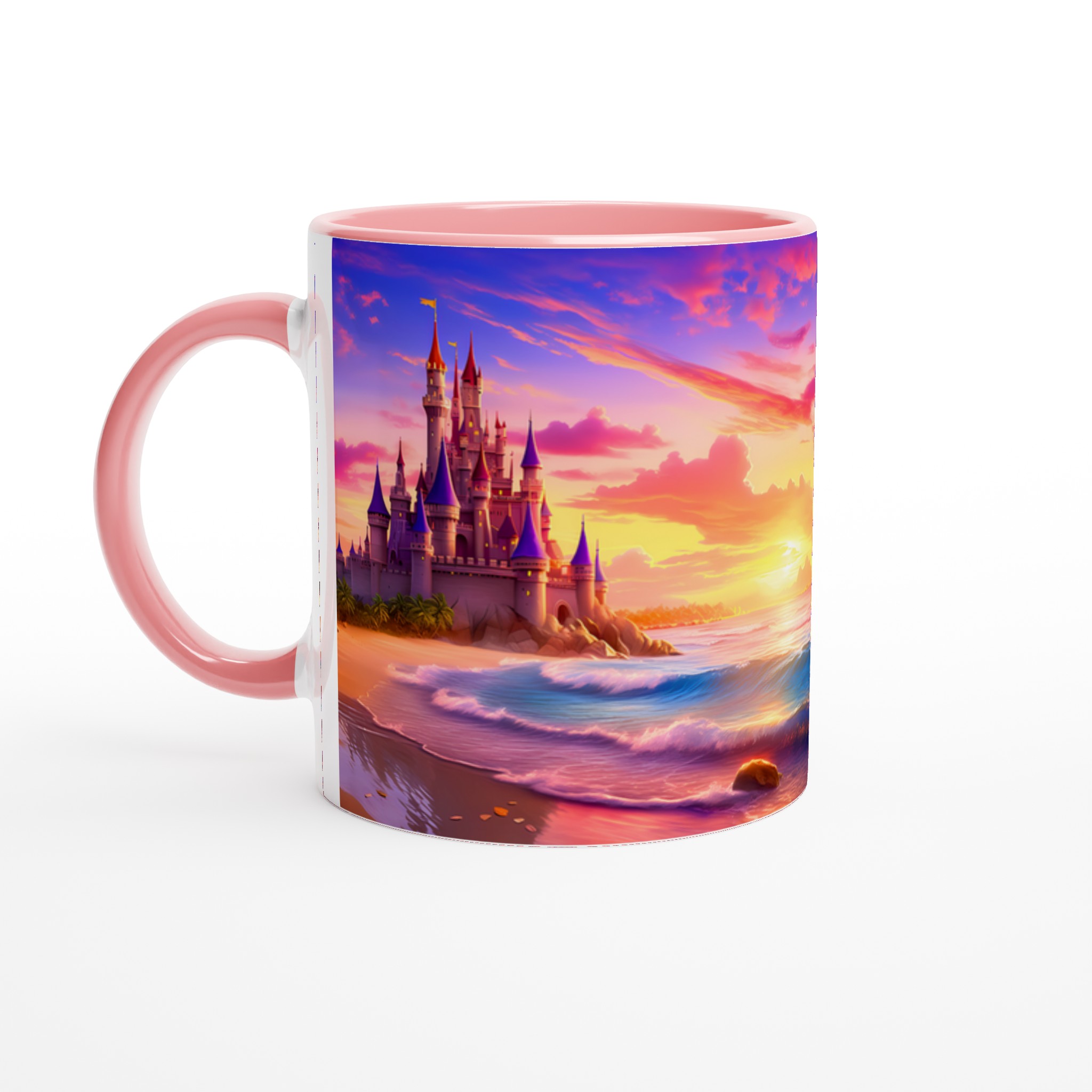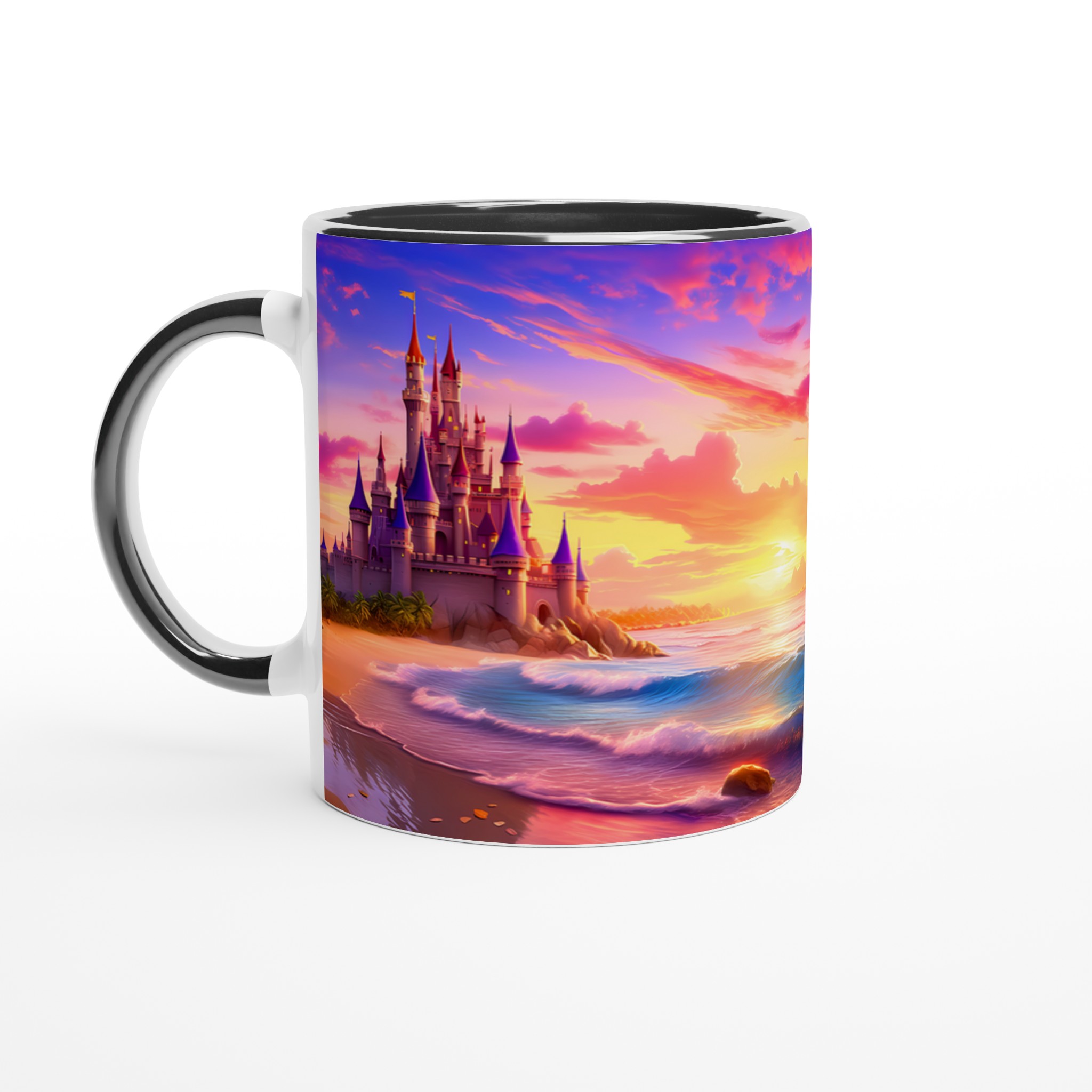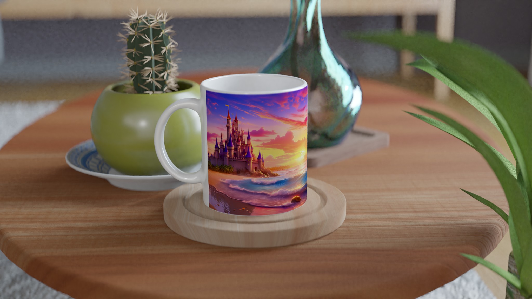 Fånga magin från en drömlik solnedgång varje gång du tar en klunk med denna förtrollande keramiska mugg. Med sitt levande och färgsprakande tryck av ett fantasislott vid en strandkant, badat i nyanser av rosa, lila och guld, blir varje fika en stund av ren avkoppling och dagdrömmar. Perfekt för morgonkaffet, kvällens varma choklad eller när du bara vill njuta av en kopp te. Den blanka ytan framhäver trycket med klara och levande färger, som håller sig fina även efter många turer i mikron och diskmaskinen.