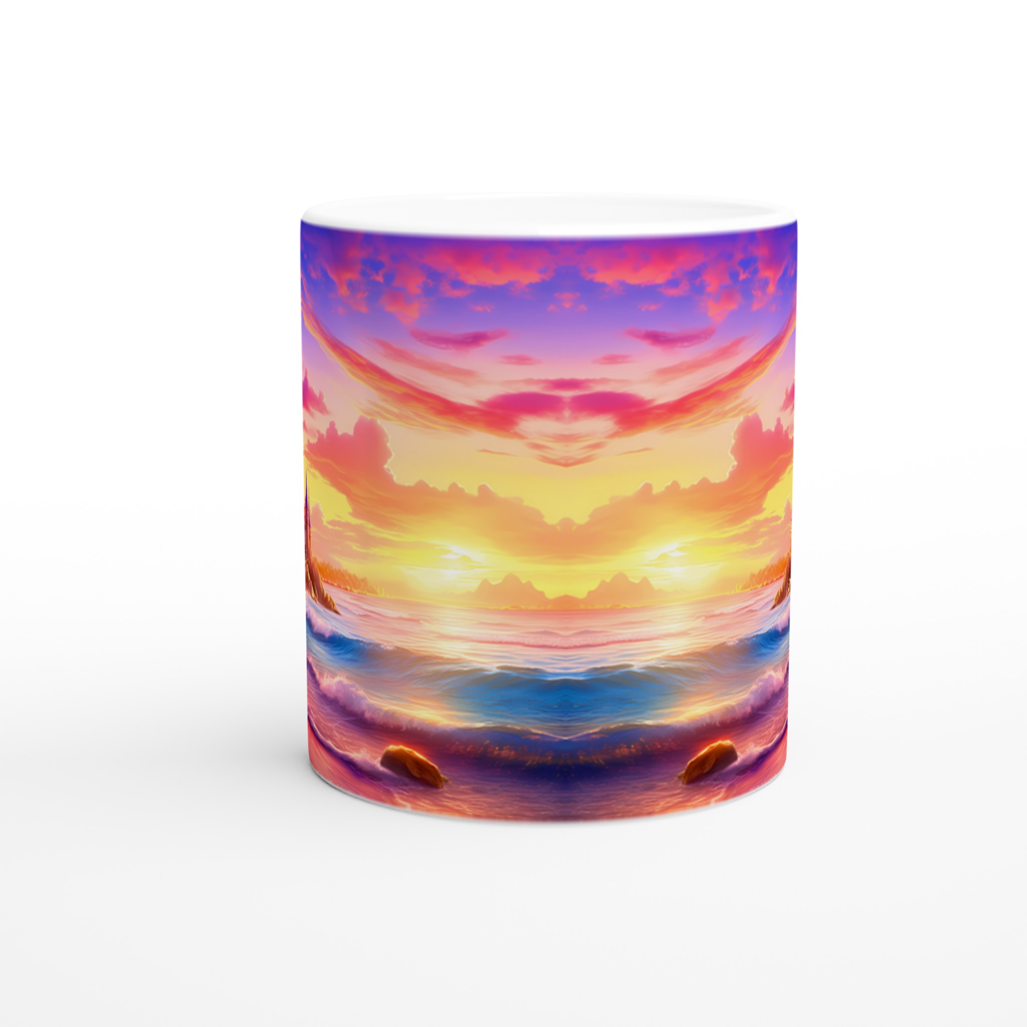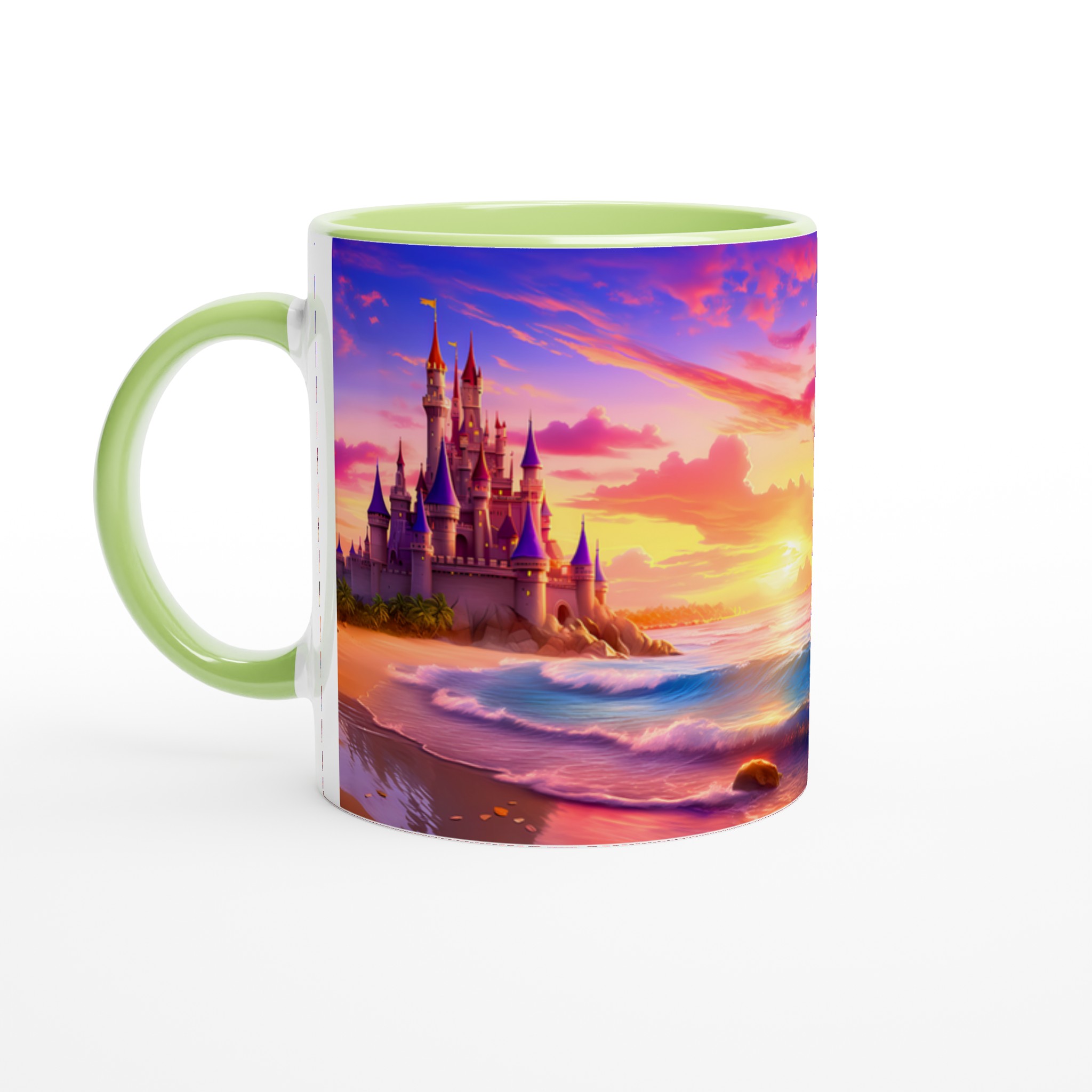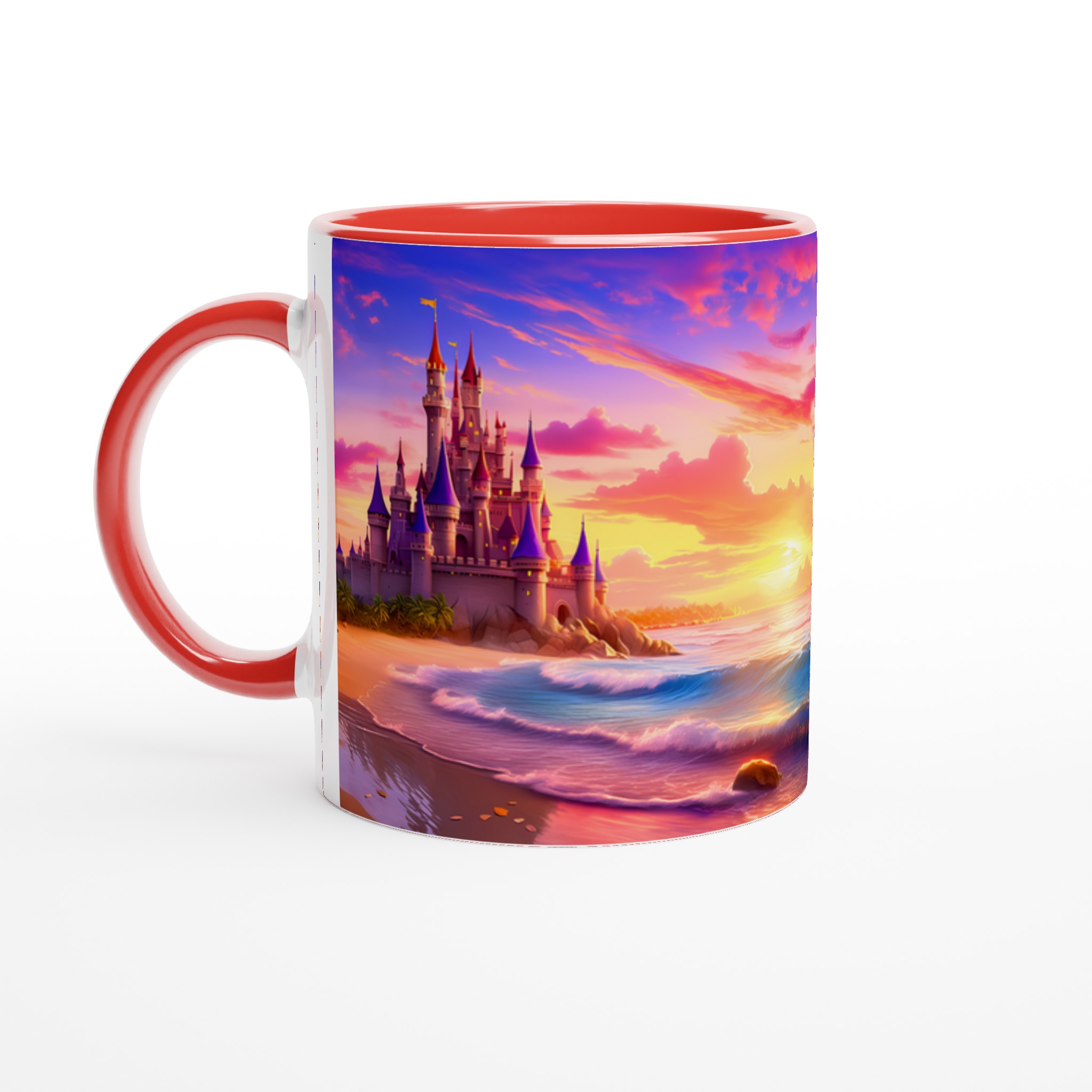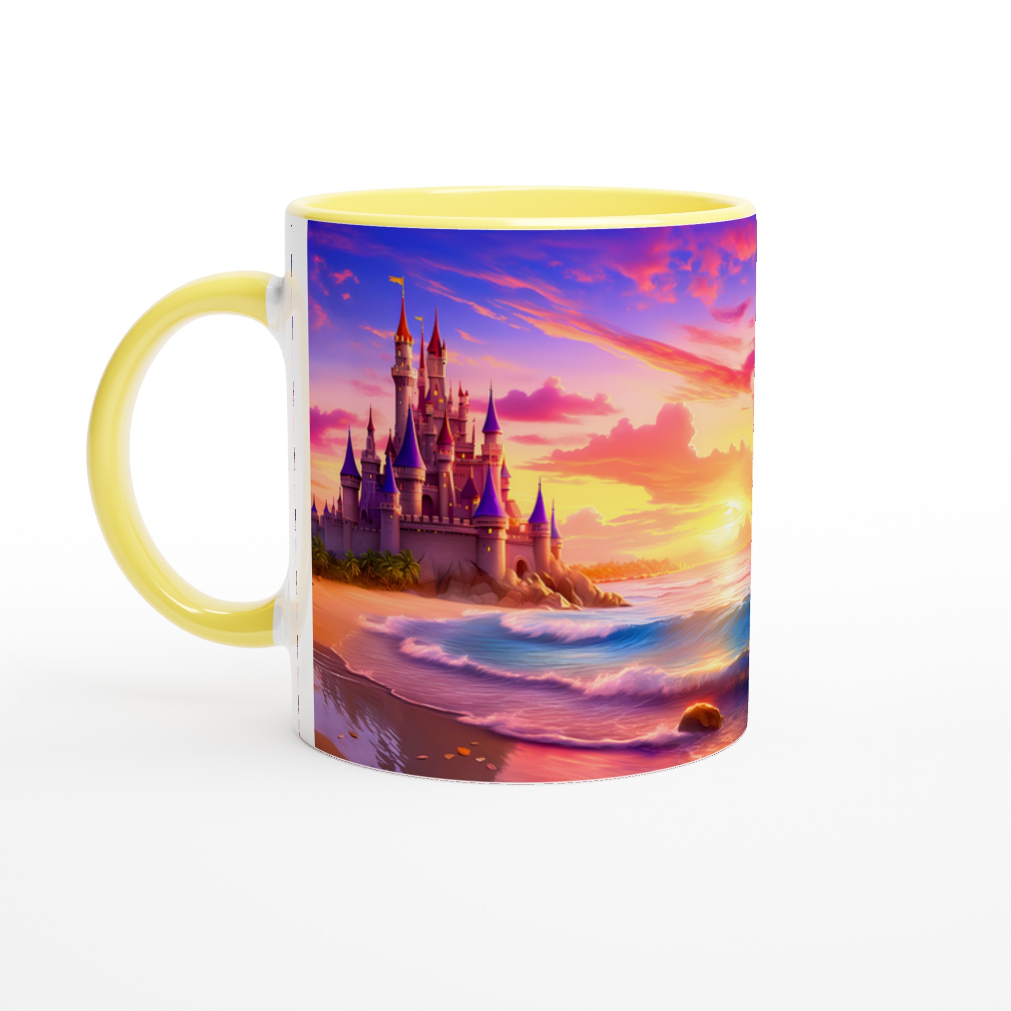 Fånga magin från en drömlik solnedgång varje gång du tar en klunk med denna förtrollande keramiska mugg. Med sitt levande och färgsprakande tryck av ett fantasislott vid en strandkant, badat i nyanser av rosa, lila och guld, blir varje fika en stund av ren avkoppling och dagdrömmar. Perfekt för morgonkaffet, kvällens varma choklad eller när du bara vill njuta av en kopp te. Den blanka ytan framhäver trycket med klara och levande färger, som håller sig fina även efter många turer i mikron och diskmaskinen.