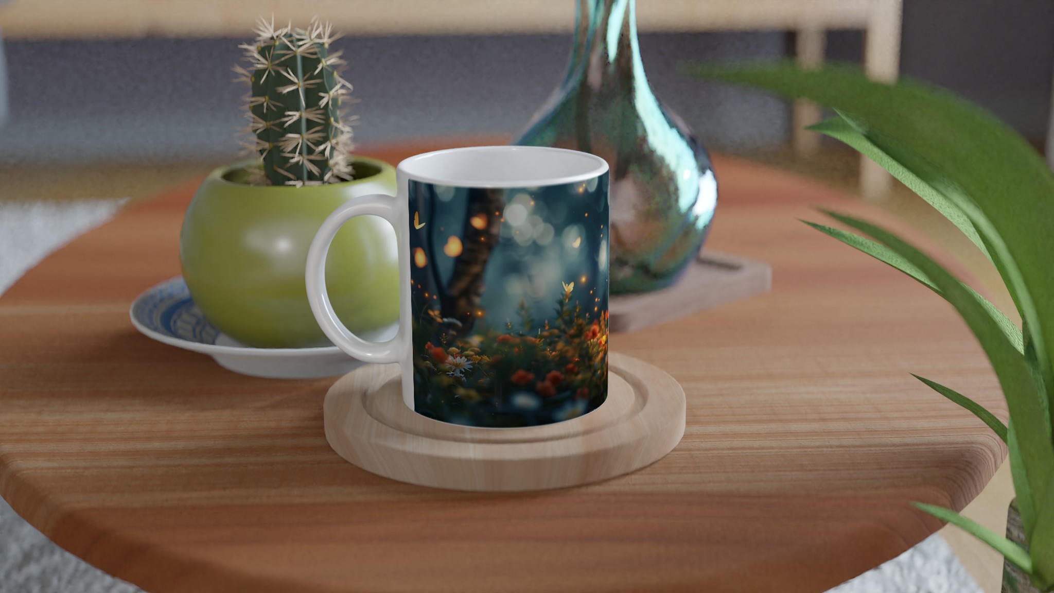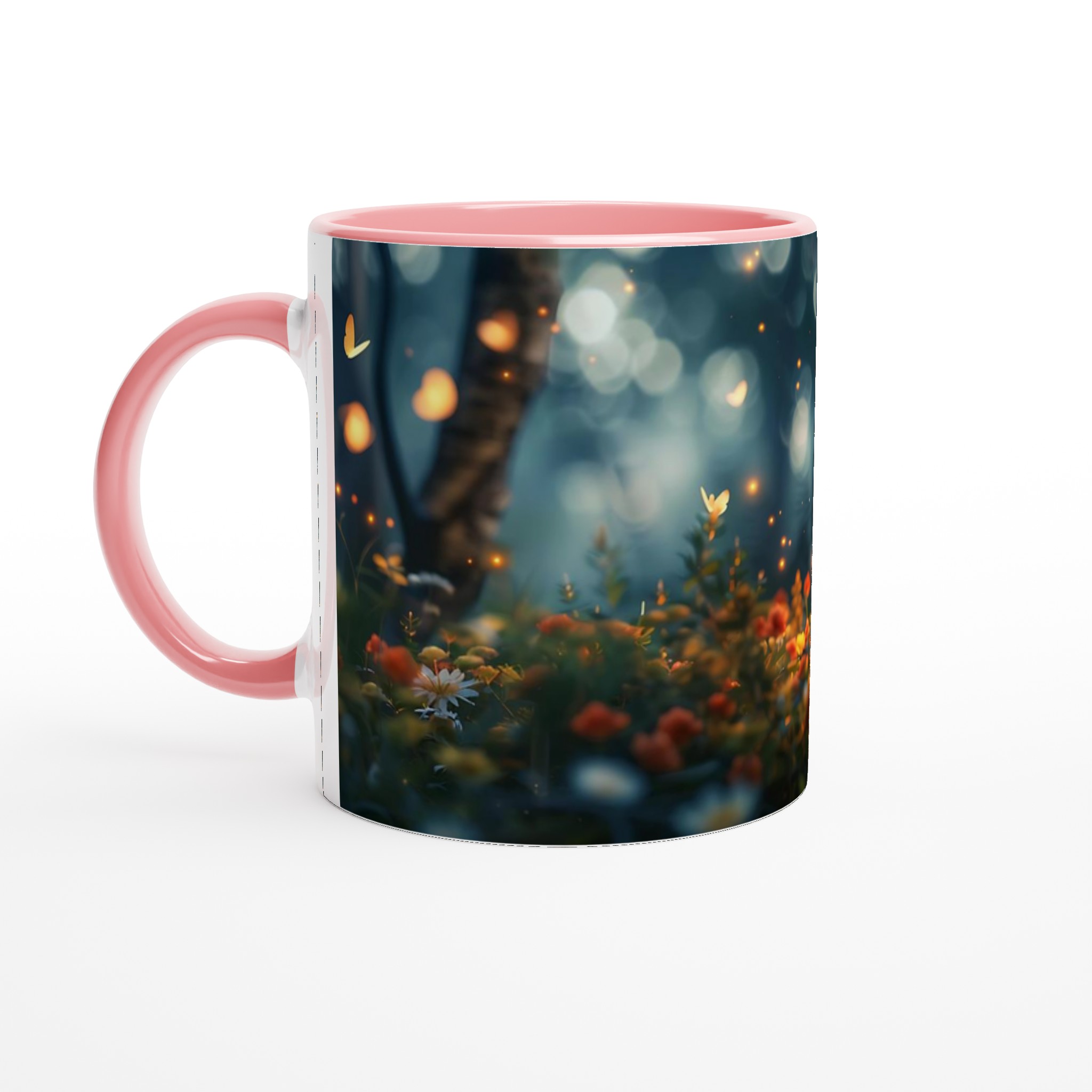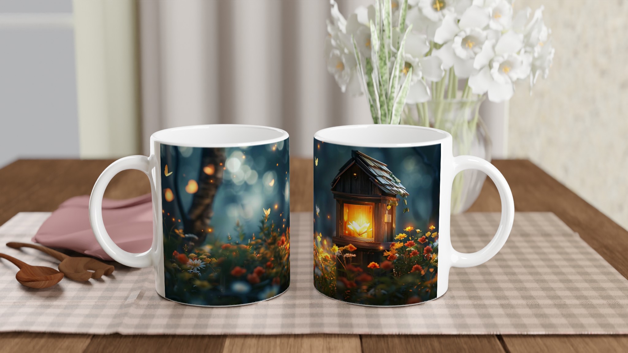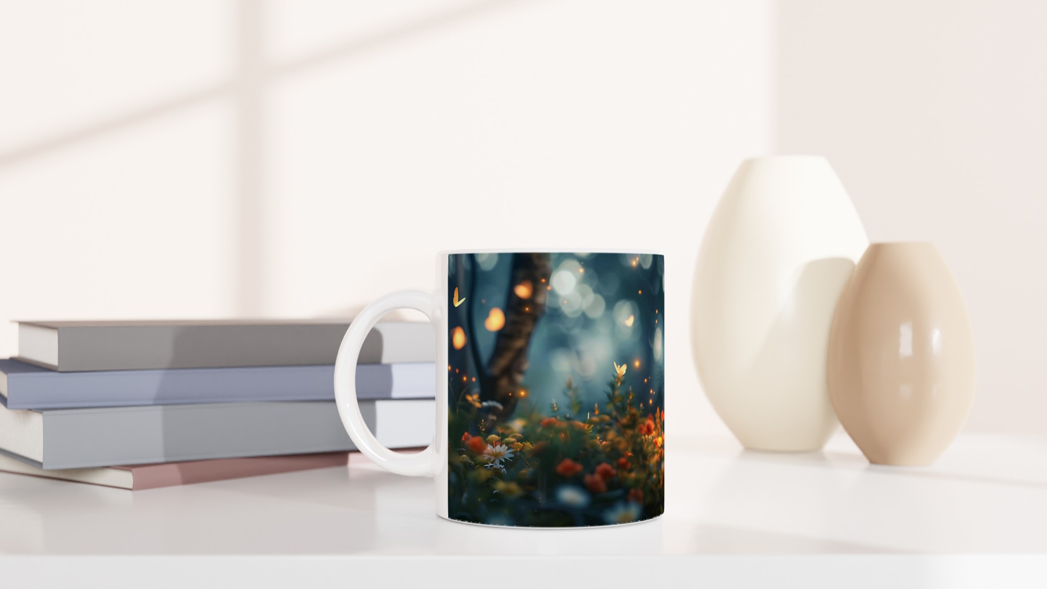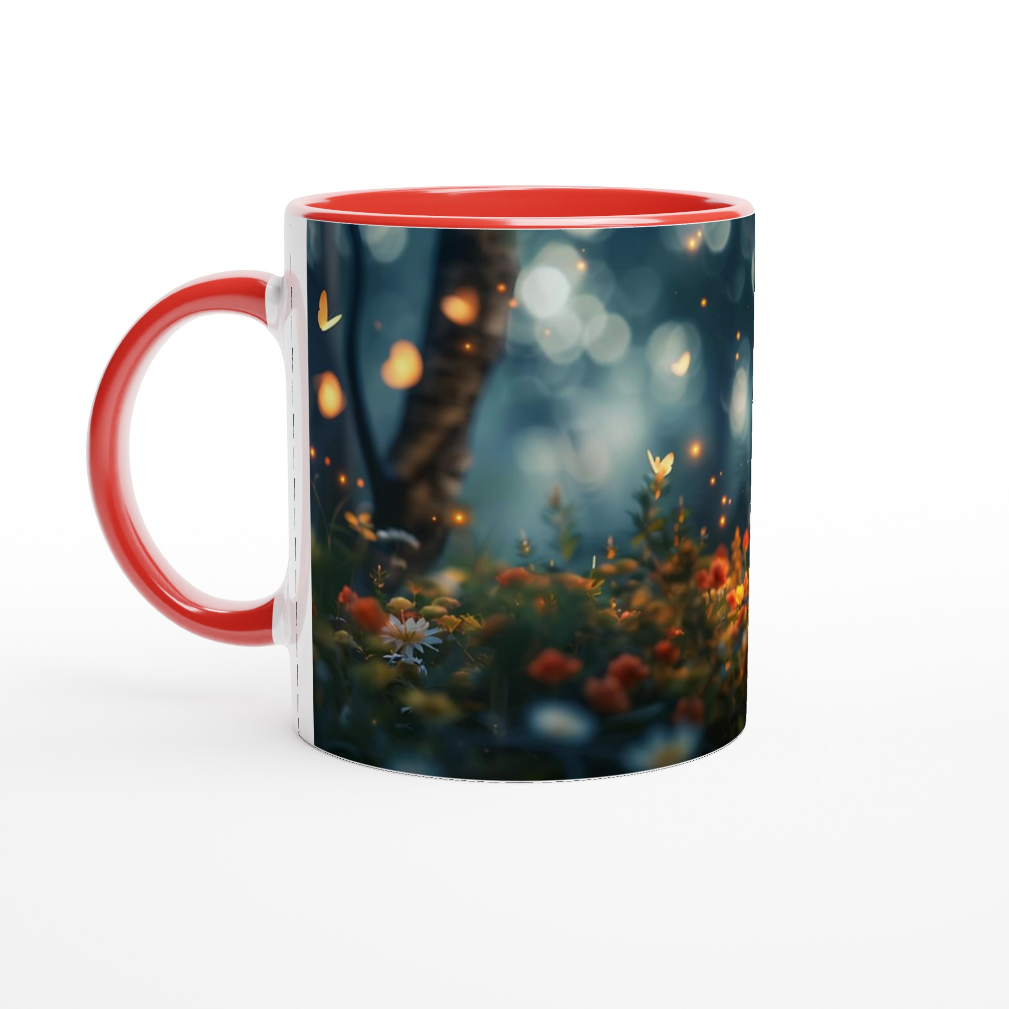 Fånga magin från en hemlig trädgård med denna förtrollande keramiska mugg. Dess design för tankarna till en mystisk skogsdunge, upplyst av svävande ljus och fjärilar, där varje sip blir en stund av lugn och undran. Den blanka vita ytan låter detta drömska motiv framträda med otrolig klarhet och levande färger, en skönhet som står sig genom otaliga mikrovågsugns- och diskmaskinsturer.