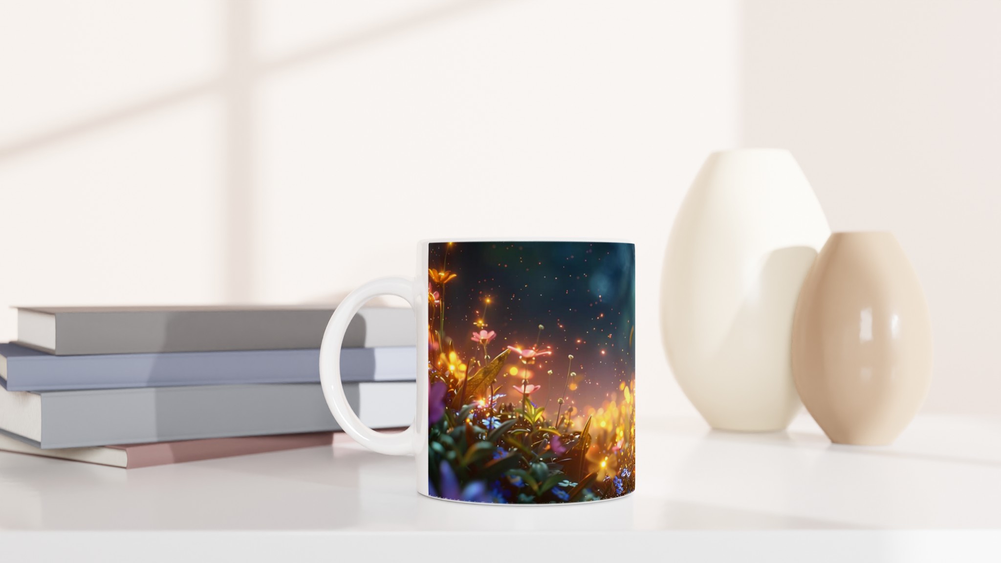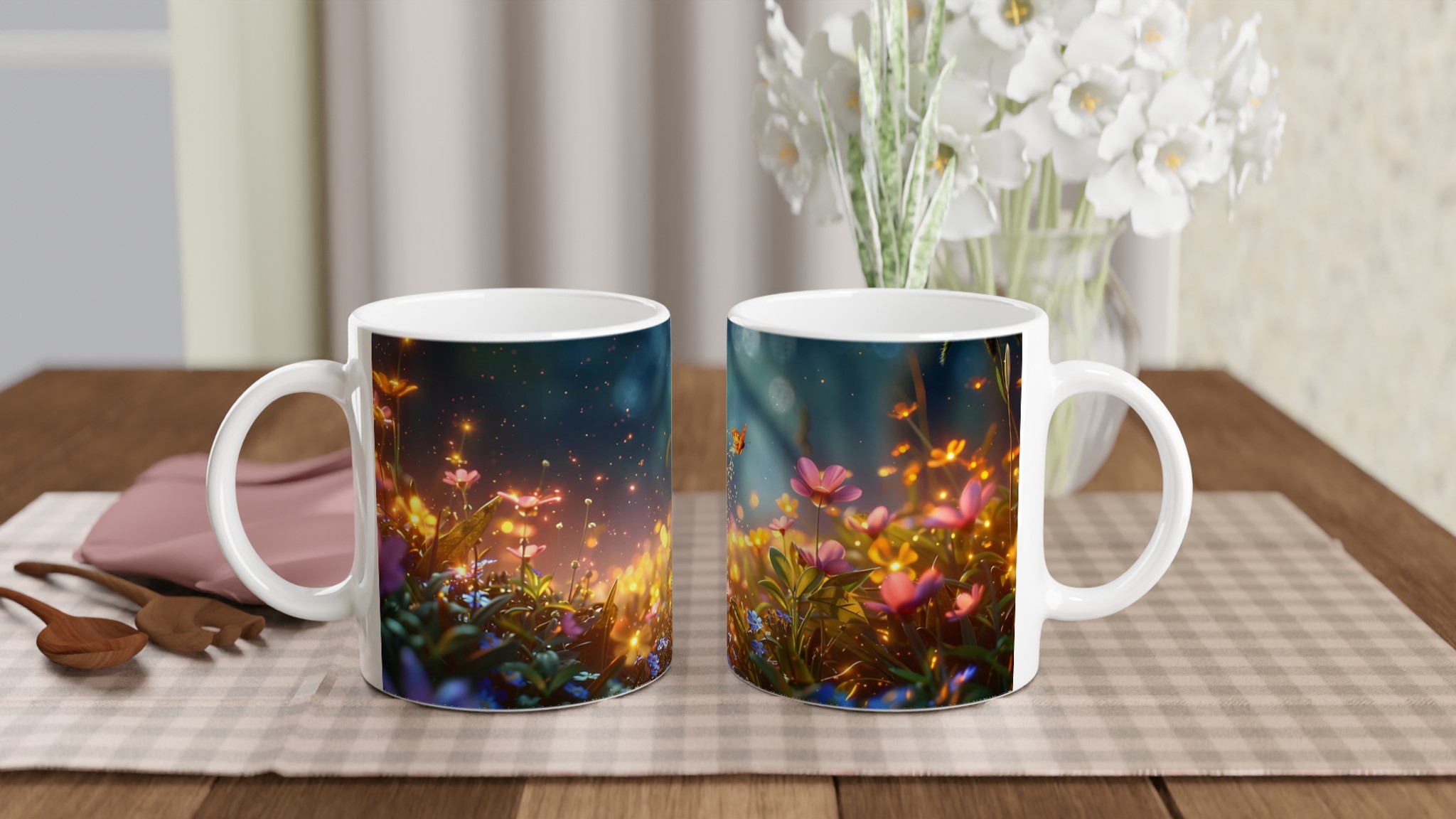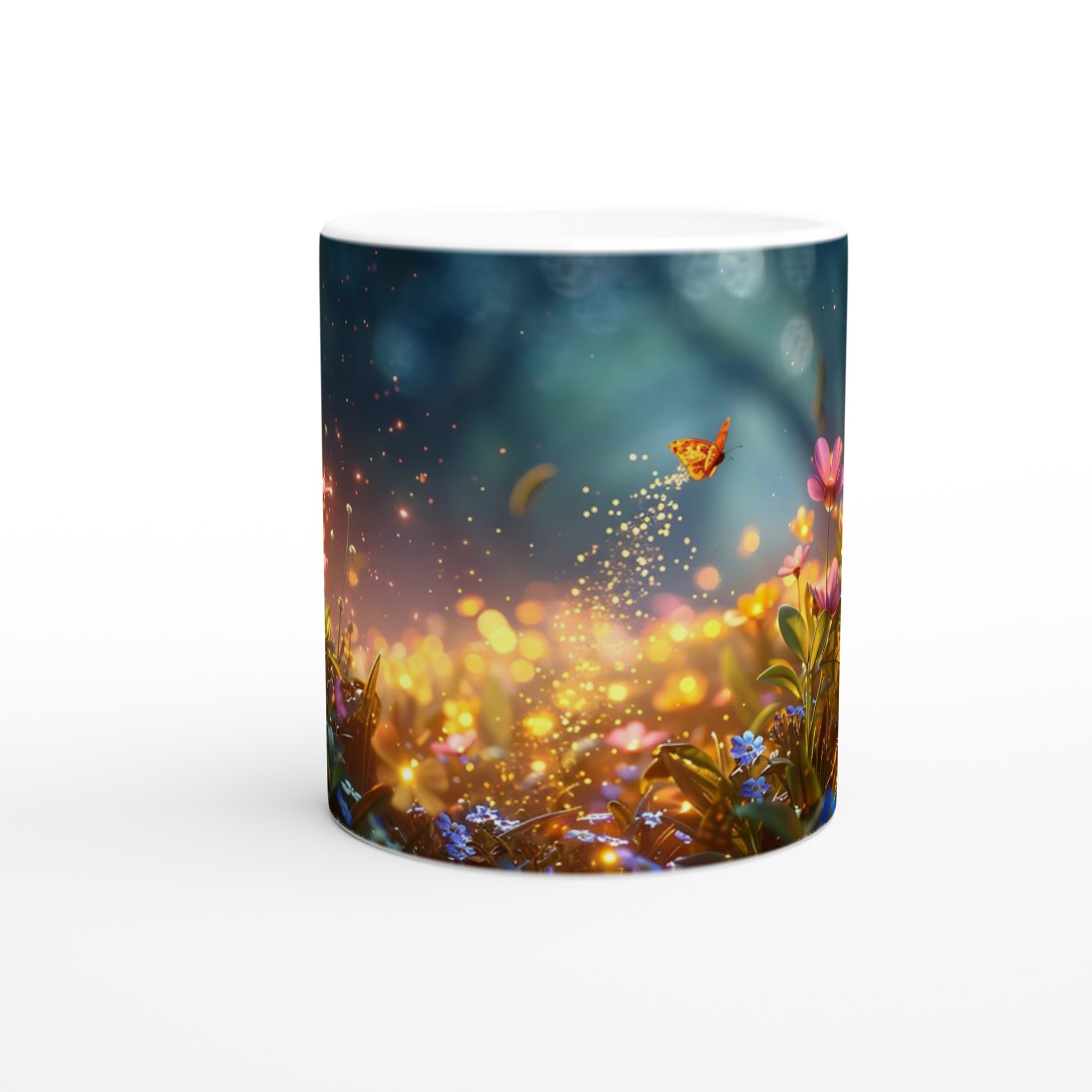 Låt dig svepas med till en magisk trädgård varje gång du tar en klunk! Den här stilrena keramiska muggen, prydd med ett förtrollande motiv av glödande blommor och en eterisk fjäril, blir snabbt en vardagsfavorit. Perfekt för morgonkaffet som väcker sinnena, kvällens varma choklad för en stunds avkoppling, eller när du bara vill njuta av en kopp te medan tankarna får flyga fritt.