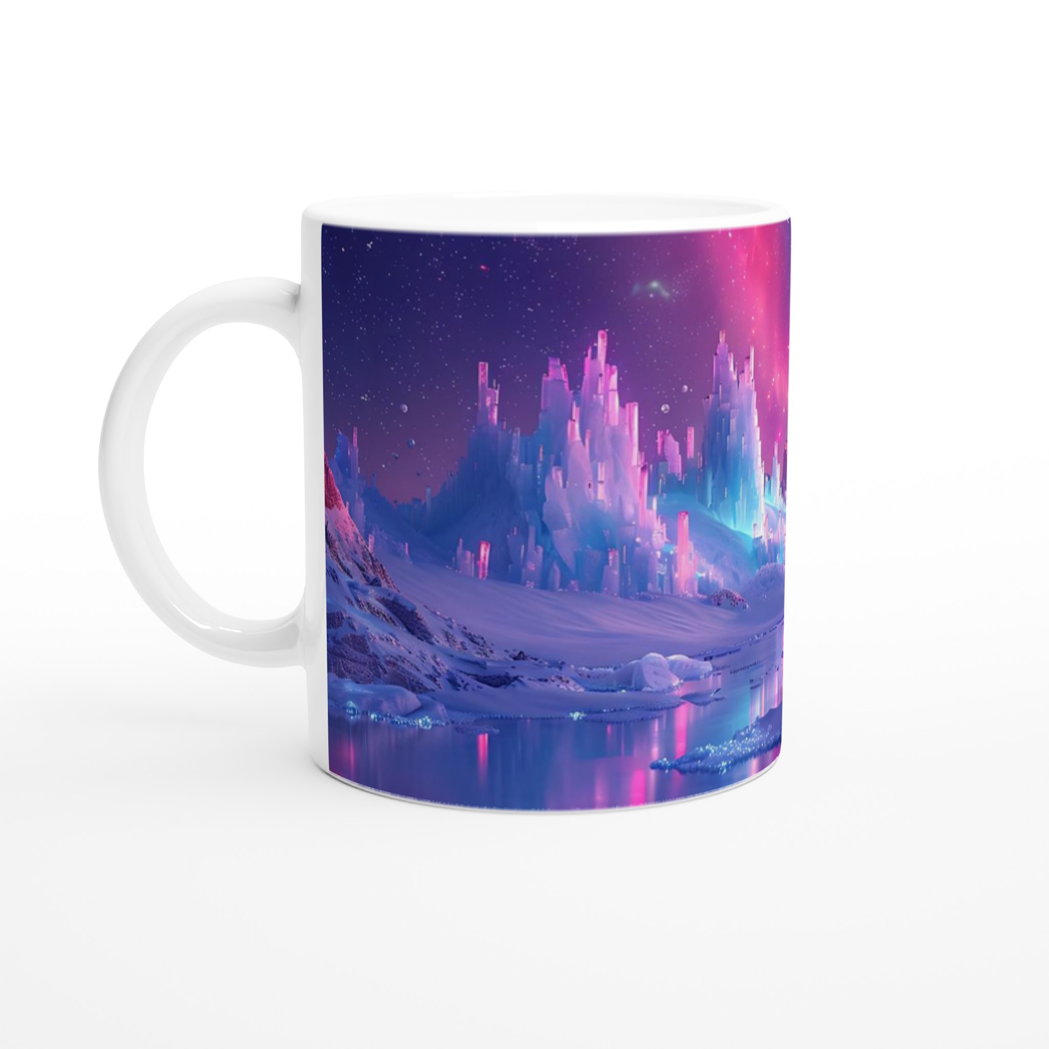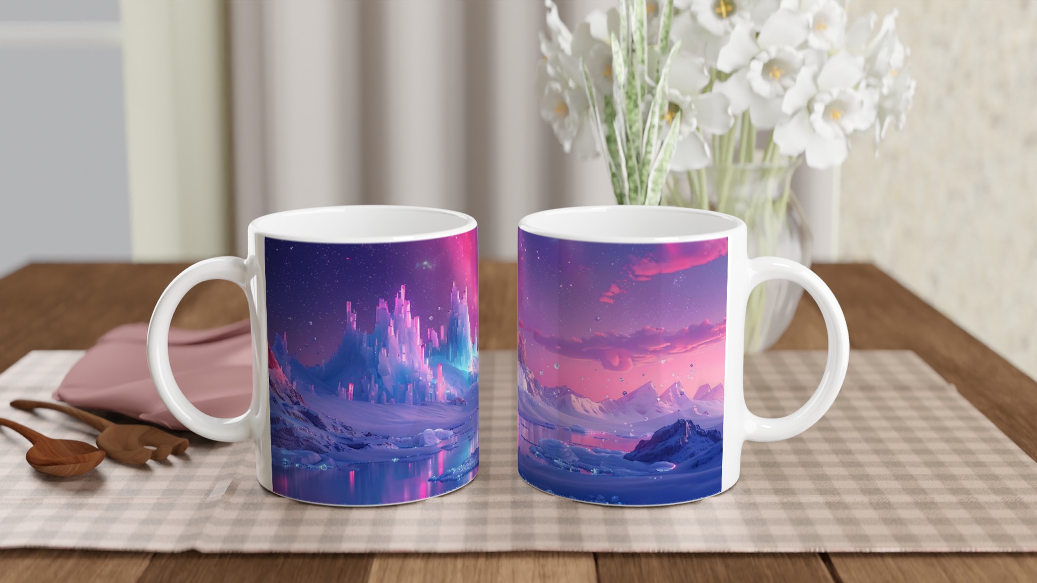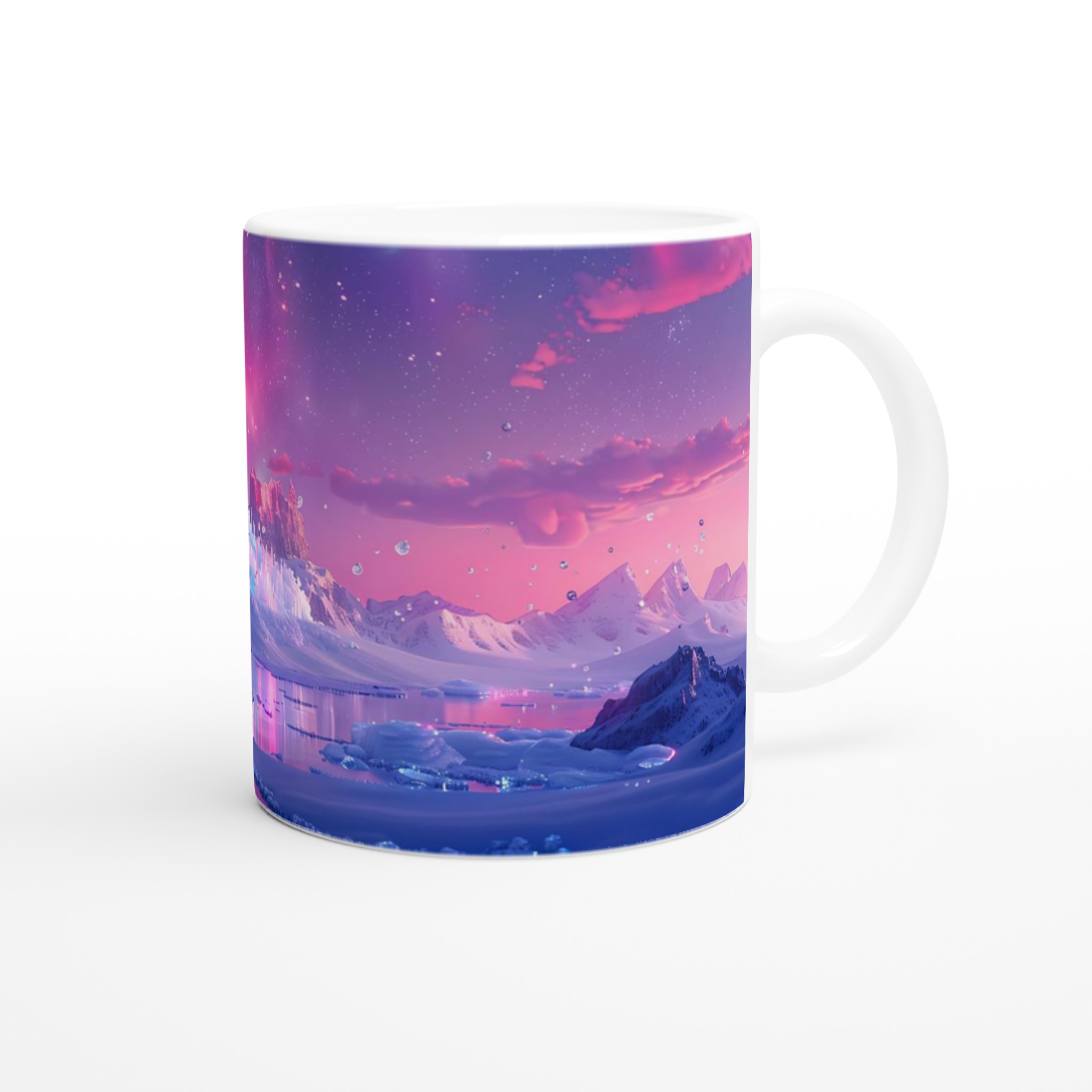 Stig in i en förtrollad vintervärld varje gång du tar en klunk med denna magiska keramiska mugg. Med en design inspirerad av ett drömskt, snöigt landskap badat i strålande magenta och blå nyanser, förvandlar denna mugg varje fikastund till en sagolik upplevelse. Perfekt för morgonkaffet, kvällens varma choklad eller när du bara vill njuta av en kopp te medan du drömmer dig bort till kristallpalats och norrskenshimlar.