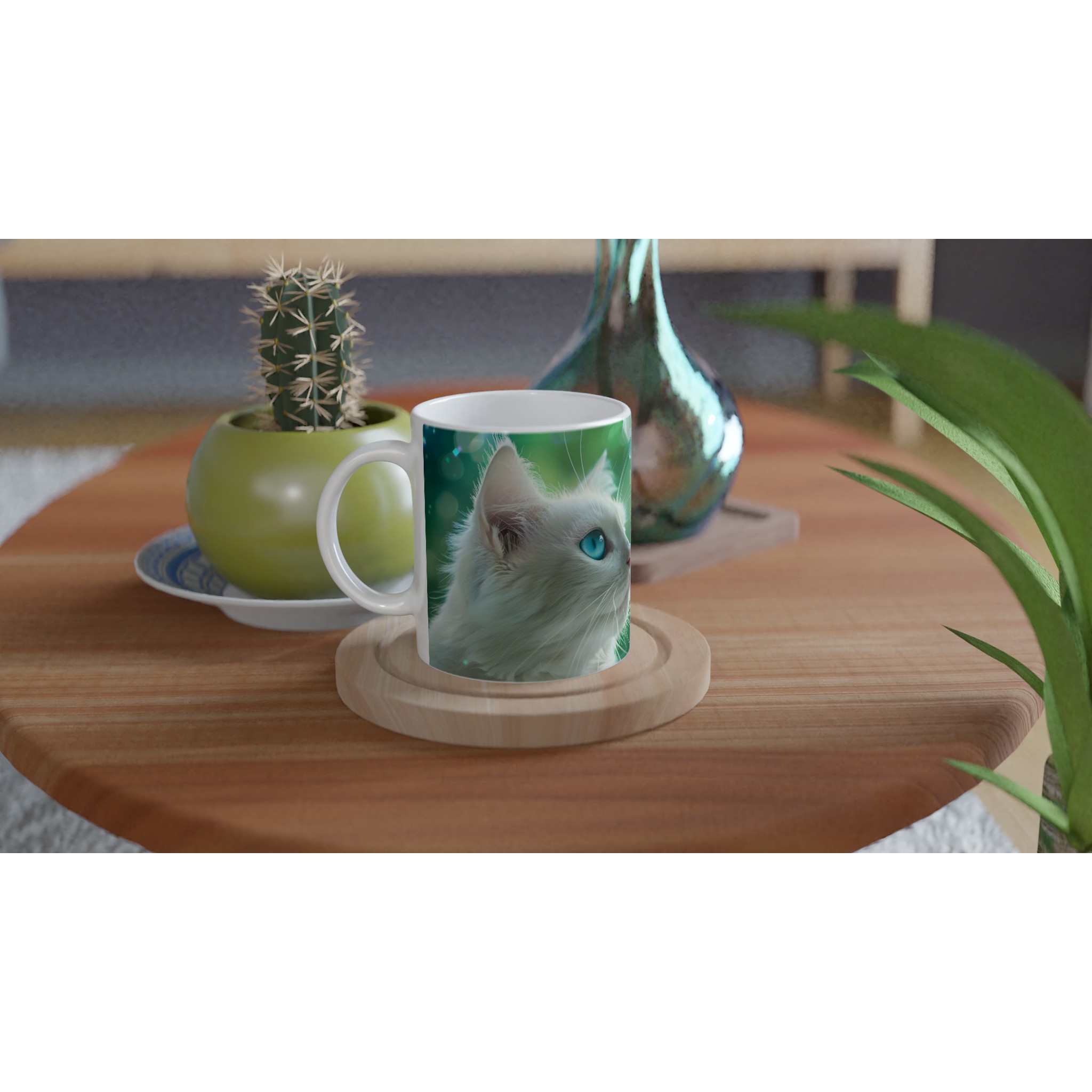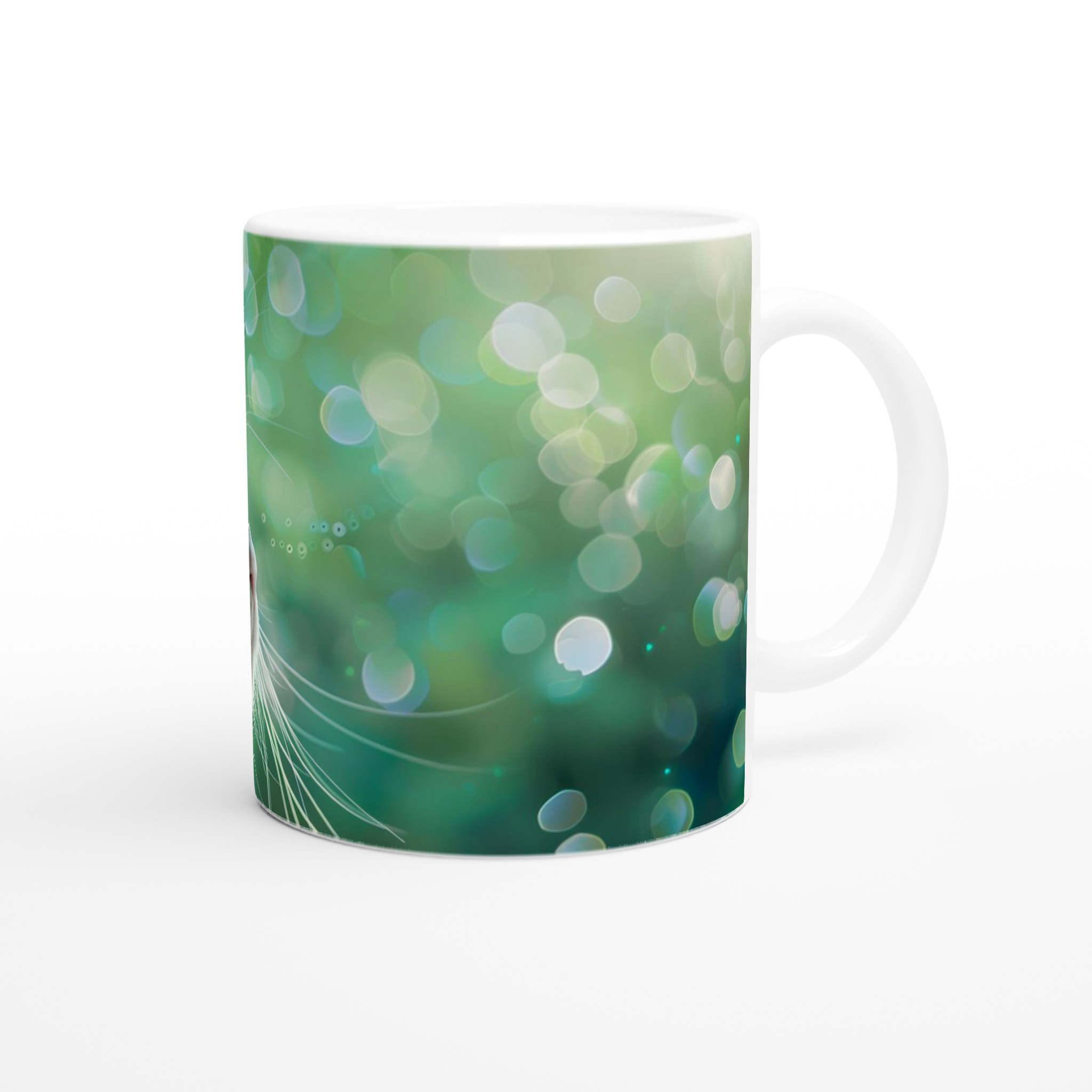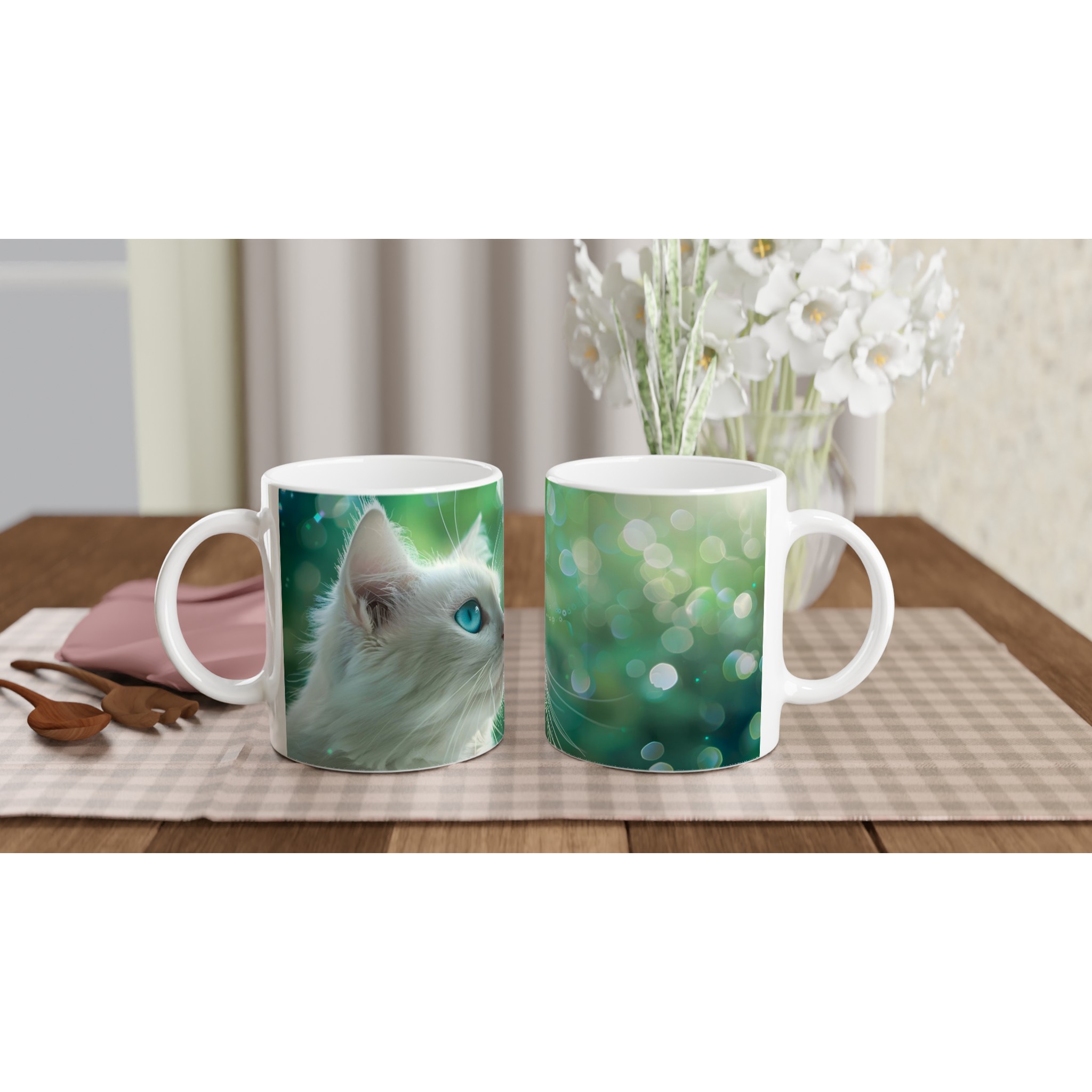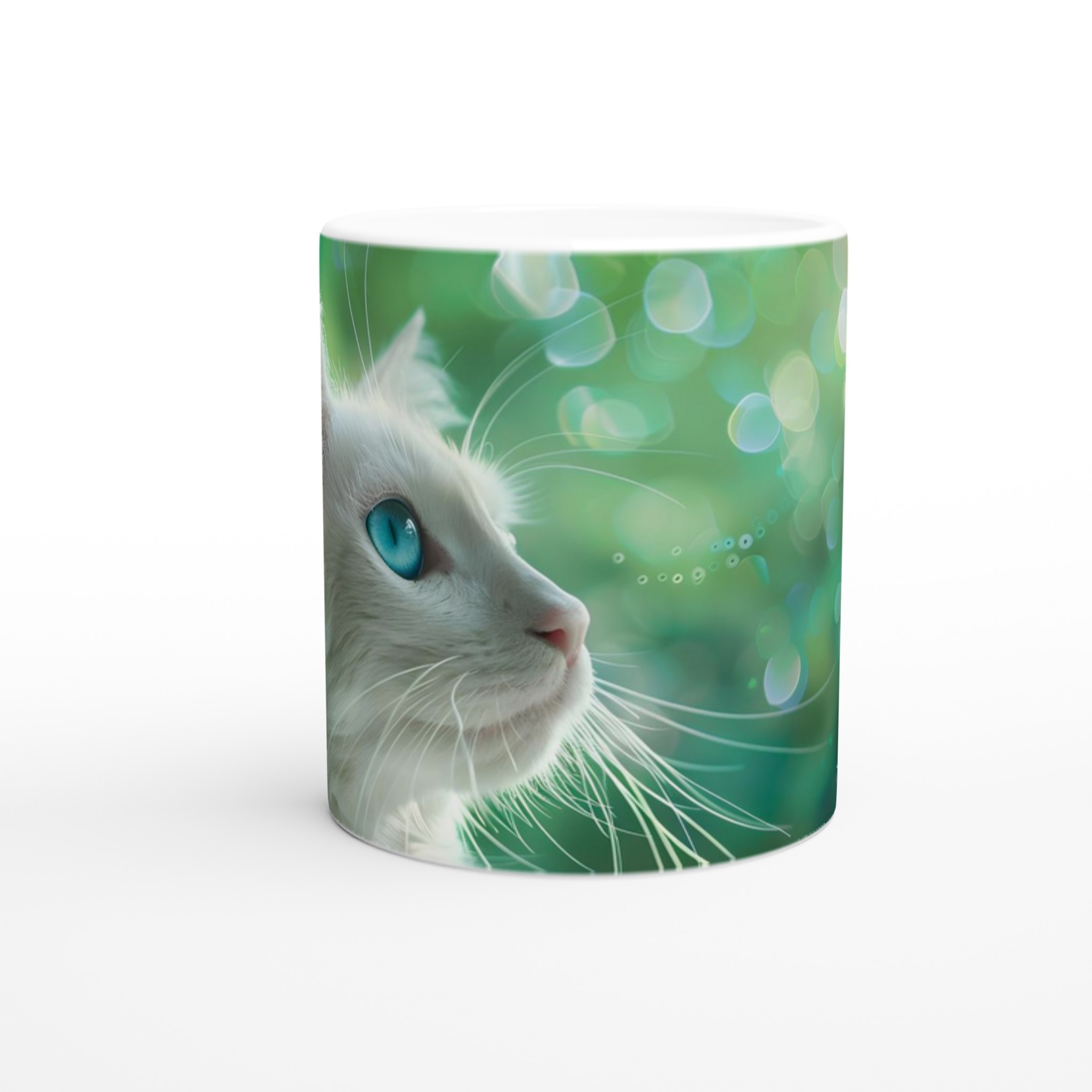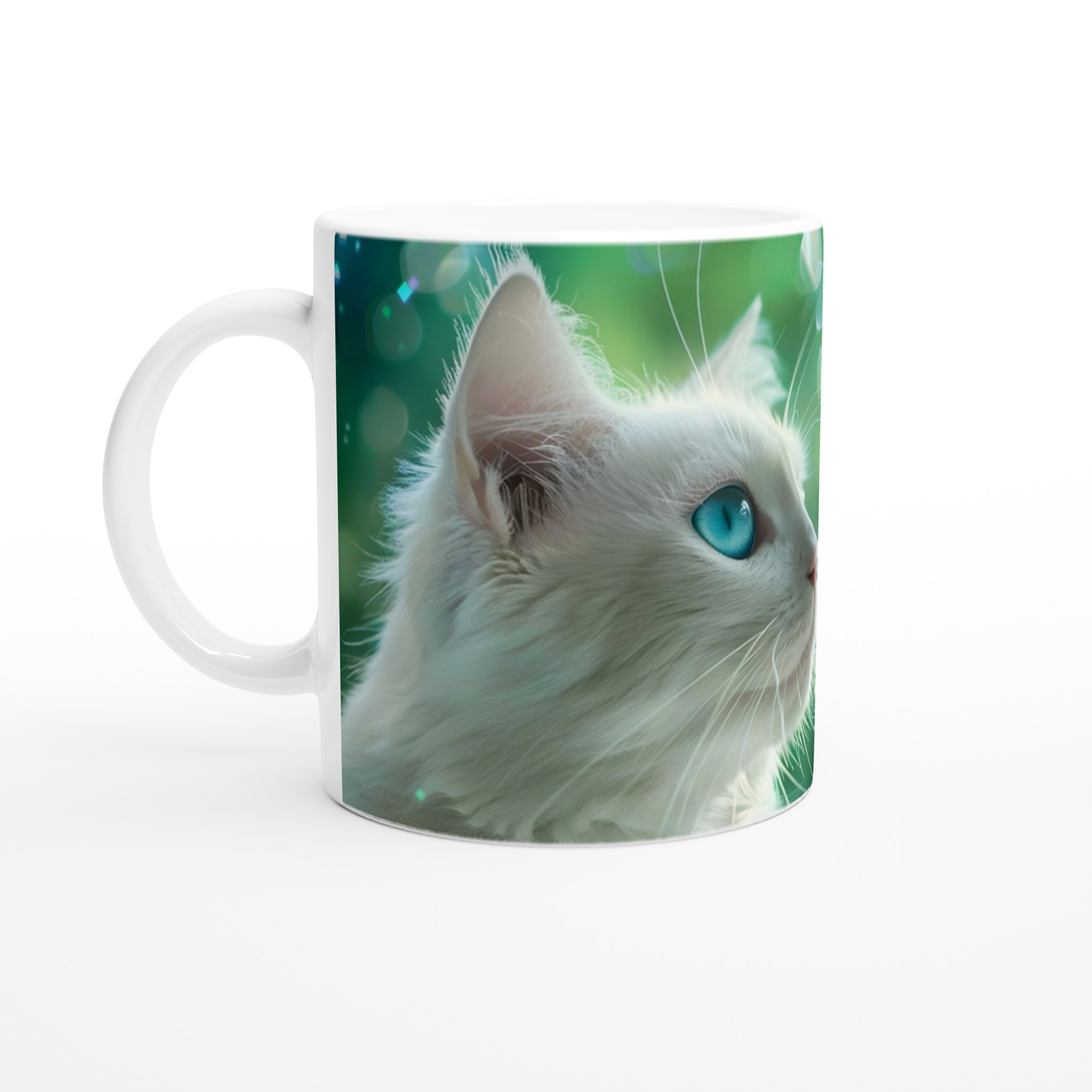 Låt dig förtrollas varje dag med denna unika keramikmugg, prydd med en majestätisk vit katt med piercingblå ögon mot en drömsk, grön bokeh-bakgrund. Denna mugg fångar en känsla av lugn och magi, perfekt för dina stunder av reflektion eller för att sprida glädje i vardagen. Den blanka vita ytan ser till att det vackra motivet framträder klart och färgstarkt, vilket gör den till en riktig favorit.