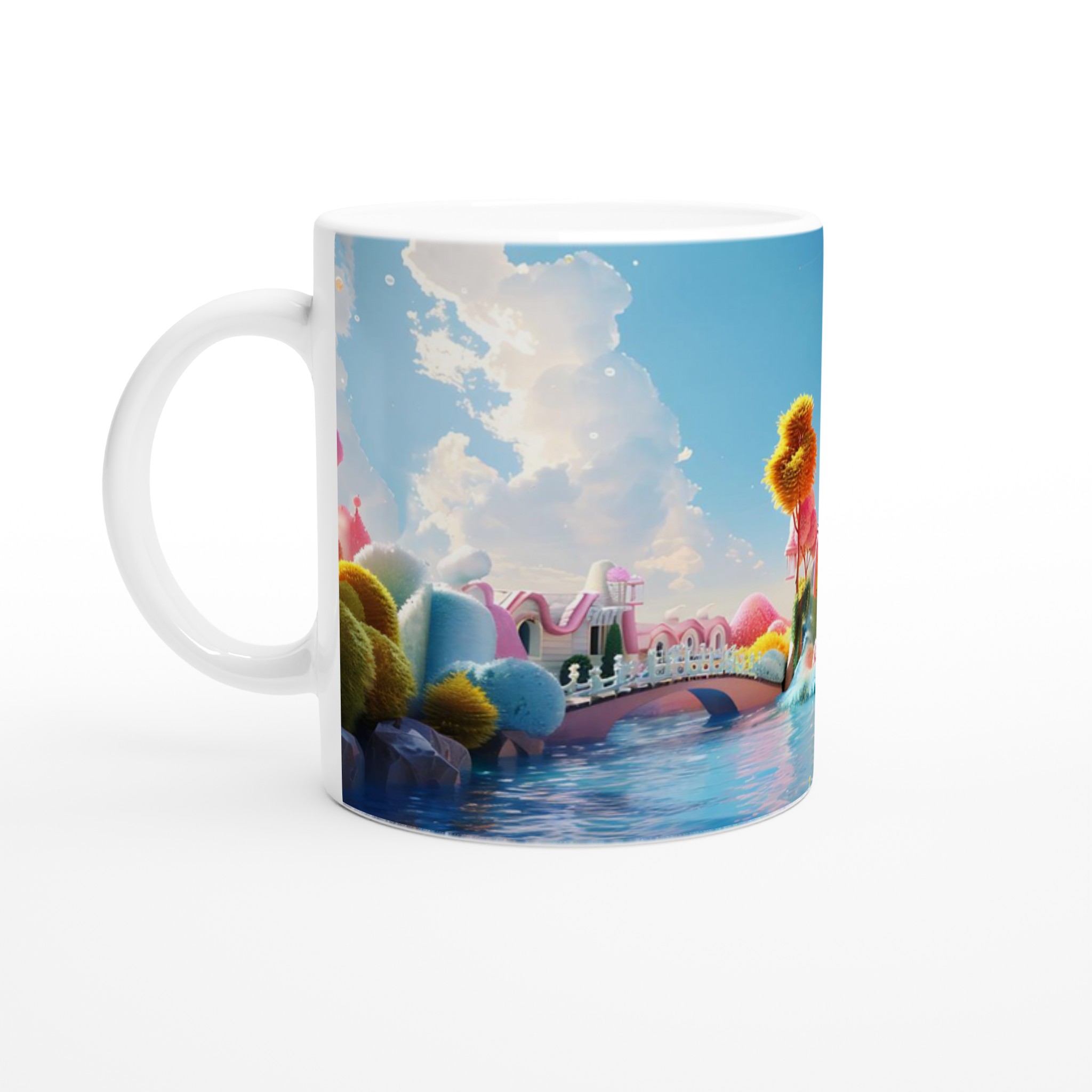 Inspirerad av en sockerbitssöt fantasi med lekfulla pasteller och sagolika landskap, är denna mugg perfekt för dig som älskar att drömma dig bort. Den blanka vita ytan ger ett skarpt och levande tryck som verkligen sticker ut, oavsett om det är en personlig design, ett roligt citat eller en present till någon du tycker om.